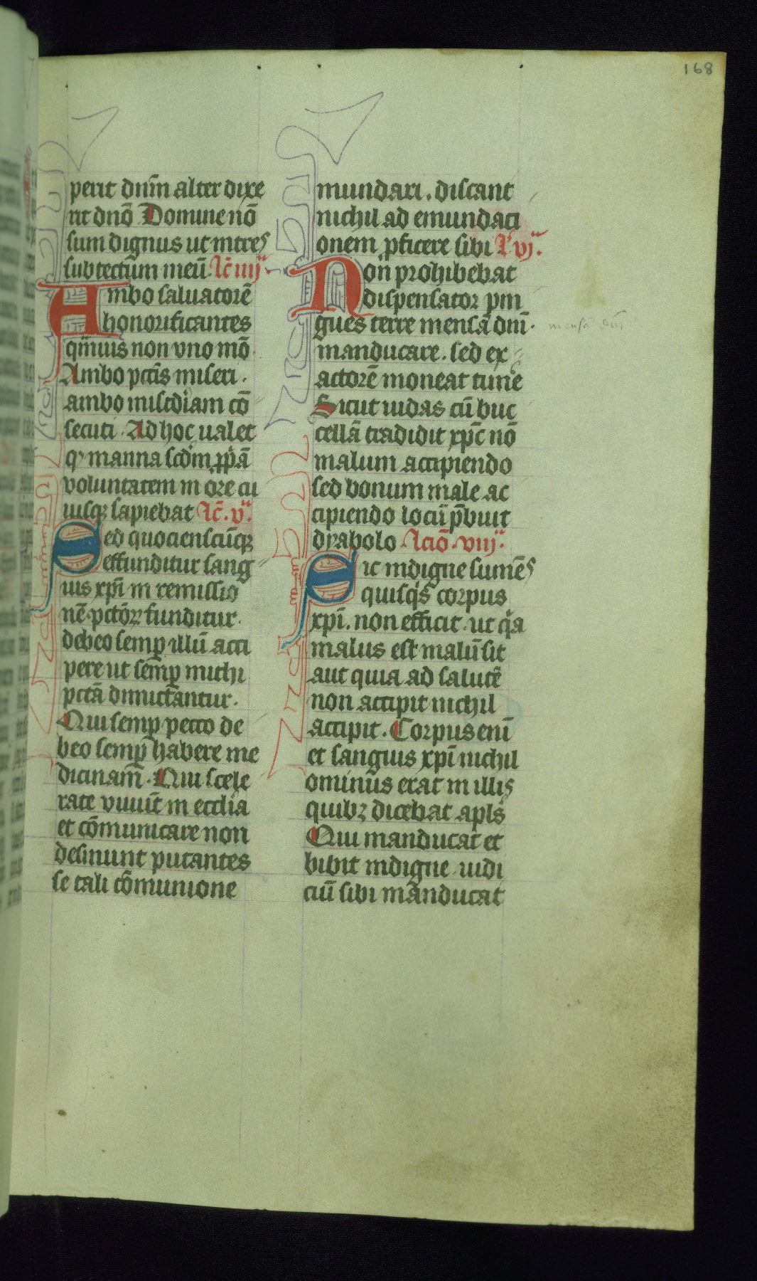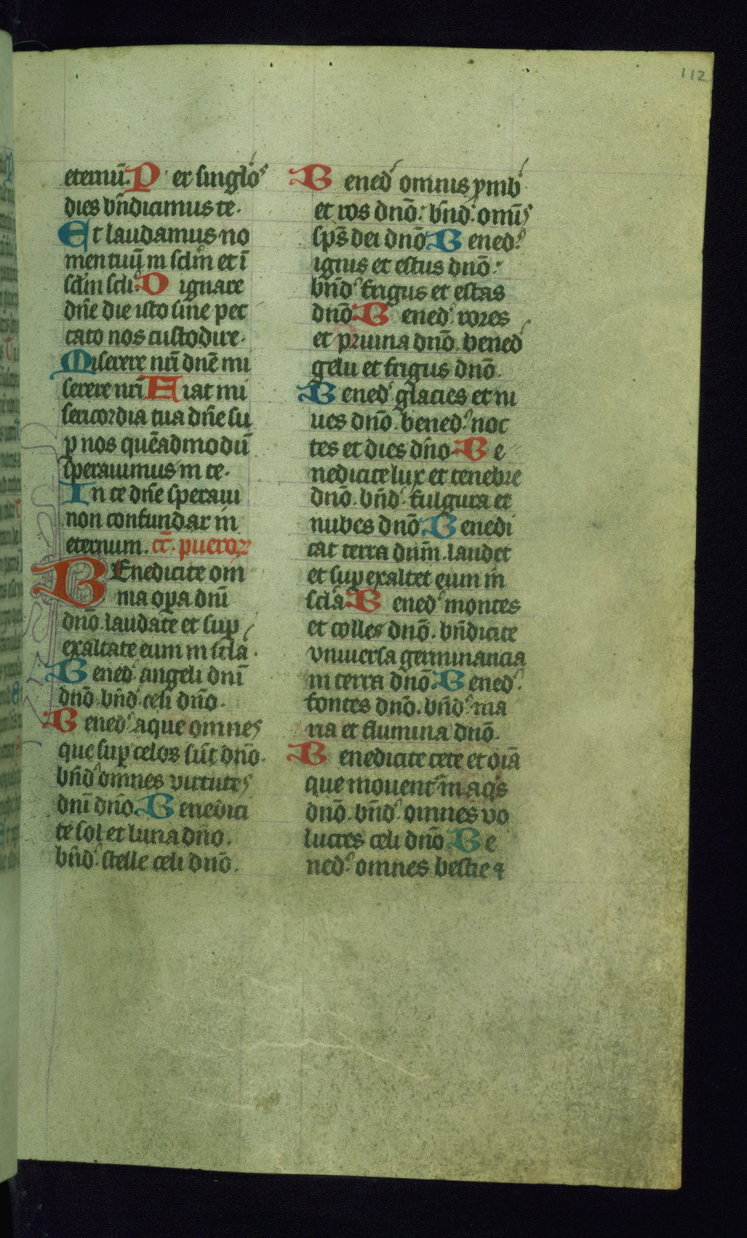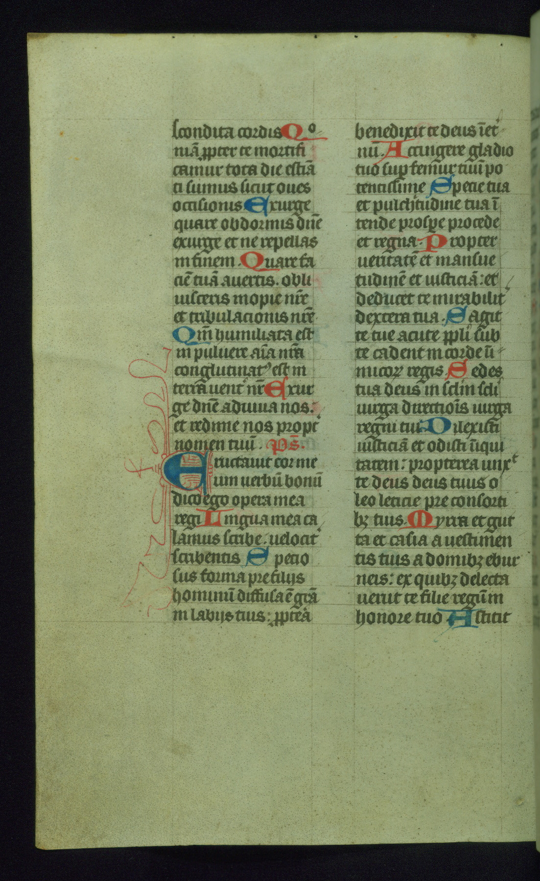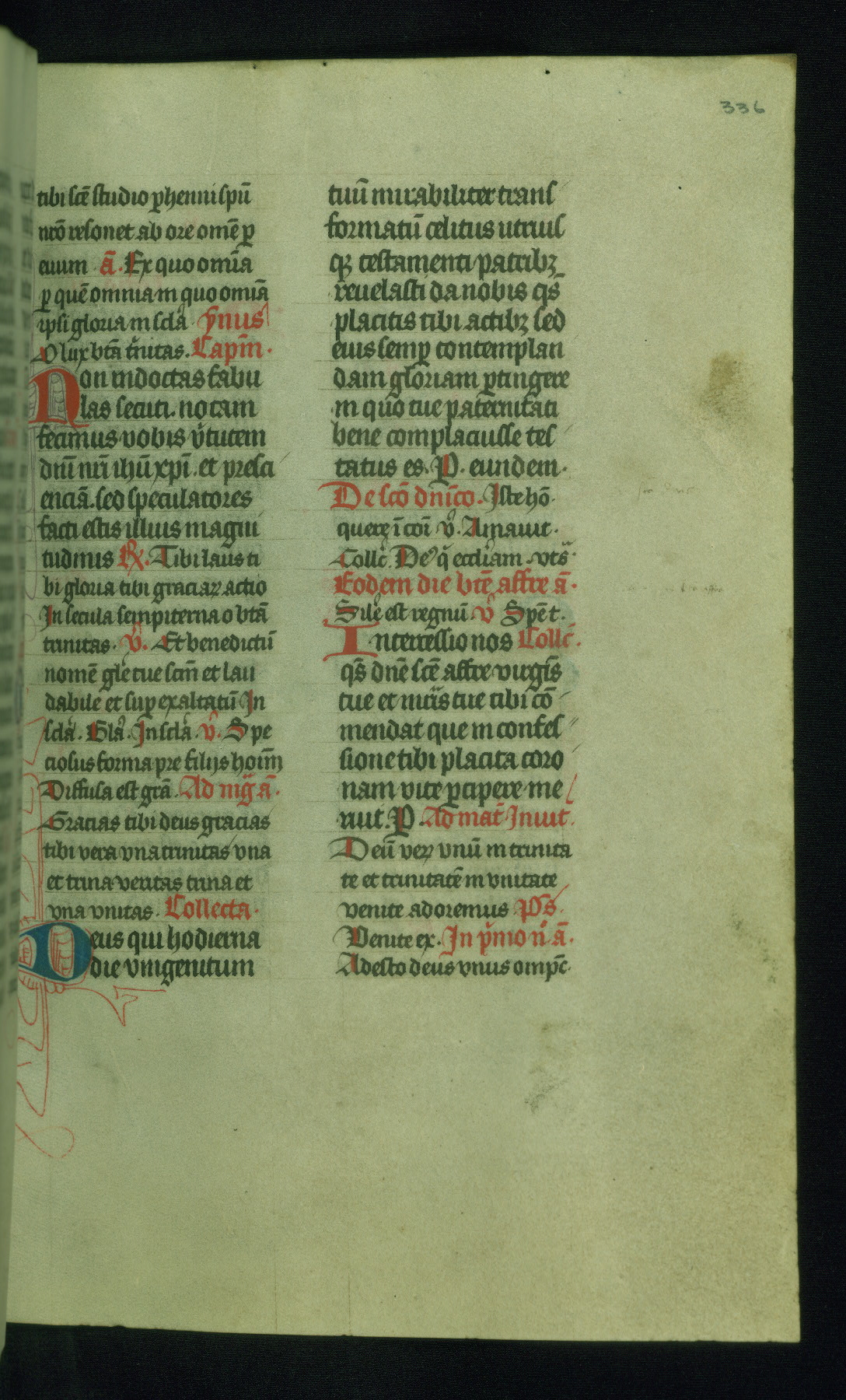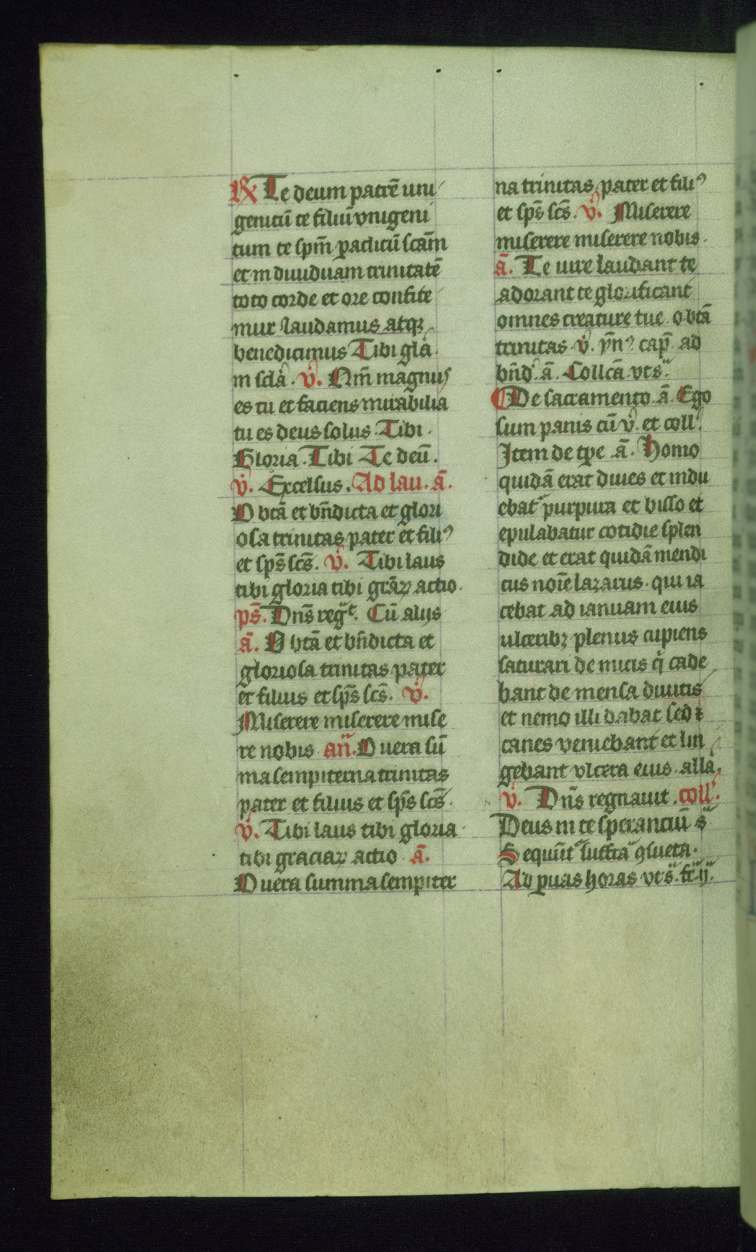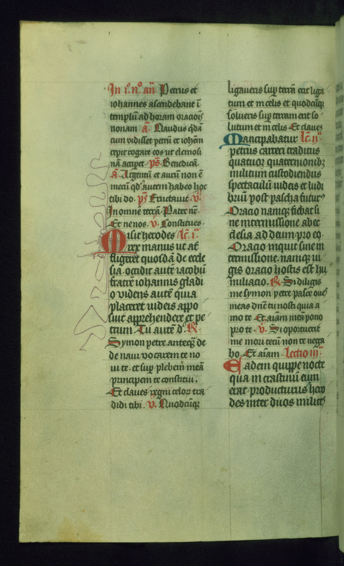 This small breviary, composed of more than 500 folios, is extraordinary for its length, considering it is the summer portion of a two-volume breviary for the use of Liège. The manuscript was completed for ecclesiastical use at the Cathedral of Notre-Dame and St.-Lambert in Liège ca. 1420. This attribution is suggested, for instance, by the petitions to the congregation of this cathedral (fols. 114v-117v), as well as the armorial shield of the family of Surlet de Chokier of Liège represented at the opening of the Psalms. The manuscript has modest, but interesting, decoration with historiated and decorated initials marking the liturgical texts, and occasional angels playing instruments in the margins. The most notable pictorial effect is found in the initials inhabited by transparent figures on rich blue ground. The technique is found, for instance, on fol. 156r with the gold monstrance held by translucent angels for the feast of the Corpus Christi.
