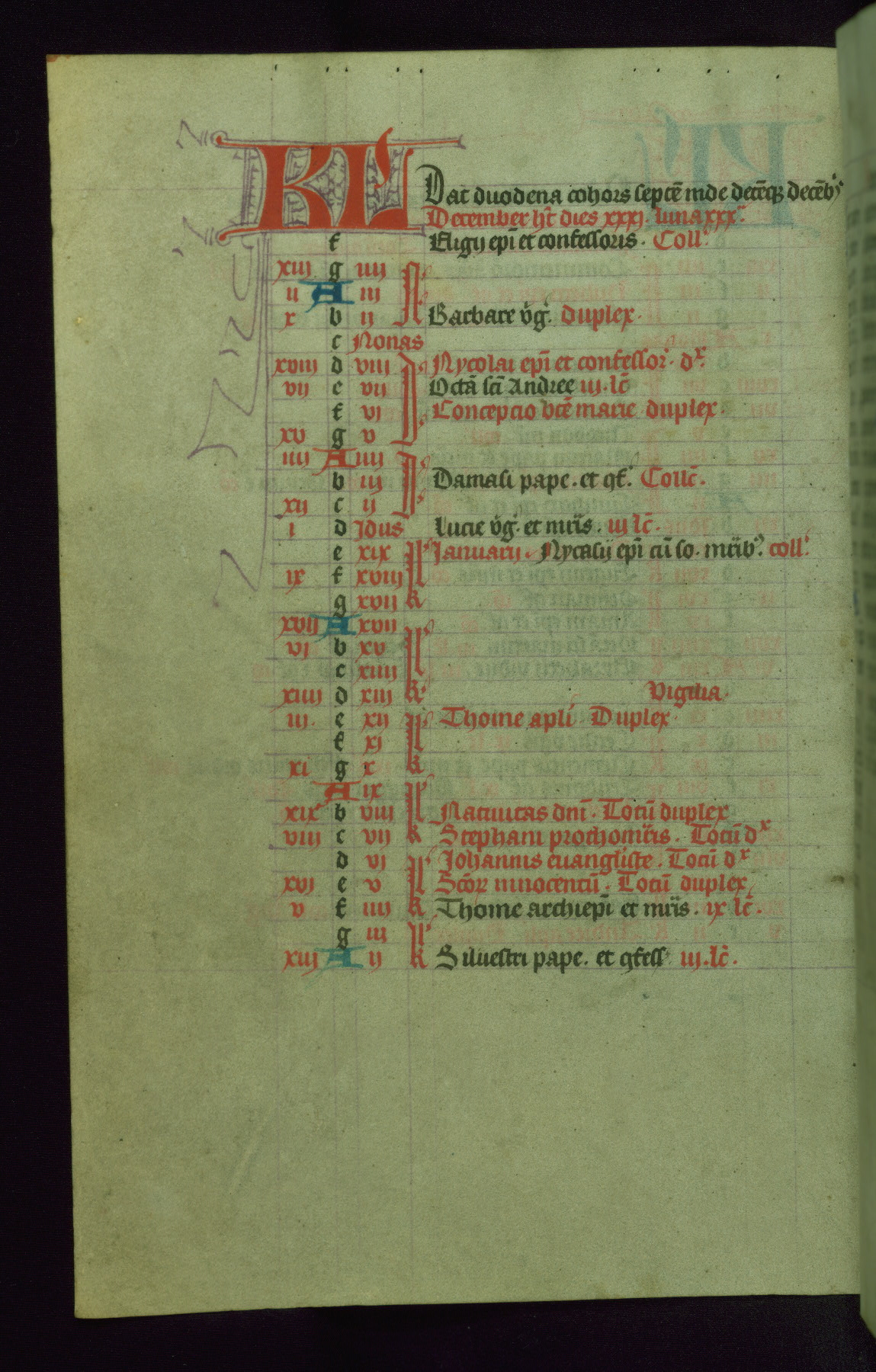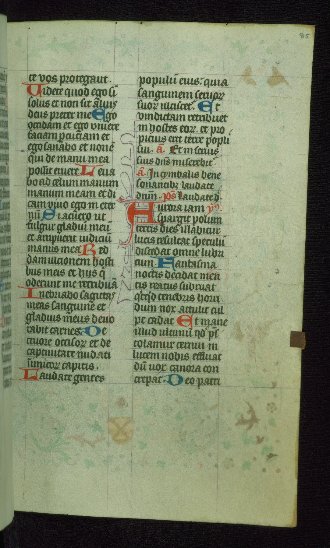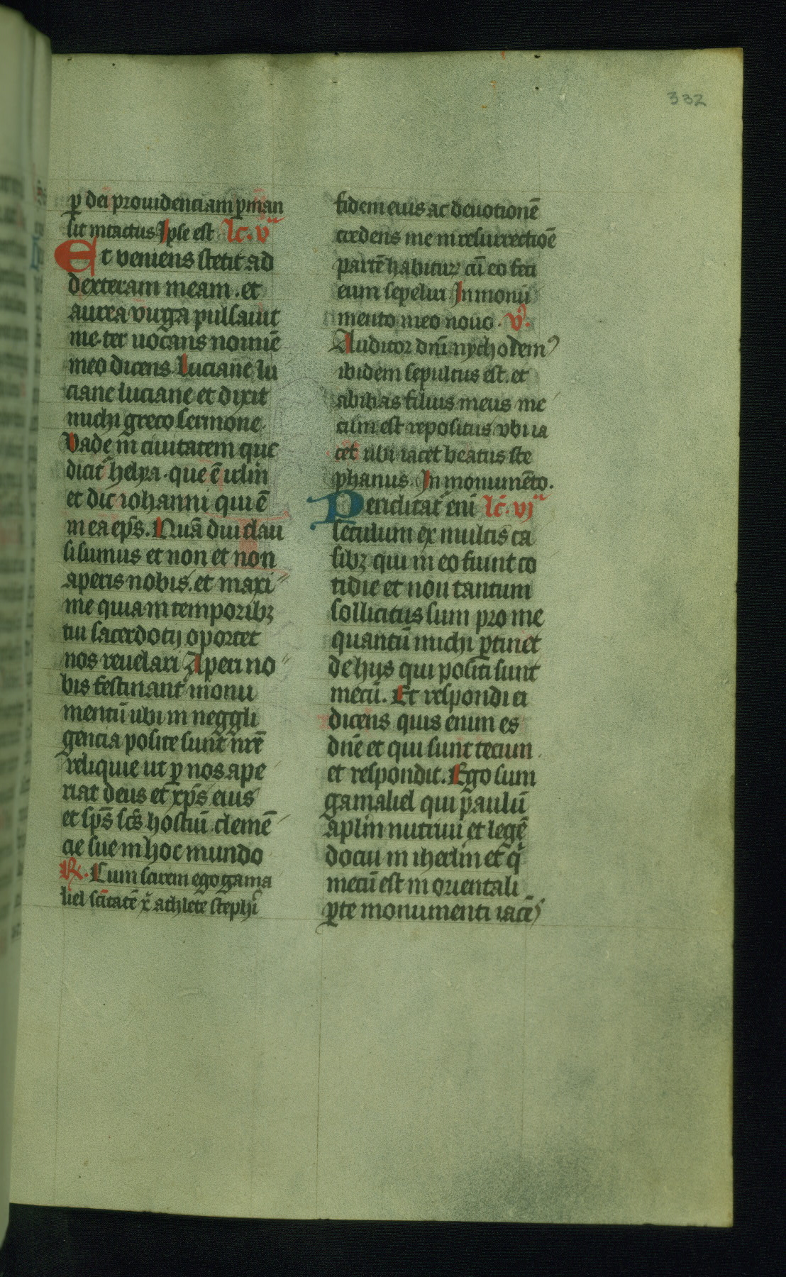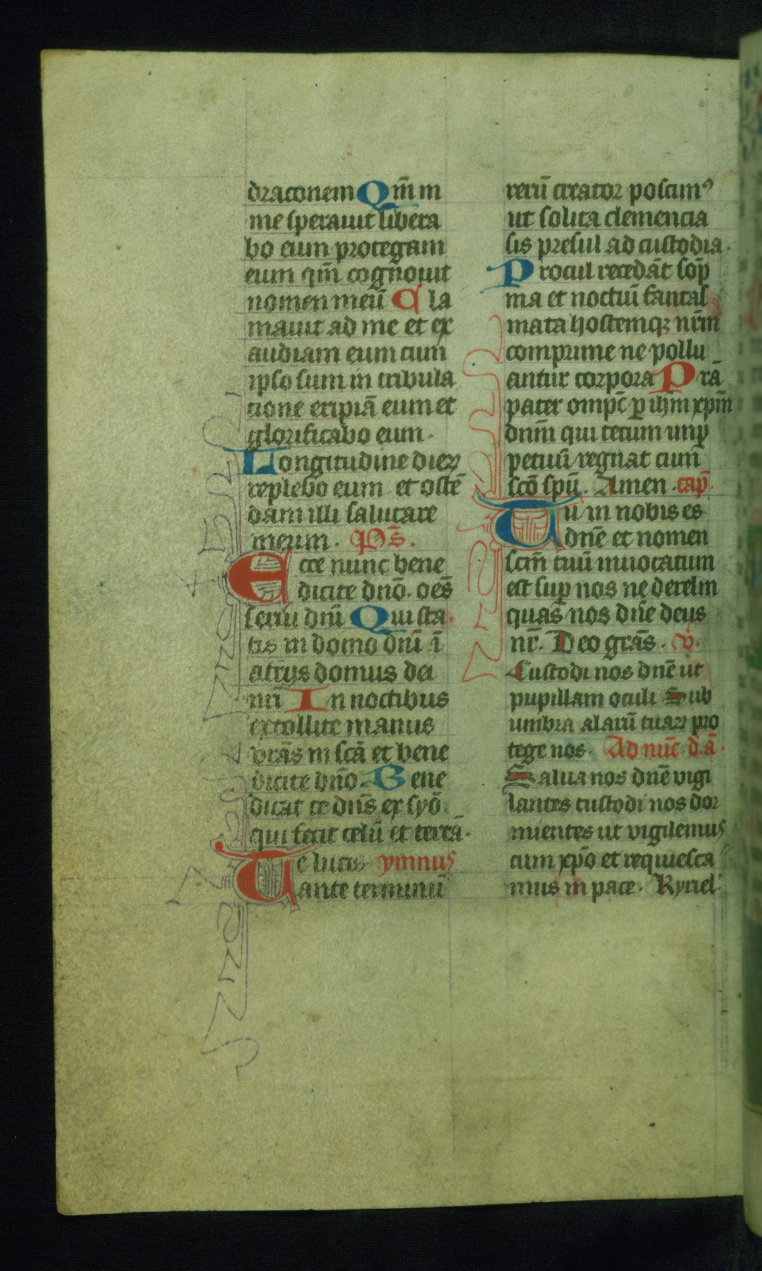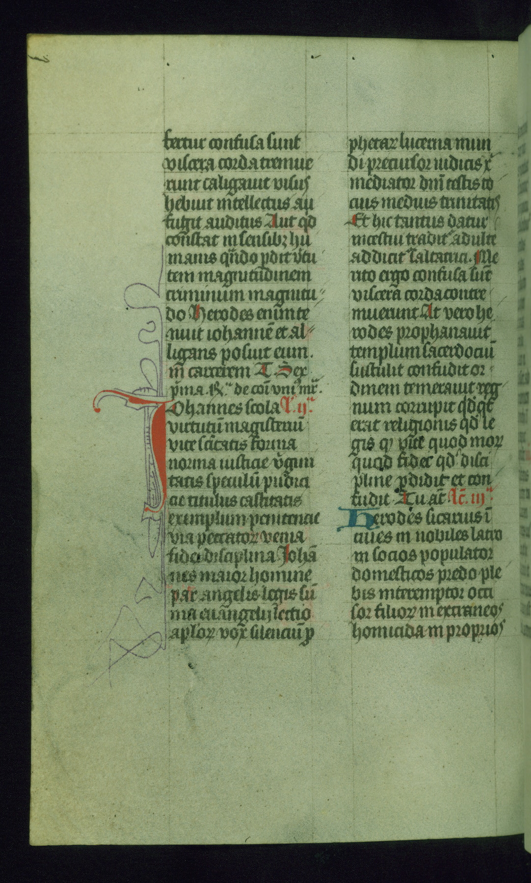 This small breviary, composed of more than 500 folios, is extraordinary for its length, considering it is the summer portion of a two-volume breviary for the use of Liège. The manuscript was completed for ecclesiastical use at the Cathedral of Notre-Dame and St.-Lambert in Liège ca. 1420. This attribution is suggested, for instance, by the petitions to the congregation of this cathedral (fols. 114v-117v), as well as the armorial shield of the family of Surlet de Chokier of Liège represented at the opening of the Psalms. The manuscript has modest, but interesting, decoration with historiated and decorated initials marking the liturgical texts, and occasional angels playing instruments in the margins. The most notable pictorial effect is found in the initials inhabited by transparent figures on rich blue ground. The technique is found, for instance, on fol. 156r with the gold monstrance held by translucent angels for the feast of the Corpus Christi.