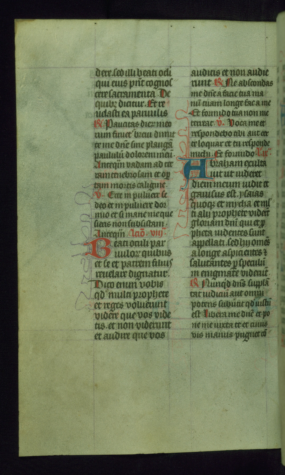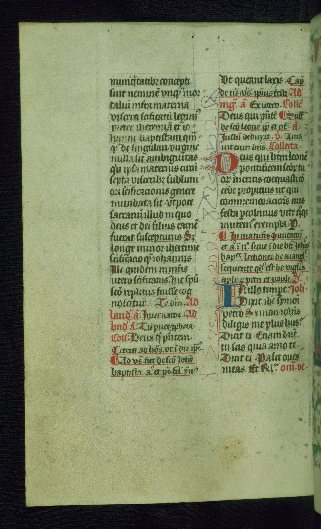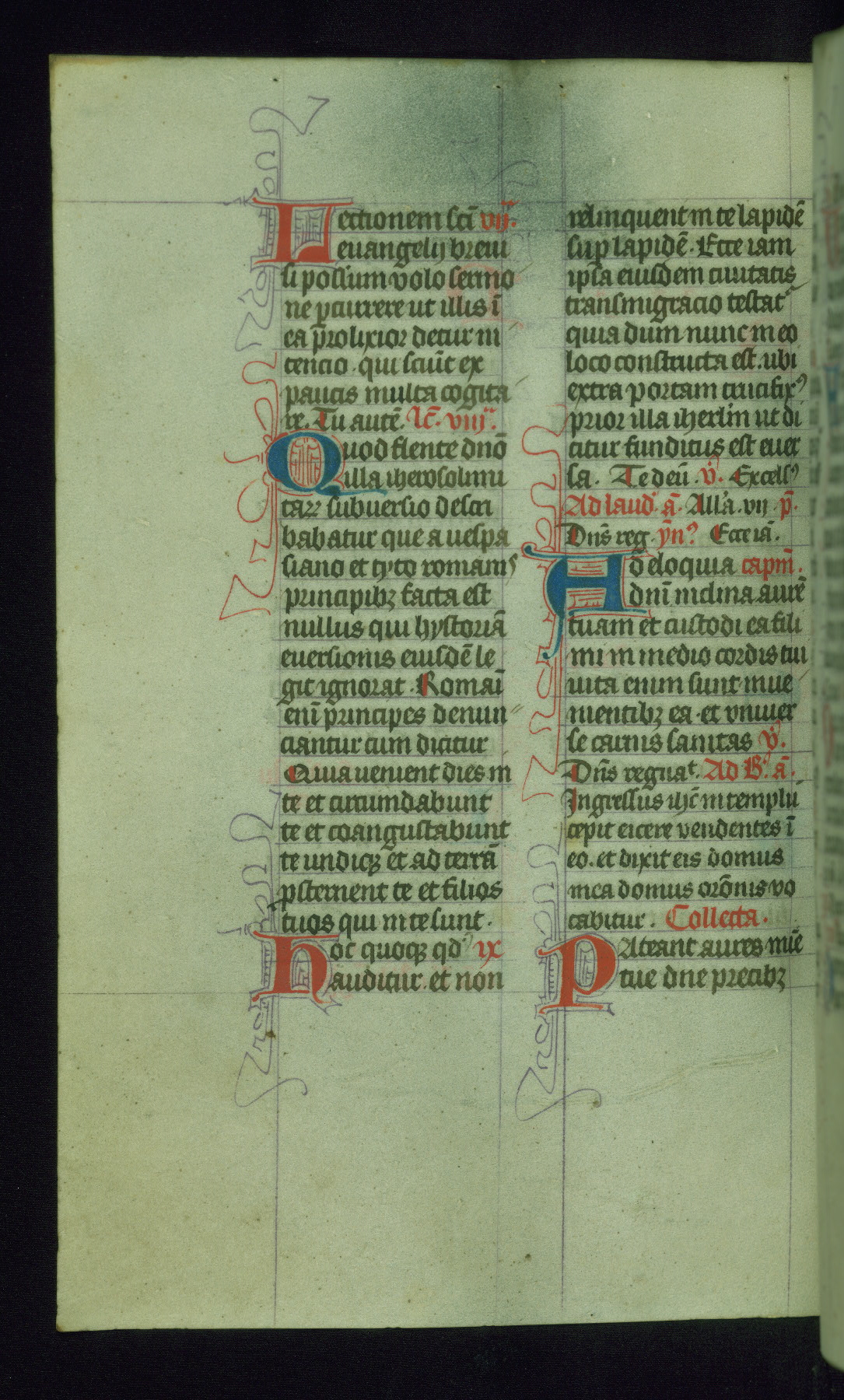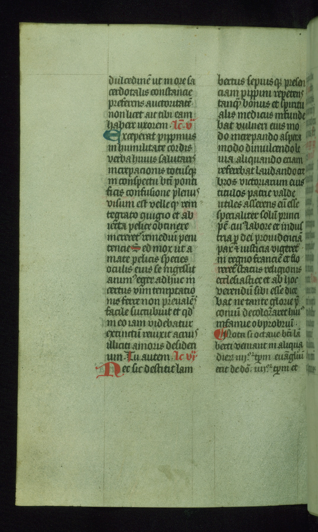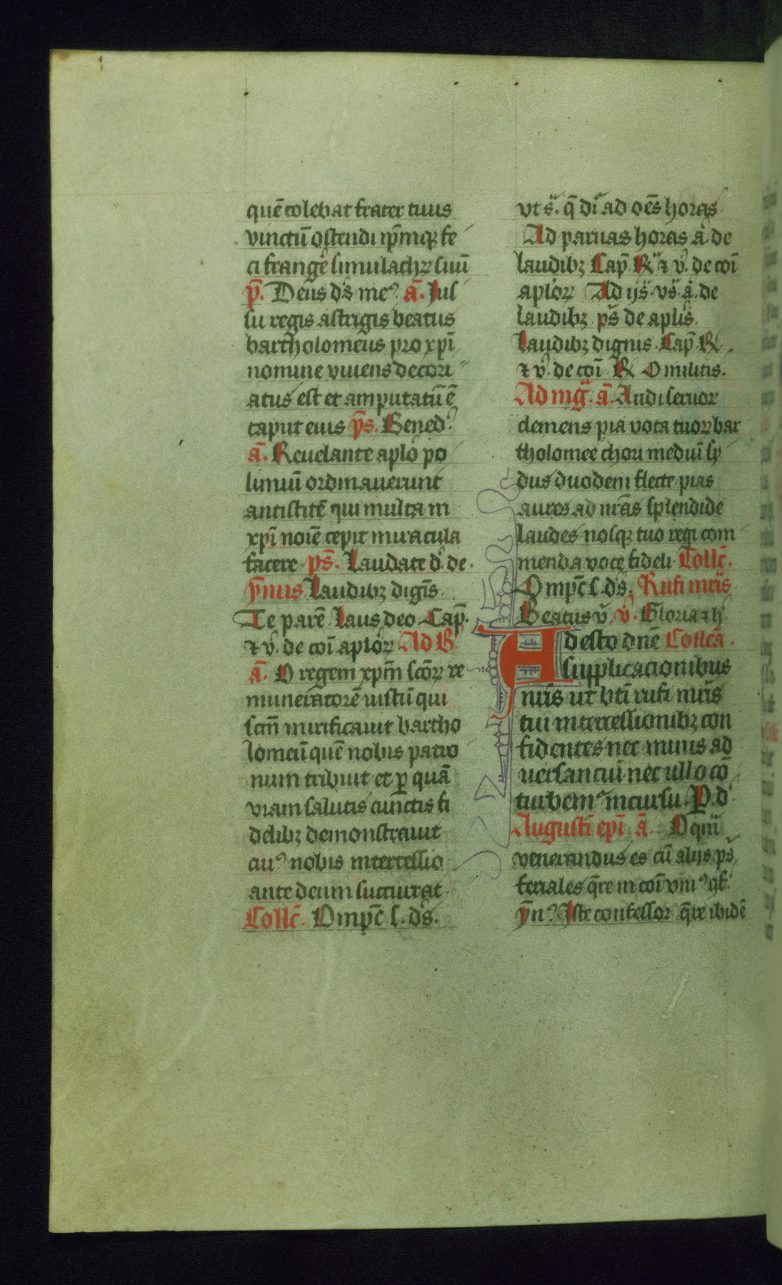 This small breviary, composed of more than 500 folios, is extraordinary for its length, considering it is the summer portion of a two-volume breviary for the use of Liège. The manuscript was completed for ecclesiastical use at the Cathedral of Notre-Dame and St.-Lambert in Liège ca. 1420. This attribution is suggested, for instance, by the petitions to the congregation of this cathedral (fols. 114v-117v), as well as the armorial shield of the family of Surlet de Chokier of Liège represented at the opening of the Psalms. The manuscript has modest, but interesting, decoration with historiated and decorated initials marking the liturgical texts, and occasional angels playing instruments in the margins. The most notable pictorial effect is found in the initials inhabited by transparent figures on rich blue ground. The technique is found, for instance, on fol. 156r with the gold monstrance held by translucent angels for the feast of the Corpus Christi.