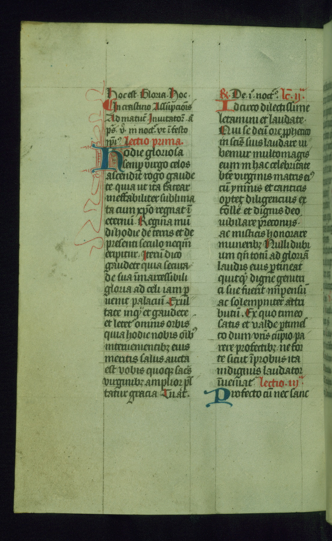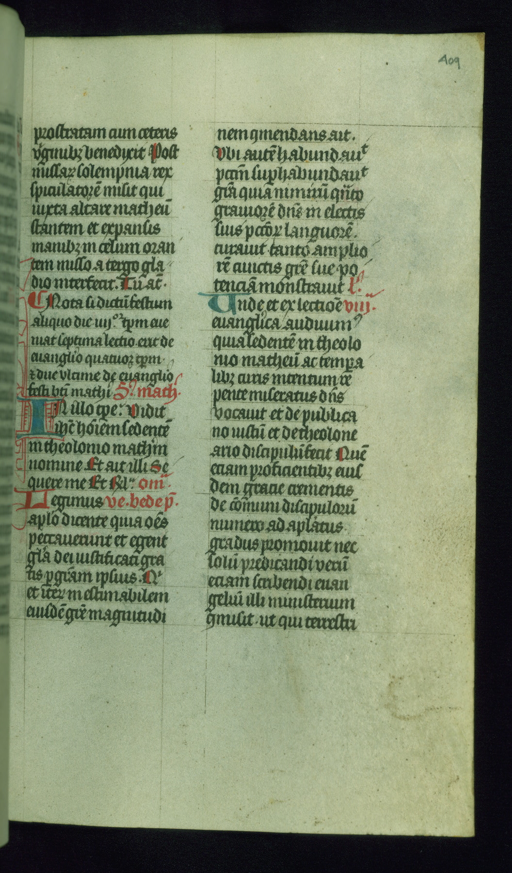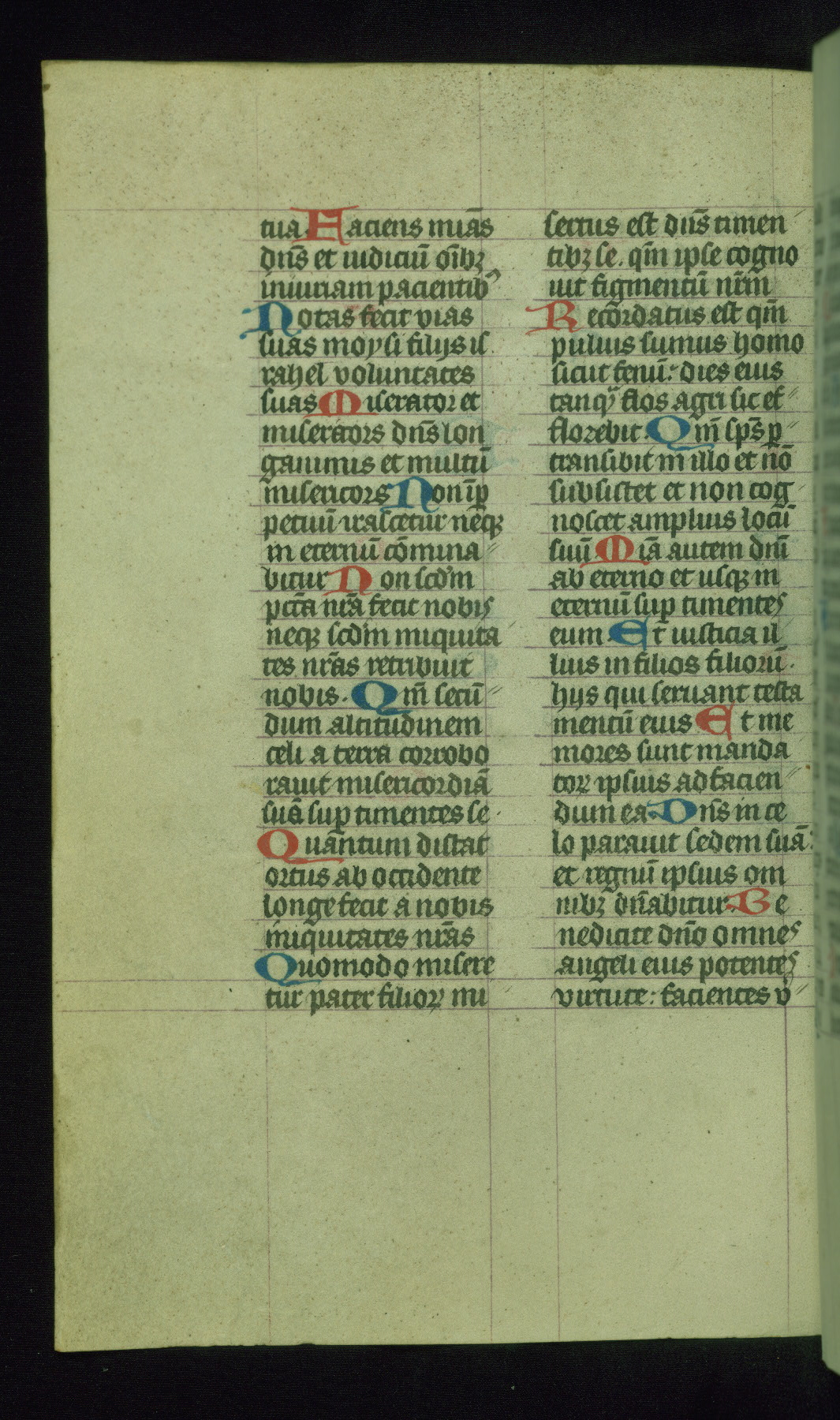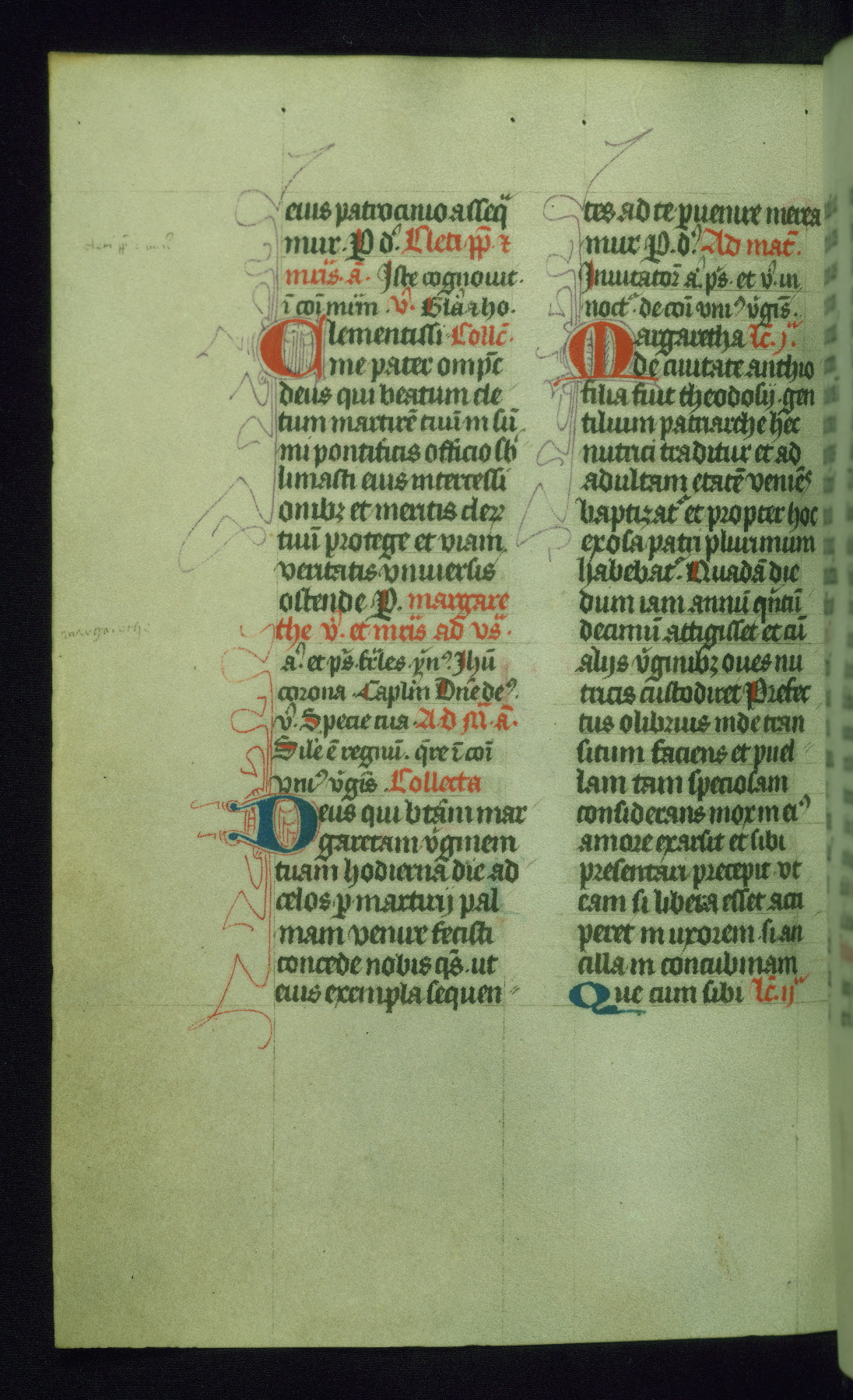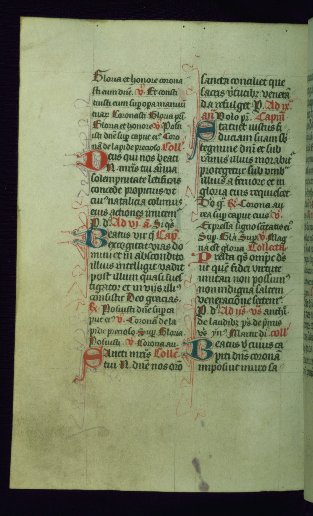 This small breviary, composed of more than 500 folios, is extraordinary for its length, considering it is the summer portion of a two-volume breviary for the use of Liège. The manuscript was completed for ecclesiastical use at the Cathedral of Notre-Dame and St.-Lambert in Liège ca. 1420. This attribution is suggested, for instance, by the petitions to the congregation of this cathedral (fols. 114v-117v), as well as the armorial shield of the family of Surlet de Chokier of Liège represented at the opening of the Psalms. The manuscript has modest, but interesting, decoration with historiated and decorated initials marking the liturgical texts, and occasional angels playing instruments in the margins. The most notable pictorial effect is found in the initials inhabited by transparent figures on rich blue ground. The technique is found, for instance, on fol. 156r with the gold monstrance held by translucent angels for the feast of the Corpus Christi.