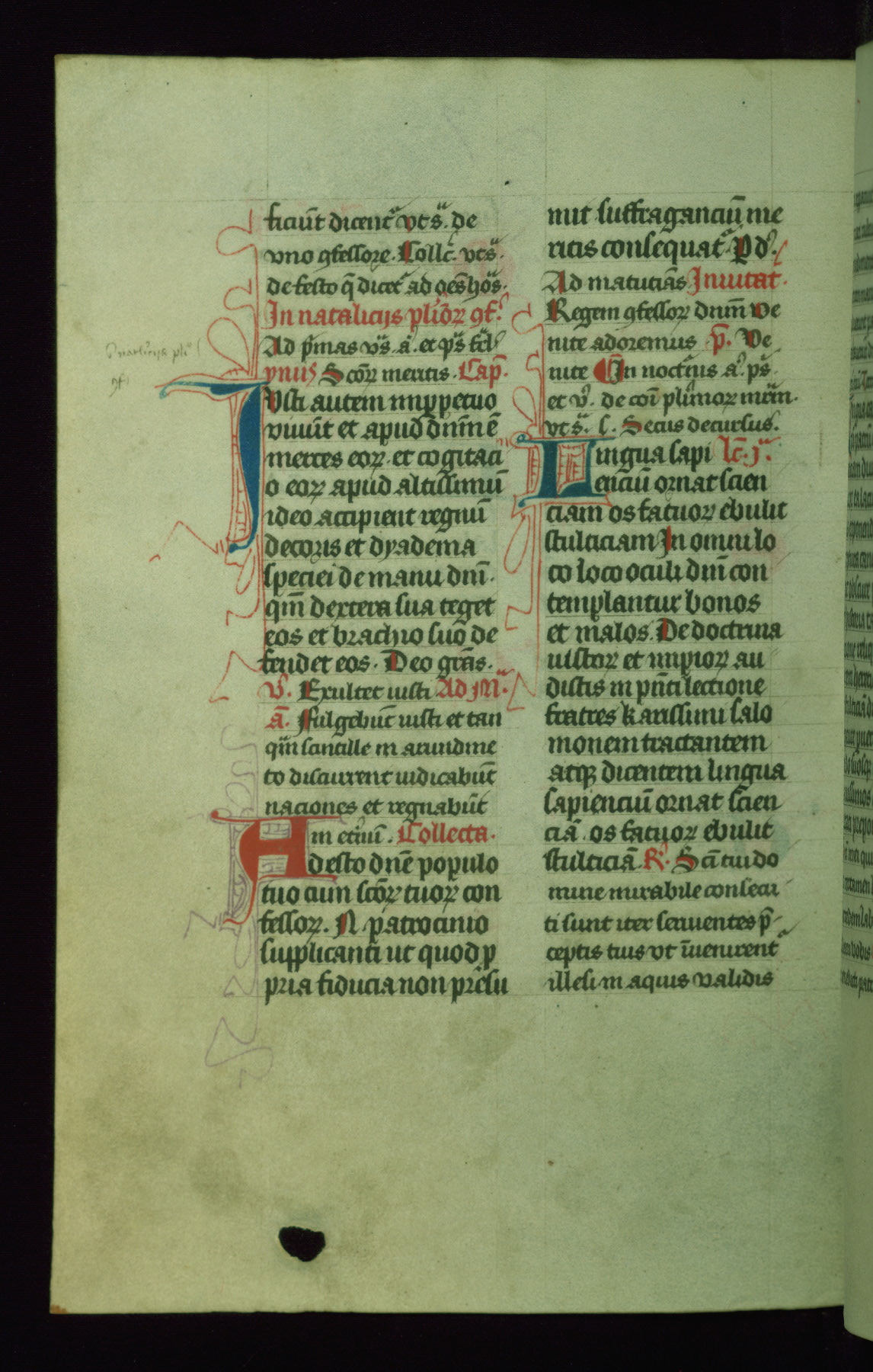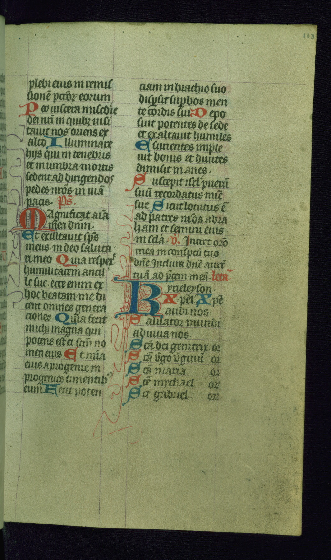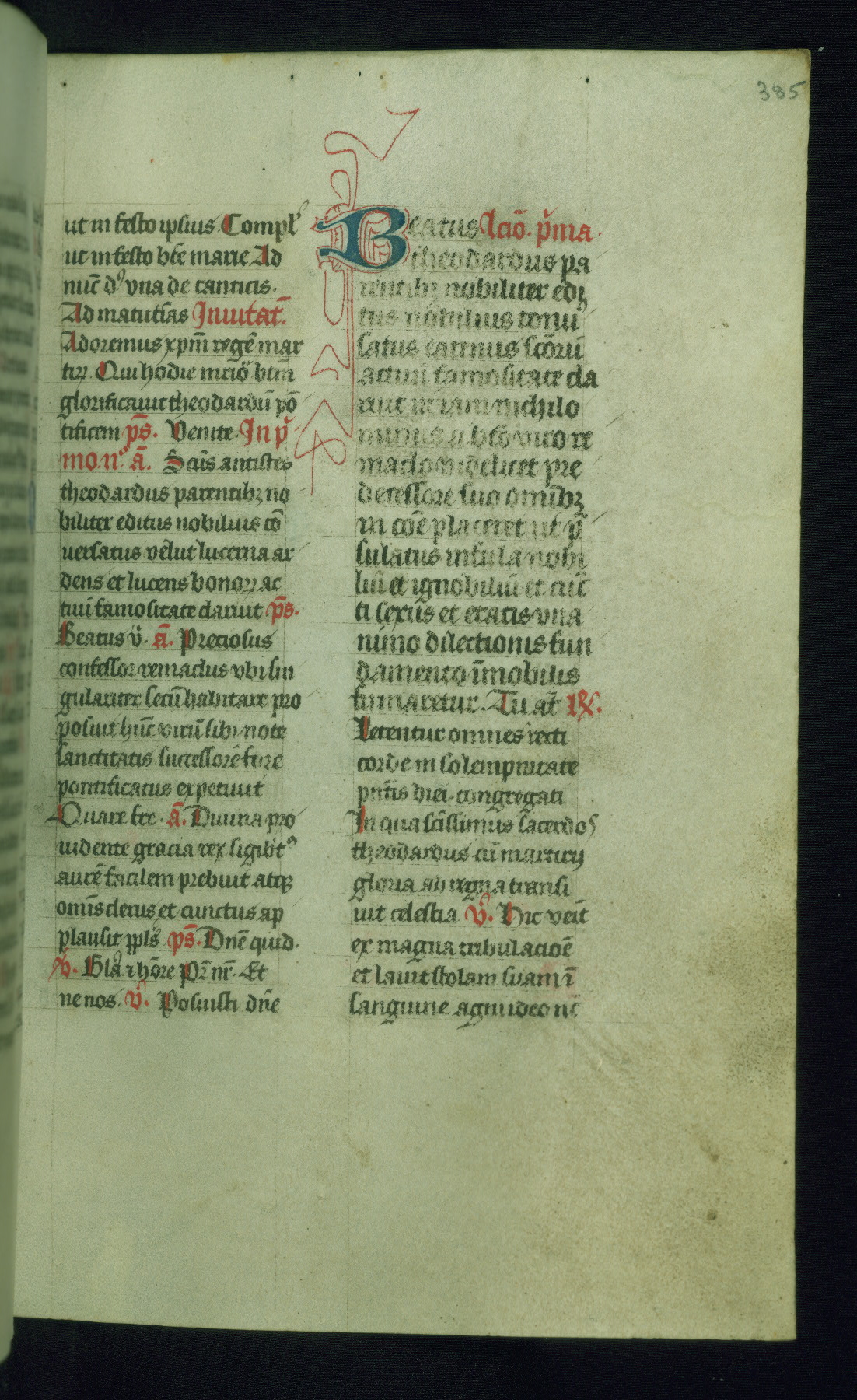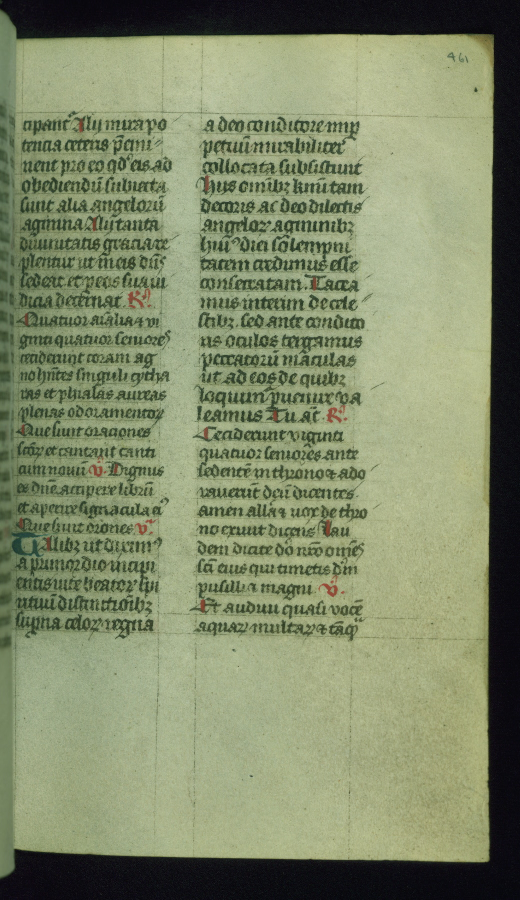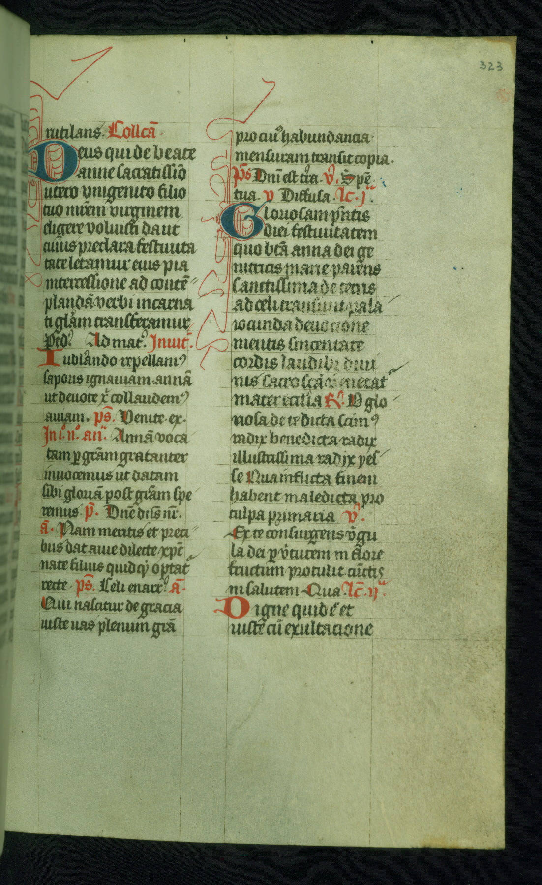 This small breviary, composed of more than 500 folios, is extraordinary for its length, considering it is the summer portion of a two-volume breviary for the use of Liège. The manuscript was completed for ecclesiastical use at the Cathedral of Notre-Dame and St.-Lambert in Liège ca. 1420. This attribution is suggested, for instance, by the petitions to the congregation of this cathedral (fols. 114v-117v), as well as the armorial shield of the family of Surlet de Chokier of Liège represented at the opening of the Psalms. The manuscript has modest, but interesting, decoration with historiated and decorated initials marking the liturgical texts, and occasional angels playing instruments in the margins. The most notable pictorial effect is found in the initials inhabited by transparent figures on rich blue ground. The technique is found, for instance, on fol. 156r with the gold monstrance held by translucent angels for the feast of the Corpus Christi.