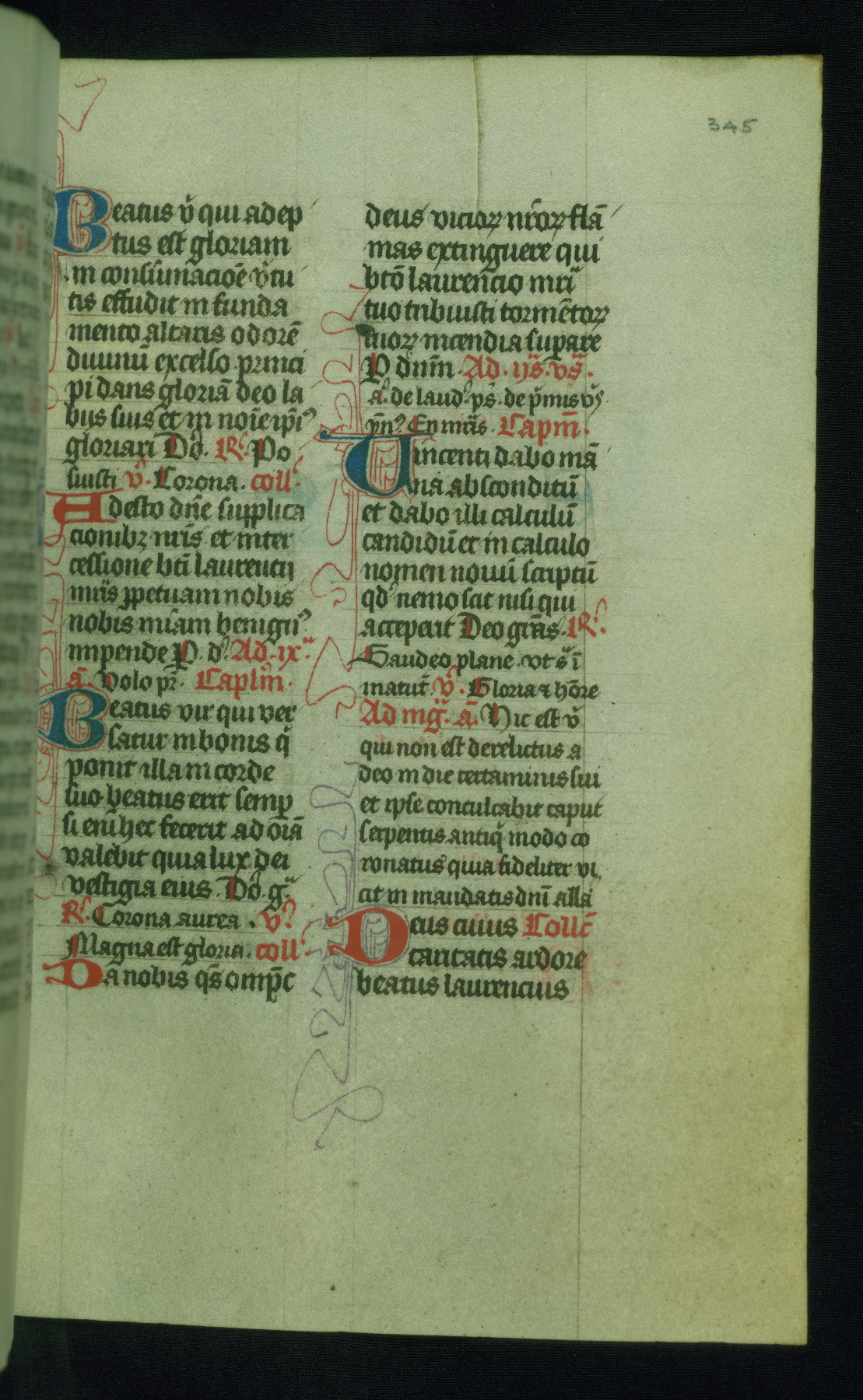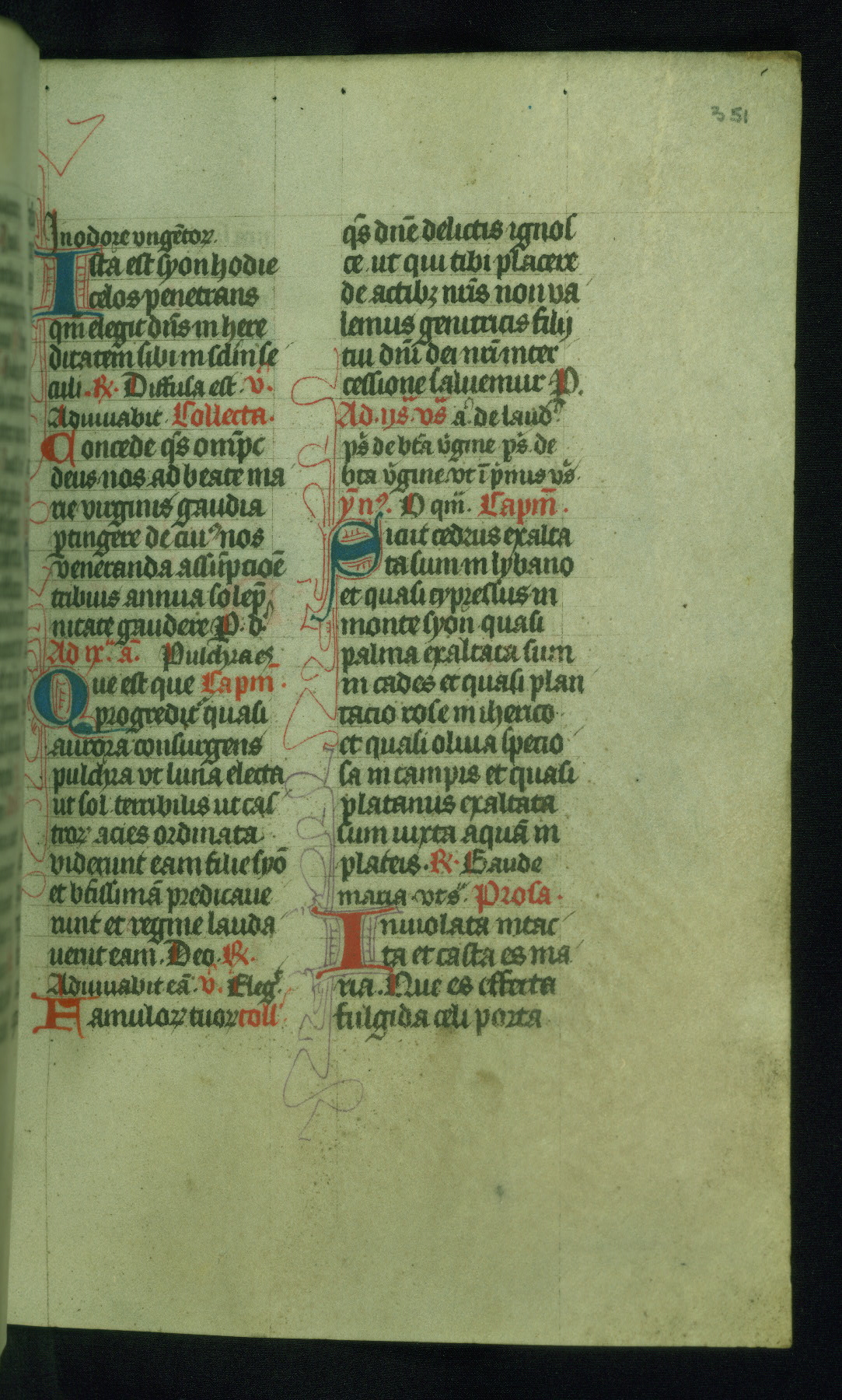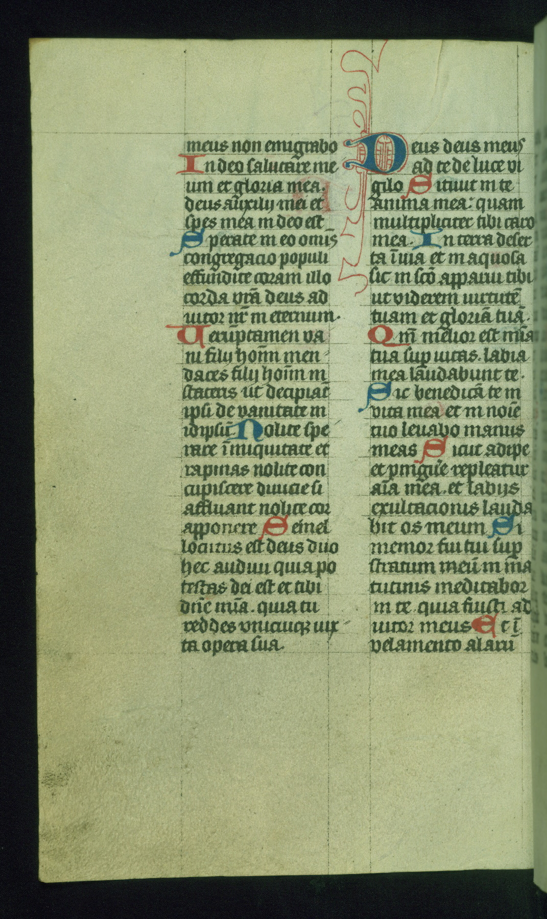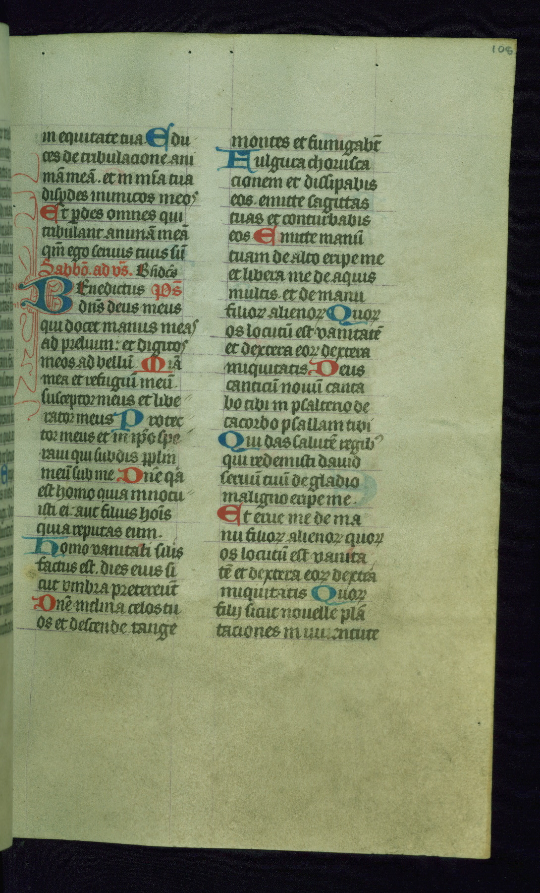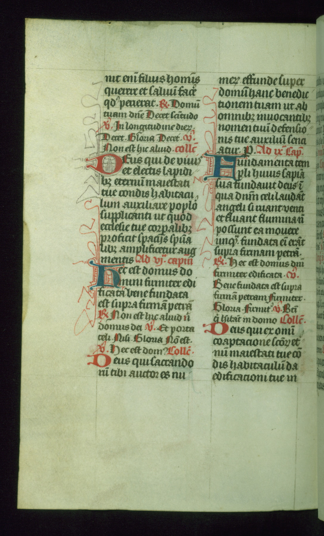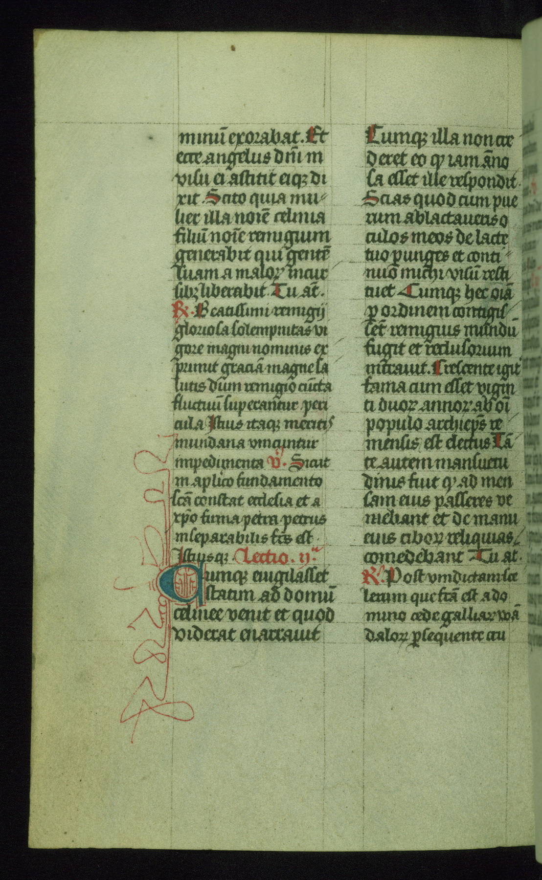 This small breviary, composed of more than 500 folios, is extraordinary for its length, considering it is the summer portion of a two-volume breviary for the use of Liège. The manuscript was completed for ecclesiastical use at the Cathedral of Notre-Dame and St.-Lambert in Liège ca. 1420. This attribution is suggested, for instance, by the petitions to the congregation of this cathedral (fols. 114v-117v), as well as the armorial shield of the family of Surlet de Chokier of Liège represented at the opening of the Psalms. The manuscript has modest, but interesting, decoration with historiated and decorated initials marking the liturgical texts, and occasional angels playing instruments in the margins. The most notable pictorial effect is found in the initials inhabited by transparent figures on rich blue ground. The technique is found, for instance, on fol. 156r with the gold monstrance held by translucent angels for the feast of the Corpus Christi.