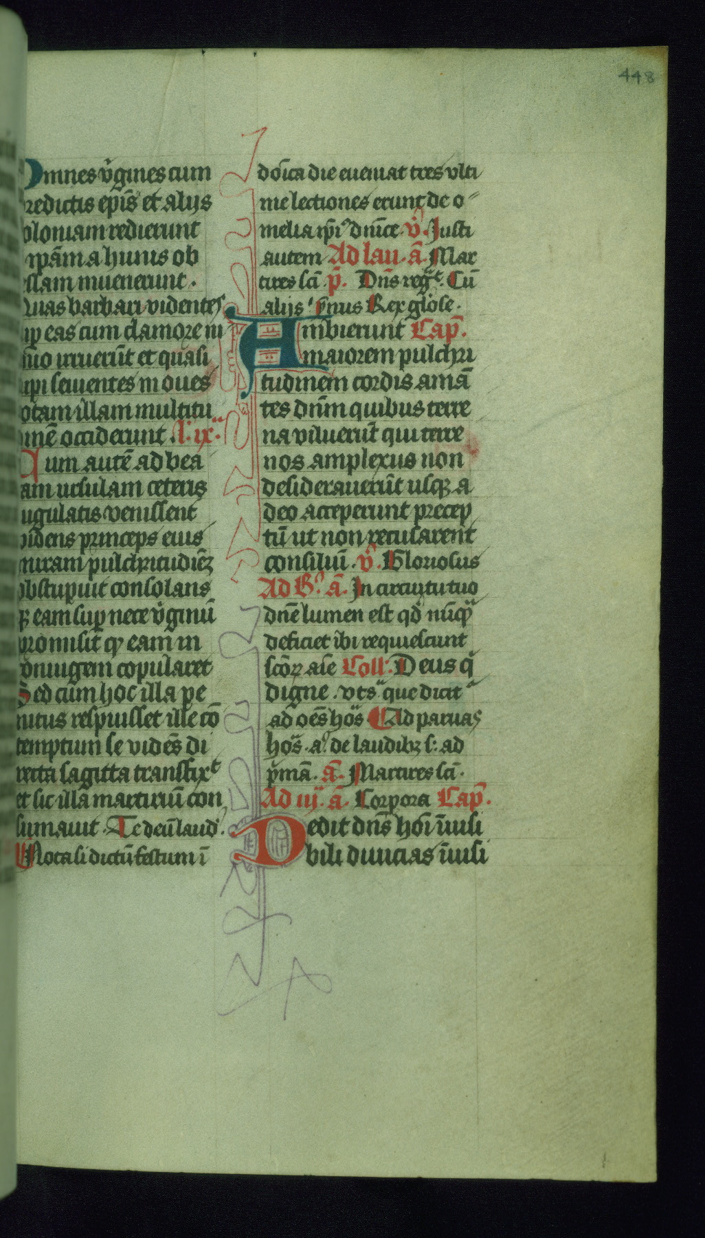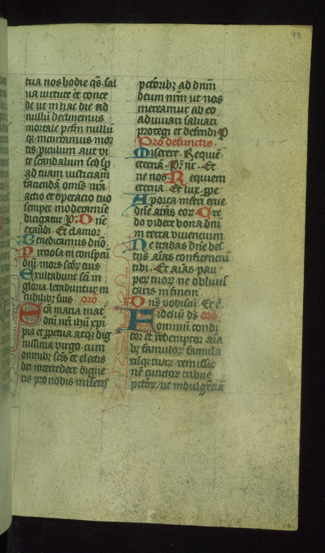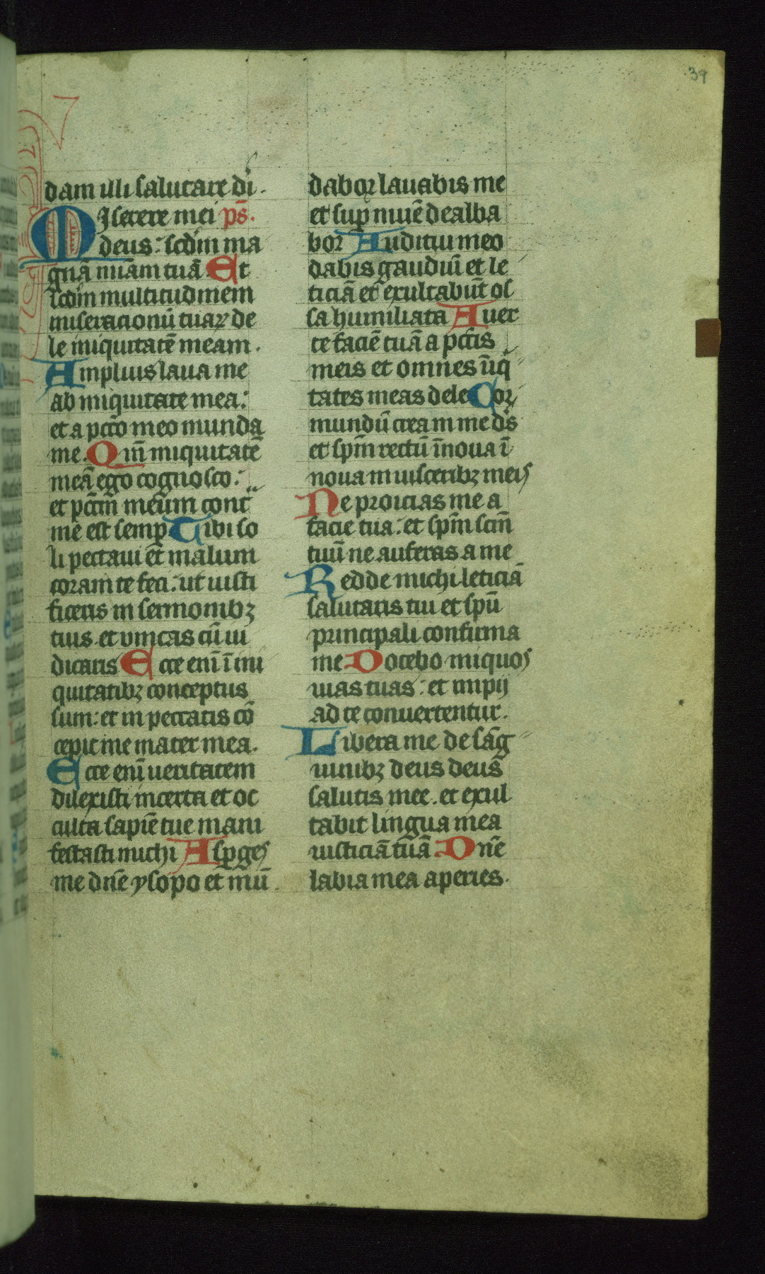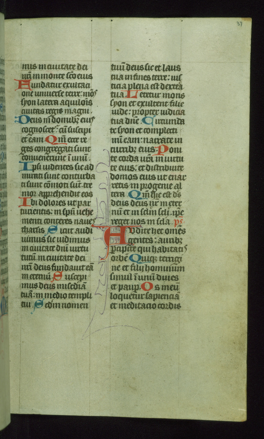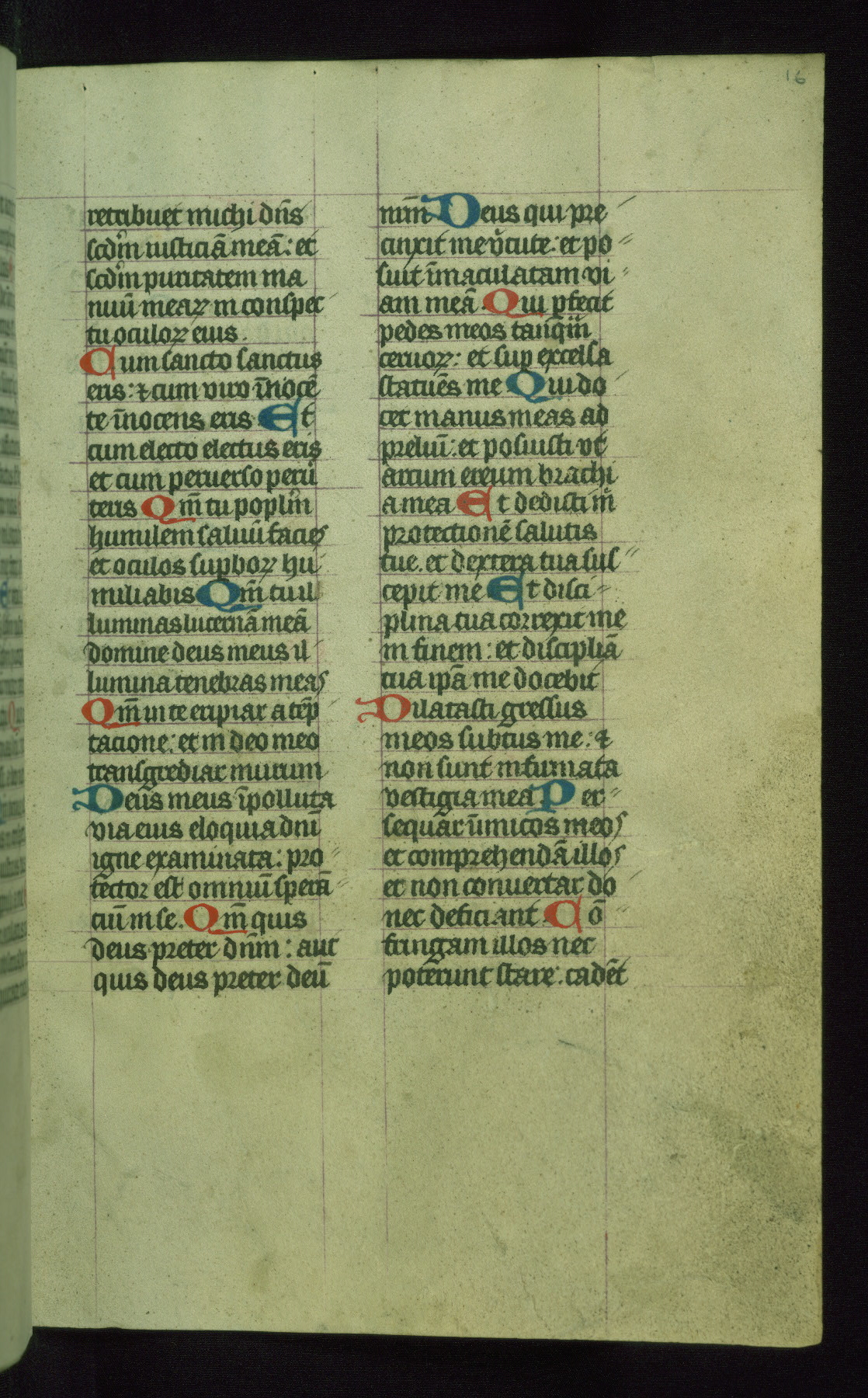 This small breviary, composed of more than 500 folios, is extraordinary for its length, considering it is the summer portion of a two-volume breviary for the use of Liège. The manuscript was completed for ecclesiastical use at the Cathedral of Notre-Dame and St.-Lambert in Liège ca. 1420. This attribution is suggested, for instance, by the petitions to the congregation of this cathedral (fols. 114v-117v), as well as the armorial shield of the family of Surlet de Chokier of Liège represented at the opening of the Psalms. The manuscript has modest, but interesting, decoration with historiated and decorated initials marking the liturgical texts, and occasional angels playing instruments in the margins. The most notable pictorial effect is found in the initials inhabited by transparent figures on rich blue ground. The technique is found, for instance, on fol. 156r with the gold monstrance held by translucent angels for the feast of the Corpus Christi.