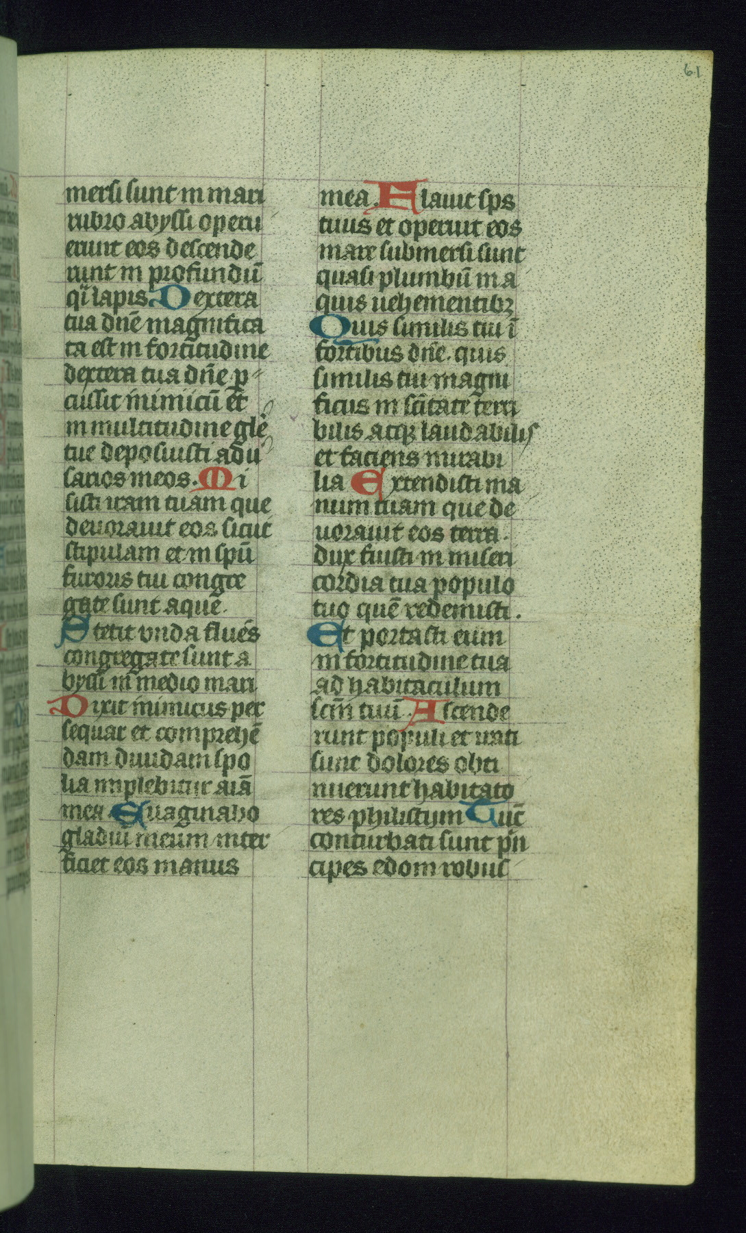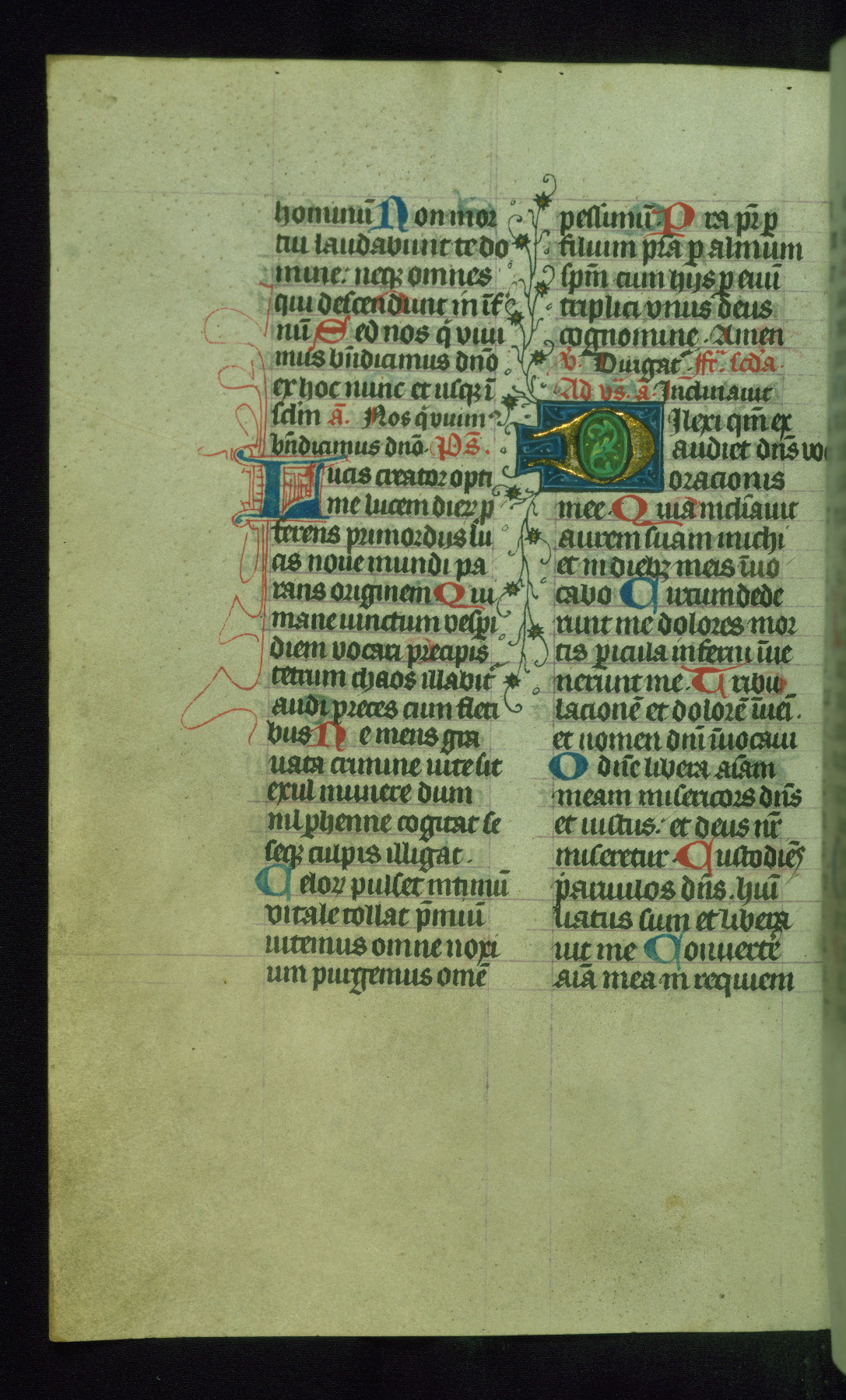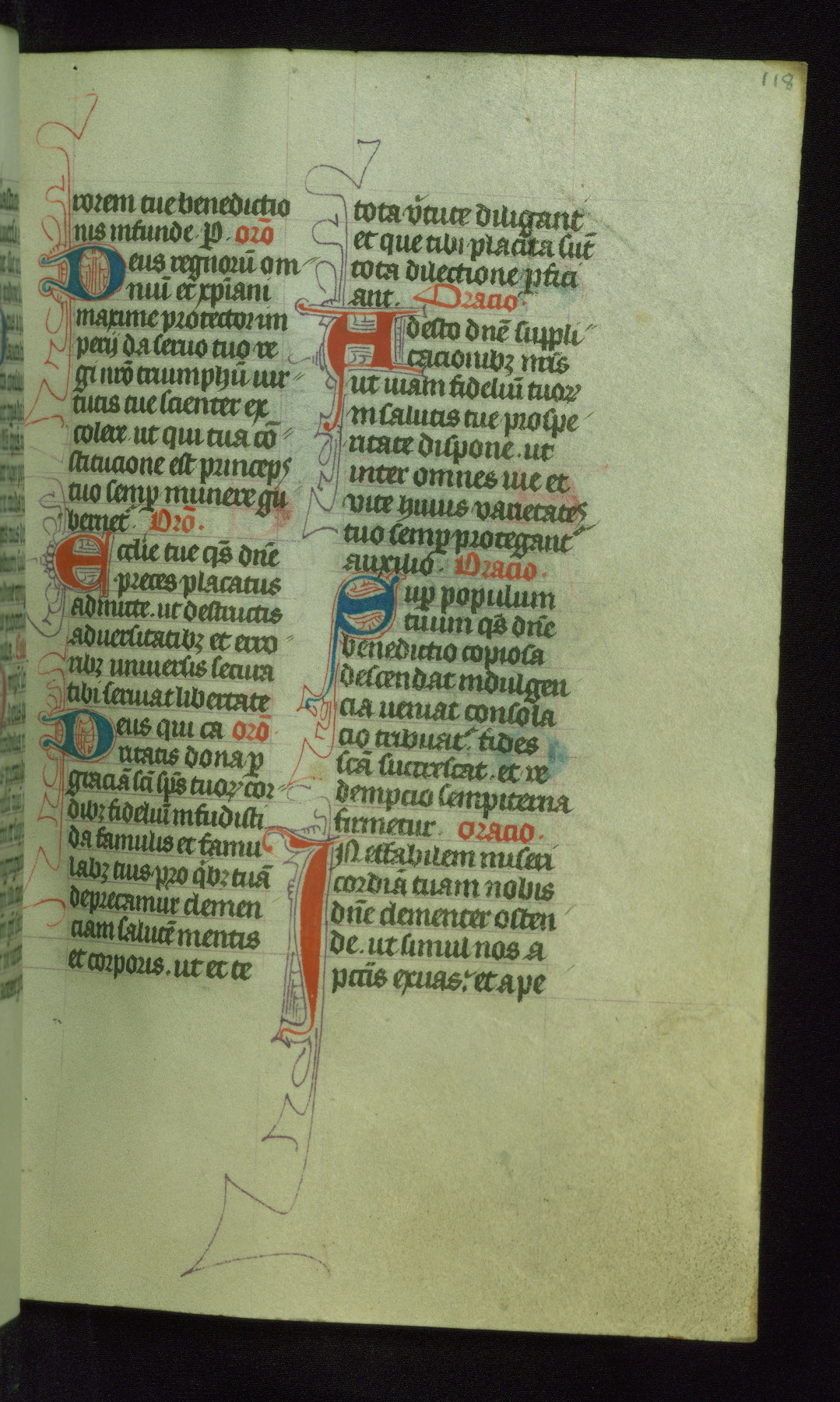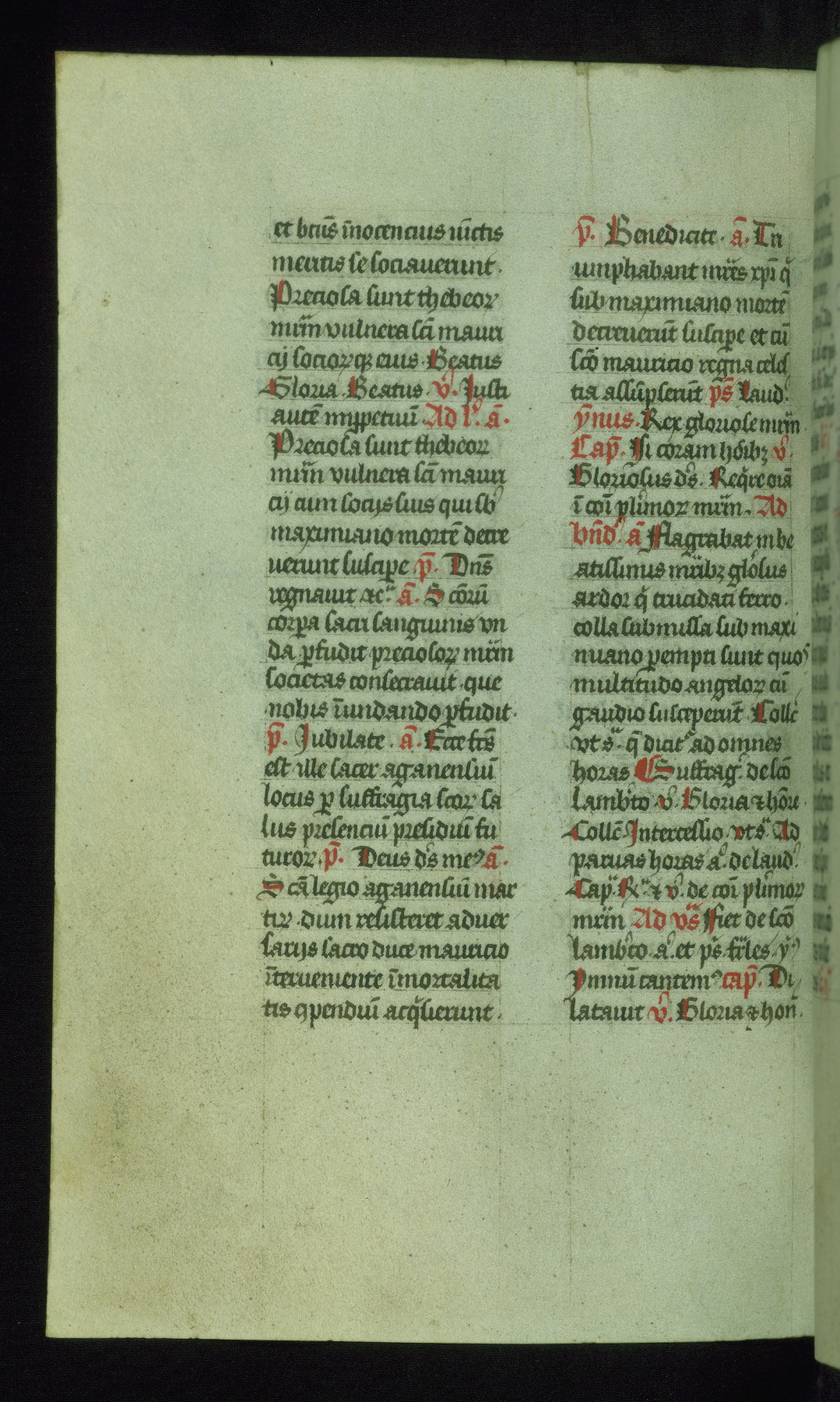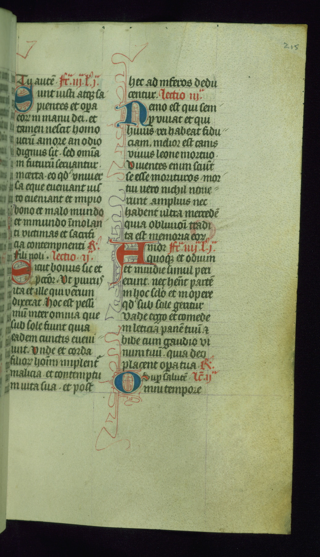 This small breviary, composed of more than 500 folios, is extraordinary for its length, considering it is the summer portion of a two-volume breviary for the use of Liège. The manuscript was completed for ecclesiastical use at the Cathedral of Notre-Dame and St.-Lambert in Liège ca. 1420. This attribution is suggested, for instance, by the petitions to the congregation of this cathedral (fols. 114v-117v), as well as the armorial shield of the family of Surlet de Chokier of Liège represented at the opening of the Psalms. The manuscript has modest, but interesting, decoration with historiated and decorated initials marking the liturgical texts, and occasional angels playing instruments in the margins. The most notable pictorial effect is found in the initials inhabited by transparent figures on rich blue ground. The technique is found, for instance, on fol. 156r with the gold monstrance held by translucent angels for the feast of the Corpus Christi.