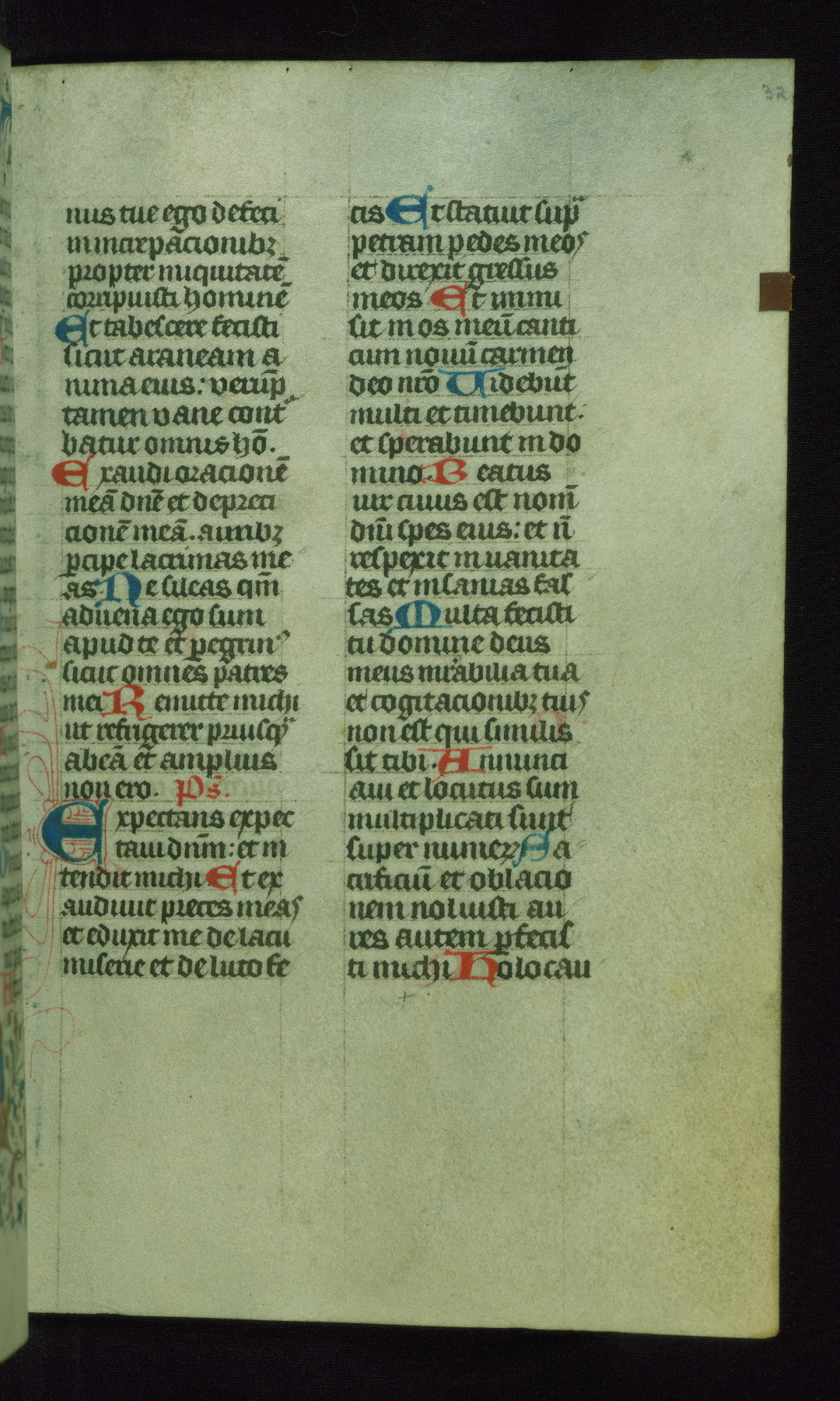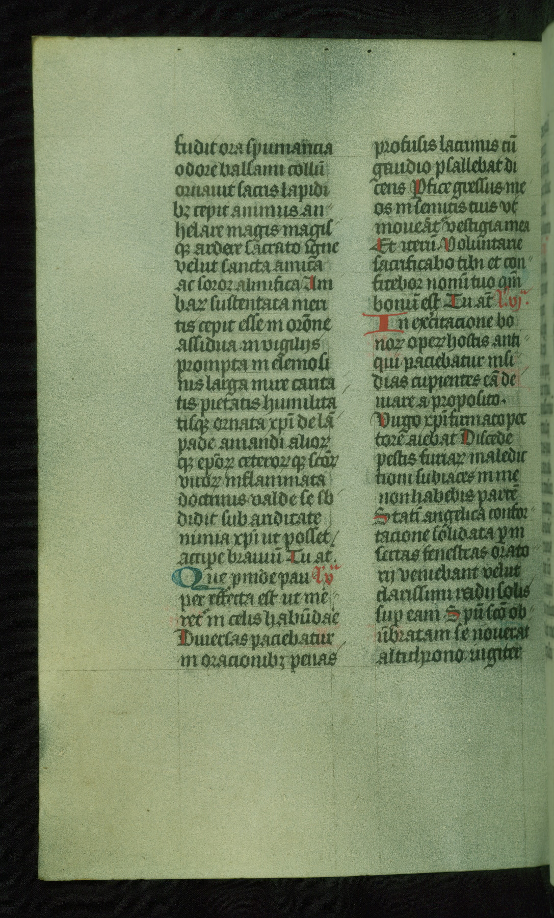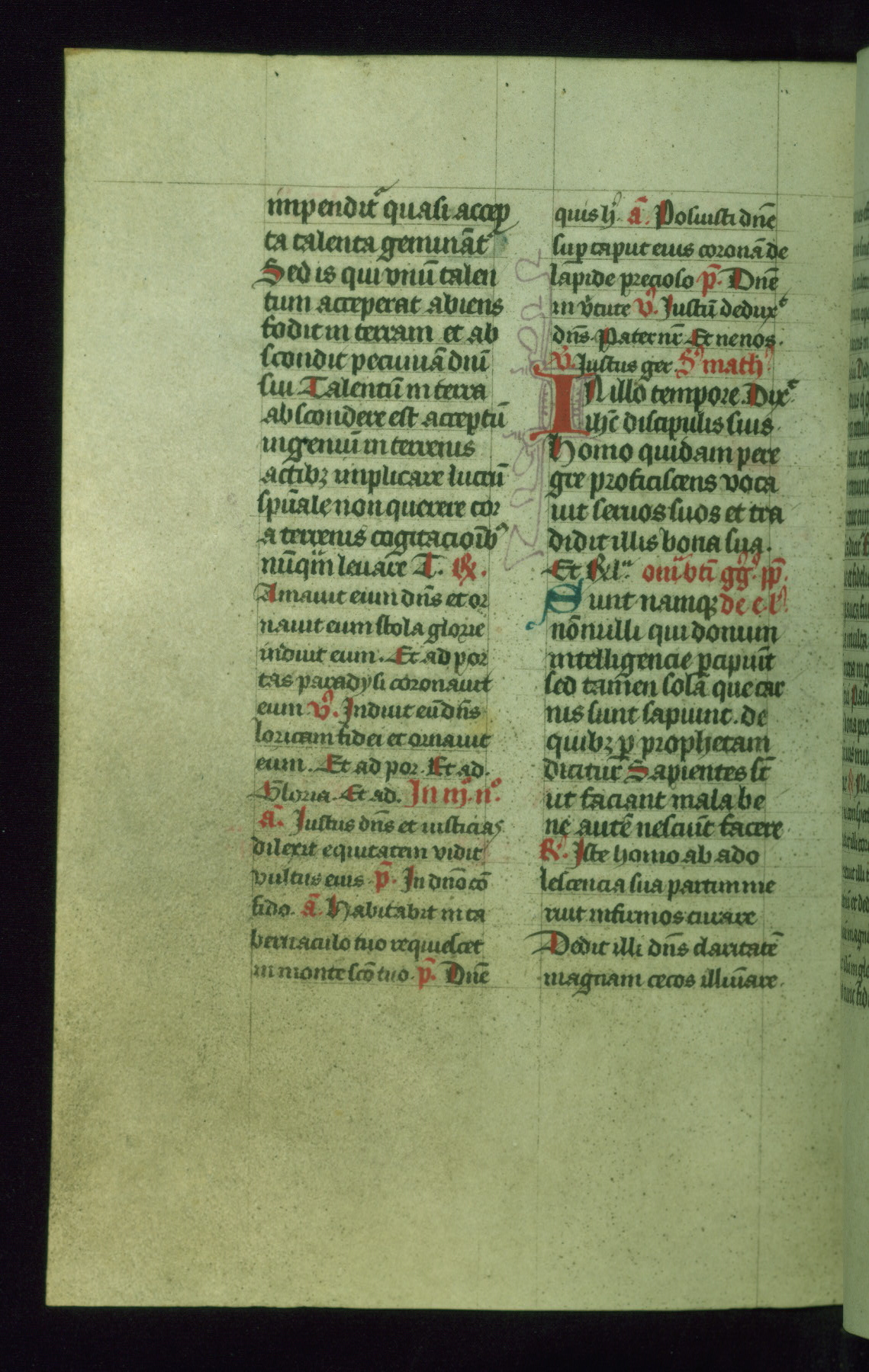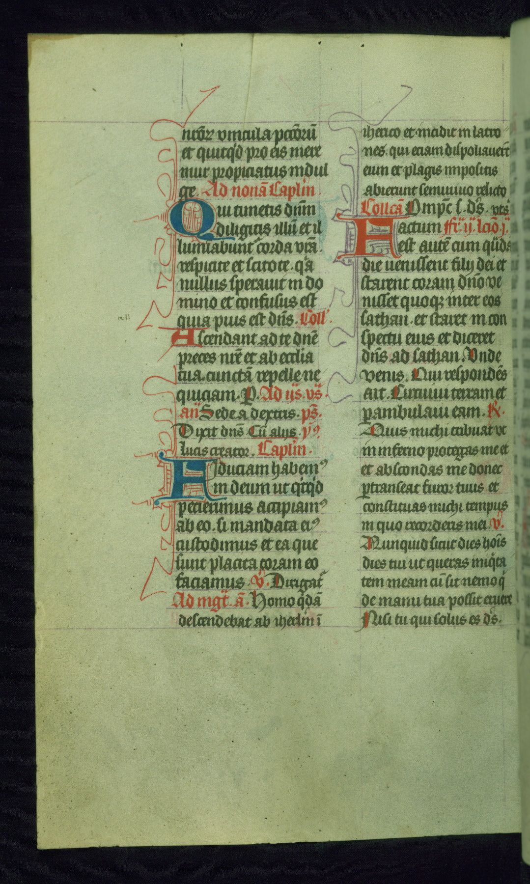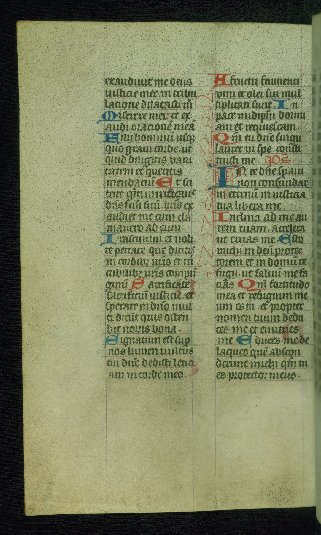 This small breviary, composed of more than 500 folios, is extraordinary for its length, considering it is the summer portion of a two-volume breviary for the use of Liège. The manuscript was completed for ecclesiastical use at the Cathedral of Notre-Dame and St.-Lambert in Liège ca. 1420. This attribution is suggested, for instance, by the petitions to the congregation of this cathedral (fols. 114v-117v), as well as the armorial shield of the family of Surlet de Chokier of Liège represented at the opening of the Psalms. The manuscript has modest, but interesting, decoration with historiated and decorated initials marking the liturgical texts, and occasional angels playing instruments in the margins. The most notable pictorial effect is found in the initials inhabited by transparent figures on rich blue ground. The technique is found, for instance, on fol. 156r with the gold monstrance held by translucent angels for the feast of the Corpus Christi.
