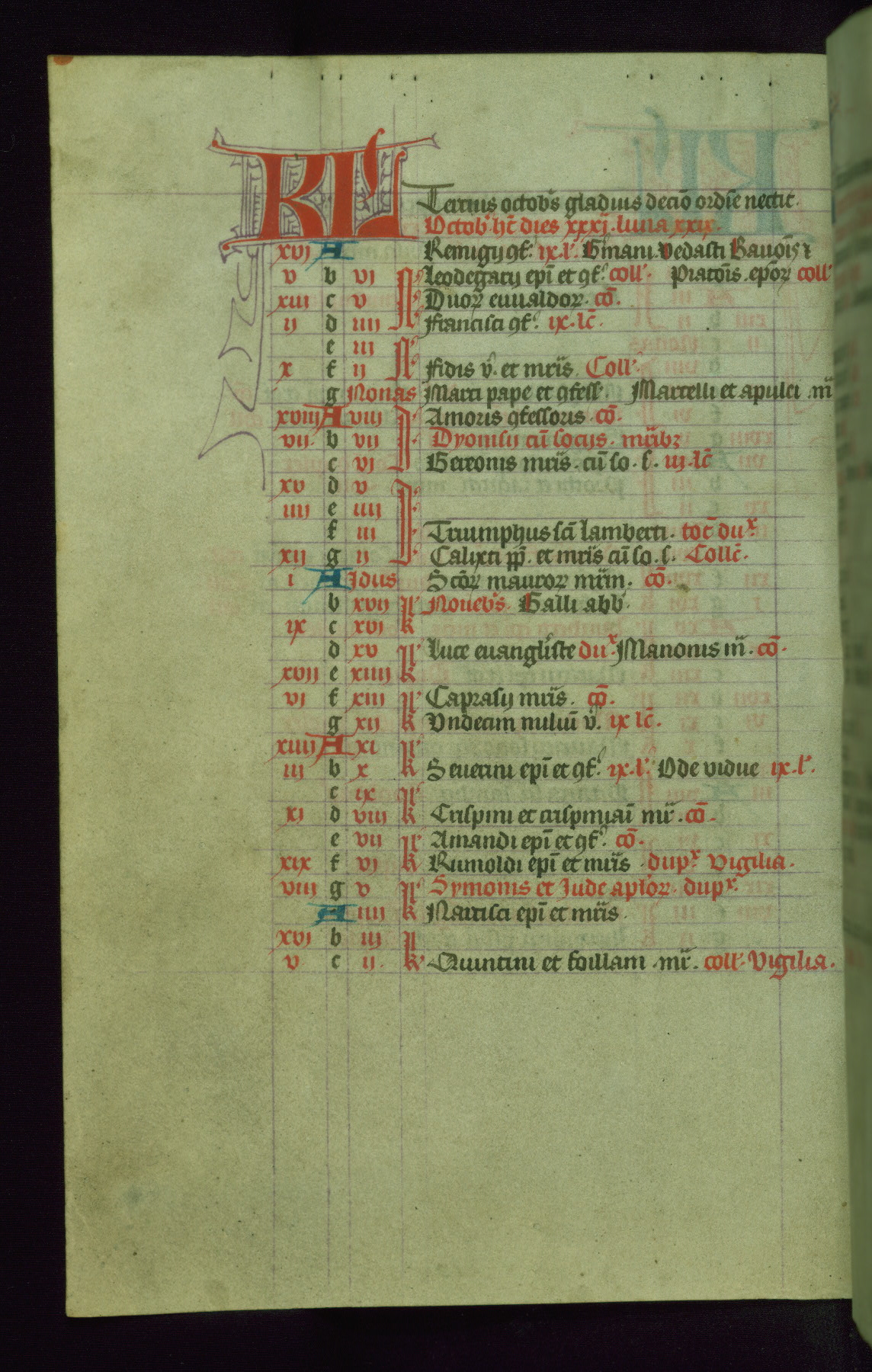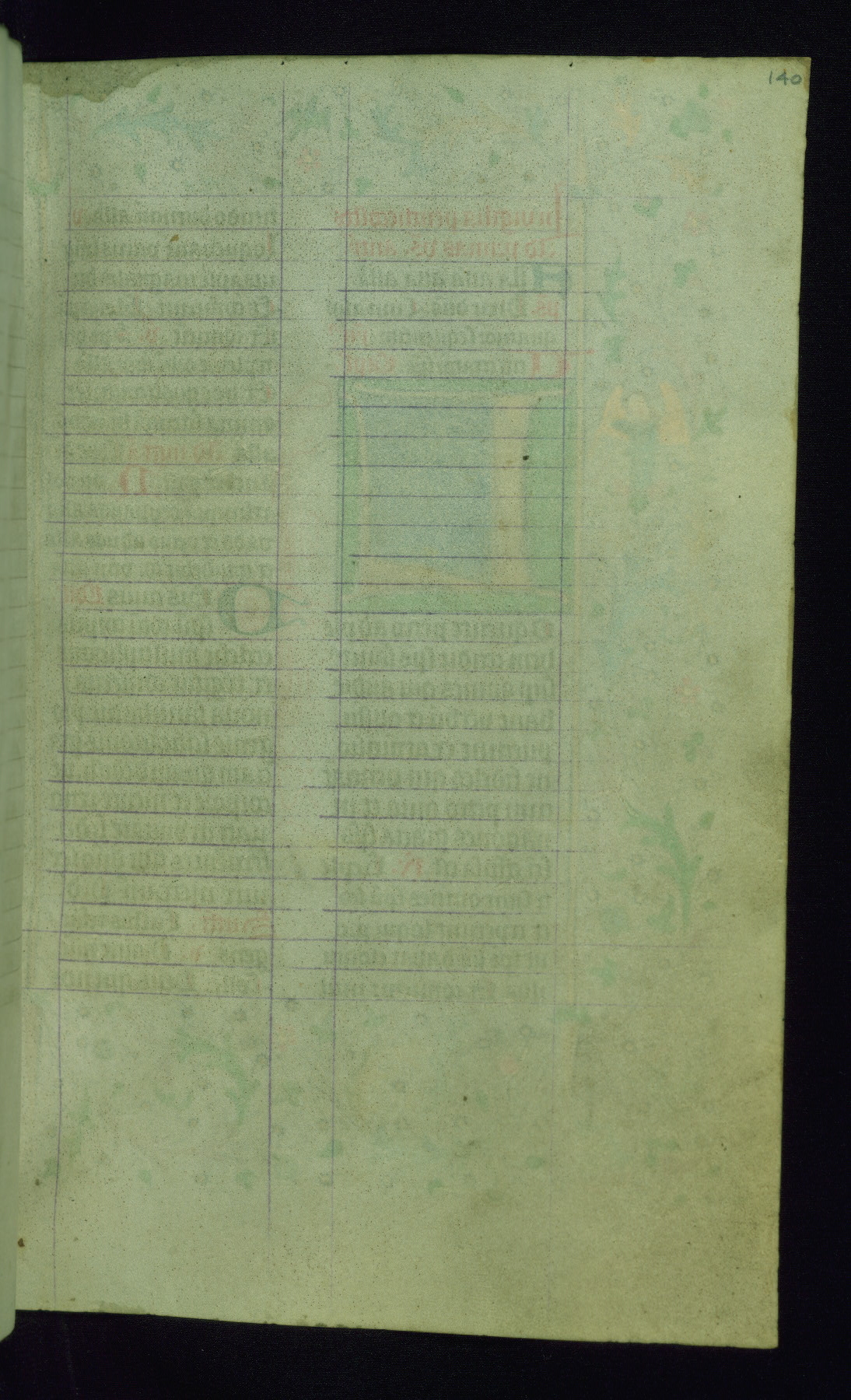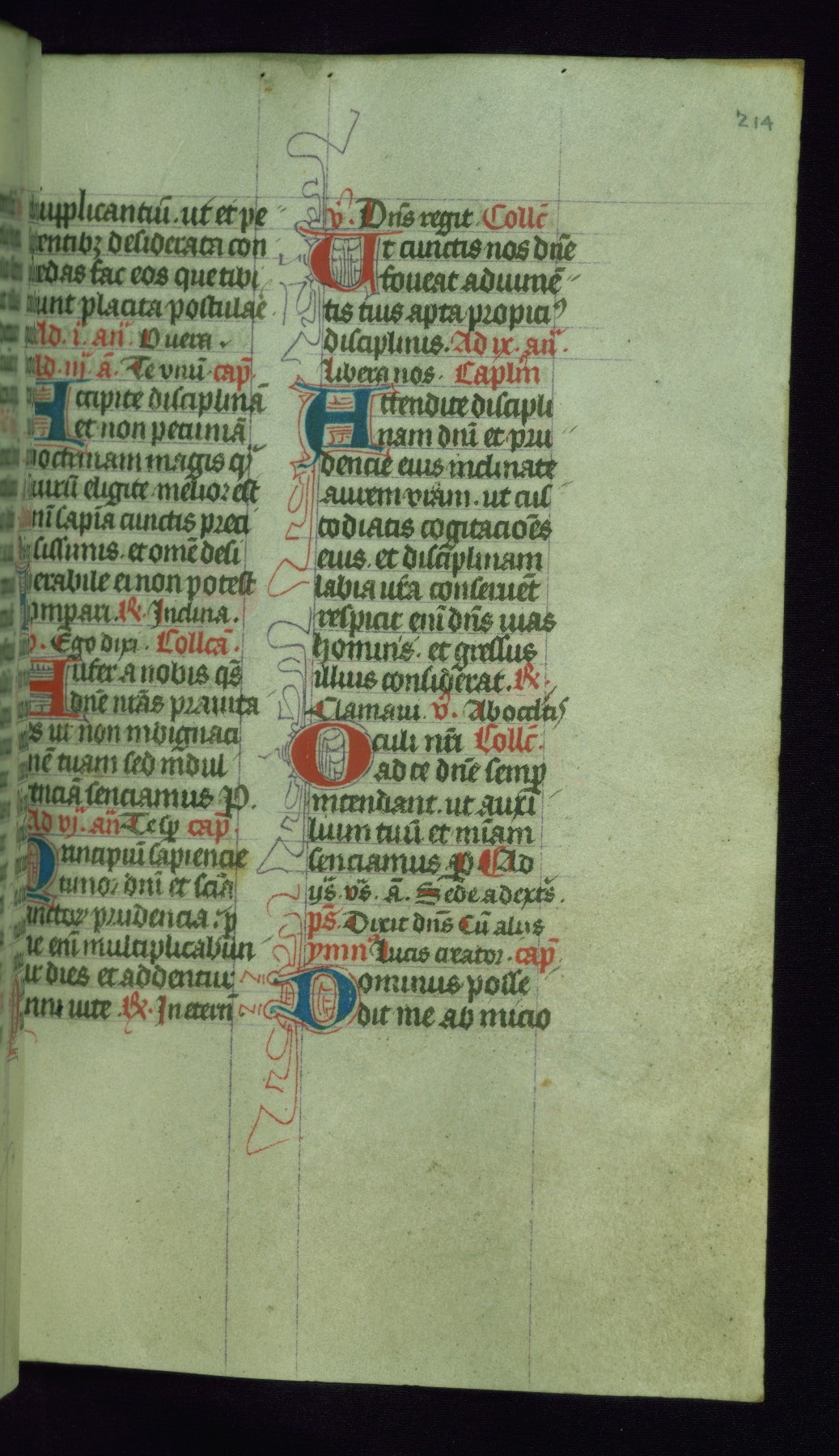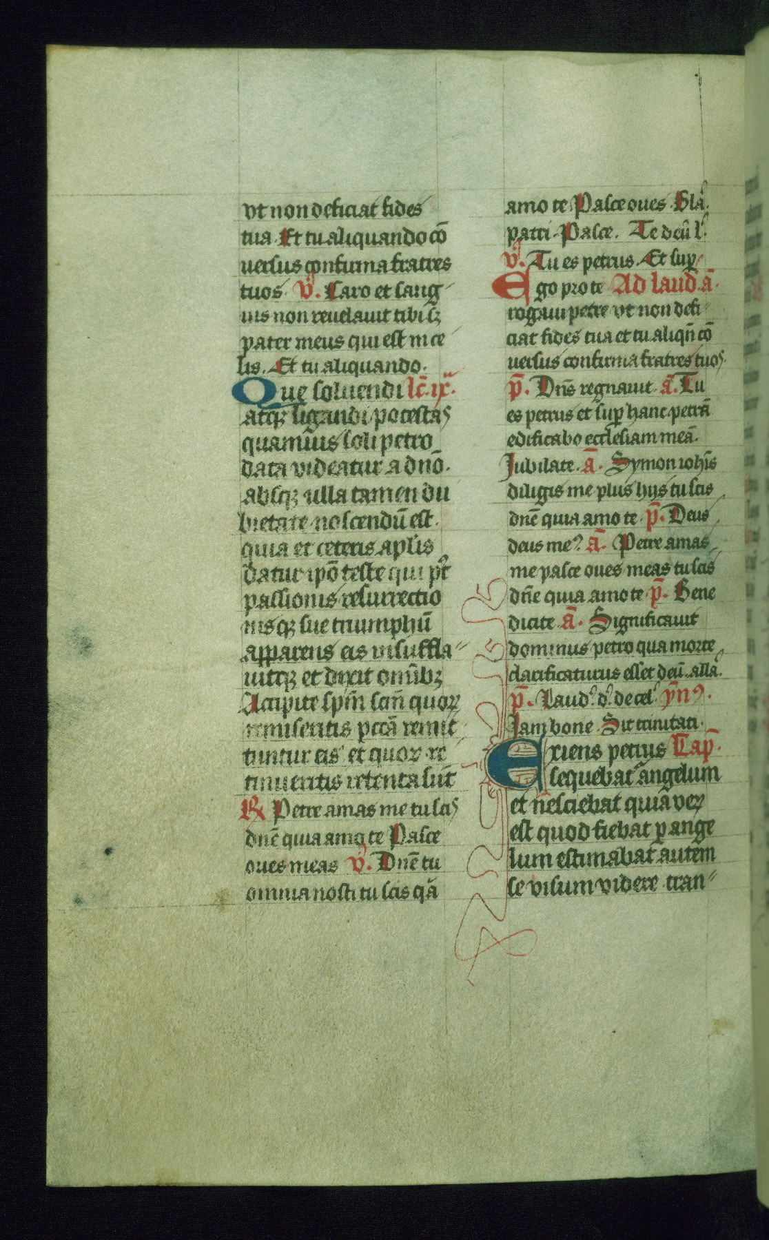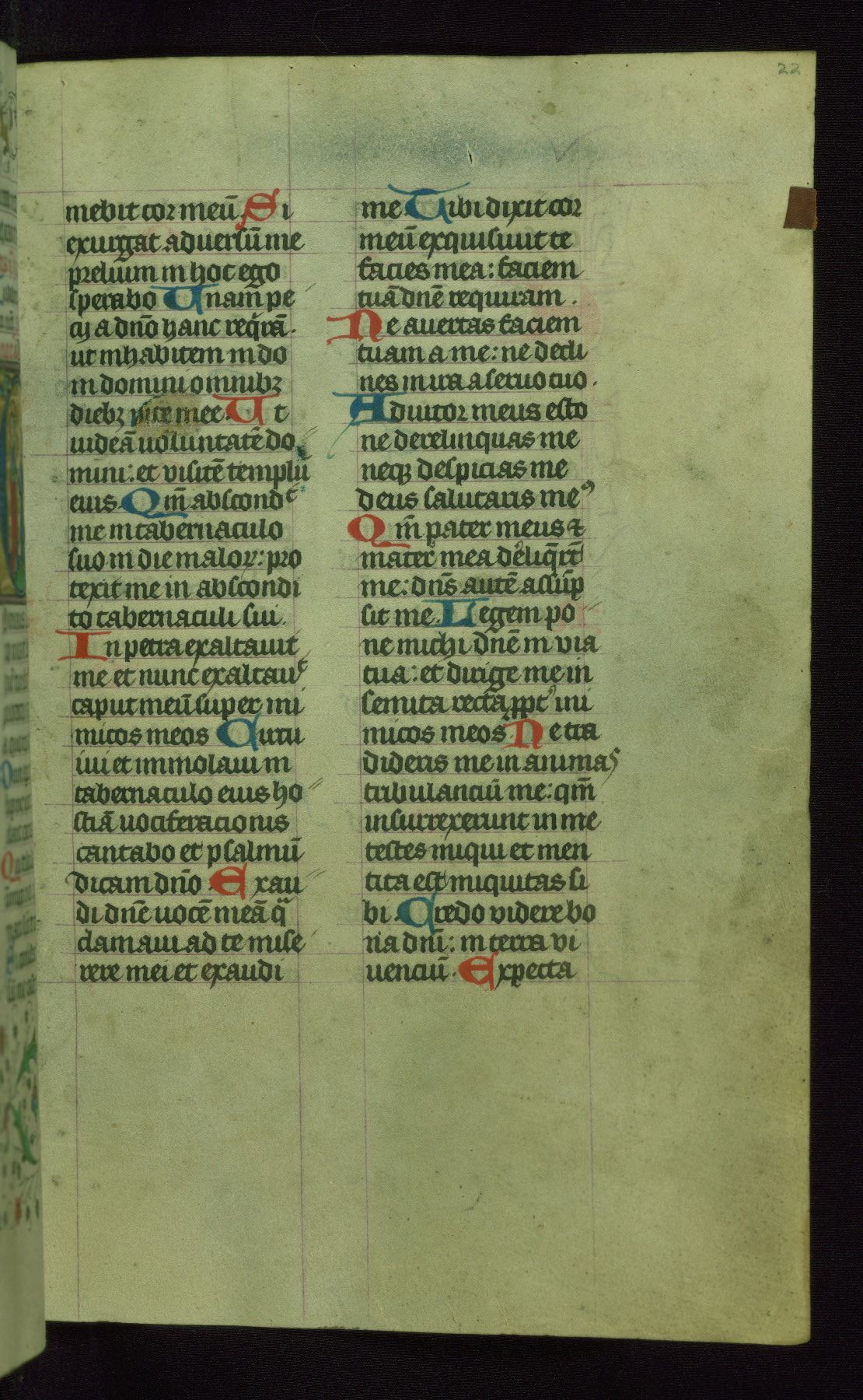 This small breviary, composed of more than 500 folios, is extraordinary for its length, considering it is the summer portion of a two-volume breviary for the use of Liège. The manuscript was completed for ecclesiastical use at the Cathedral of Notre-Dame and St.-Lambert in Liège ca. 1420. This attribution is suggested, for instance, by the petitions to the congregation of this cathedral (fols. 114v-117v), as well as the armorial shield of the family of Surlet de Chokier of Liège represented at the opening of the Psalms. The manuscript has modest, but interesting, decoration with historiated and decorated initials marking the liturgical texts, and occasional angels playing instruments in the margins. The most notable pictorial effect is found in the initials inhabited by transparent figures on rich blue ground. The technique is found, for instance, on fol. 156r with the gold monstrance held by translucent angels for the feast of the Corpus Christi.