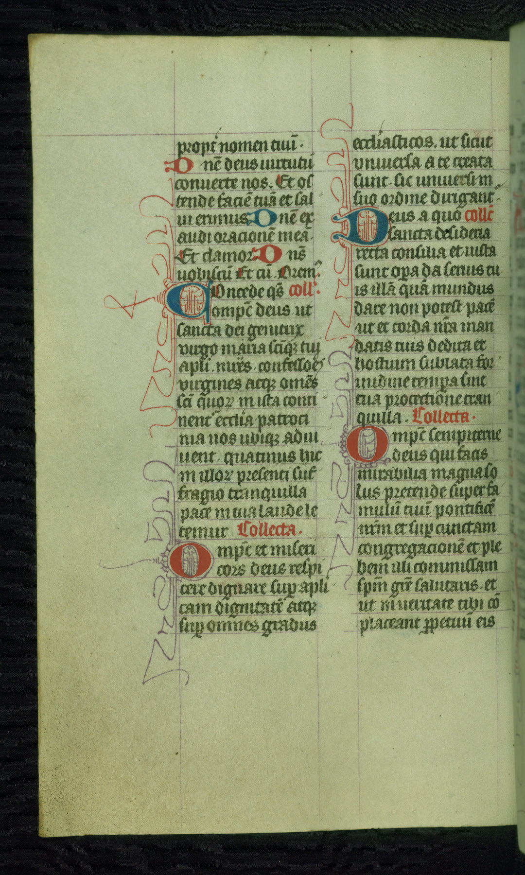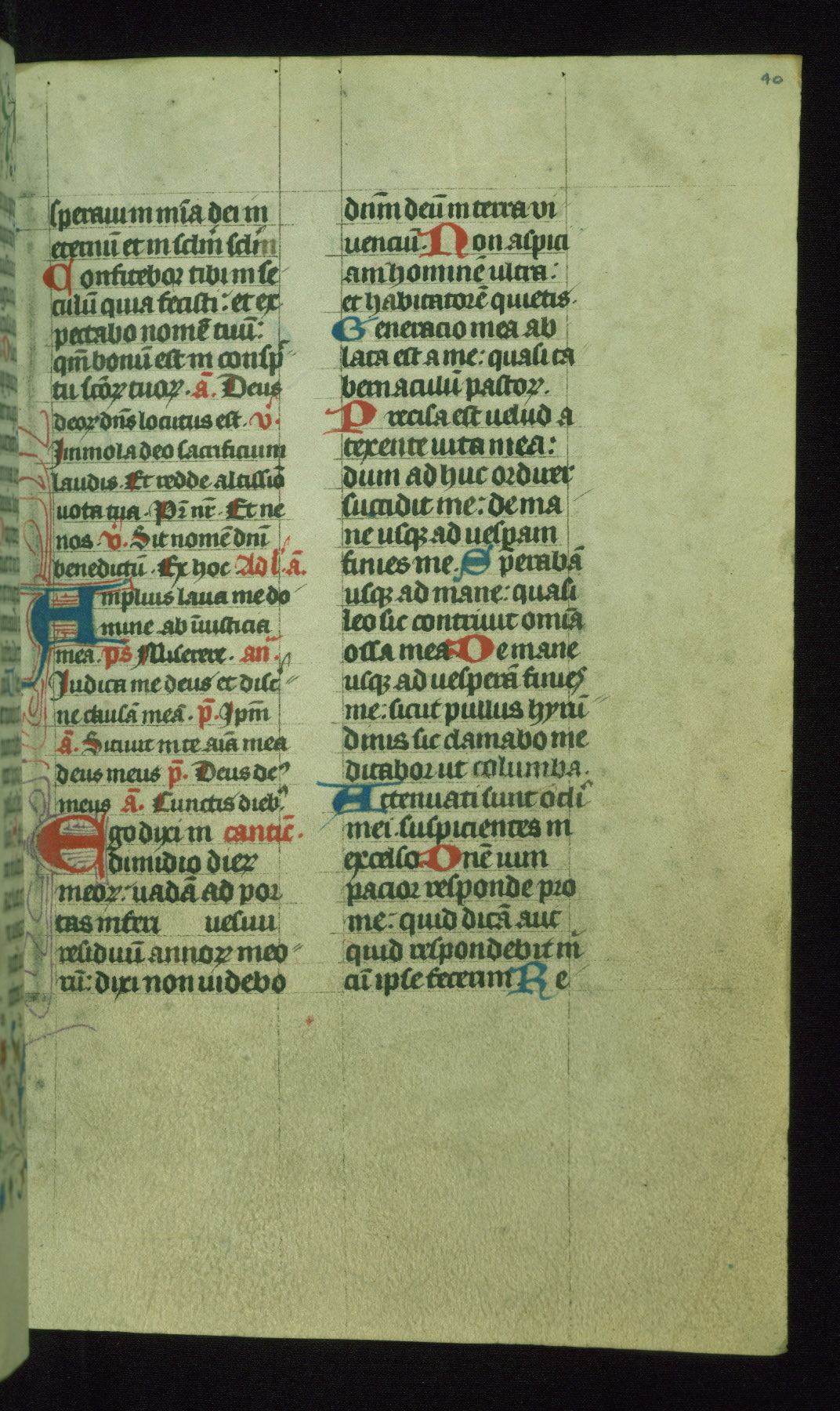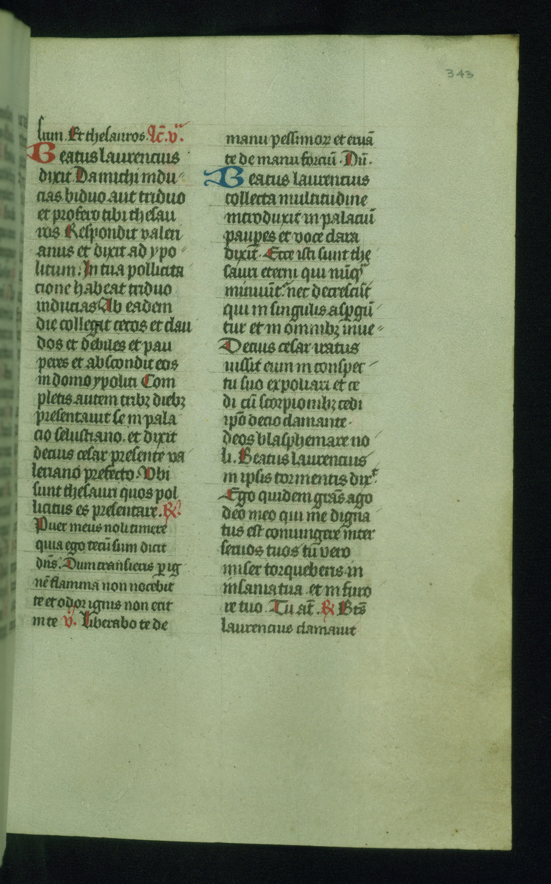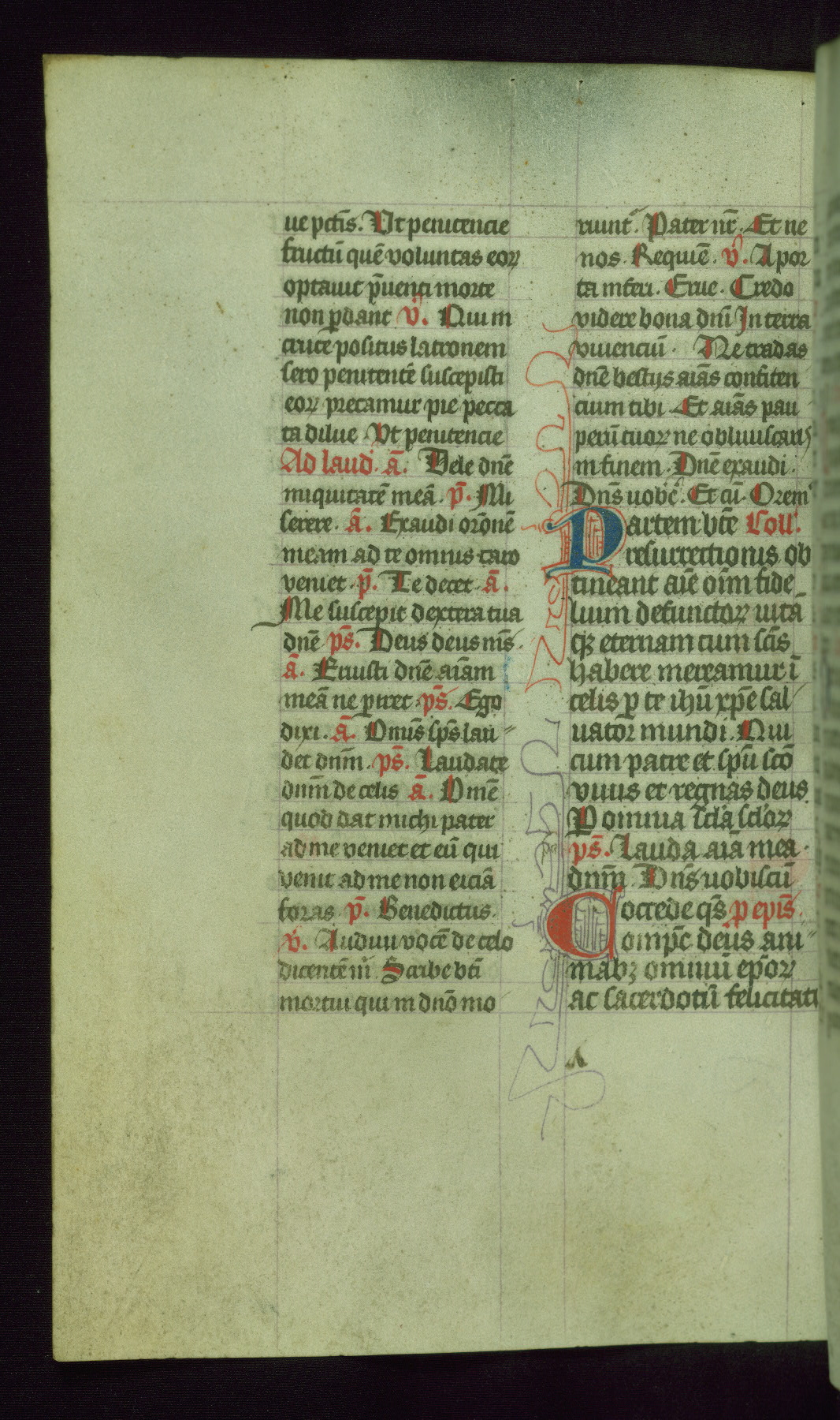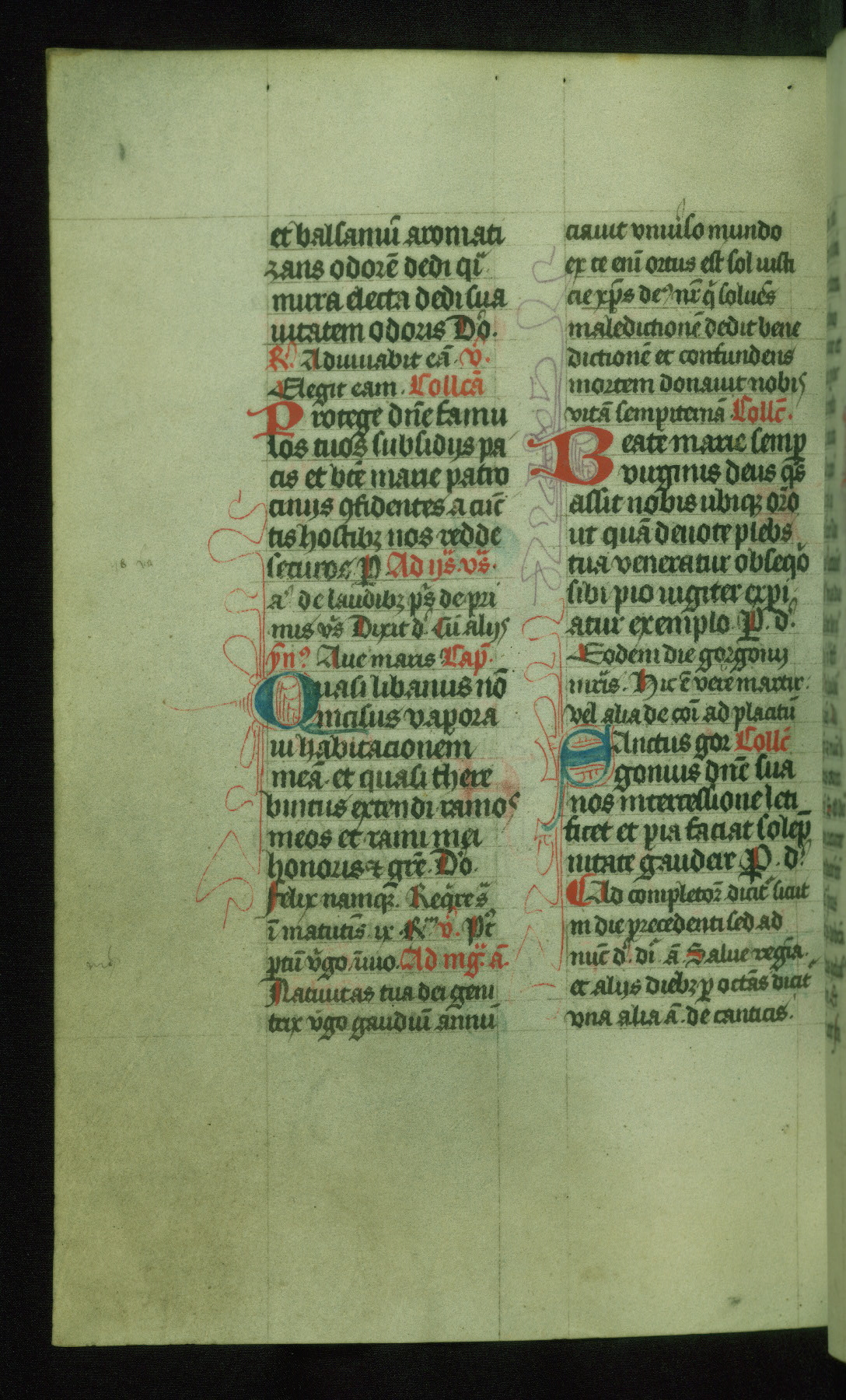 This small breviary, composed of more than 500 folios, is extraordinary for its length, considering it is the summer portion of a two-volume breviary for the use of Liège. The manuscript was completed for ecclesiastical use at the Cathedral of Notre-Dame and St.-Lambert in Liège ca. 1420. This attribution is suggested, for instance, by the petitions to the congregation of this cathedral (fols. 114v-117v), as well as the armorial shield of the family of Surlet de Chokier of Liège represented at the opening of the Psalms. The manuscript has modest, but interesting, decoration with historiated and decorated initials marking the liturgical texts, and occasional angels playing instruments in the margins. The most notable pictorial effect is found in the initials inhabited by transparent figures on rich blue ground. The technique is found, for instance, on fol. 156r with the gold monstrance held by translucent angels for the feast of the Corpus Christi.