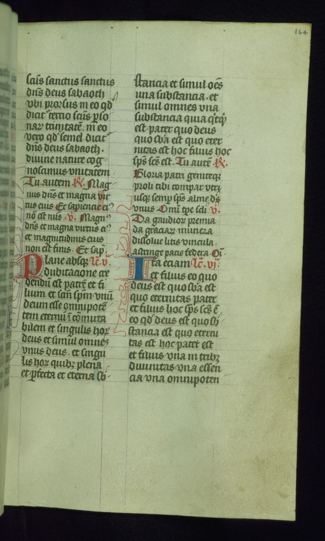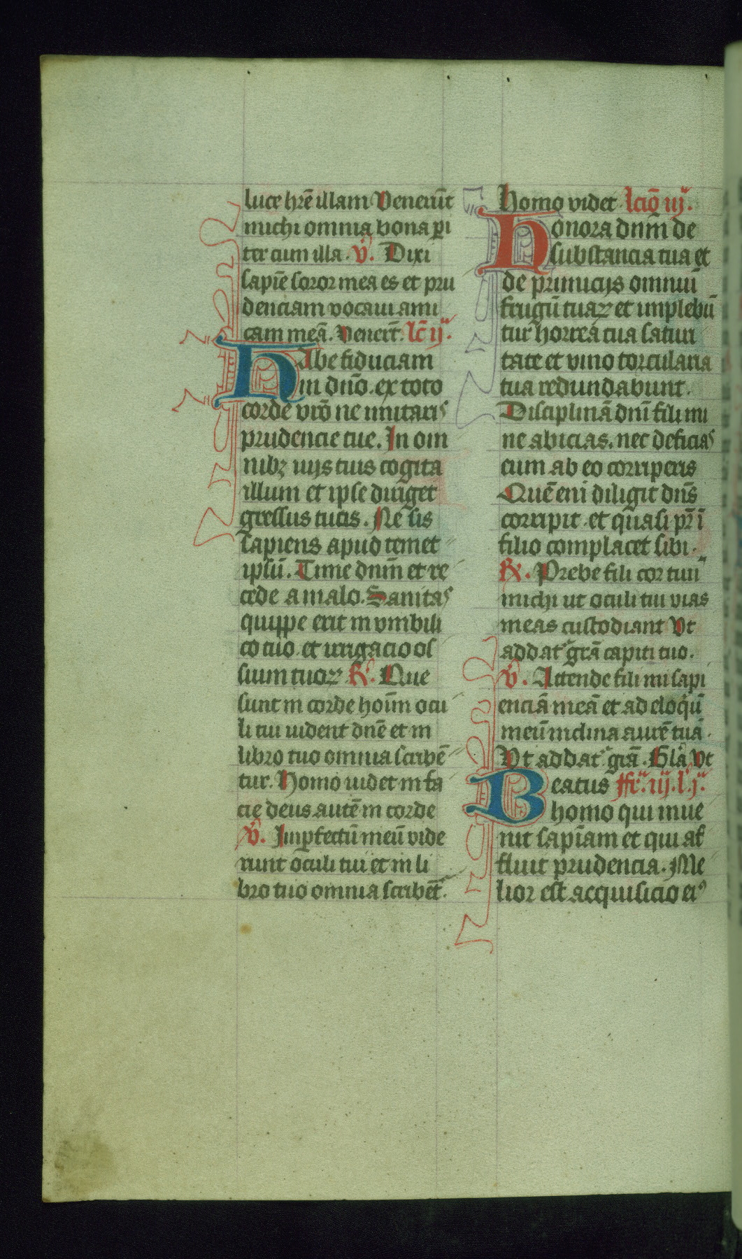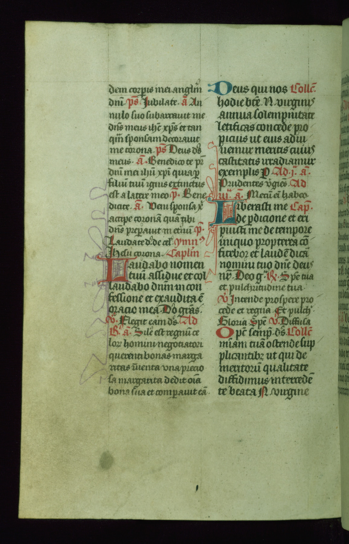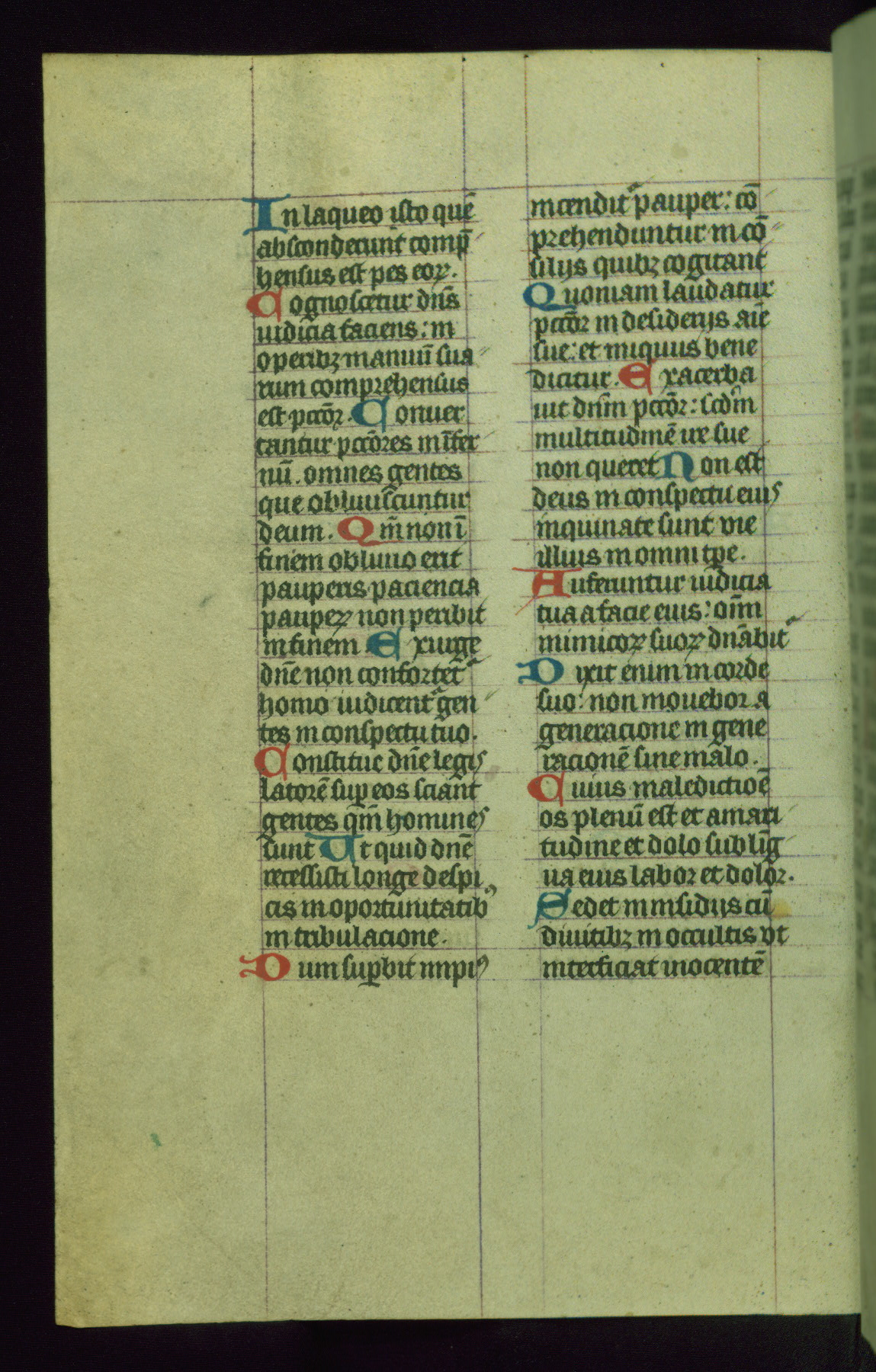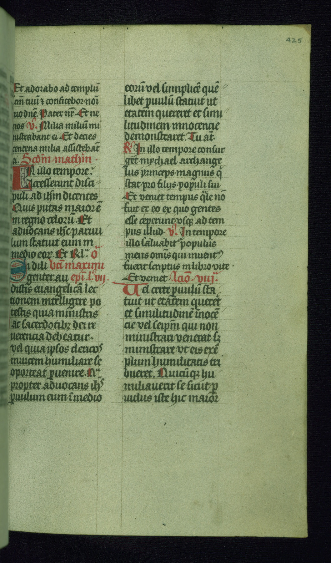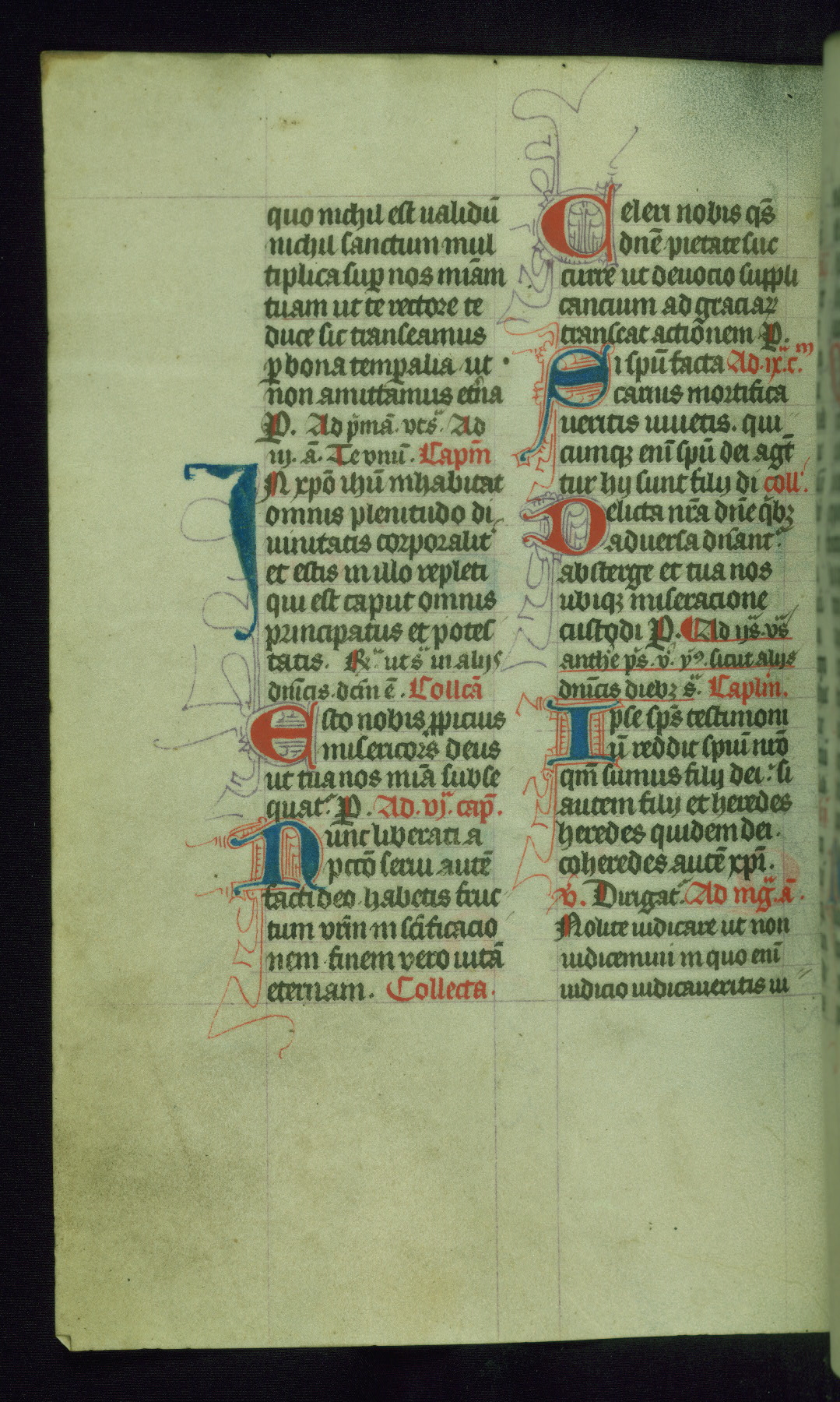 This small breviary, composed of more than 500 folios, is extraordinary for its length, considering it is the summer portion of a two-volume breviary for the use of Liège. The manuscript was completed for ecclesiastical use at the Cathedral of Notre-Dame and St.-Lambert in Liège ca. 1420. This attribution is suggested, for instance, by the petitions to the congregation of this cathedral (fols. 114v-117v), as well as the armorial shield of the family of Surlet de Chokier of Liège represented at the opening of the Psalms. The manuscript has modest, but interesting, decoration with historiated and decorated initials marking the liturgical texts, and occasional angels playing instruments in the margins. The most notable pictorial effect is found in the initials inhabited by transparent figures on rich blue ground. The technique is found, for instance, on fol. 156r with the gold monstrance held by translucent angels for the feast of the Corpus Christi.