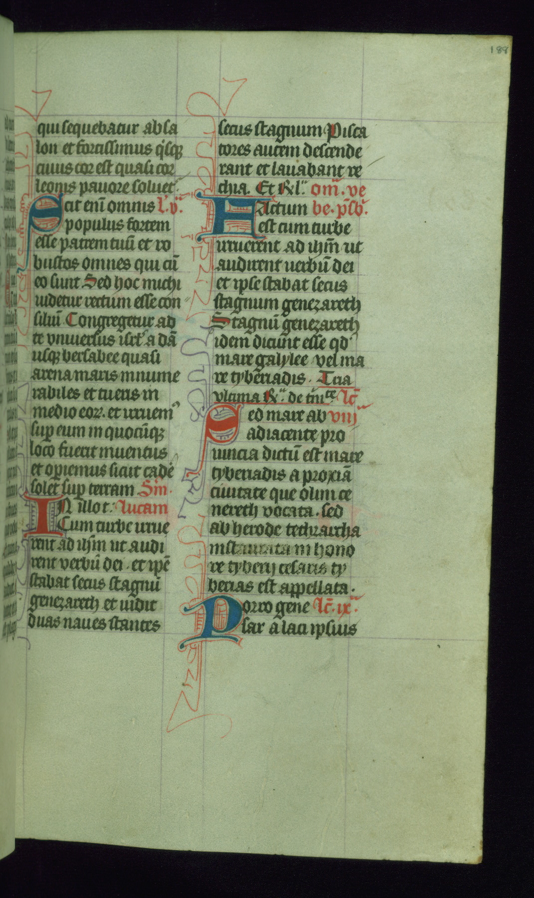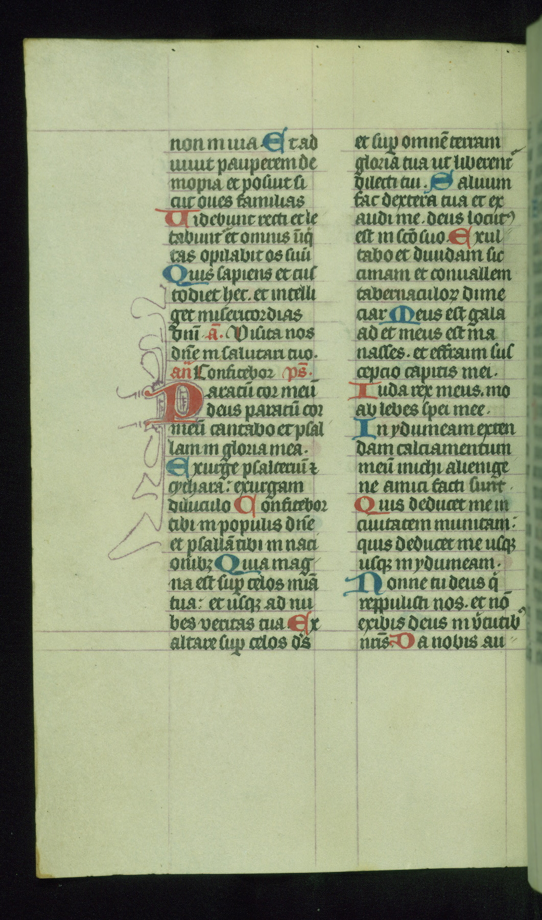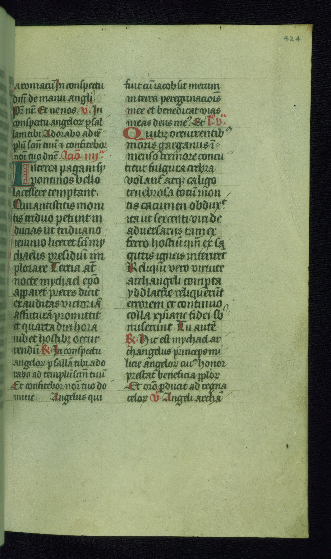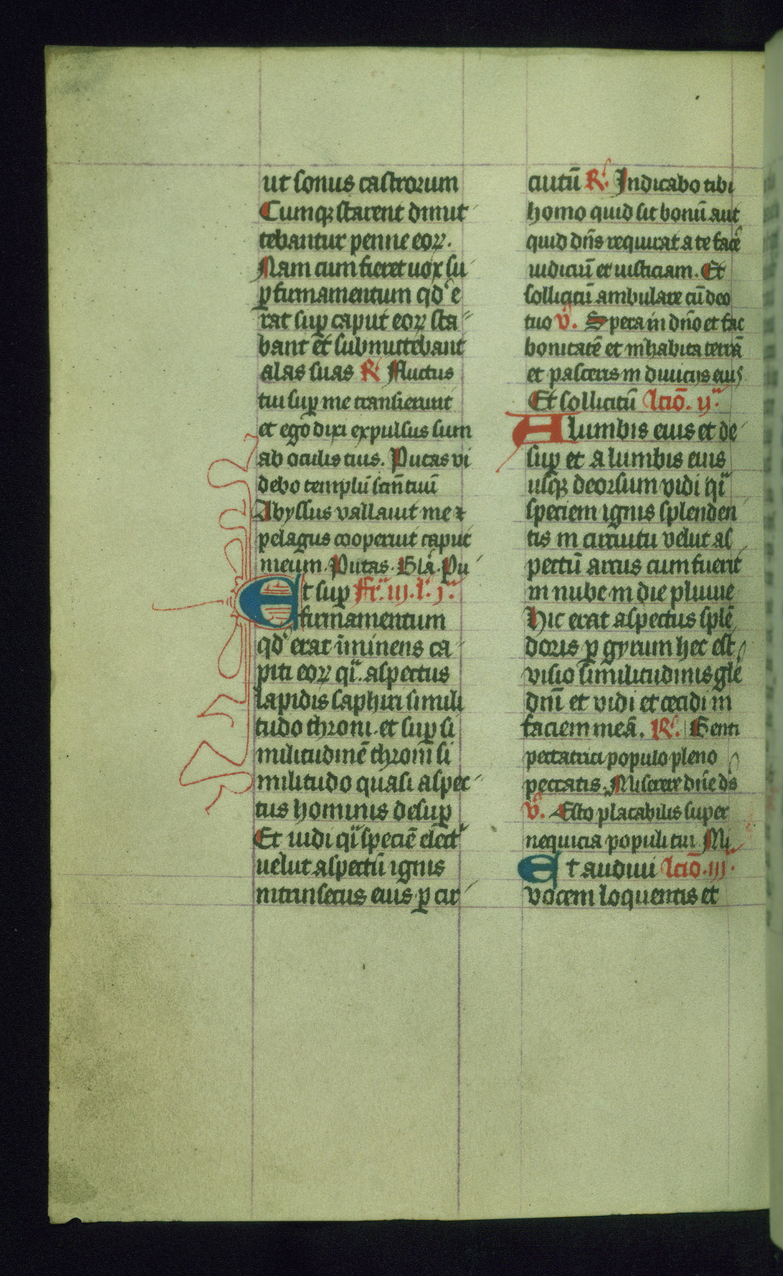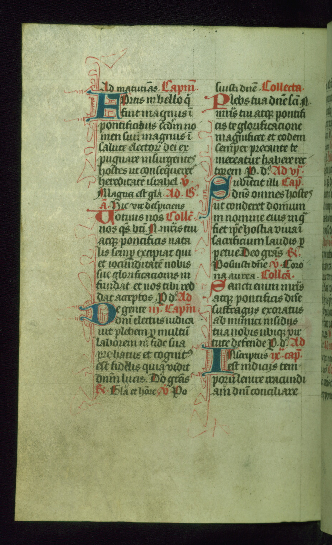 This small breviary, composed of more than 500 folios, is extraordinary for its length, considering it is the summer portion of a two-volume breviary for the use of Liège. The manuscript was completed for ecclesiastical use at the Cathedral of Notre-Dame and St.-Lambert in Liège ca. 1420. This attribution is suggested, for instance, by the petitions to the congregation of this cathedral (fols. 114v-117v), as well as the armorial shield of the family of Surlet de Chokier of Liège represented at the opening of the Psalms. The manuscript has modest, but interesting, decoration with historiated and decorated initials marking the liturgical texts, and occasional angels playing instruments in the margins. The most notable pictorial effect is found in the initials inhabited by transparent figures on rich blue ground. The technique is found, for instance, on fol. 156r with the gold monstrance held by translucent angels for the feast of the Corpus Christi.