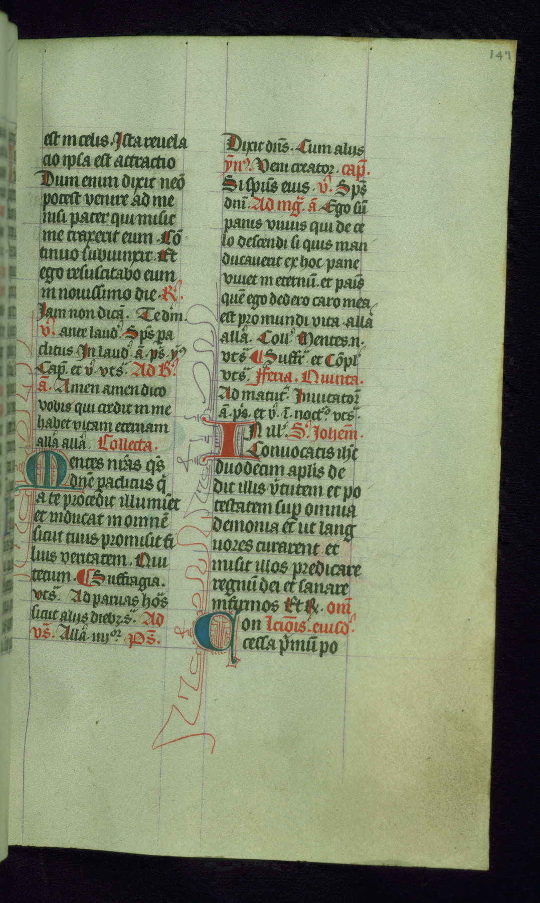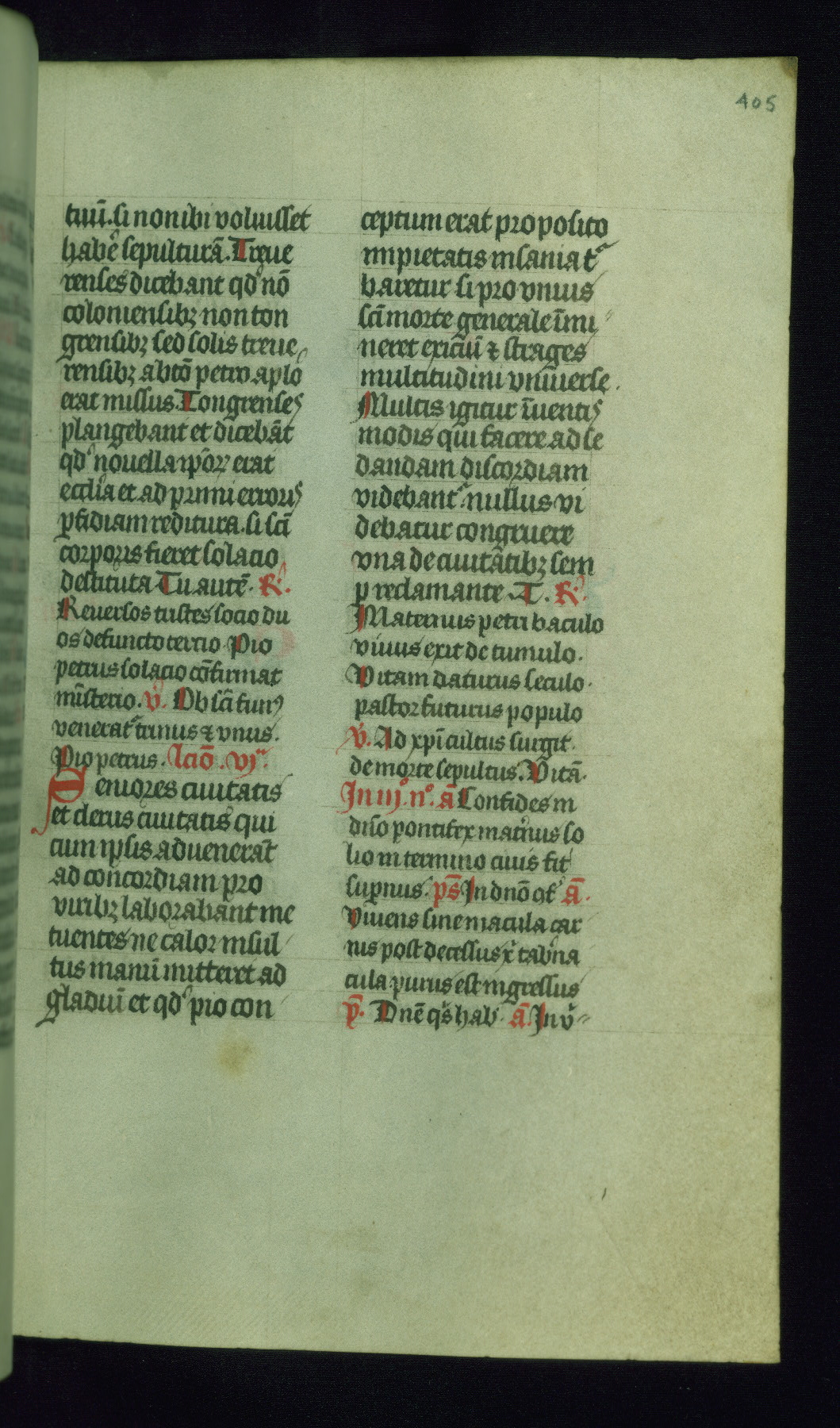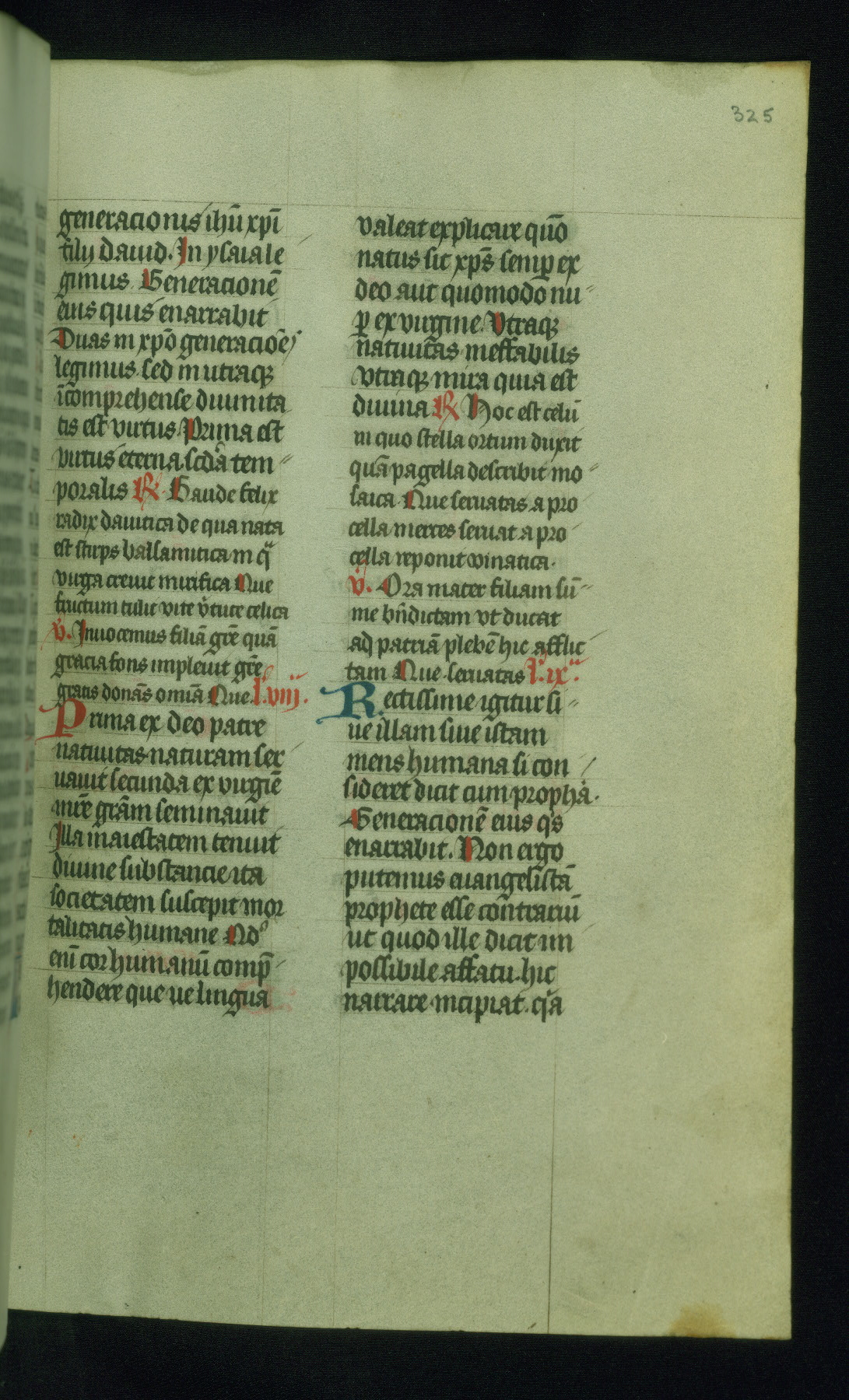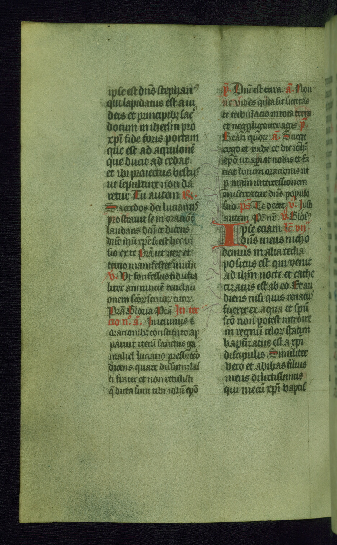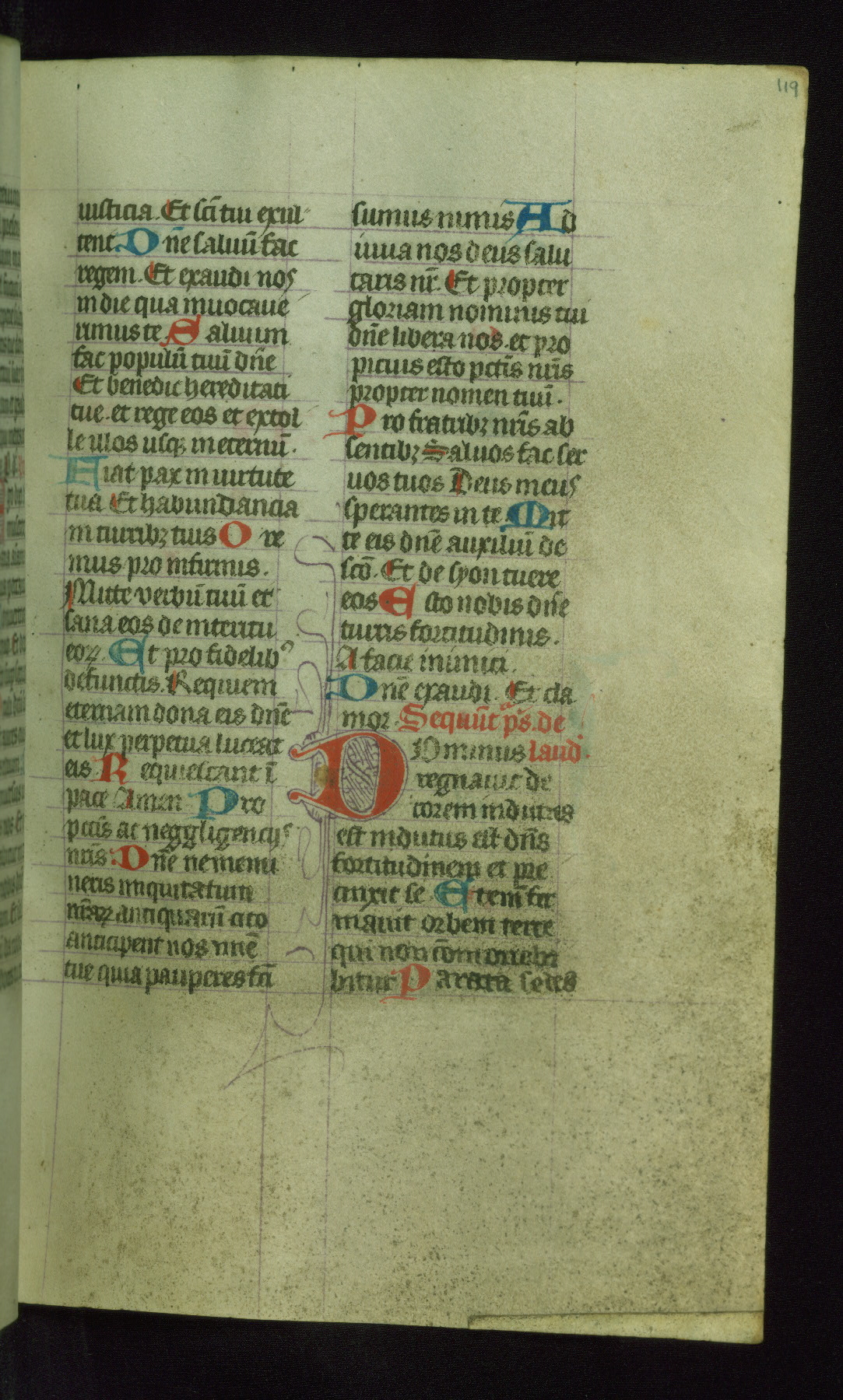 This small breviary, composed of more than 500 folios, is extraordinary for its length, considering it is the summer portion of a two-volume breviary for the use of Liège. The manuscript was completed for ecclesiastical use at the Cathedral of Notre-Dame and St.-Lambert in Liège ca. 1420. This attribution is suggested, for instance, by the petitions to the congregation of this cathedral (fols. 114v-117v), as well as the armorial shield of the family of Surlet de Chokier of Liège represented at the opening of the Psalms. The manuscript has modest, but interesting, decoration with historiated and decorated initials marking the liturgical texts, and occasional angels playing instruments in the margins. The most notable pictorial effect is found in the initials inhabited by transparent figures on rich blue ground. The technique is found, for instance, on fol. 156r with the gold monstrance held by translucent angels for the feast of the Corpus Christi.