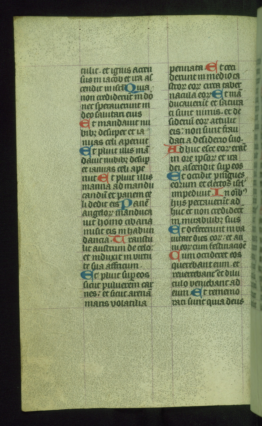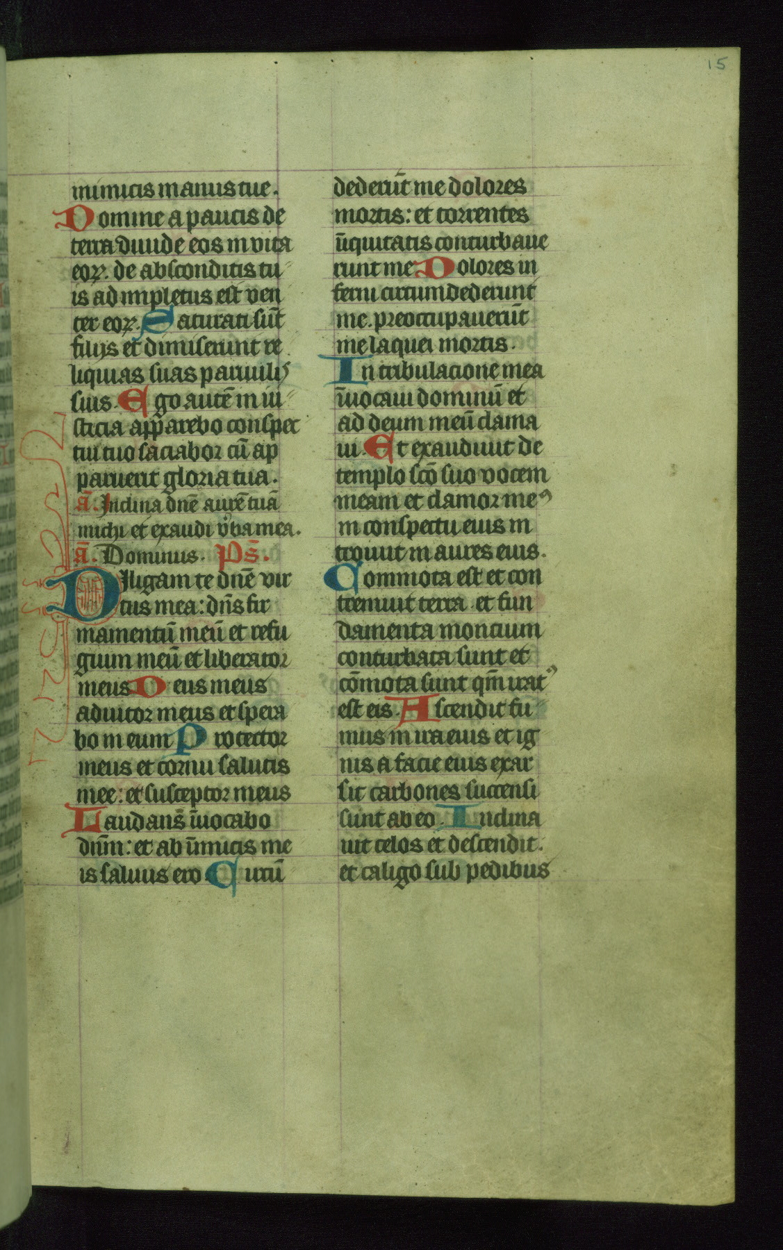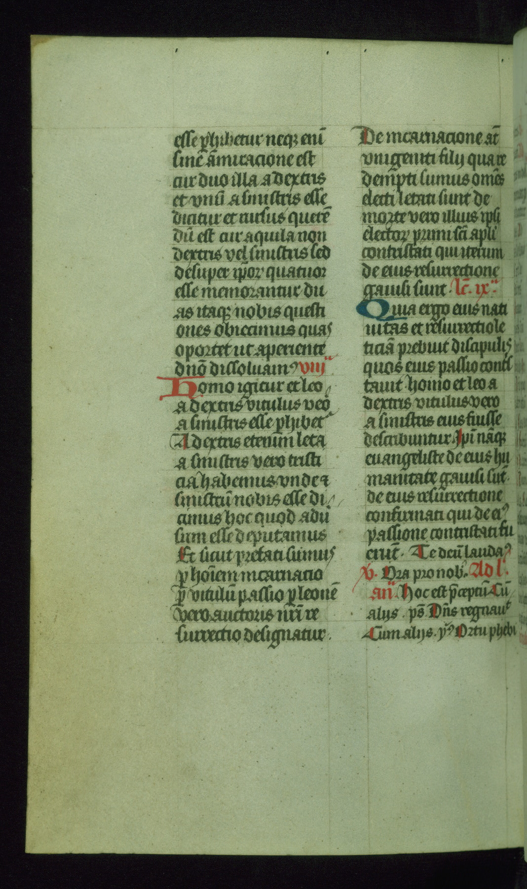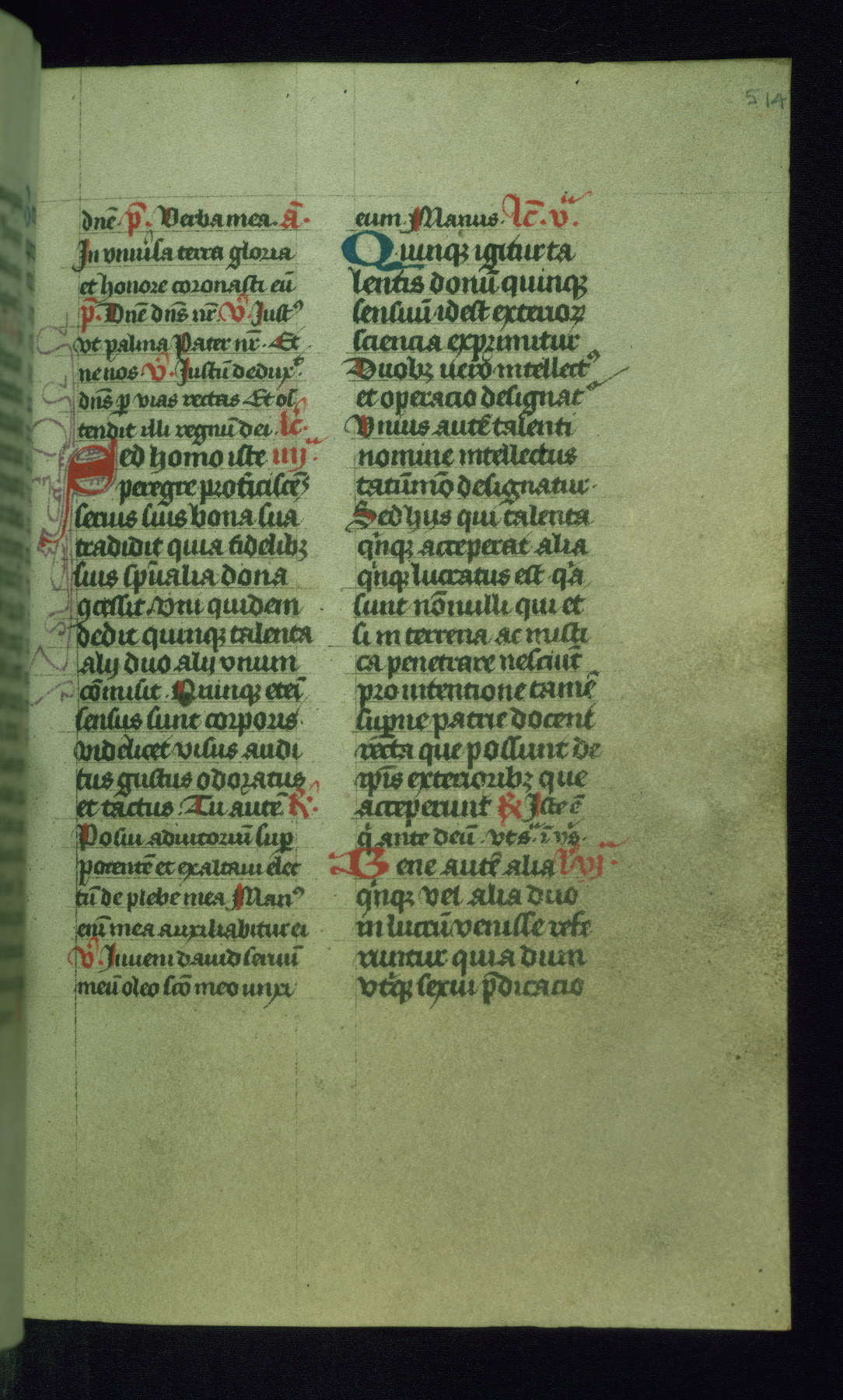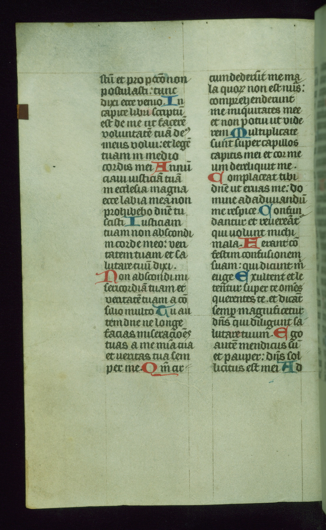 This small breviary, composed of more than 500 folios, is extraordinary for its length, considering it is the summer portion of a two-volume breviary for the use of Liège. The manuscript was completed for ecclesiastical use at the Cathedral of Notre-Dame and St.-Lambert in Liège ca. 1420. This attribution is suggested, for instance, by the petitions to the congregation of this cathedral (fols. 114v-117v), as well as the armorial shield of the family of Surlet de Chokier of Liège represented at the opening of the Psalms. The manuscript has modest, but interesting, decoration with historiated and decorated initials marking the liturgical texts, and occasional angels playing instruments in the margins. The most notable pictorial effect is found in the initials inhabited by transparent figures on rich blue ground. The technique is found, for instance, on fol. 156r with the gold monstrance held by translucent angels for the feast of the Corpus Christi.