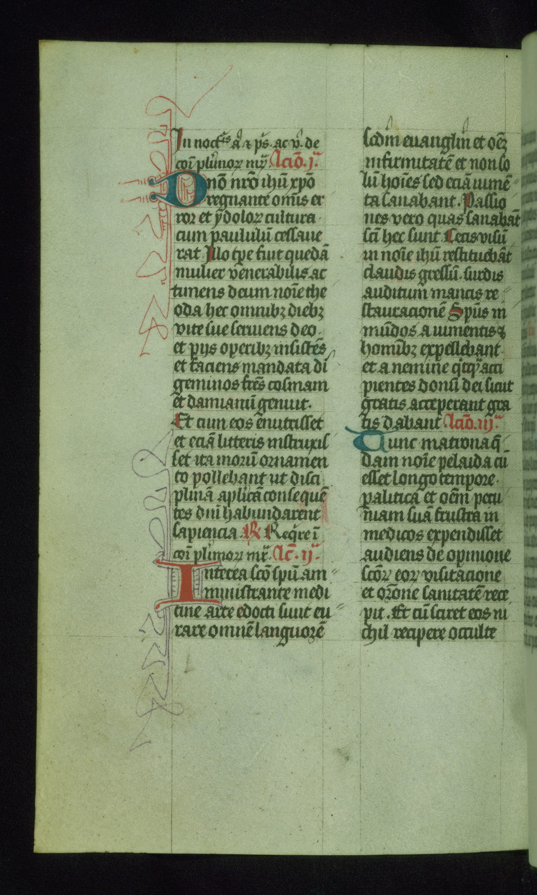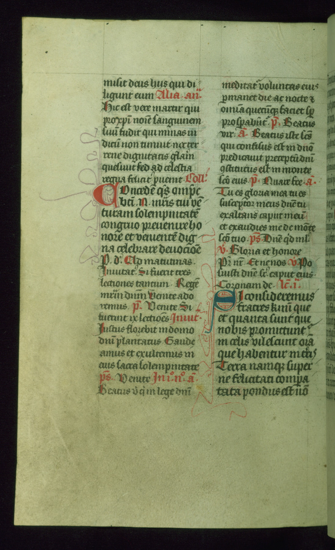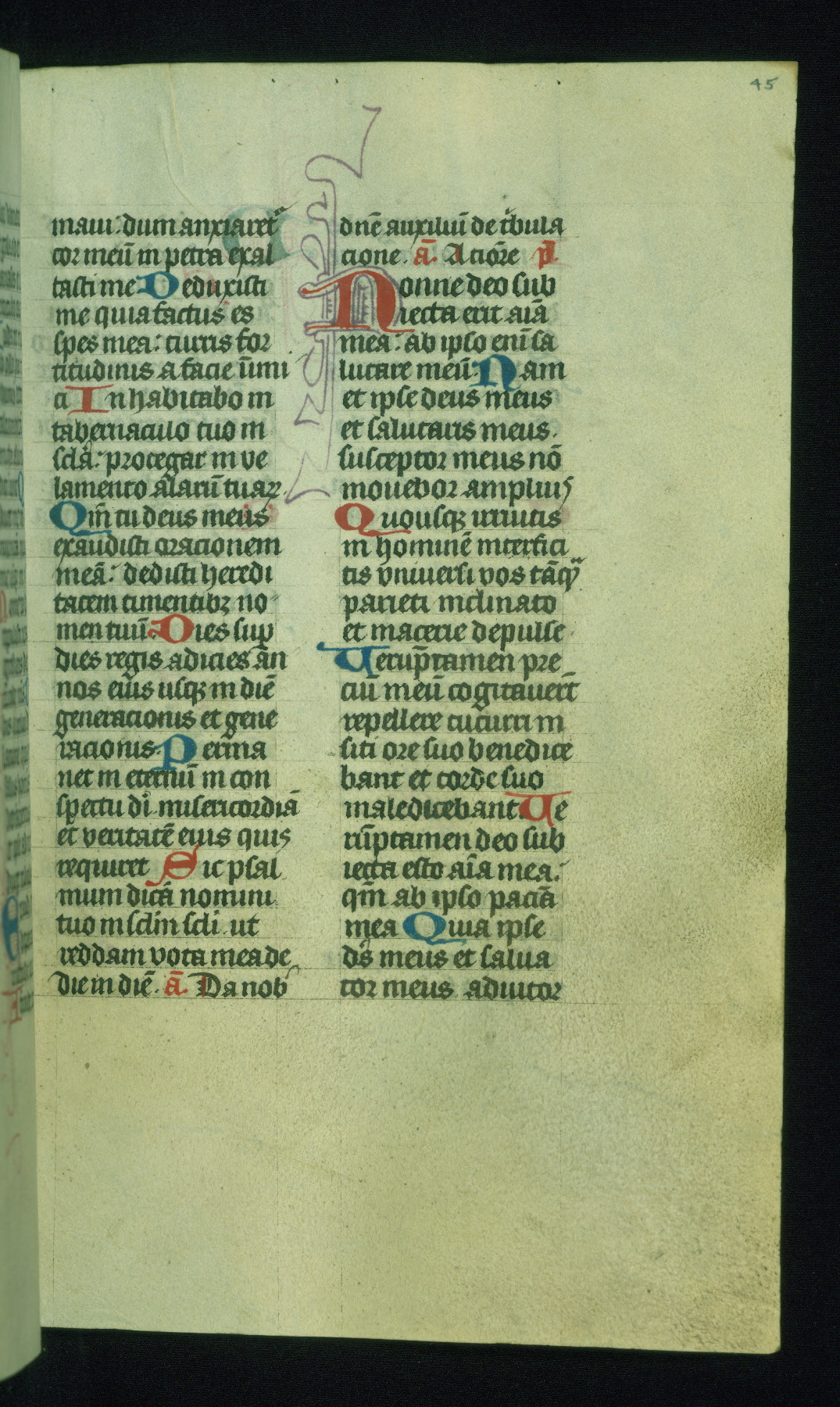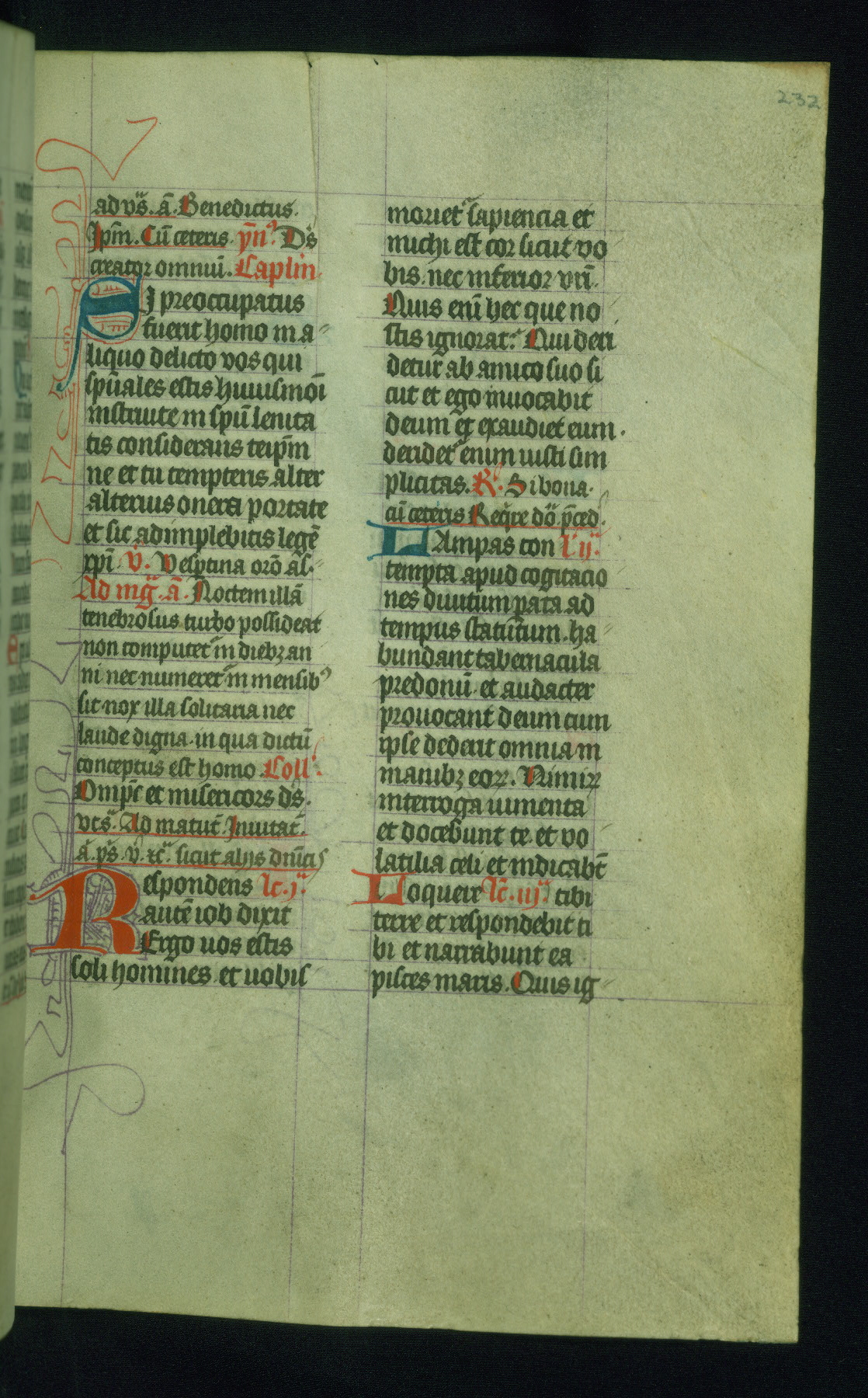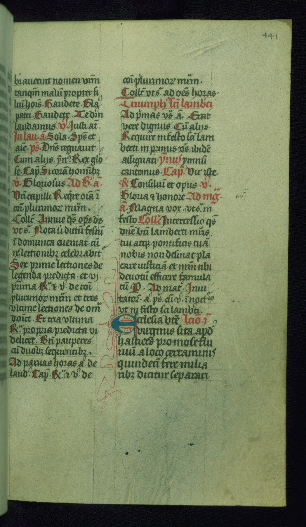 This small breviary, composed of more than 500 folios, is extraordinary for its length, considering it is the summer portion of a two-volume breviary for the use of Liège. The manuscript was completed for ecclesiastical use at the Cathedral of Notre-Dame and St.-Lambert in Liège ca. 1420. This attribution is suggested, for instance, by the petitions to the congregation of this cathedral (fols. 114v-117v), as well as the armorial shield of the family of Surlet de Chokier of Liège represented at the opening of the Psalms. The manuscript has modest, but interesting, decoration with historiated and decorated initials marking the liturgical texts, and occasional angels playing instruments in the margins. The most notable pictorial effect is found in the initials inhabited by transparent figures on rich blue ground. The technique is found, for instance, on fol. 156r with the gold monstrance held by translucent angels for the feast of the Corpus Christi.