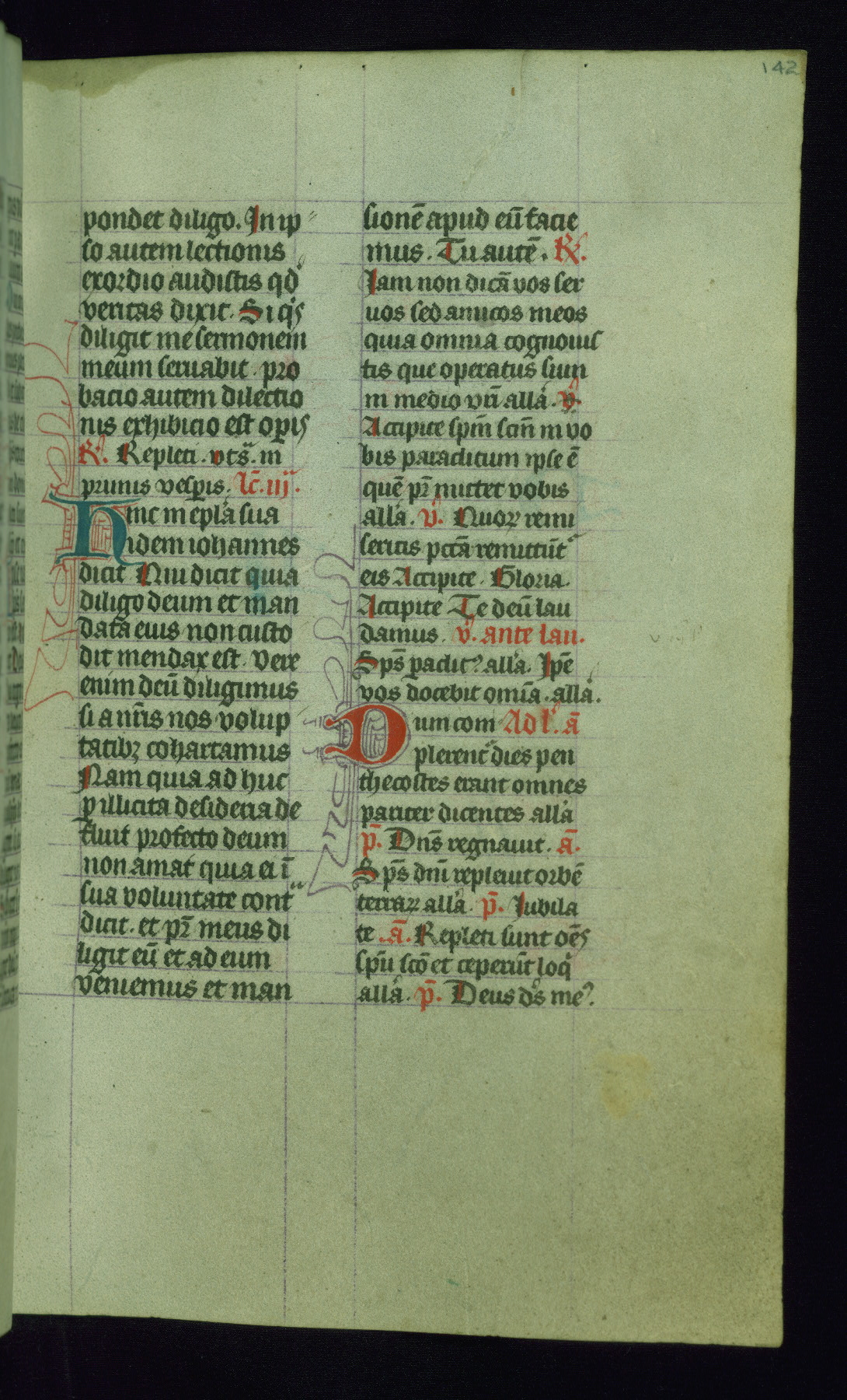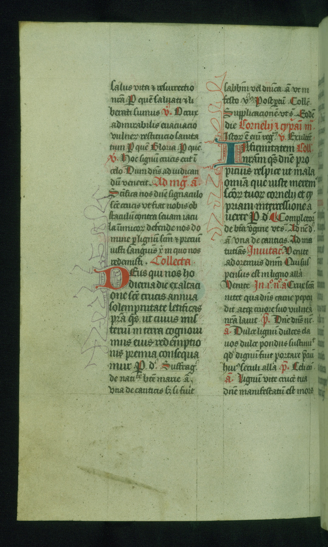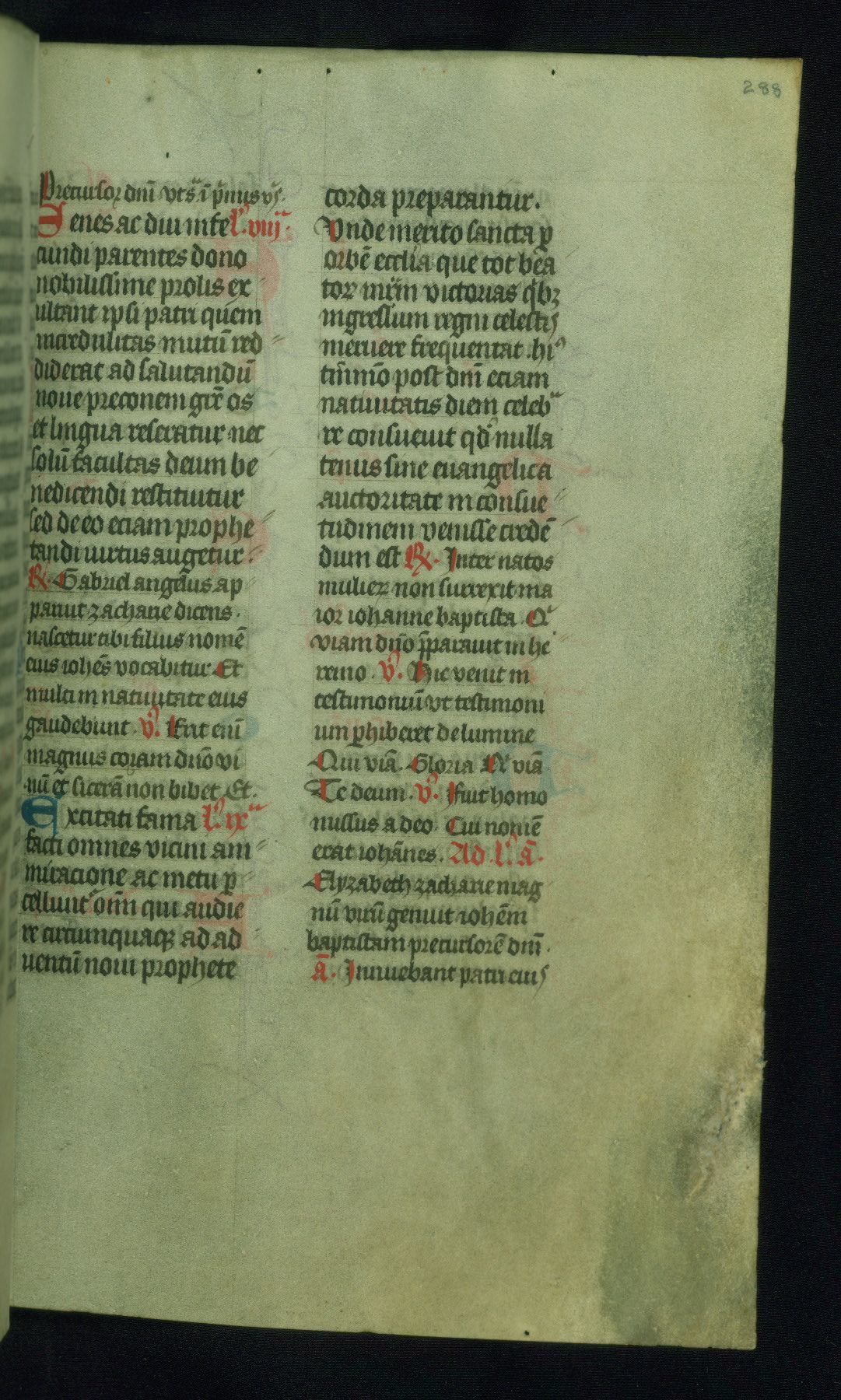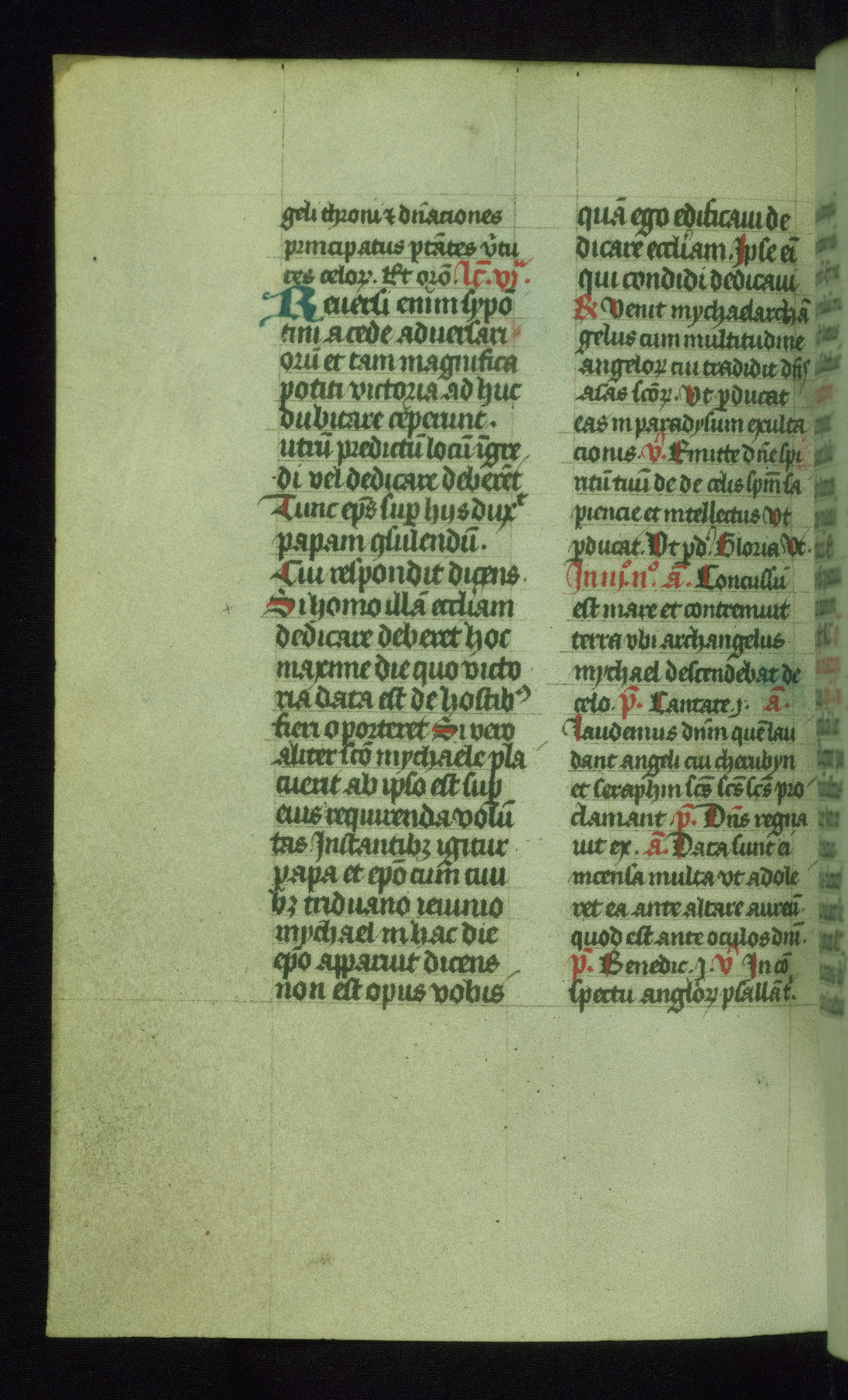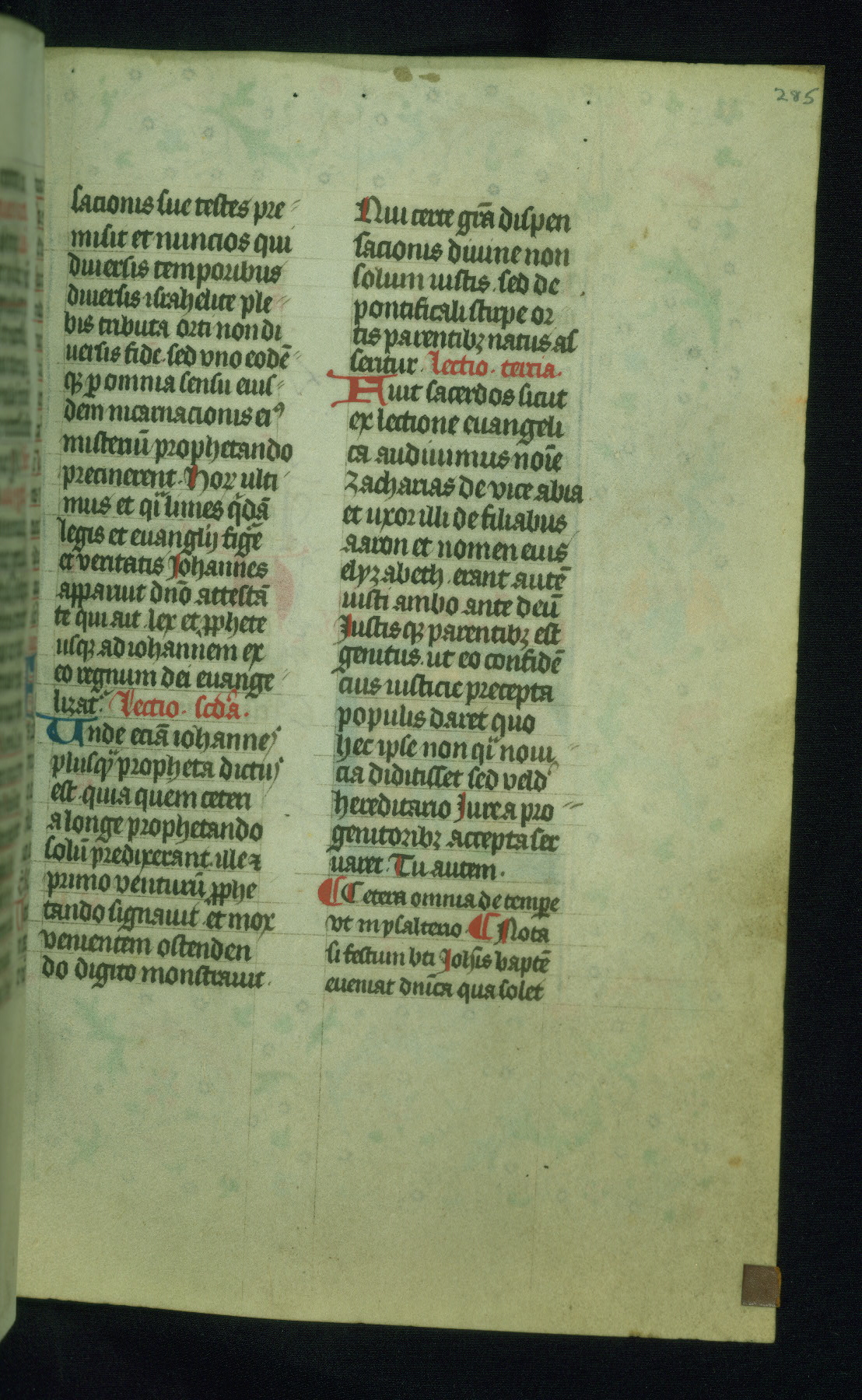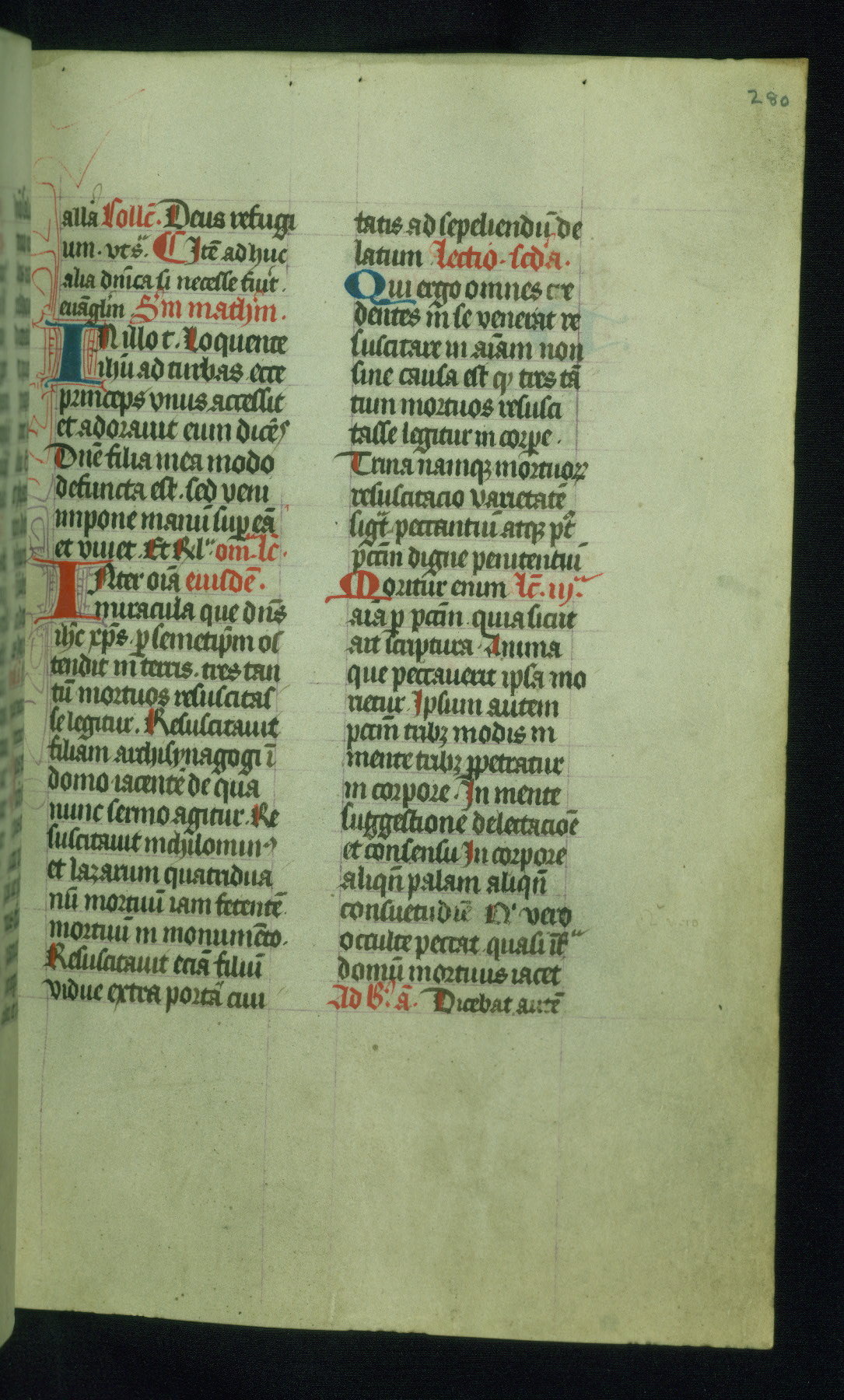 This small breviary, composed of more than 500 folios, is extraordinary for its length, considering it is the summer portion of a two-volume breviary for the use of Liège. The manuscript was completed for ecclesiastical use at the Cathedral of Notre-Dame and St.-Lambert in Liège ca. 1420. This attribution is suggested, for instance, by the petitions to the congregation of this cathedral (fols. 114v-117v), as well as the armorial shield of the family of Surlet de Chokier of Liège represented at the opening of the Psalms. The manuscript has modest, but interesting, decoration with historiated and decorated initials marking the liturgical texts, and occasional angels playing instruments in the margins. The most notable pictorial effect is found in the initials inhabited by transparent figures on rich blue ground. The technique is found, for instance, on fol. 156r with the gold monstrance held by translucent angels for the feast of the Corpus Christi.