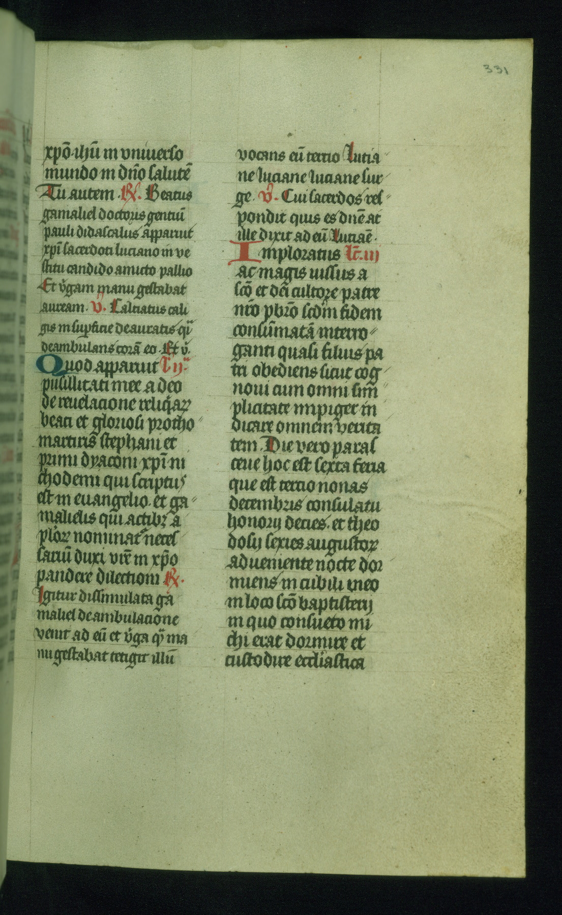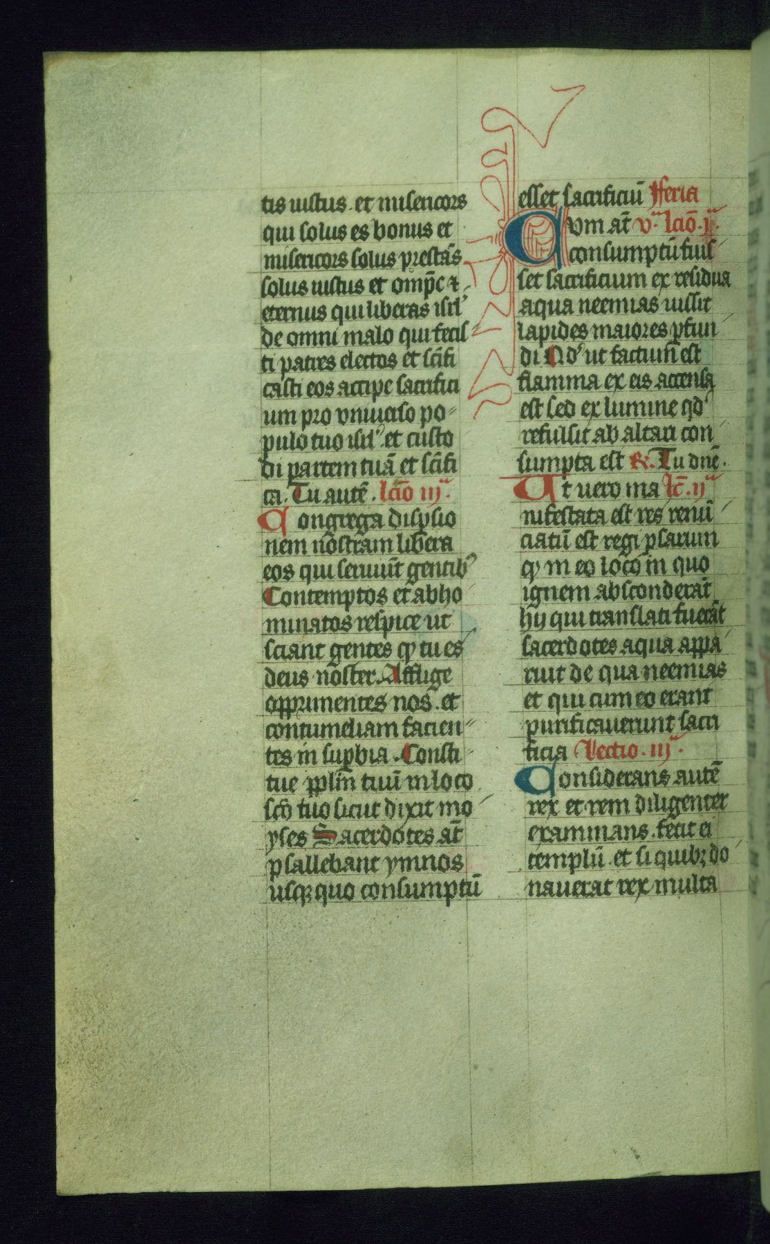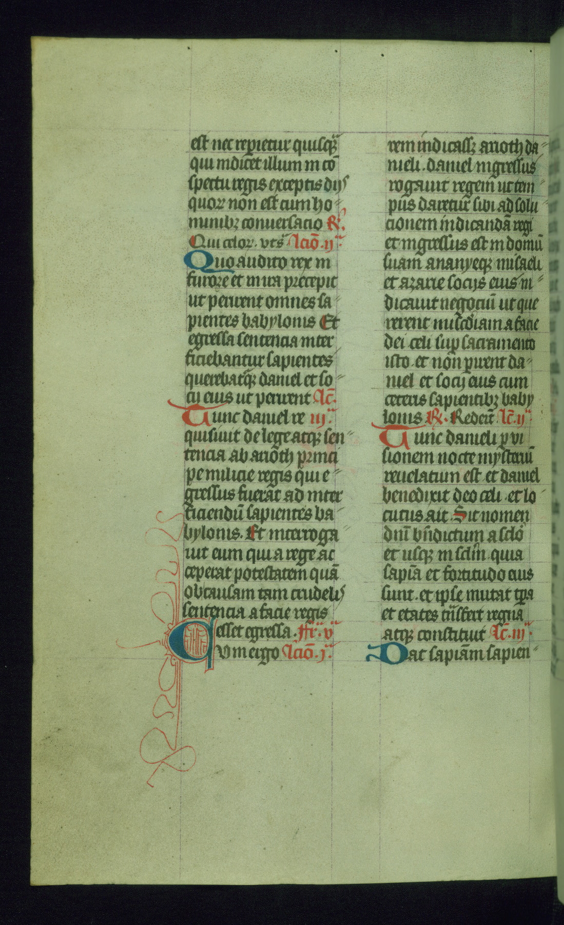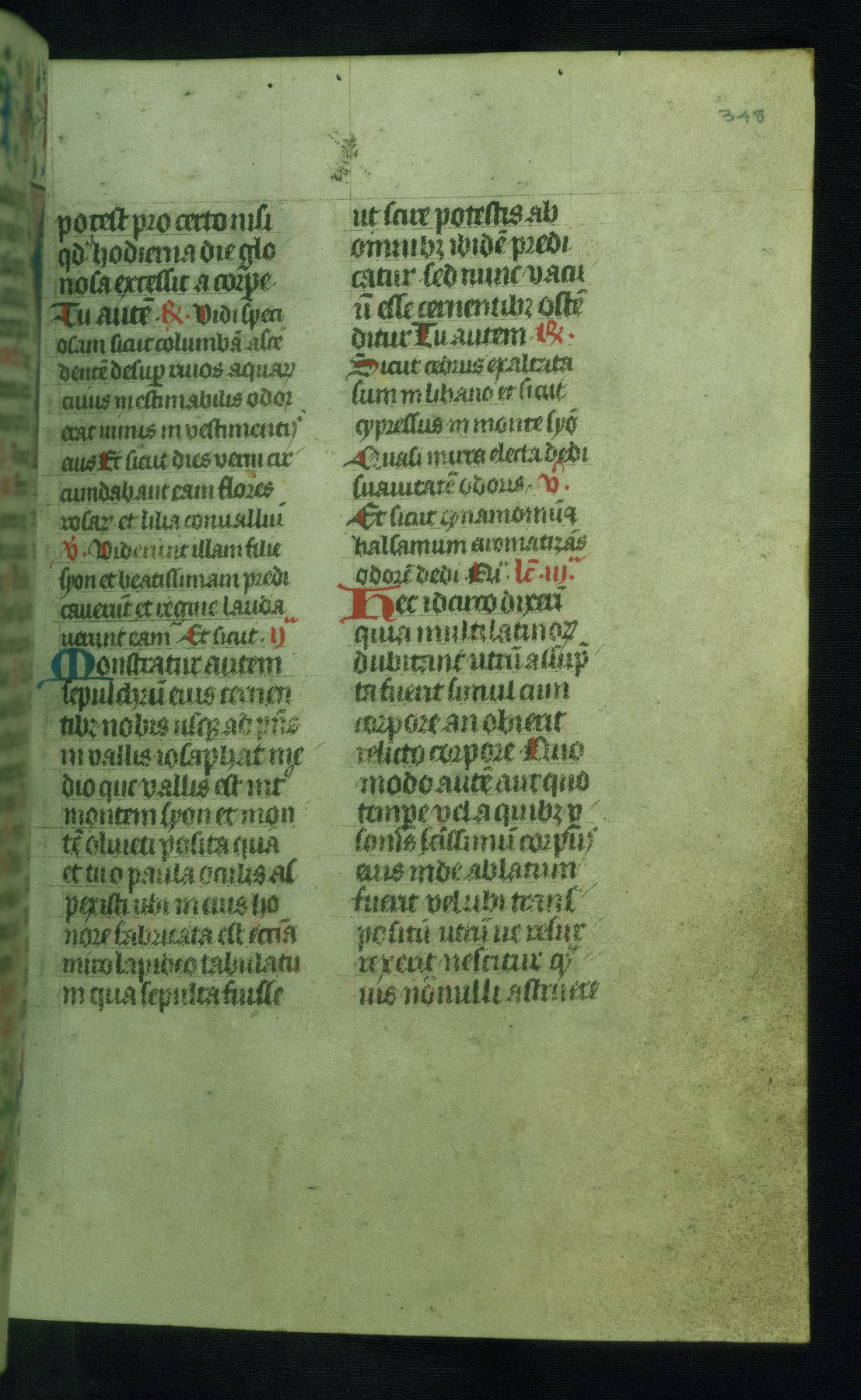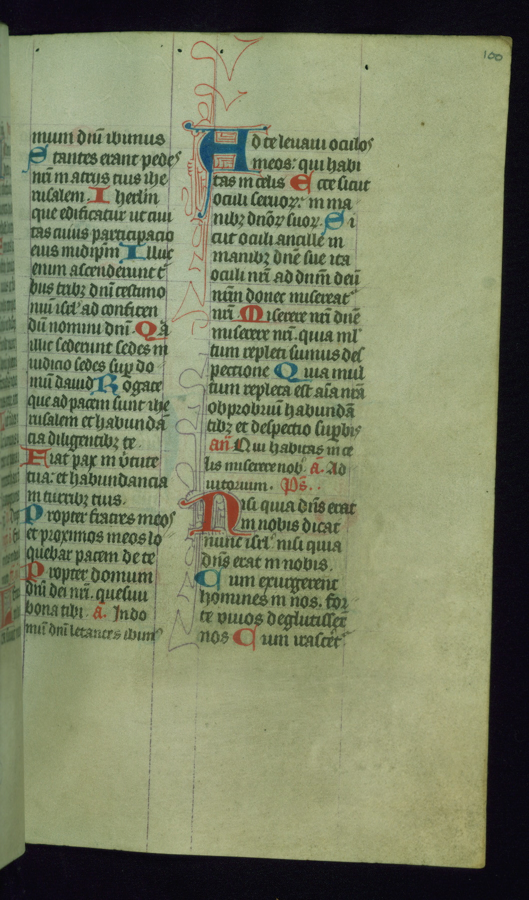 This small breviary, composed of more than 500 folios, is extraordinary for its length, considering it is the summer portion of a two-volume breviary for the use of Liège. The manuscript was completed for ecclesiastical use at the Cathedral of Notre-Dame and St.-Lambert in Liège ca. 1420. This attribution is suggested, for instance, by the petitions to the congregation of this cathedral (fols. 114v-117v), as well as the armorial shield of the family of Surlet de Chokier of Liège represented at the opening of the Psalms. The manuscript has modest, but interesting, decoration with historiated and decorated initials marking the liturgical texts, and occasional angels playing instruments in the margins. The most notable pictorial effect is found in the initials inhabited by transparent figures on rich blue ground. The technique is found, for instance, on fol. 156r with the gold monstrance held by translucent angels for the feast of the Corpus Christi.