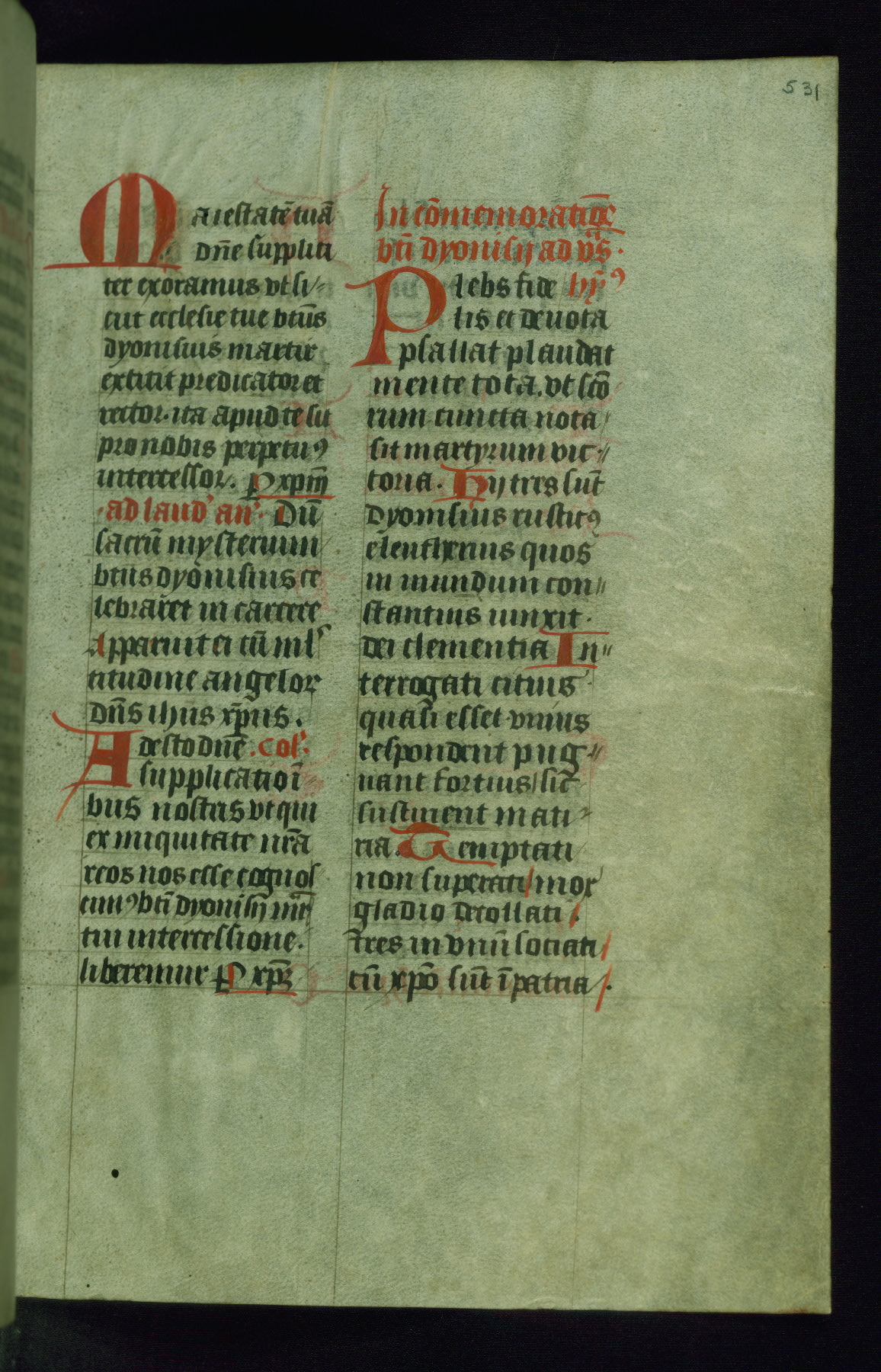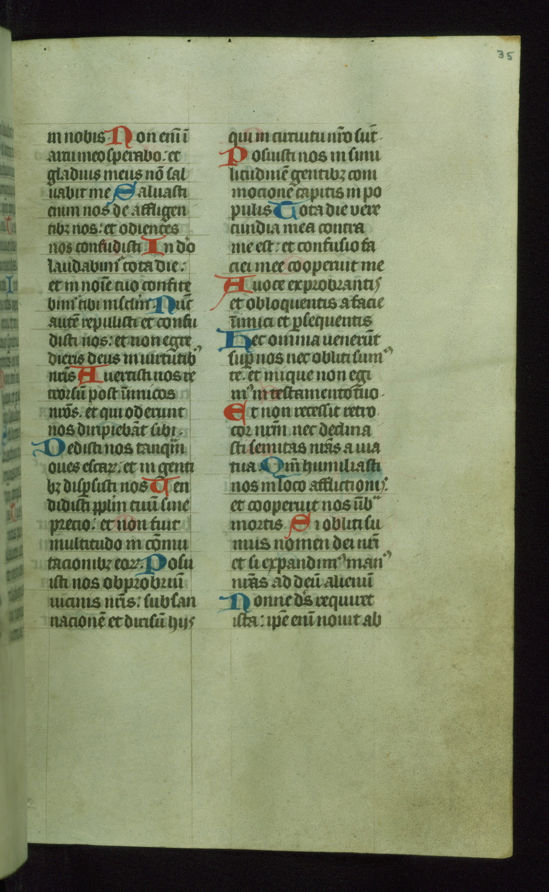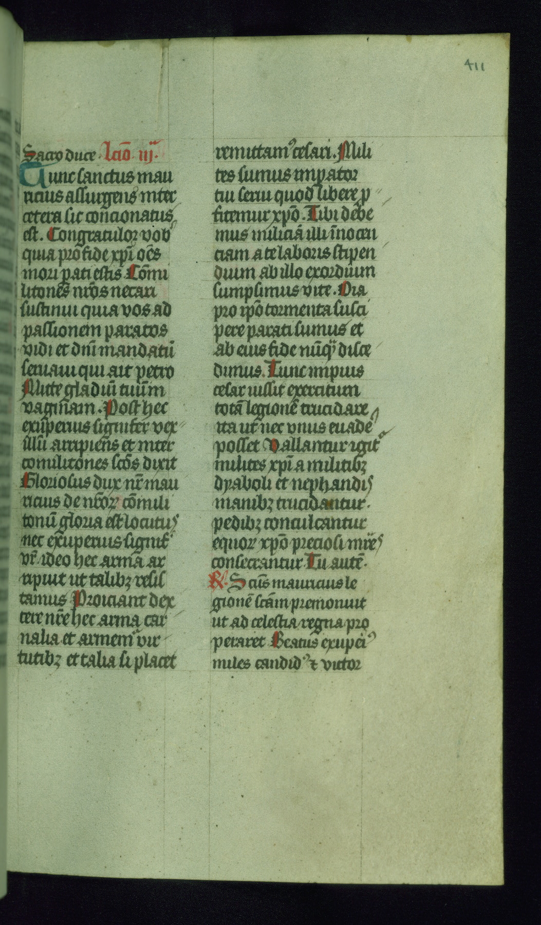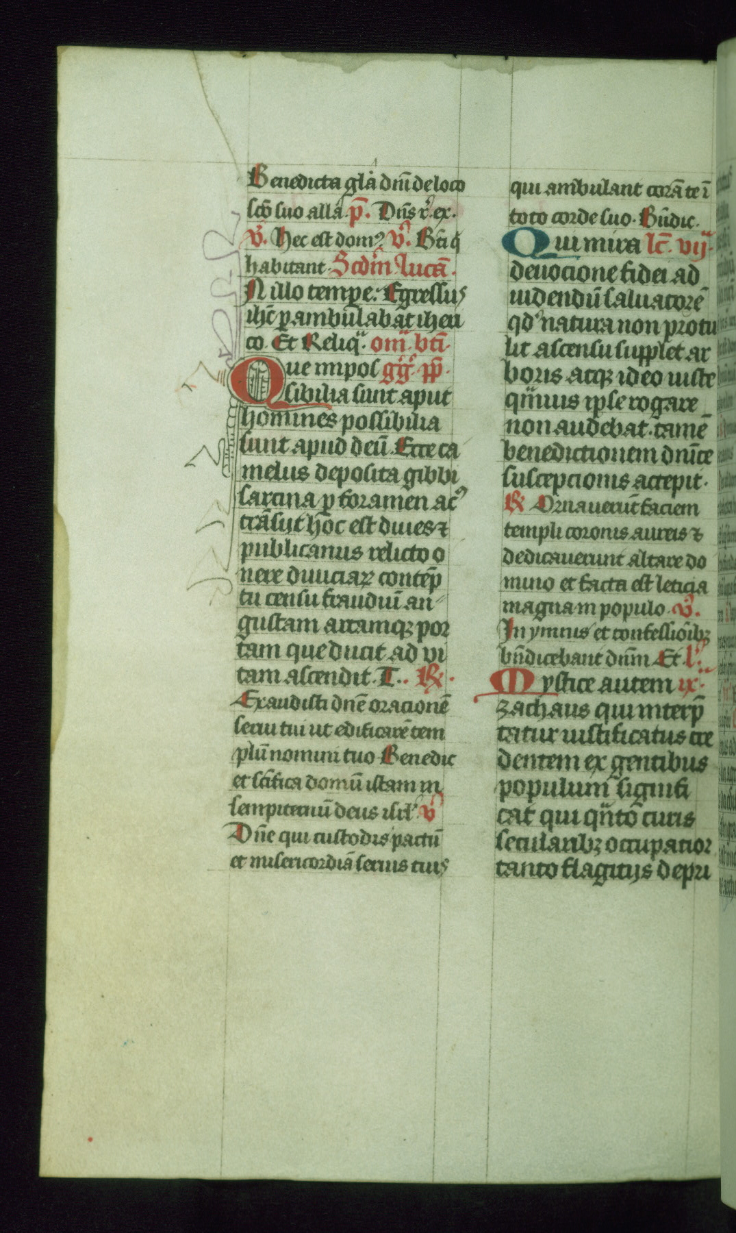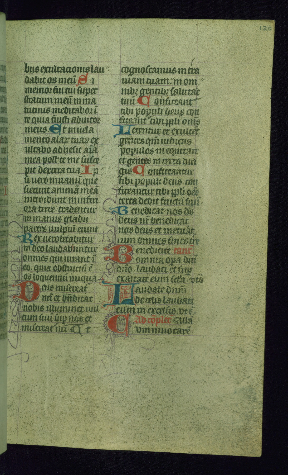 This small breviary, composed of more than 500 folios, is extraordinary for its length, considering it is the summer portion of a two-volume breviary for the use of Liège. The manuscript was completed for ecclesiastical use at the Cathedral of Notre-Dame and St.-Lambert in Liège ca. 1420. This attribution is suggested, for instance, by the petitions to the congregation of this cathedral (fols. 114v-117v), as well as the armorial shield of the family of Surlet de Chokier of Liège represented at the opening of the Psalms. The manuscript has modest, but interesting, decoration with historiated and decorated initials marking the liturgical texts, and occasional angels playing instruments in the margins. The most notable pictorial effect is found in the initials inhabited by transparent figures on rich blue ground. The technique is found, for instance, on fol. 156r with the gold monstrance held by translucent angels for the feast of the Corpus Christi.