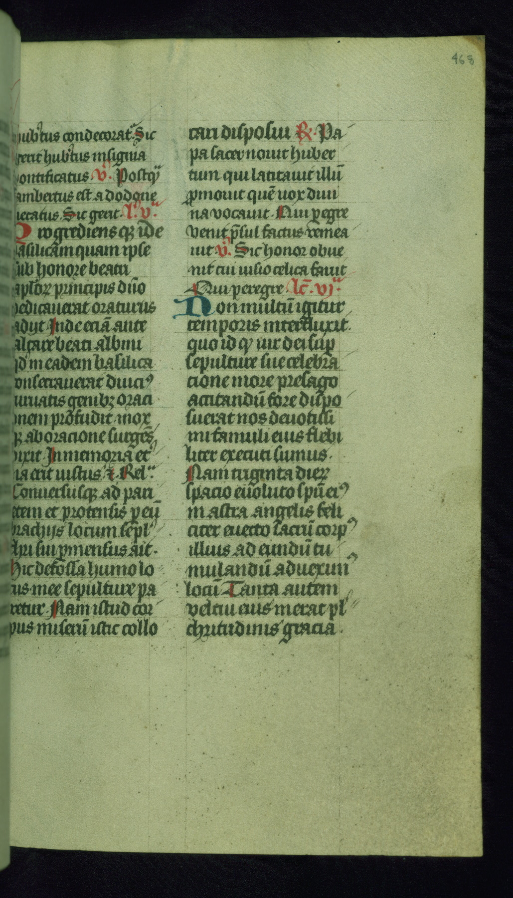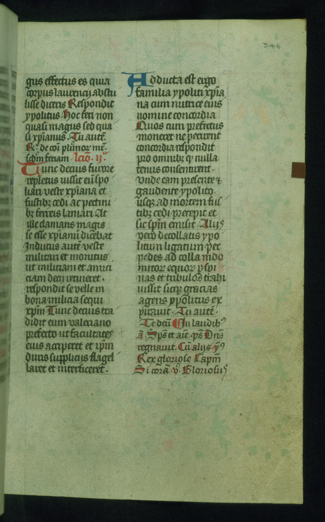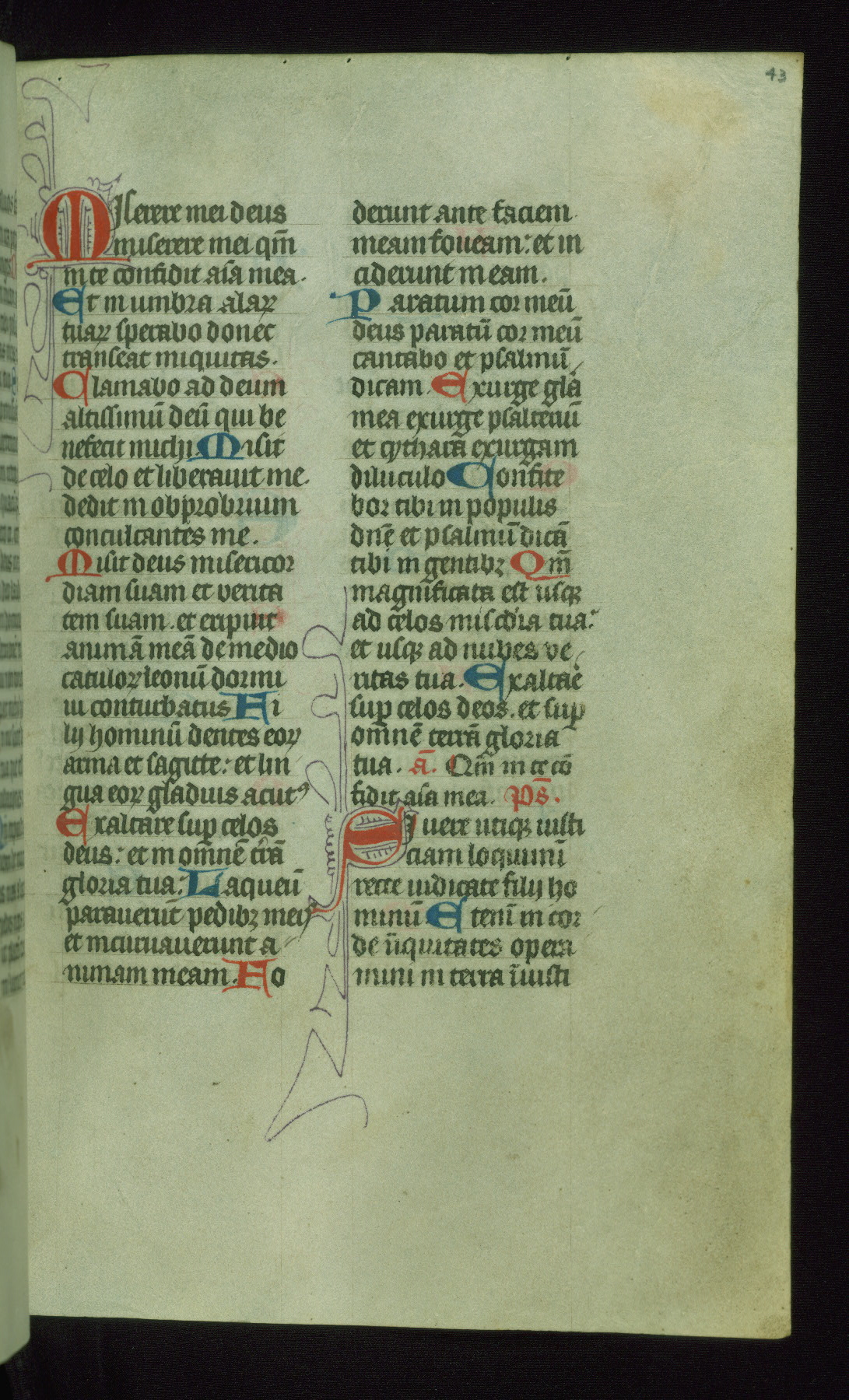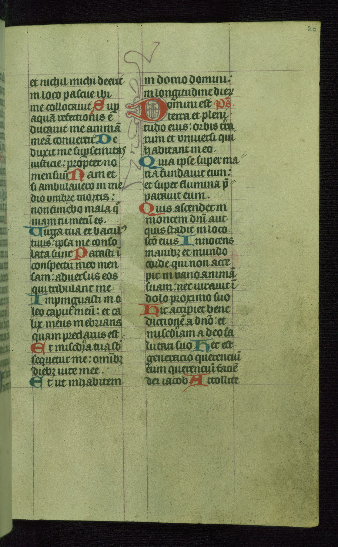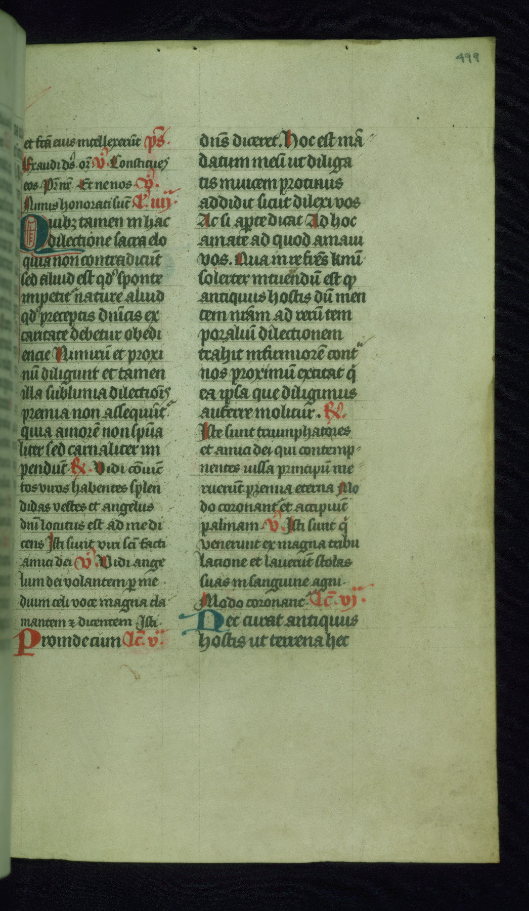 This small breviary, composed of more than 500 folios, is extraordinary for its length, considering it is the summer portion of a two-volume breviary for the use of Liège. The manuscript was completed for ecclesiastical use at the Cathedral of Notre-Dame and St.-Lambert in Liège ca. 1420. This attribution is suggested, for instance, by the petitions to the congregation of this cathedral (fols. 114v-117v), as well as the armorial shield of the family of Surlet de Chokier of Liège represented at the opening of the Psalms. The manuscript has modest, but interesting, decoration with historiated and decorated initials marking the liturgical texts, and occasional angels playing instruments in the margins. The most notable pictorial effect is found in the initials inhabited by transparent figures on rich blue ground. The technique is found, for instance, on fol. 156r with the gold monstrance held by translucent angels for the feast of the Corpus Christi.