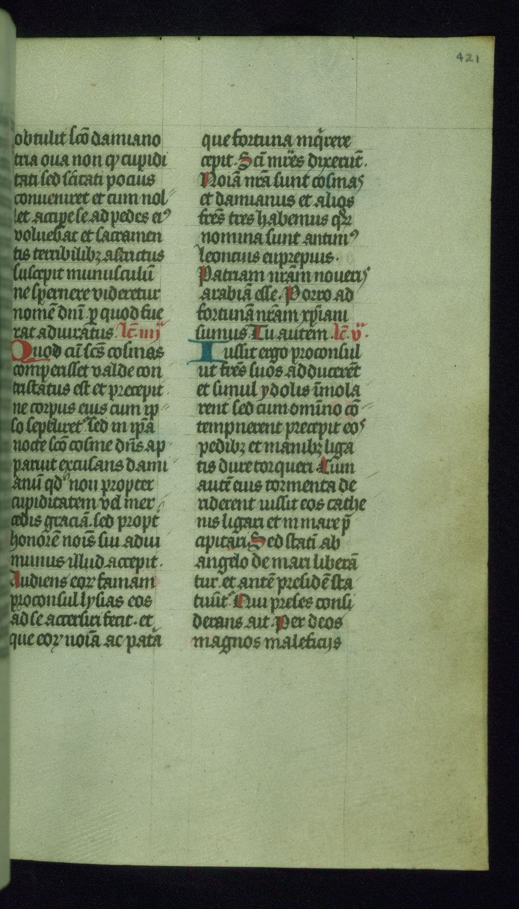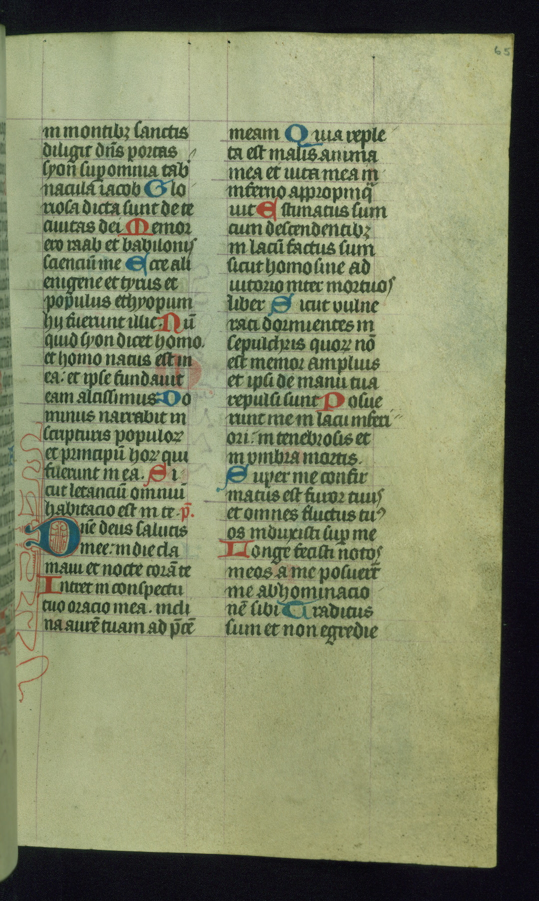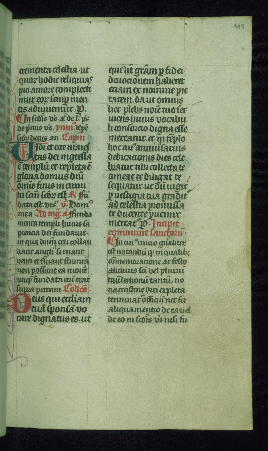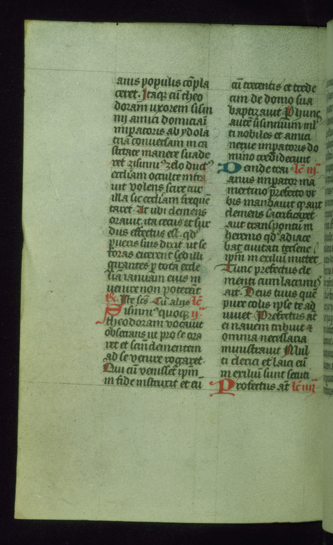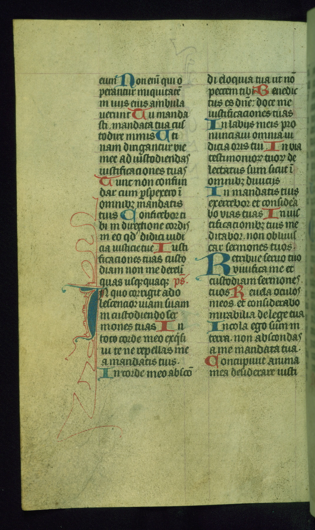 This small breviary, composed of more than 500 folios, is extraordinary for its length, considering it is the summer portion of a two-volume breviary for the use of Liège. The manuscript was completed for ecclesiastical use at the Cathedral of Notre-Dame and St.-Lambert in Liège ca. 1420. This attribution is suggested, for instance, by the petitions to the congregation of this cathedral (fols. 114v-117v), as well as the armorial shield of the family of Surlet de Chokier of Liège represented at the opening of the Psalms. The manuscript has modest, but interesting, decoration with historiated and decorated initials marking the liturgical texts, and occasional angels playing instruments in the margins. The most notable pictorial effect is found in the initials inhabited by transparent figures on rich blue ground. The technique is found, for instance, on fol. 156r with the gold monstrance held by translucent angels for the feast of the Corpus Christi.