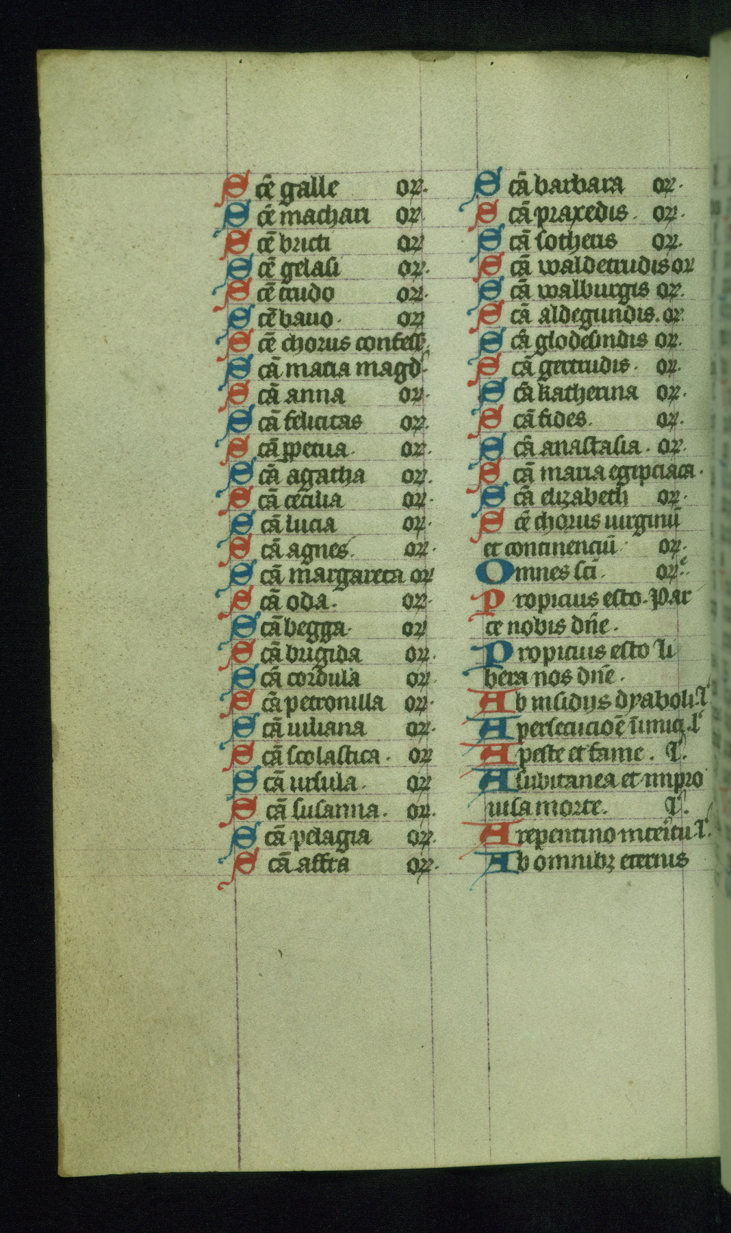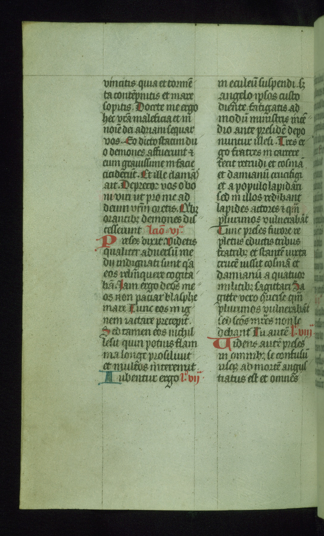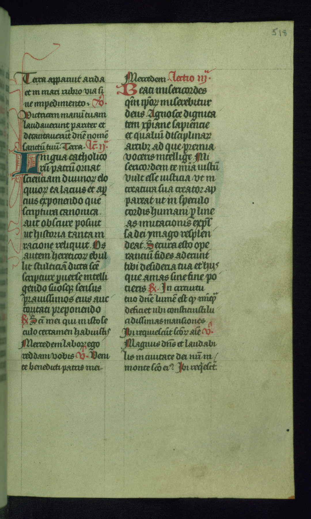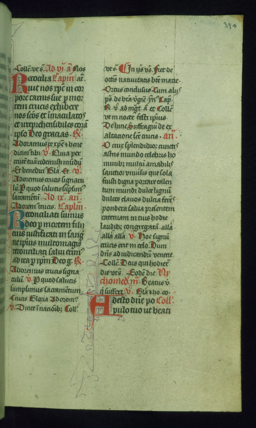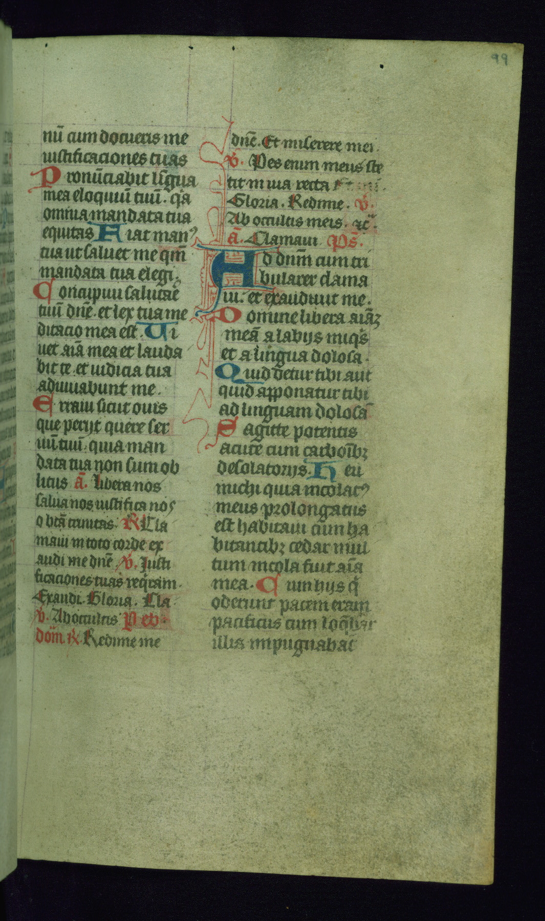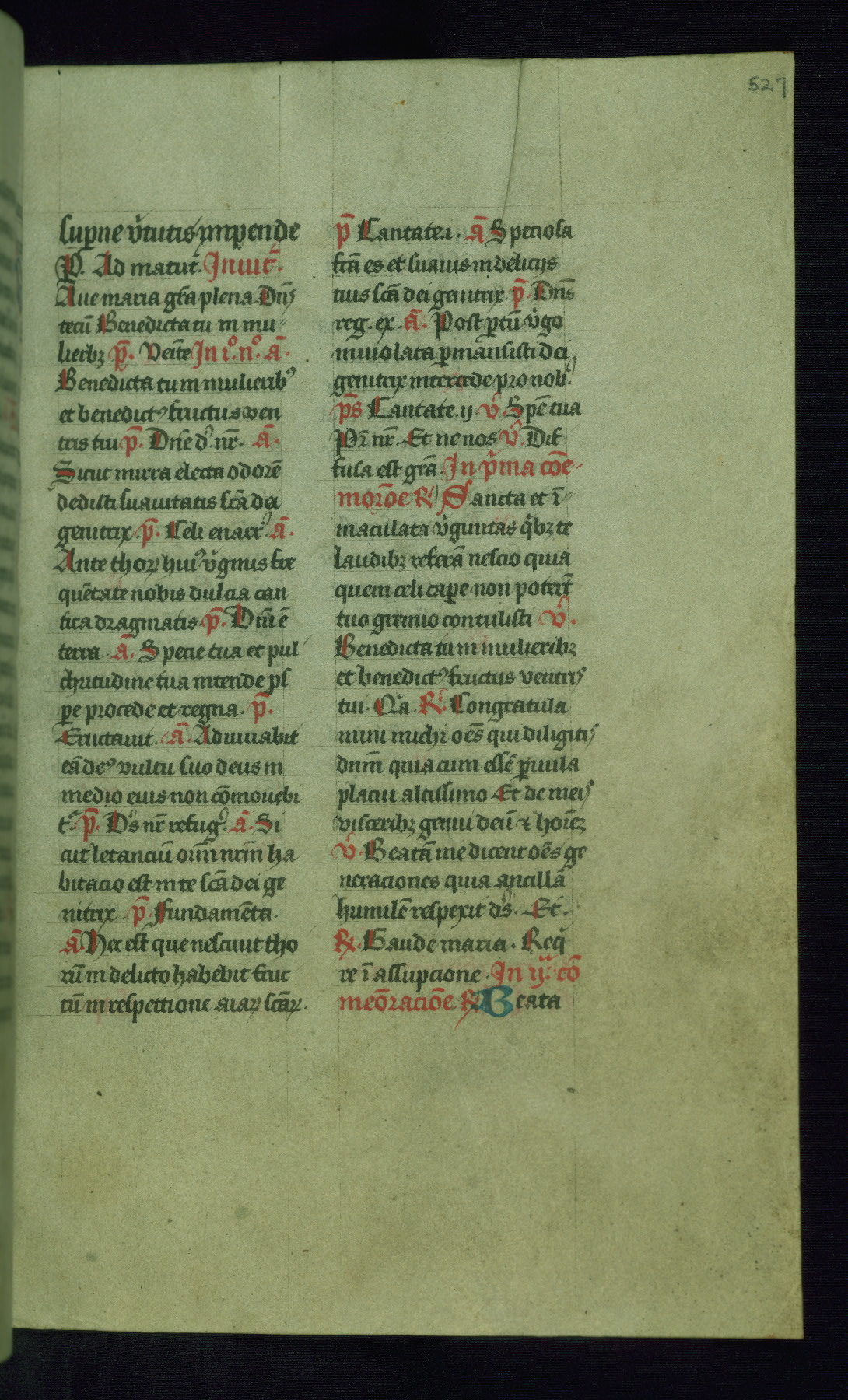 This small breviary, composed of more than 500 folios, is extraordinary for its length, considering it is the summer portion of a two-volume breviary for the use of Liège. The manuscript was completed for ecclesiastical use at the Cathedral of Notre-Dame and St.-Lambert in Liège ca. 1420. This attribution is suggested, for instance, by the petitions to the congregation of this cathedral (fols. 114v-117v), as well as the armorial shield of the family of Surlet de Chokier of Liège represented at the opening of the Psalms. The manuscript has modest, but interesting, decoration with historiated and decorated initials marking the liturgical texts, and occasional angels playing instruments in the margins. The most notable pictorial effect is found in the initials inhabited by transparent figures on rich blue ground. The technique is found, for instance, on fol. 156r with the gold monstrance held by translucent angels for the feast of the Corpus Christi.