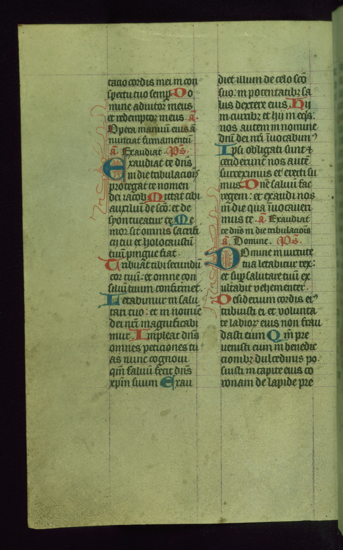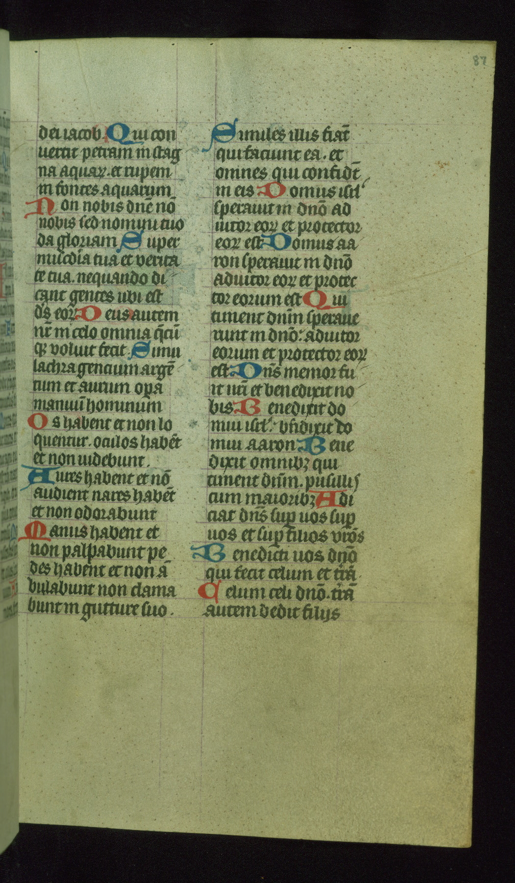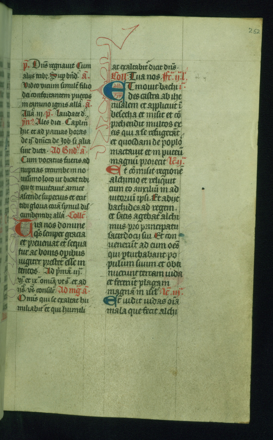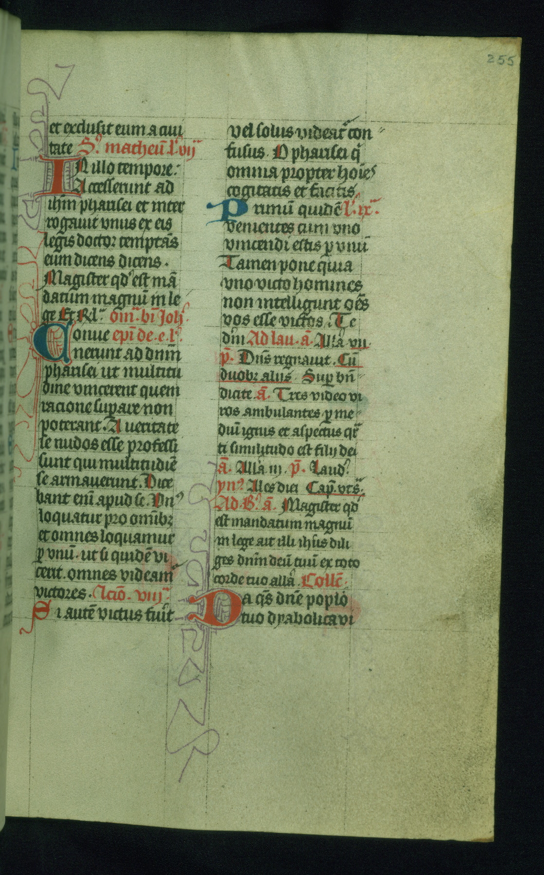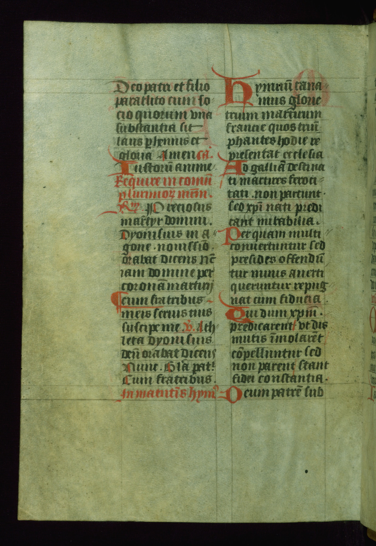 This small breviary, composed of more than 500 folios, is extraordinary for its length, considering it is the summer portion of a two-volume breviary for the use of Liège. The manuscript was completed for ecclesiastical use at the Cathedral of Notre-Dame and St.-Lambert in Liège ca. 1420. This attribution is suggested, for instance, by the petitions to the congregation of this cathedral (fols. 114v-117v), as well as the armorial shield of the family of Surlet de Chokier of Liège represented at the opening of the Psalms. The manuscript has modest, but interesting, decoration with historiated and decorated initials marking the liturgical texts, and occasional angels playing instruments in the margins. The most notable pictorial effect is found in the initials inhabited by transparent figures on rich blue ground. The technique is found, for instance, on fol. 156r with the gold monstrance held by translucent angels for the feast of the Corpus Christi.