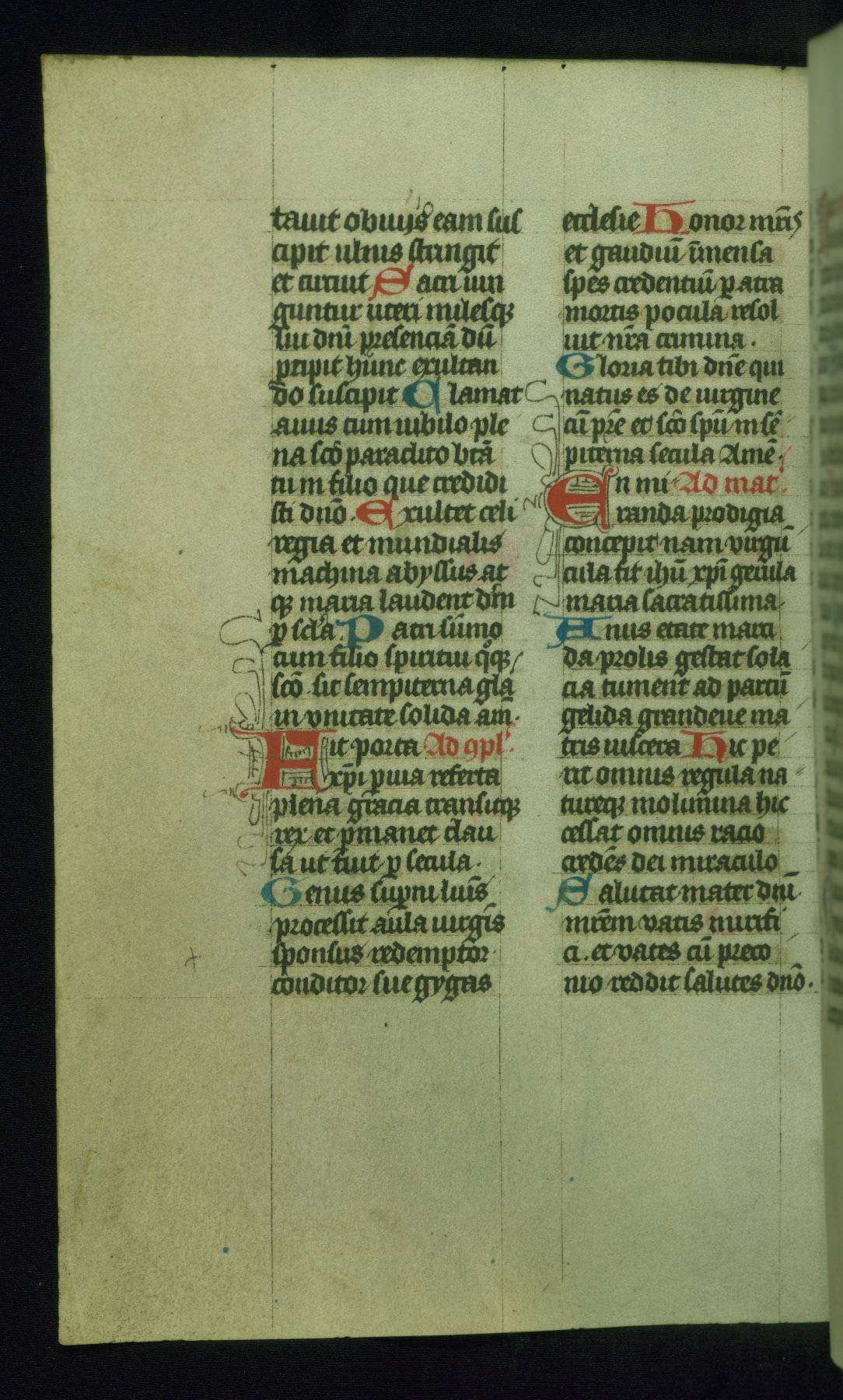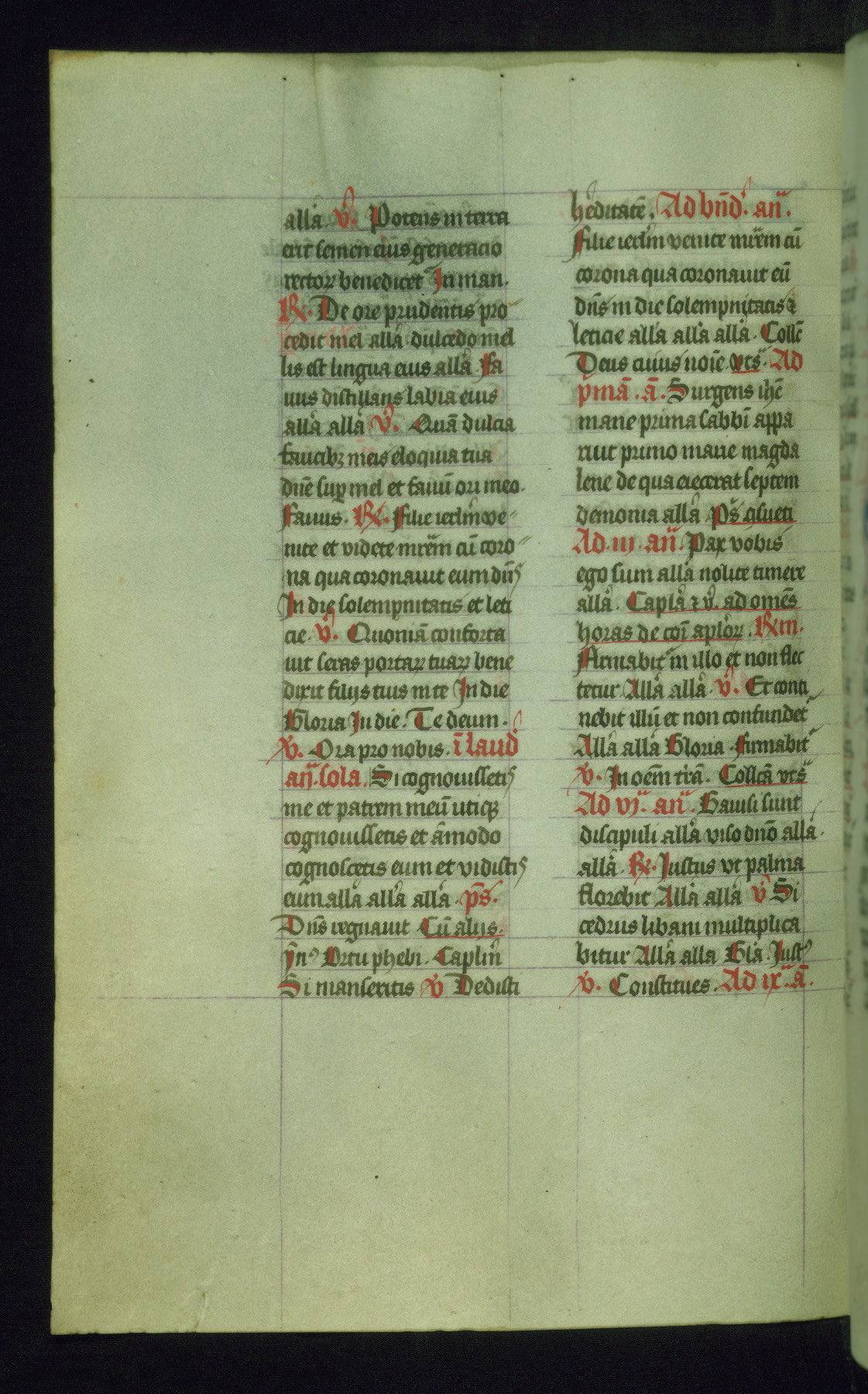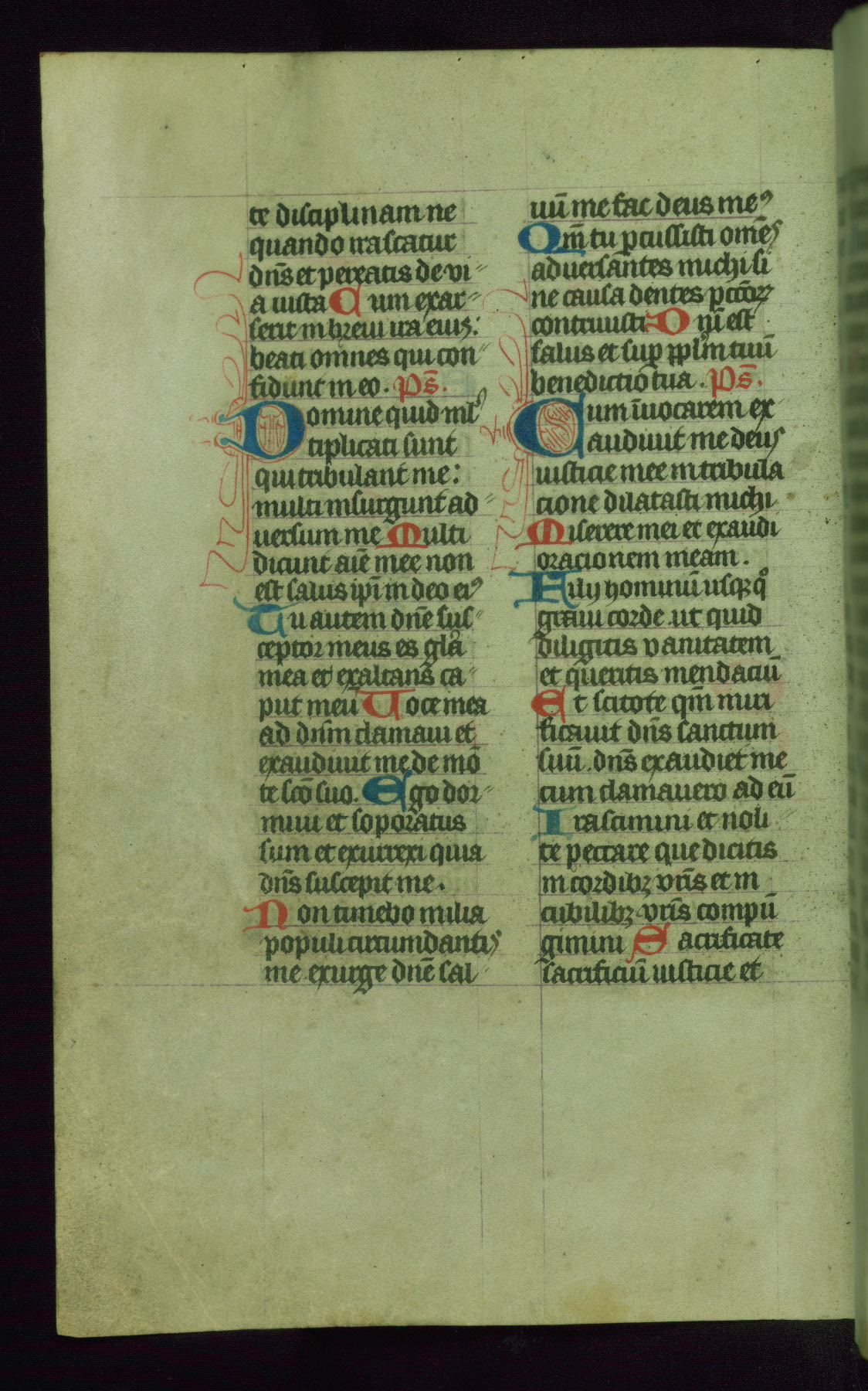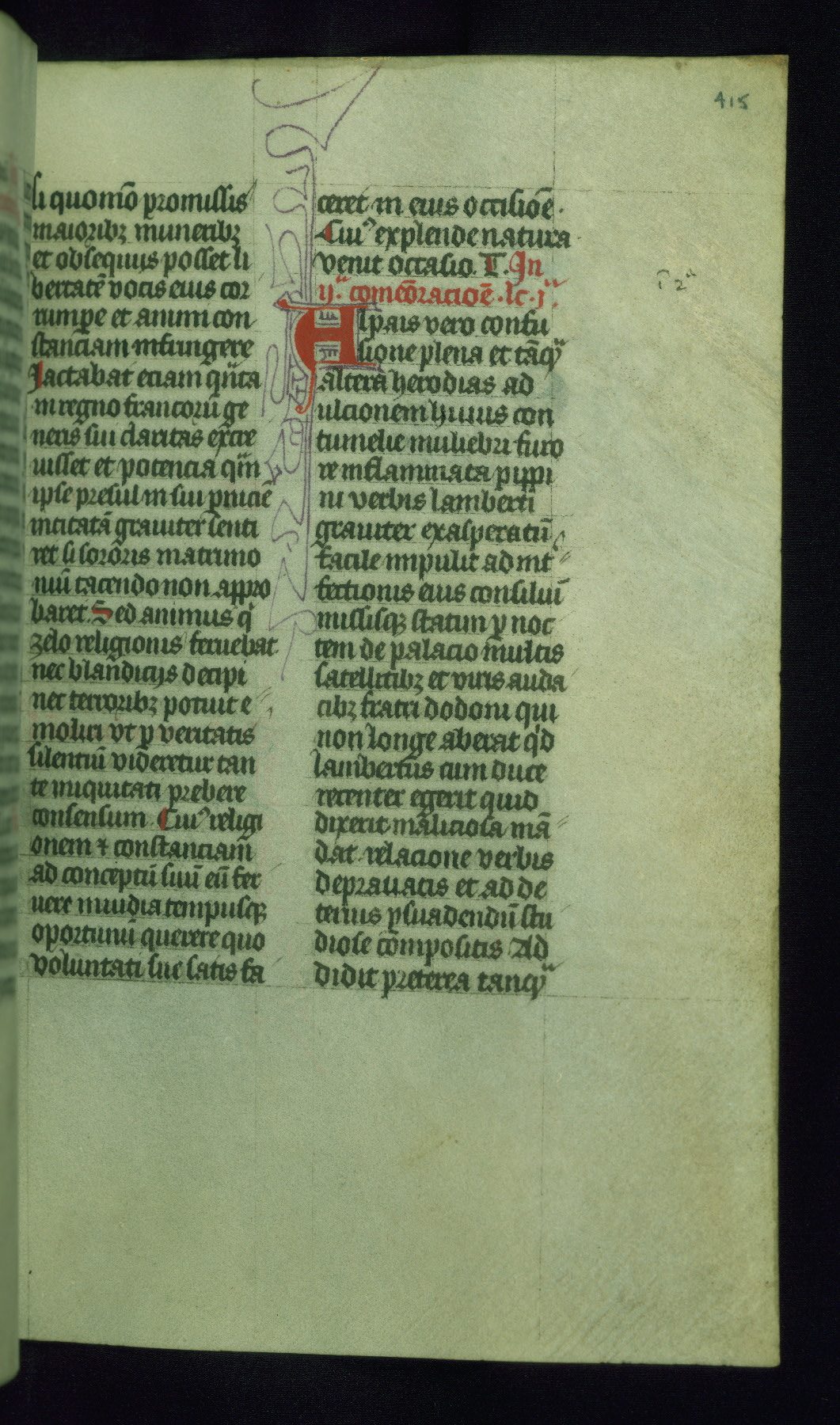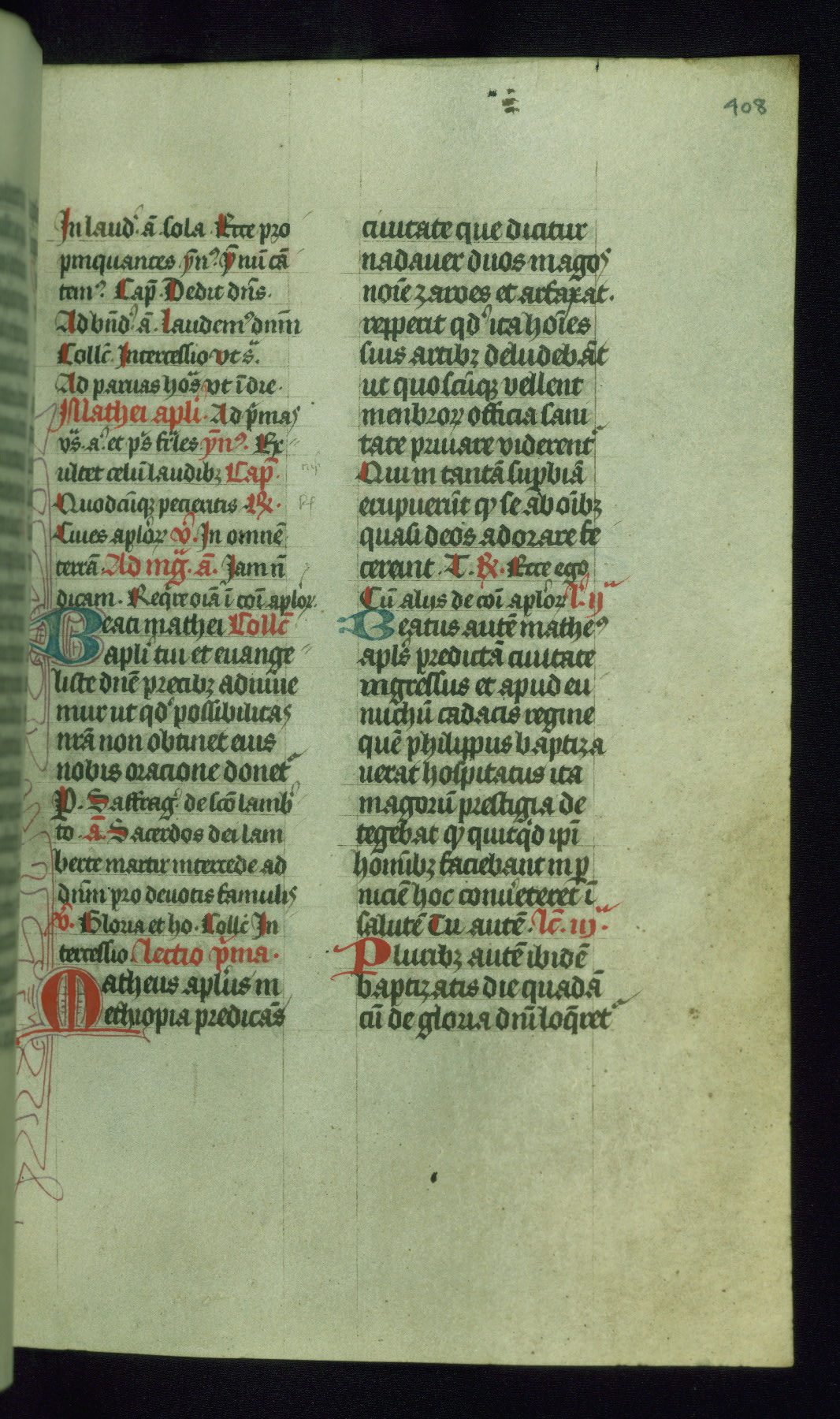This small breviary, composed of more than 500 folios, is extraordinary for its length, considering it is the summer portion of a two-volume breviary for the use of Liège. The manuscript was completed for ecclesiastical use at the Cathedral of Notre-Dame and St.-Lambert in Liège ca. 1420. This attribution is suggested, for instance, by the petitions to the congregation of this cathedral (fols. 114v-117v), as well as the armorial shield of the family of Surlet de Chokier of Liège represented at the opening of the Psalms. The manuscript has modest, but interesting, decoration with historiated and decorated initials marking the liturgical texts, and occasional angels playing instruments in the margins. The most notable pictorial effect is found in the initials inhabited by transparent figures on rich blue ground. The technique is found, for instance, on fol. 156r with the gold monstrance held by translucent angels for the feast of the Corpus Christi.