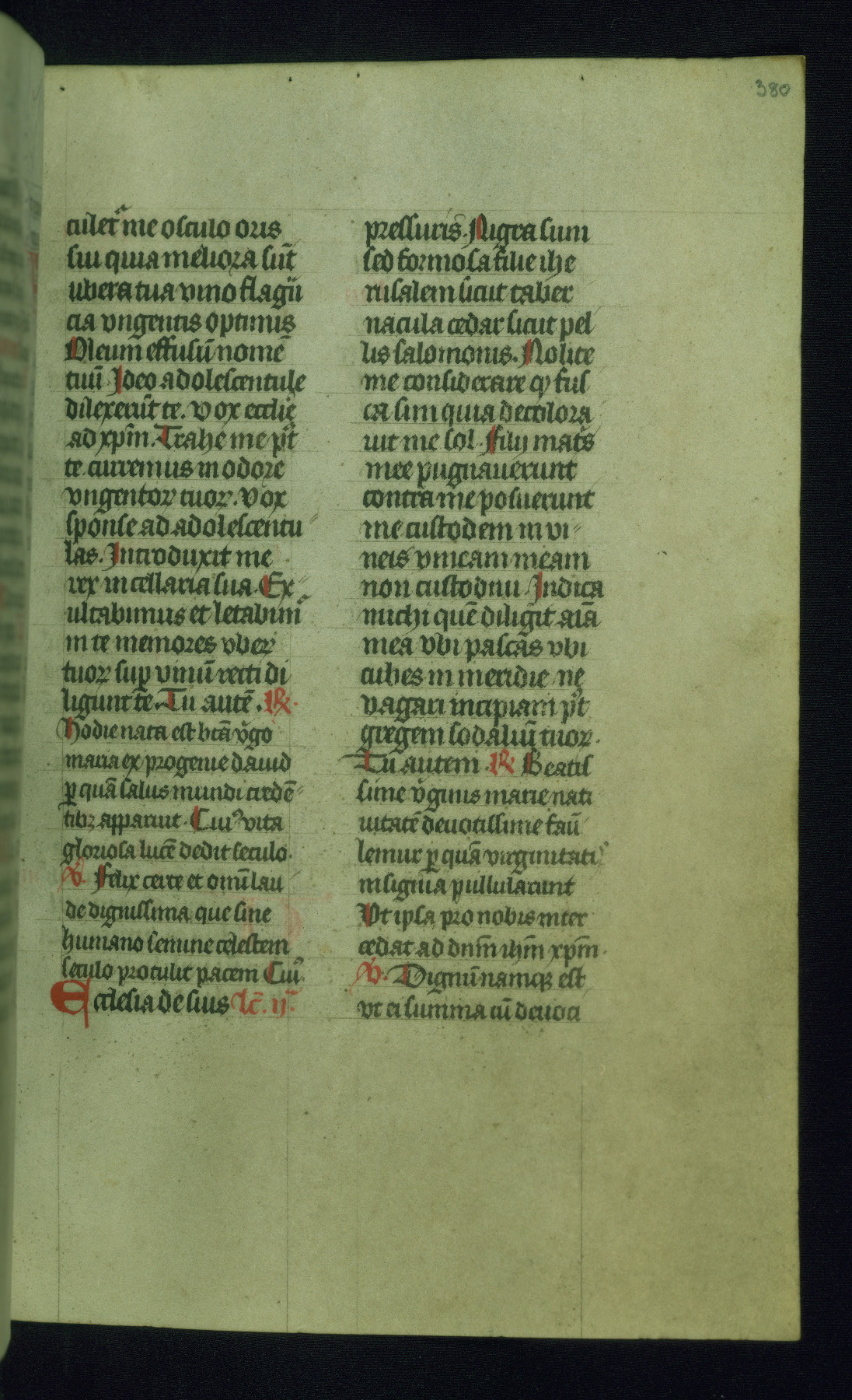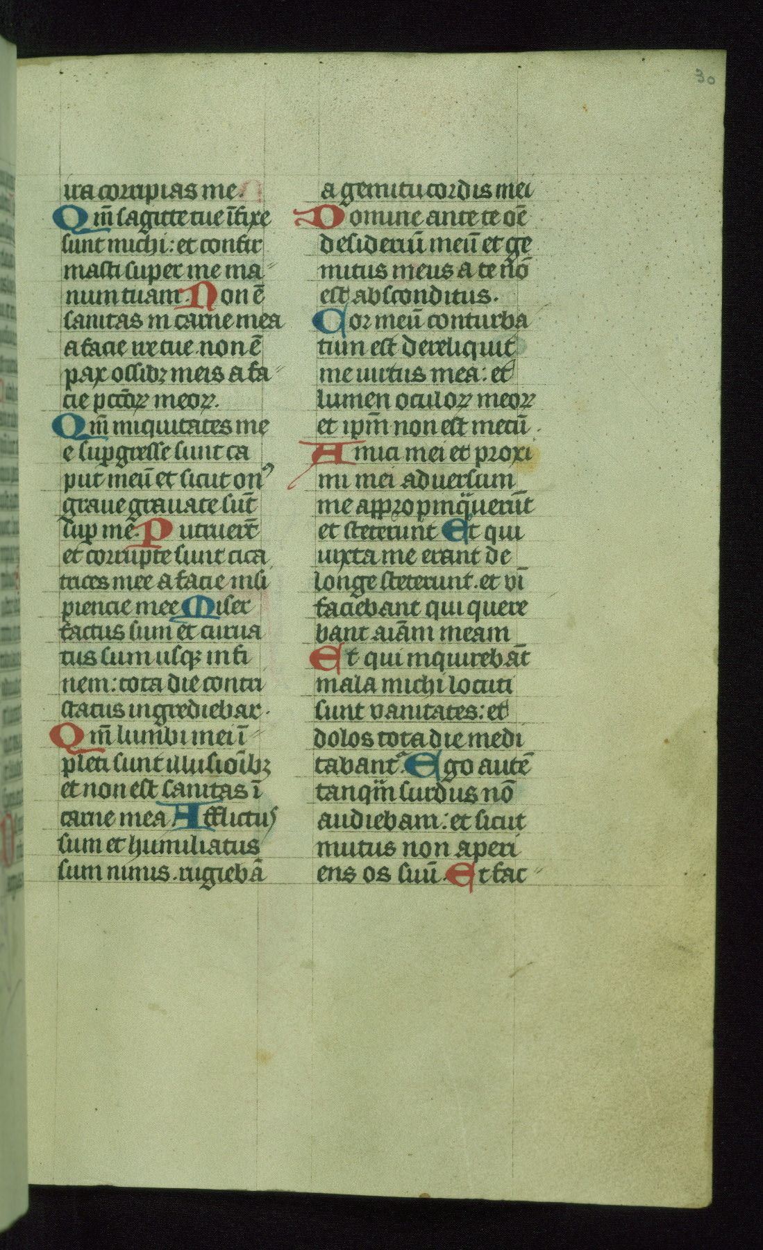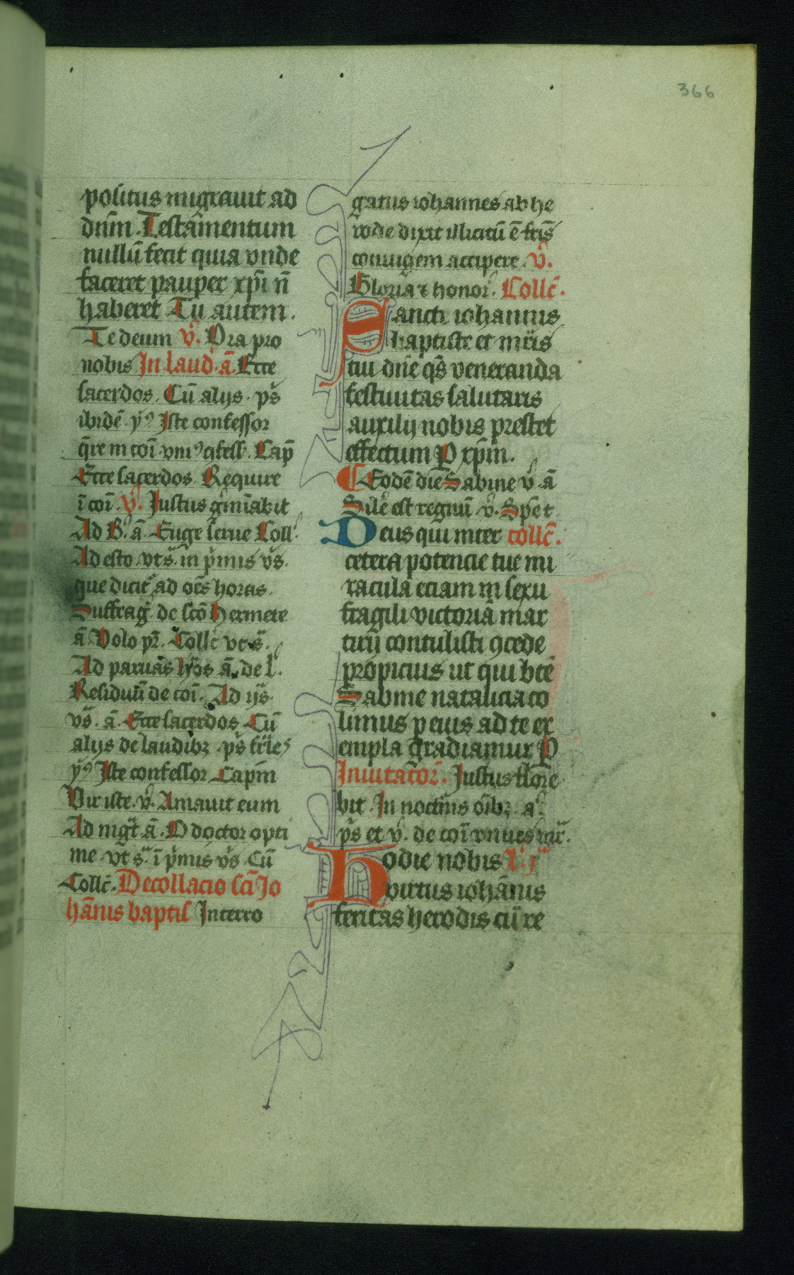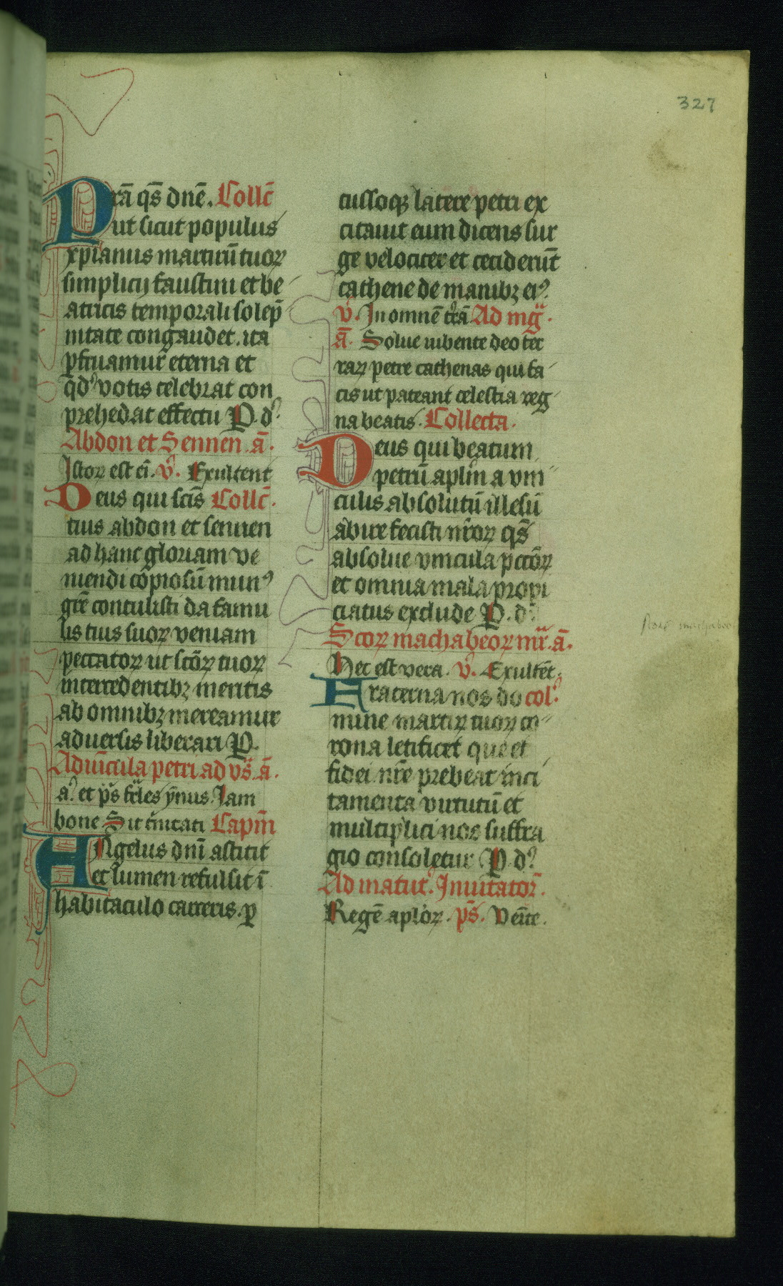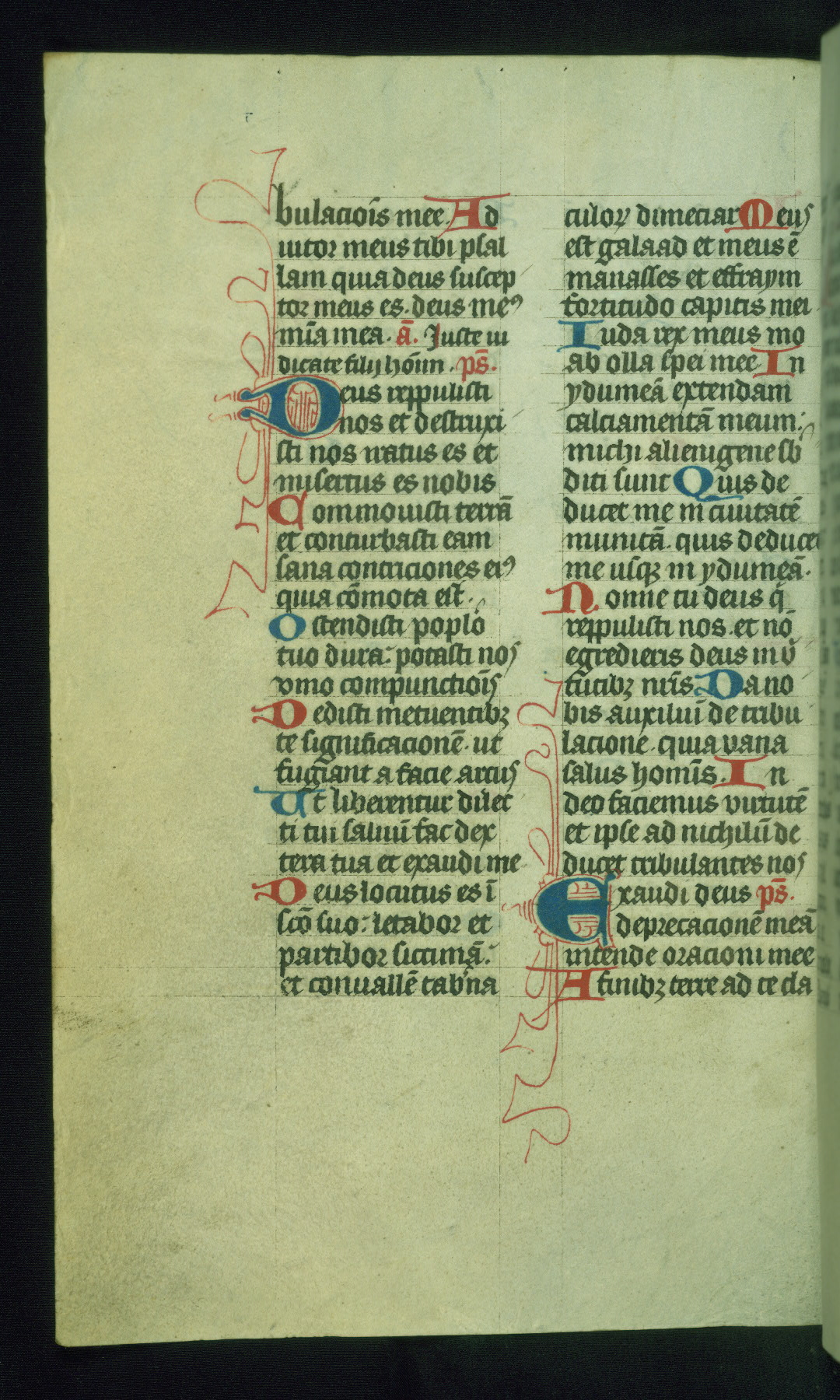This small breviary, composed of more than 500 folios, is extraordinary for its length, considering it is the summer portion of a two-volume breviary for the use of Liège. The manuscript was completed for ecclesiastical use at the Cathedral of Notre-Dame and St.-Lambert in Liège ca. 1420. This attribution is suggested, for instance, by the petitions to the congregation of this cathedral (fols. 114v-117v), as well as the armorial shield of the family of Surlet de Chokier of Liège represented at the opening of the Psalms. The manuscript has modest, but interesting, decoration with historiated and decorated initials marking the liturgical texts, and occasional angels playing instruments in the margins. The most notable pictorial effect is found in the initials inhabited by transparent figures on rich blue ground. The technique is found, for instance, on fol. 156r with the gold monstrance held by translucent angels for the feast of the Corpus Christi.
