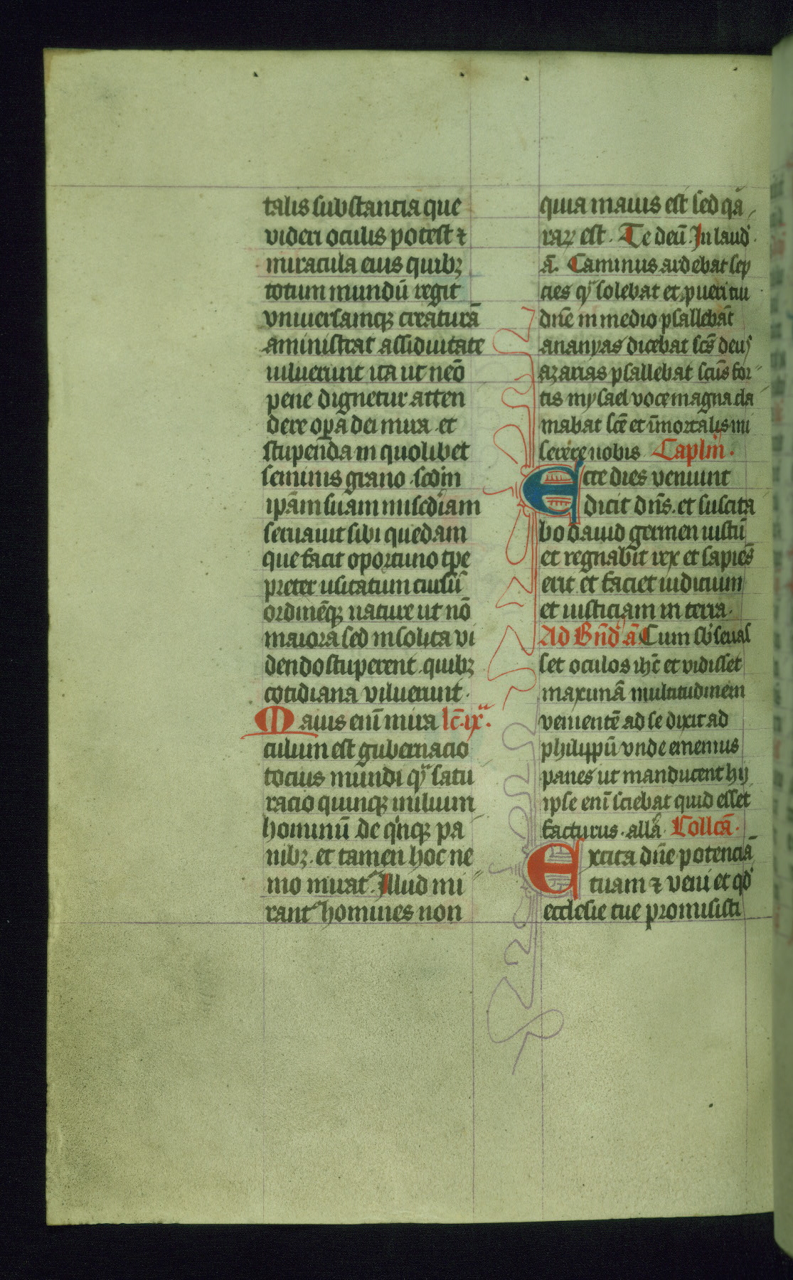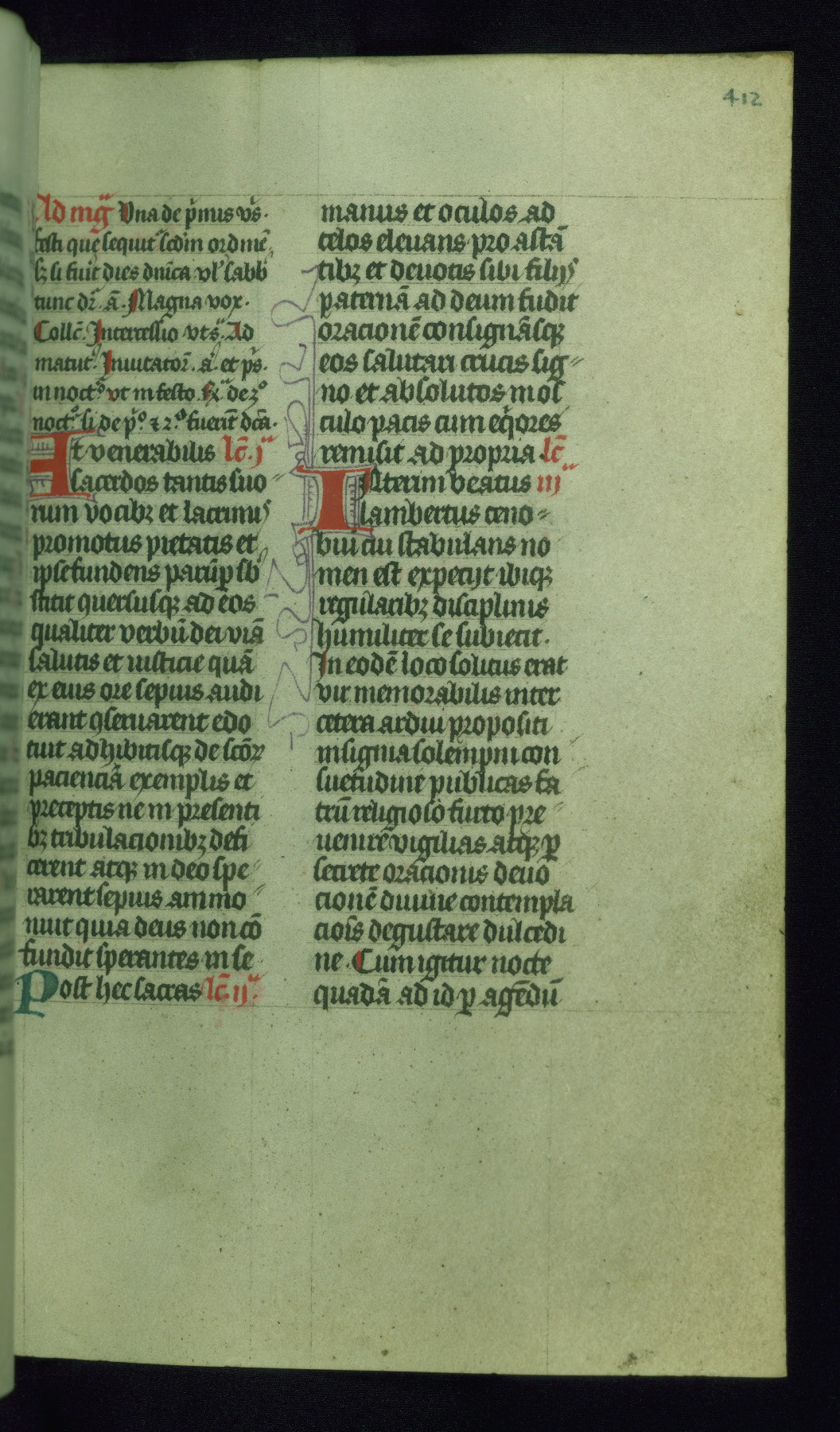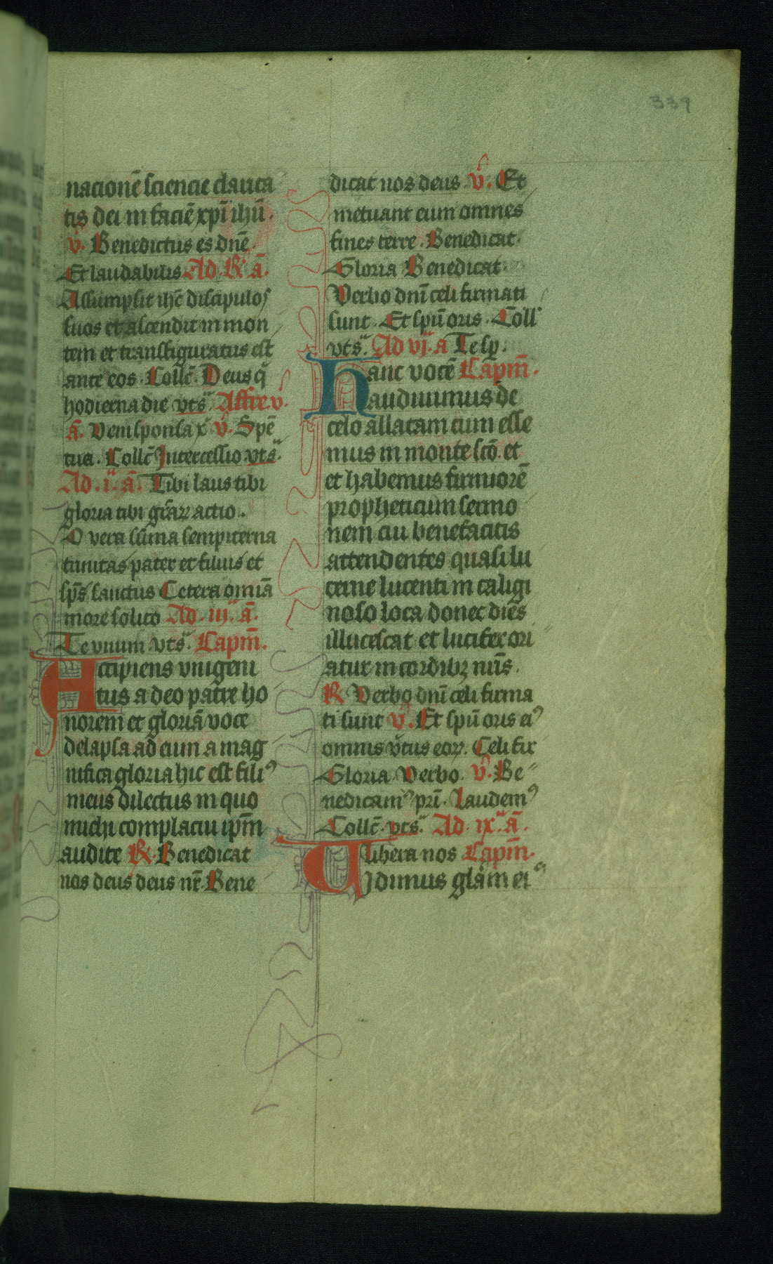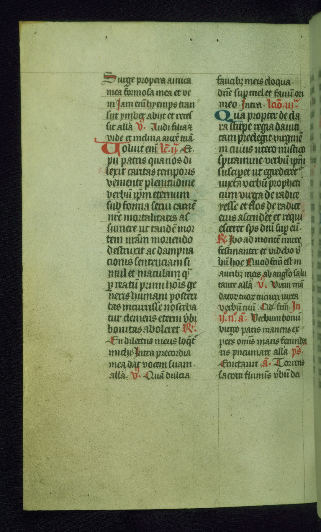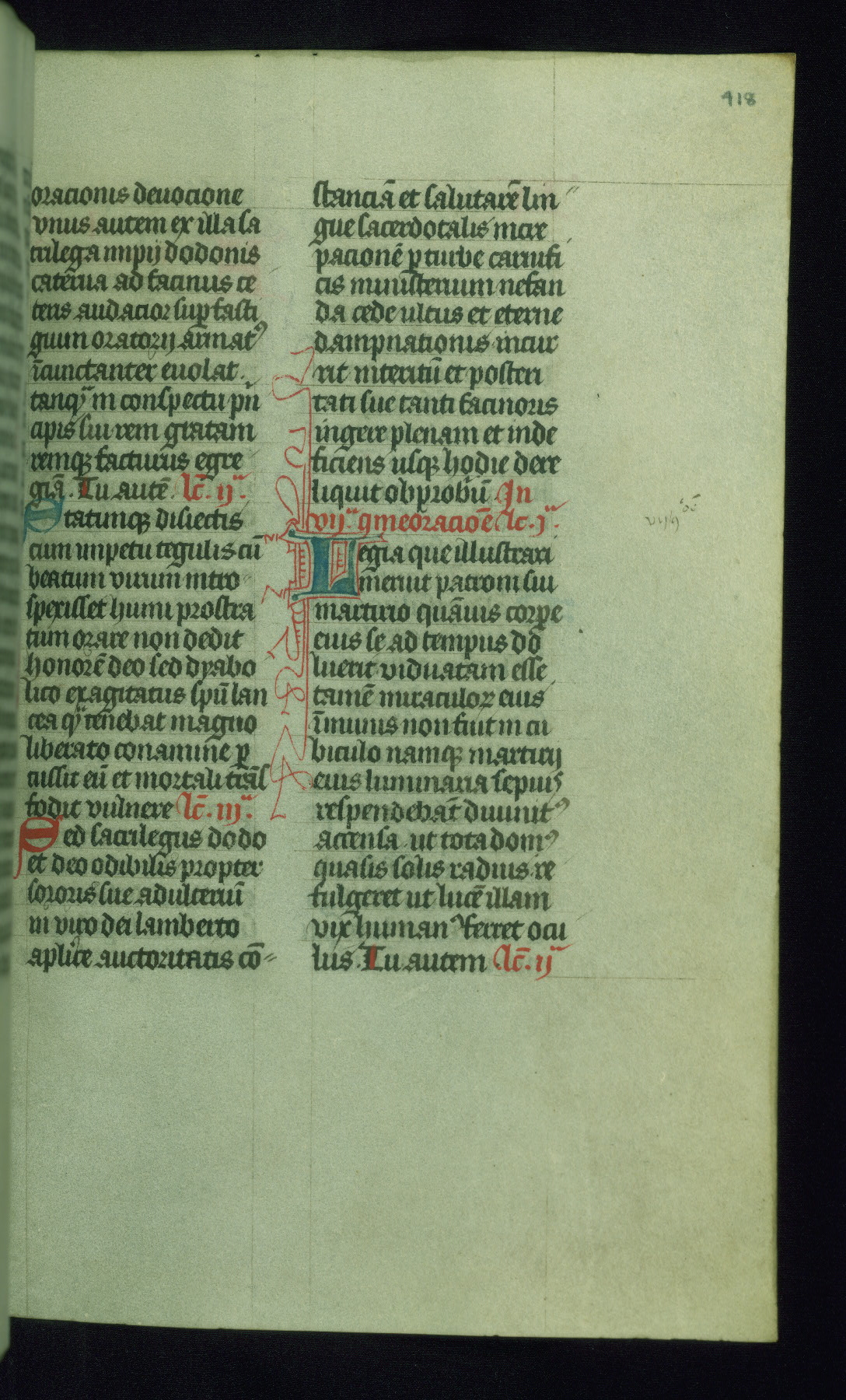 This small breviary, composed of more than 500 folios, is extraordinary for its length, considering it is the summer portion of a two-volume breviary for the use of Liège. The manuscript was completed for ecclesiastical use at the Cathedral of Notre-Dame and St.-Lambert in Liège ca. 1420. This attribution is suggested, for instance, by the petitions to the congregation of this cathedral (fols. 114v-117v), as well as the armorial shield of the family of Surlet de Chokier of Liège represented at the opening of the Psalms. The manuscript has modest, but interesting, decoration with historiated and decorated initials marking the liturgical texts, and occasional angels playing instruments in the margins. The most notable pictorial effect is found in the initials inhabited by transparent figures on rich blue ground. The technique is found, for instance, on fol. 156r with the gold monstrance held by translucent angels for the feast of the Corpus Christi.