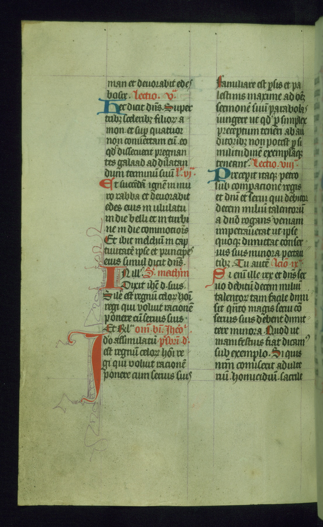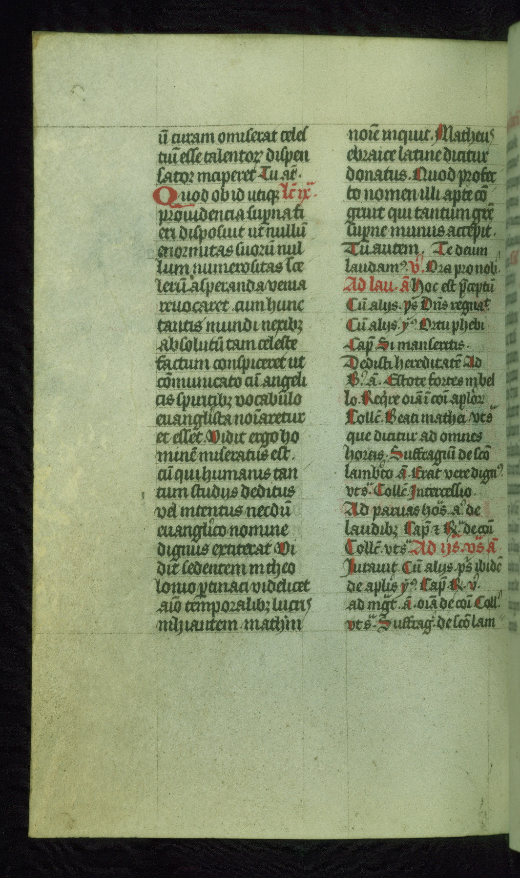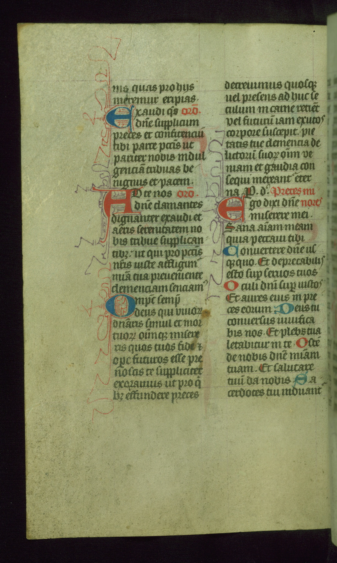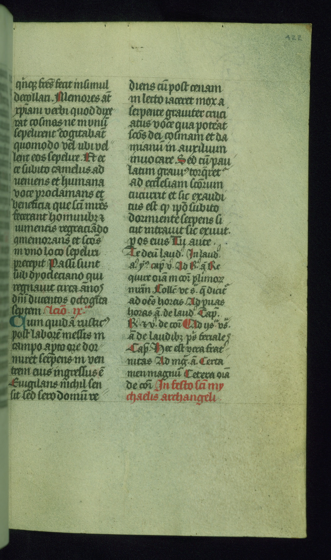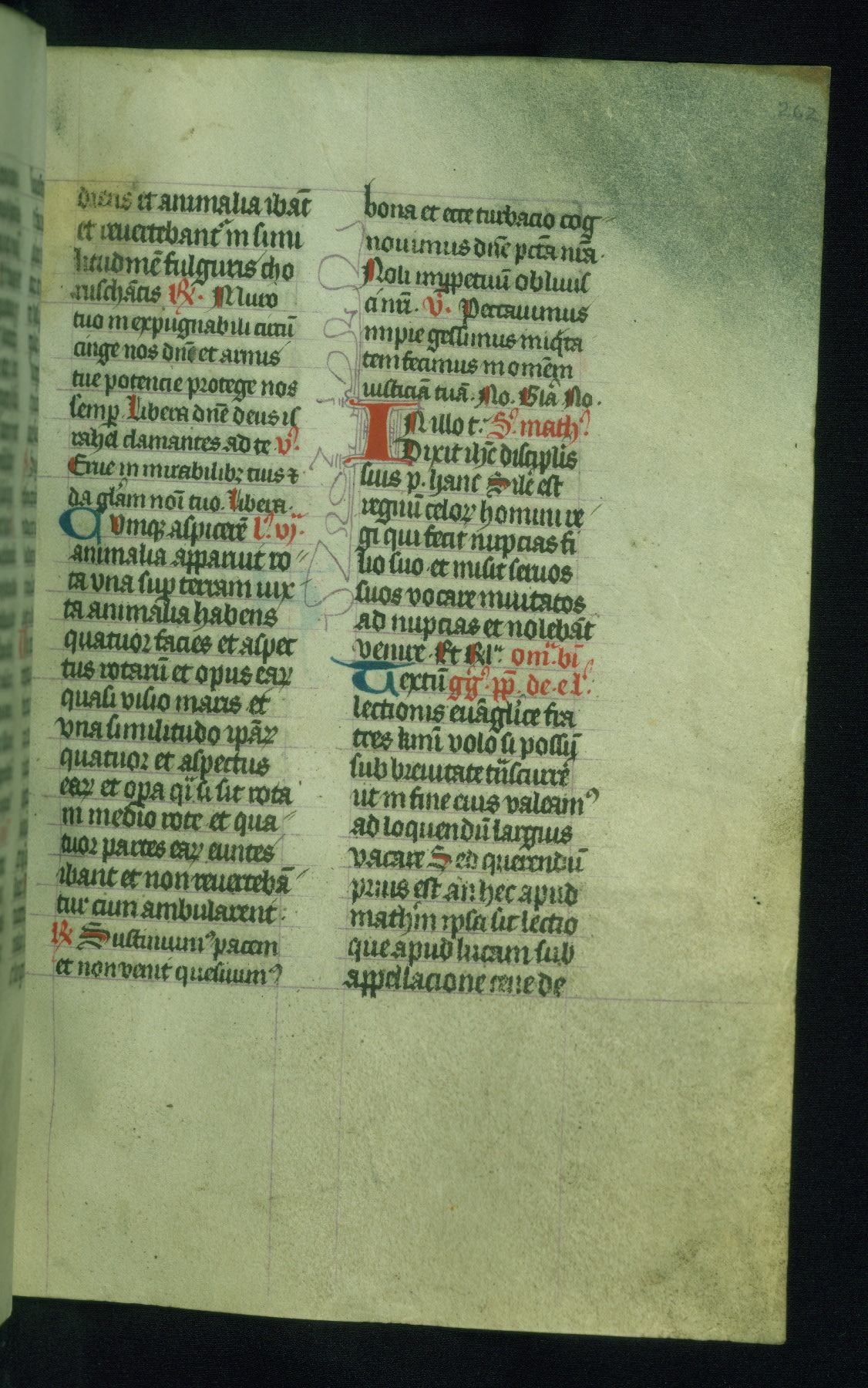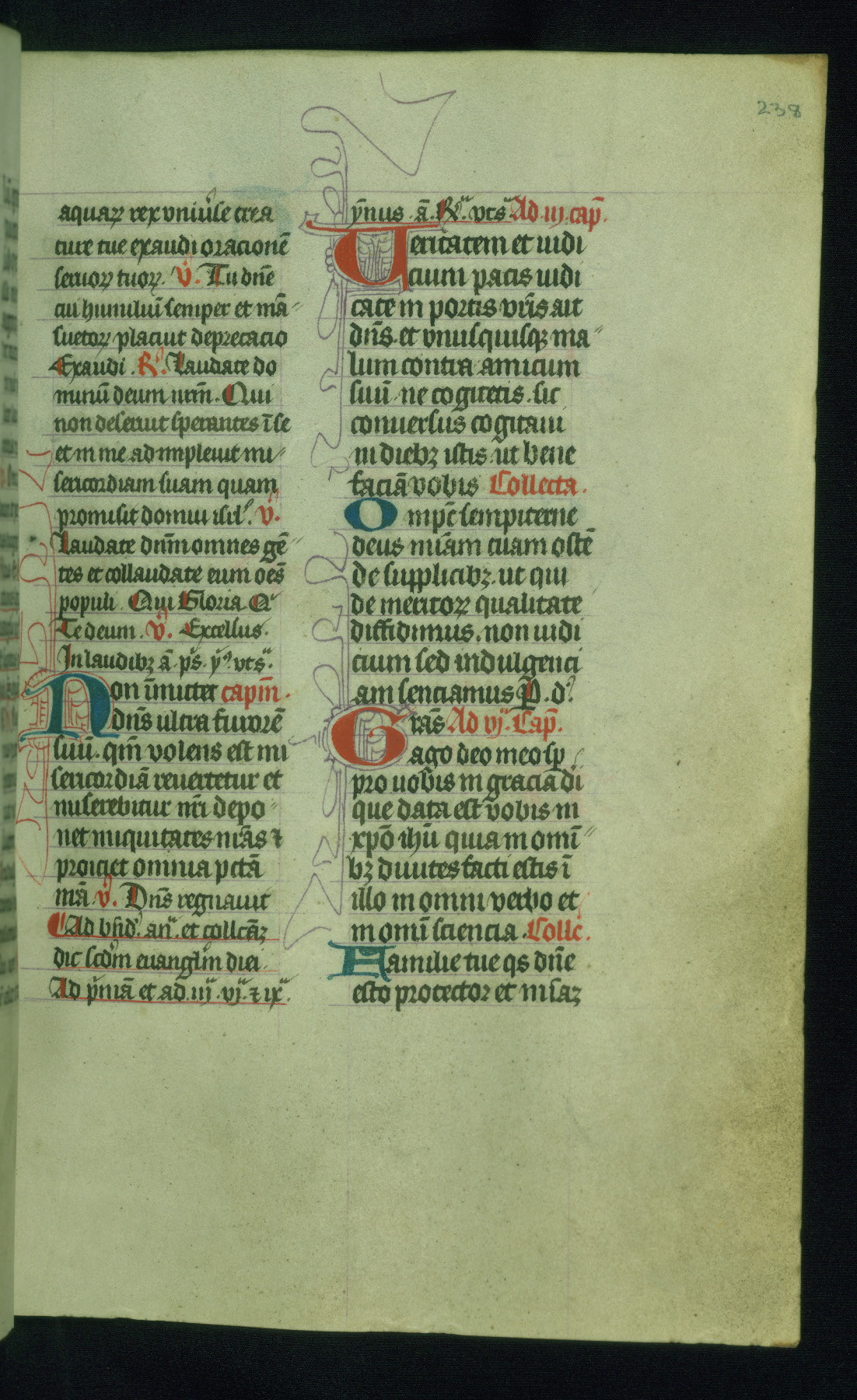 This small breviary, composed of more than 500 folios, is extraordinary for its length, considering it is the summer portion of a two-volume breviary for the use of Liège. The manuscript was completed for ecclesiastical use at the Cathedral of Notre-Dame and St.-Lambert in Liège ca. 1420. This attribution is suggested, for instance, by the petitions to the congregation of this cathedral (fols. 114v-117v), as well as the armorial shield of the family of Surlet de Chokier of Liège represented at the opening of the Psalms. The manuscript has modest, but interesting, decoration with historiated and decorated initials marking the liturgical texts, and occasional angels playing instruments in the margins. The most notable pictorial effect is found in the initials inhabited by transparent figures on rich blue ground. The technique is found, for instance, on fol. 156r with the gold monstrance held by translucent angels for the feast of the Corpus Christi.