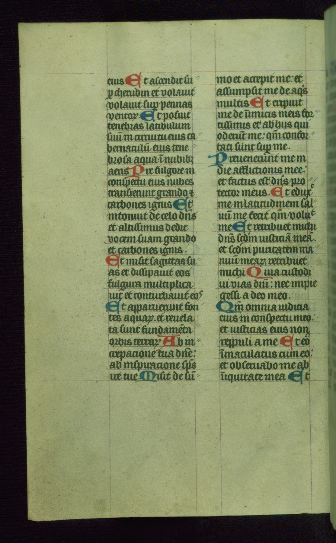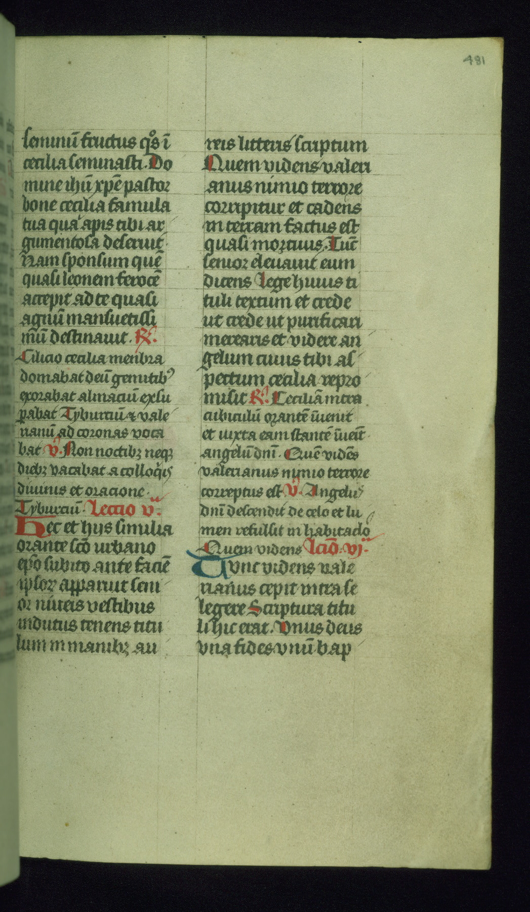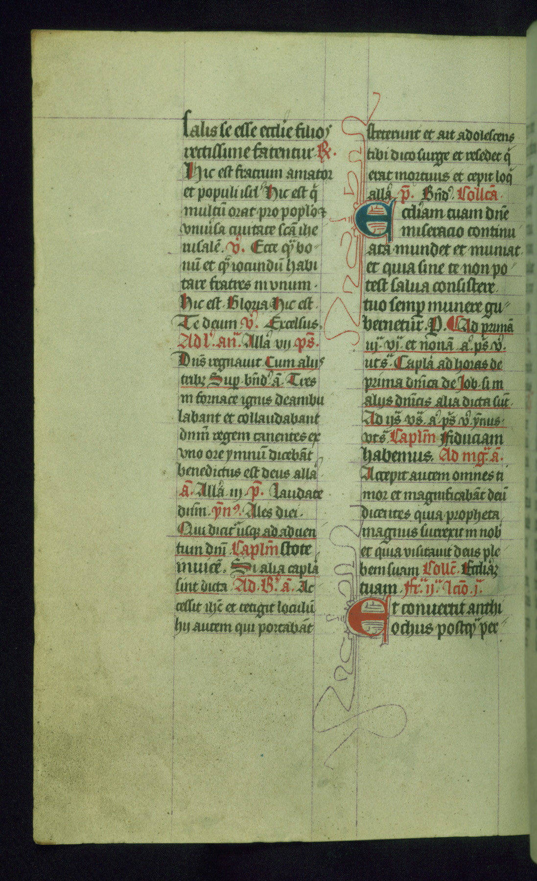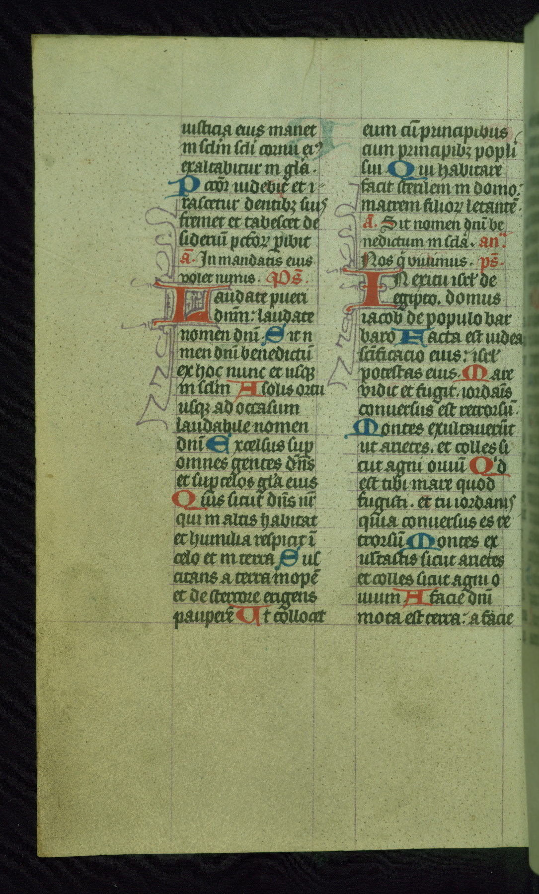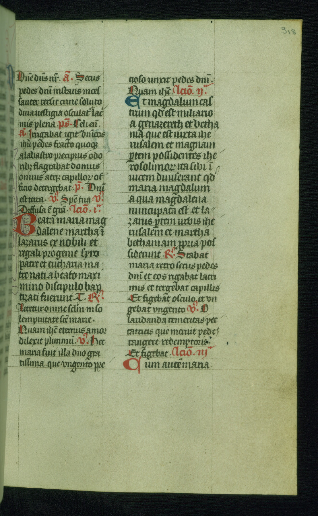 This small breviary, composed of more than 500 folios, is extraordinary for its length, considering it is the summer portion of a two-volume breviary for the use of Liège. The manuscript was completed for ecclesiastical use at the Cathedral of Notre-Dame and St.-Lambert in Liège ca. 1420. This attribution is suggested, for instance, by the petitions to the congregation of this cathedral (fols. 114v-117v), as well as the armorial shield of the family of Surlet de Chokier of Liège represented at the opening of the Psalms. The manuscript has modest, but interesting, decoration with historiated and decorated initials marking the liturgical texts, and occasional angels playing instruments in the margins. The most notable pictorial effect is found in the initials inhabited by transparent figures on rich blue ground. The technique is found, for instance, on fol. 156r with the gold monstrance held by translucent angels for the feast of the Corpus Christi.