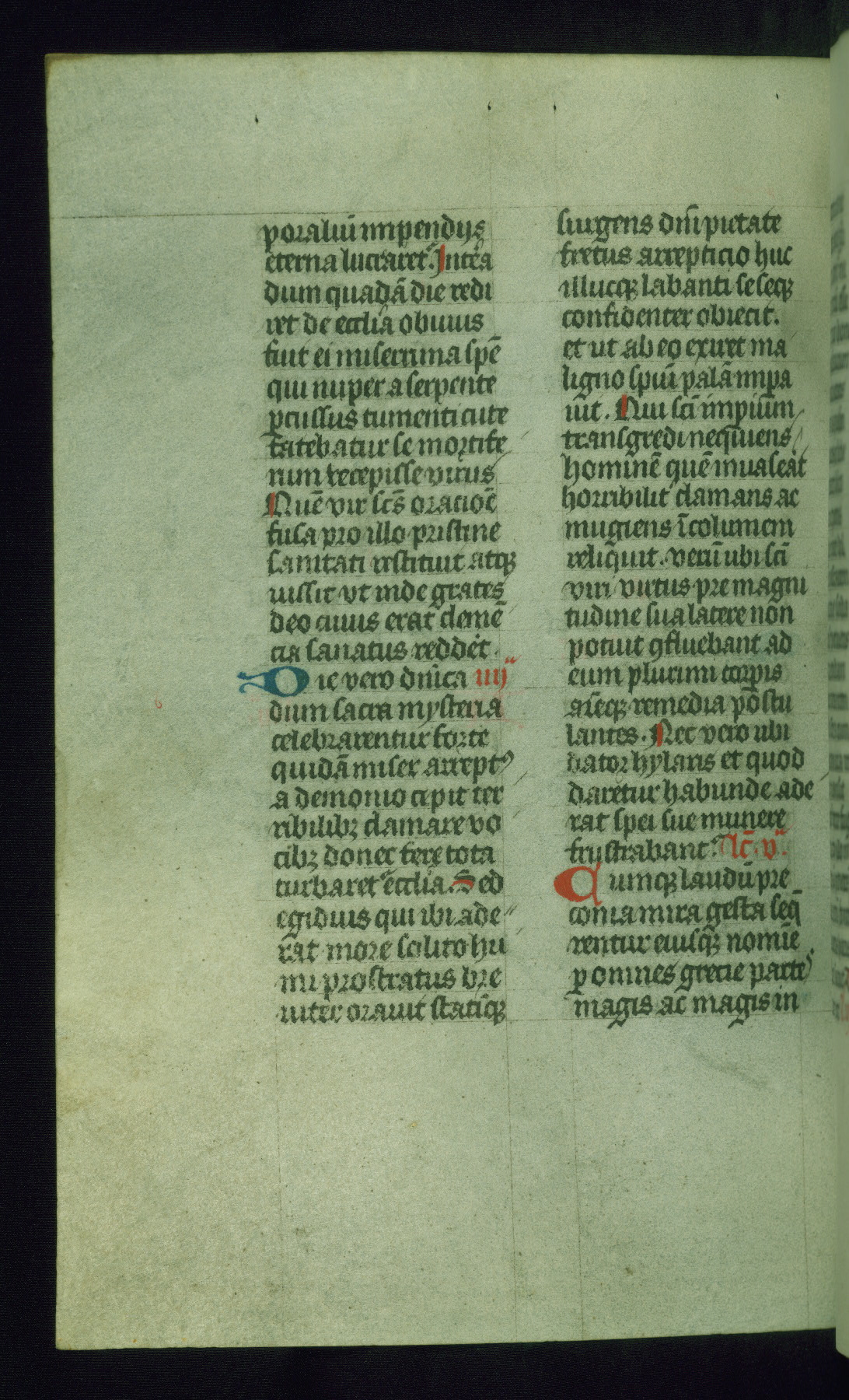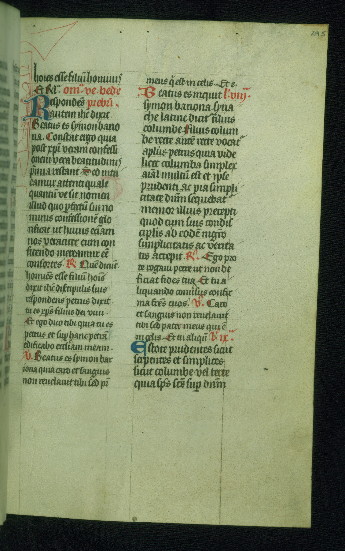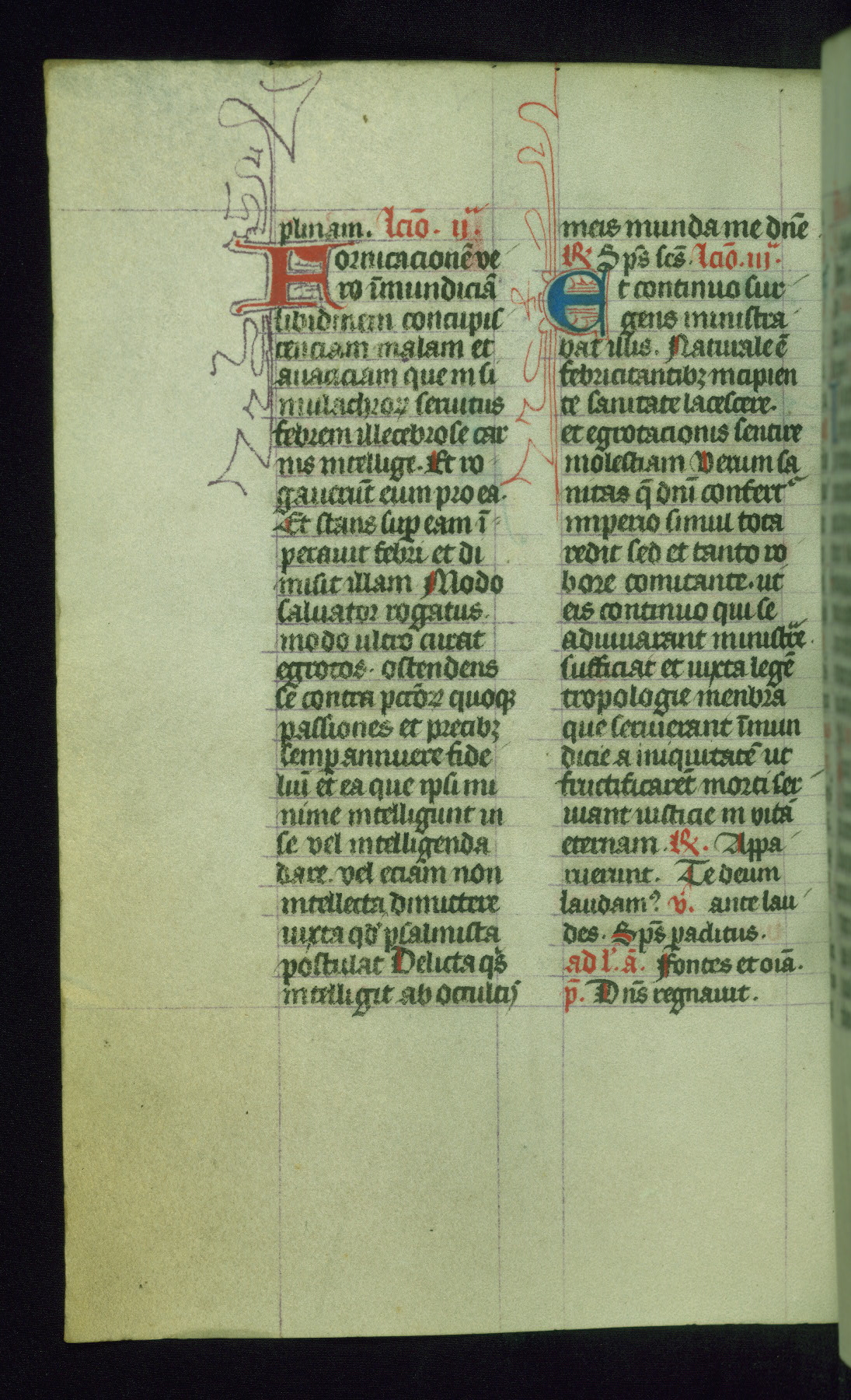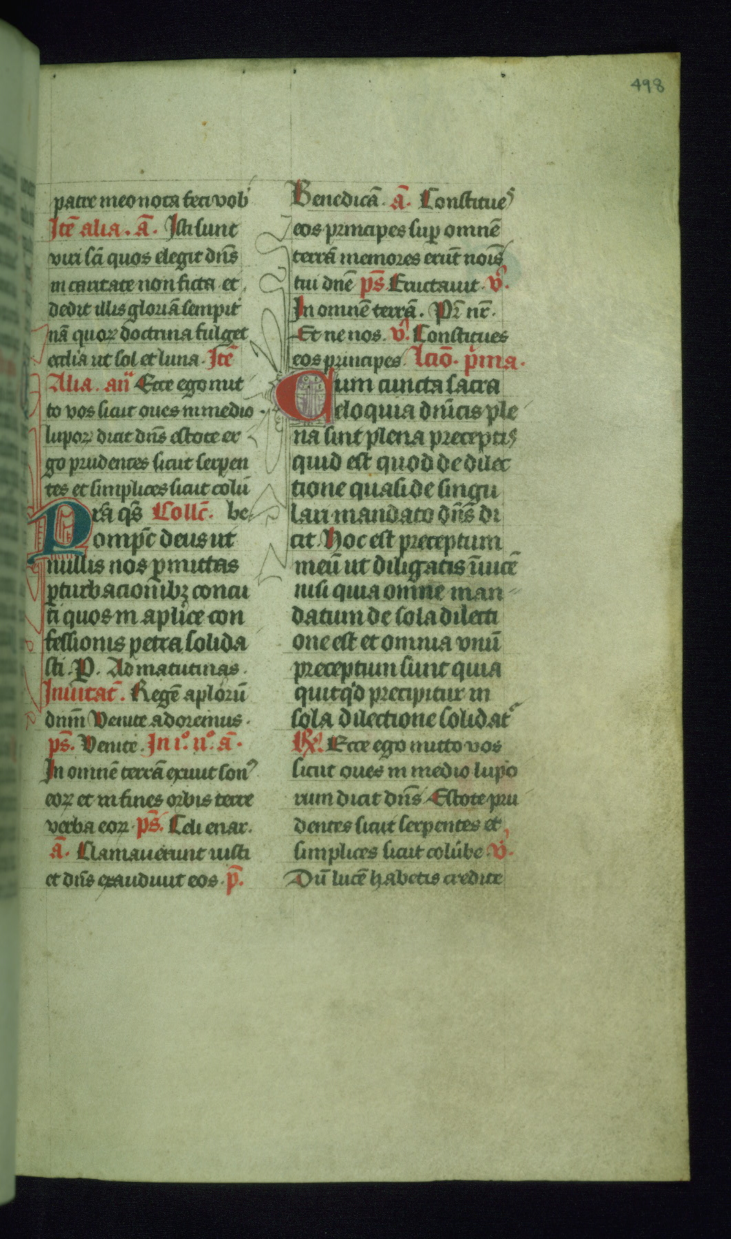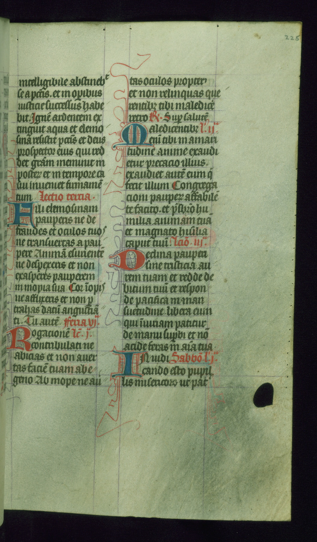 This small breviary, composed of more than 500 folios, is extraordinary for its length, considering it is the summer portion of a two-volume breviary for the use of Liège. The manuscript was completed for ecclesiastical use at the Cathedral of Notre-Dame and St.-Lambert in Liège ca. 1420. This attribution is suggested, for instance, by the petitions to the congregation of this cathedral (fols. 114v-117v), as well as the armorial shield of the family of Surlet de Chokier of Liège represented at the opening of the Psalms. The manuscript has modest, but interesting, decoration with historiated and decorated initials marking the liturgical texts, and occasional angels playing instruments in the margins. The most notable pictorial effect is found in the initials inhabited by transparent figures on rich blue ground. The technique is found, for instance, on fol. 156r with the gold monstrance held by translucent angels for the feast of the Corpus Christi.