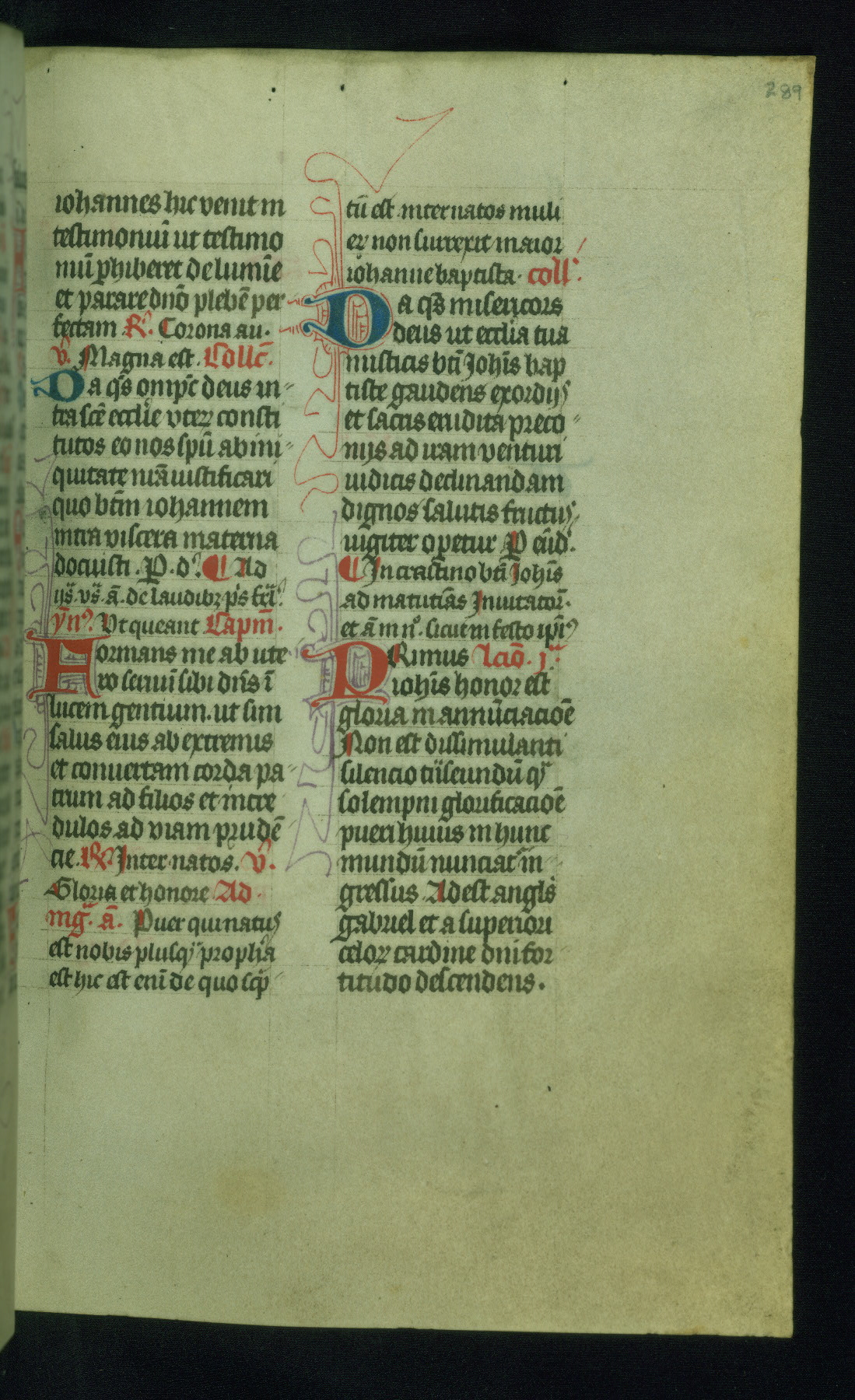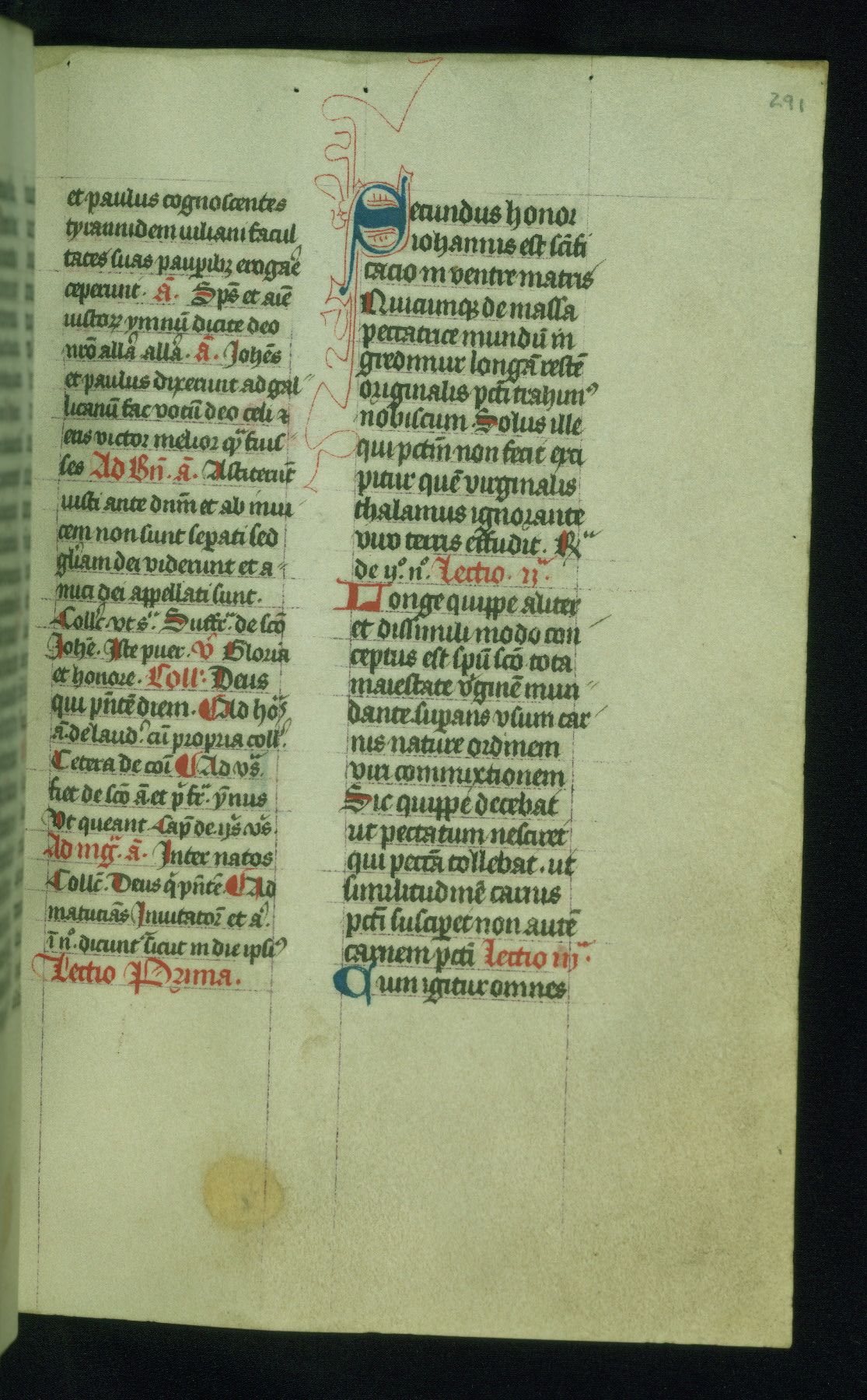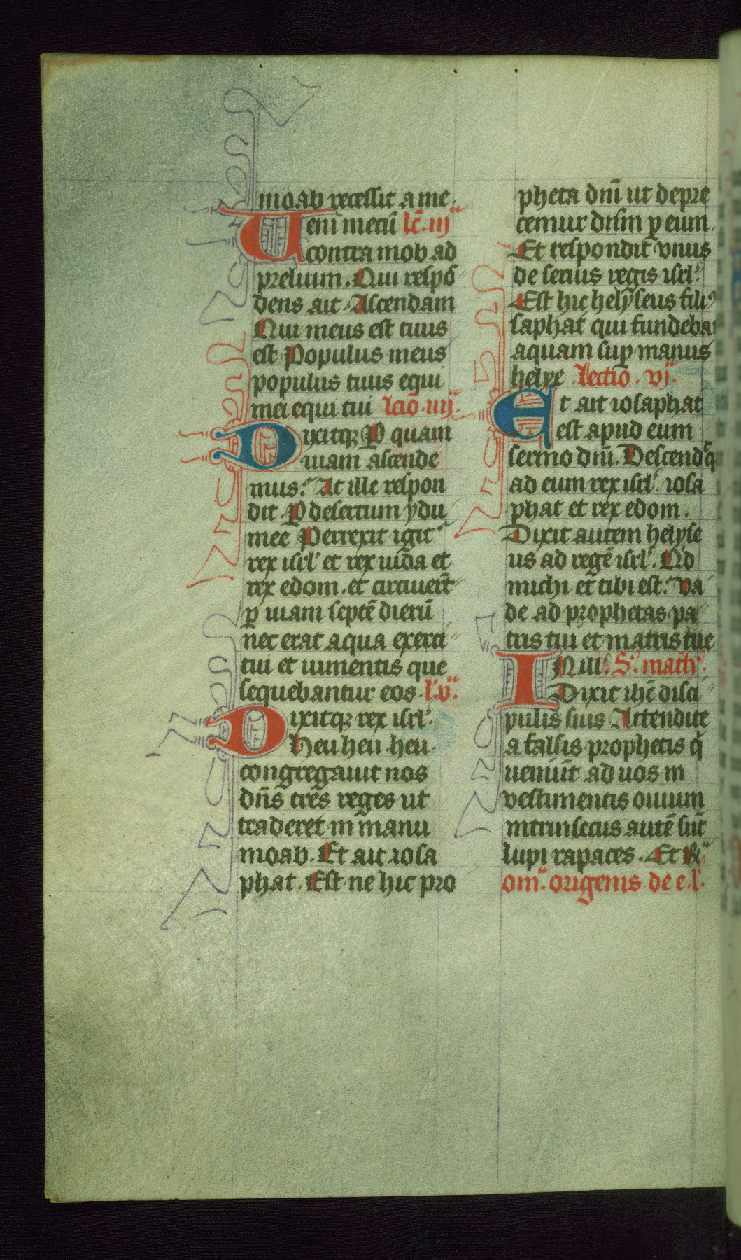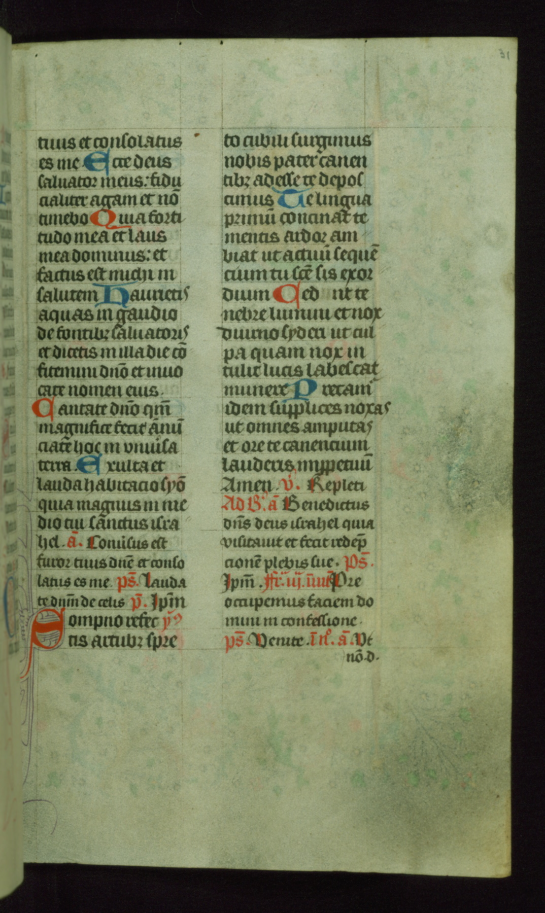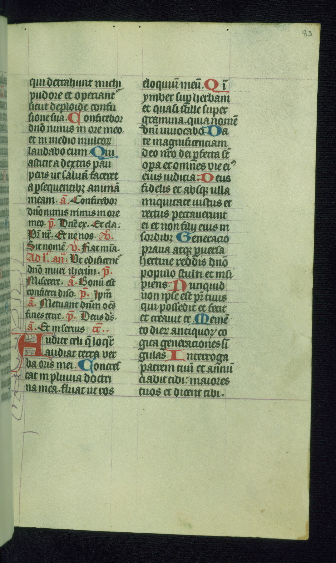 This small breviary, composed of more than 500 folios, is extraordinary for its length, considering it is the summer portion of a two-volume breviary for the use of Liège. The manuscript was completed for ecclesiastical use at the Cathedral of Notre-Dame and St.-Lambert in Liège ca. 1420. This attribution is suggested, for instance, by the petitions to the congregation of this cathedral (fols. 114v-117v), as well as the armorial shield of the family of Surlet de Chokier of Liège represented at the opening of the Psalms. The manuscript has modest, but interesting, decoration with historiated and decorated initials marking the liturgical texts, and occasional angels playing instruments in the margins. The most notable pictorial effect is found in the initials inhabited by transparent figures on rich blue ground. The technique is found, for instance, on fol. 156r with the gold monstrance held by translucent angels for the feast of the Corpus Christi.