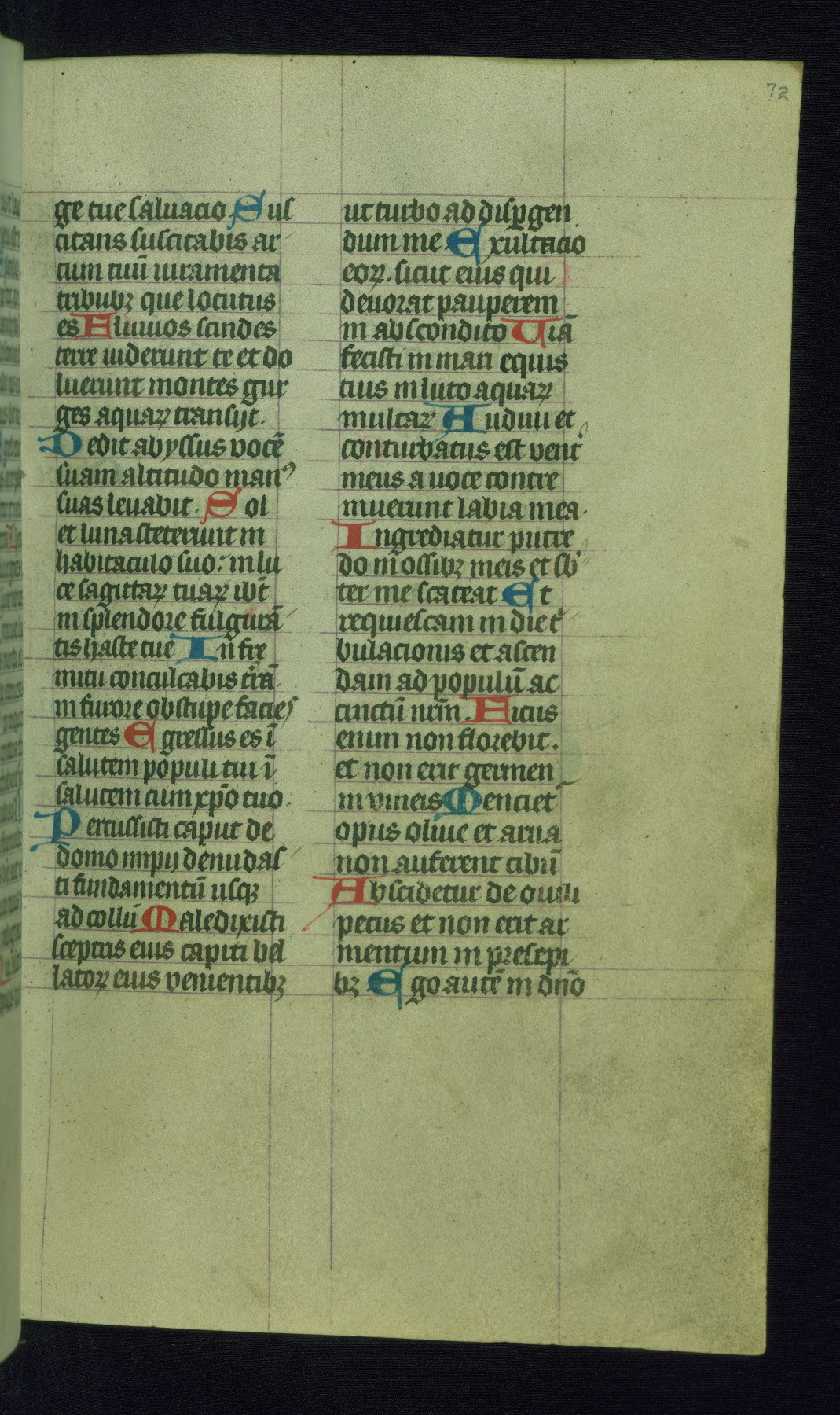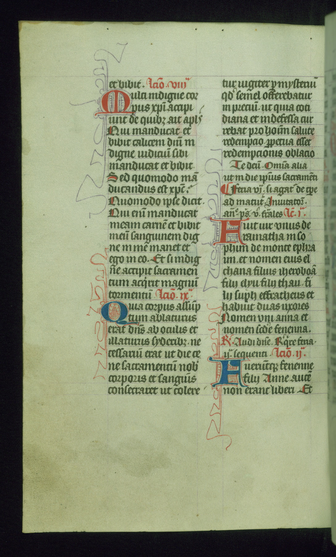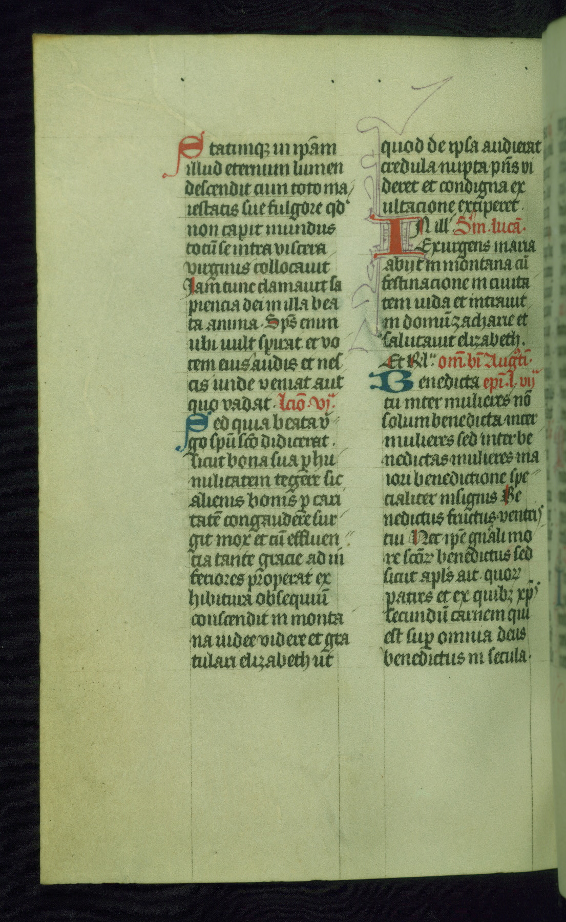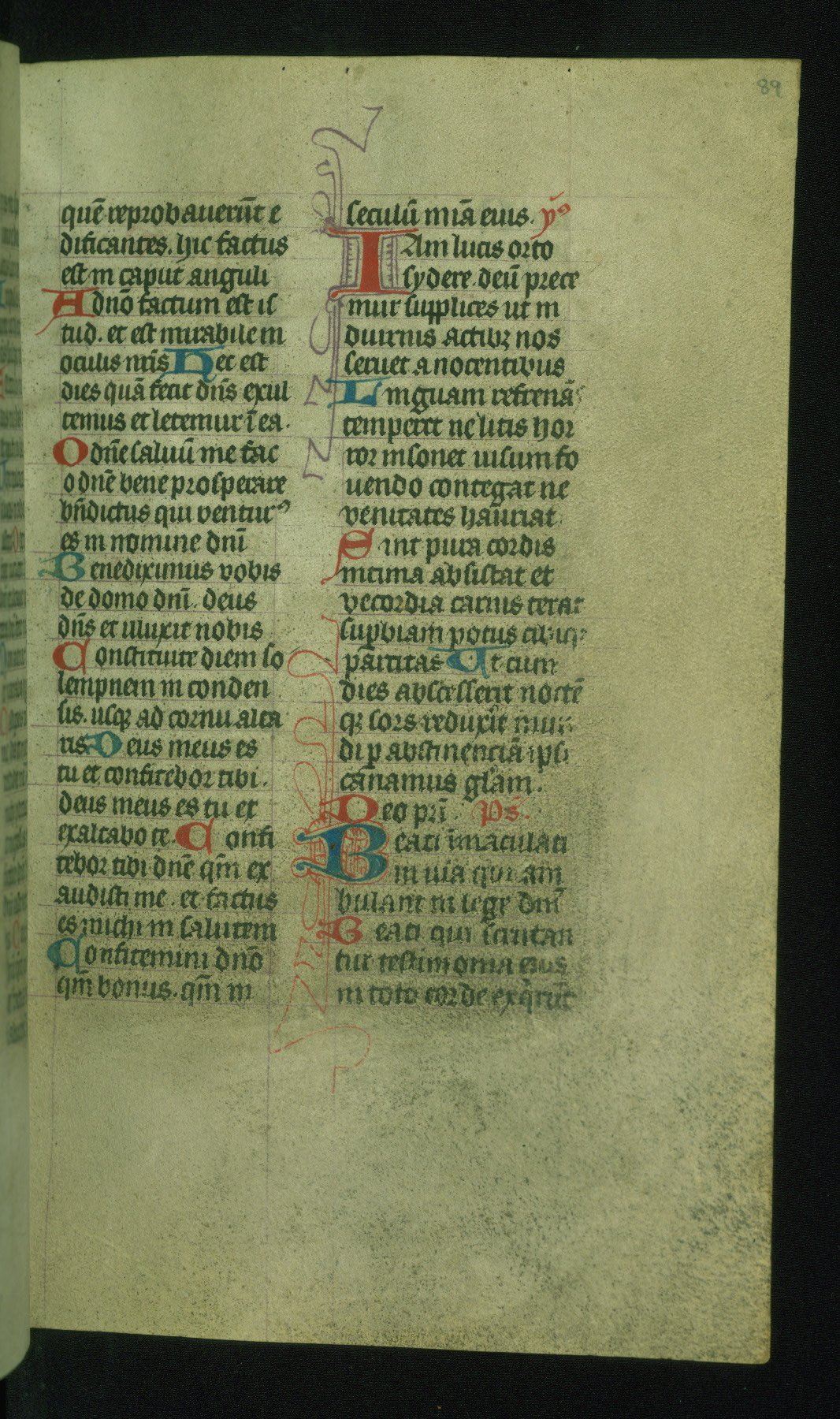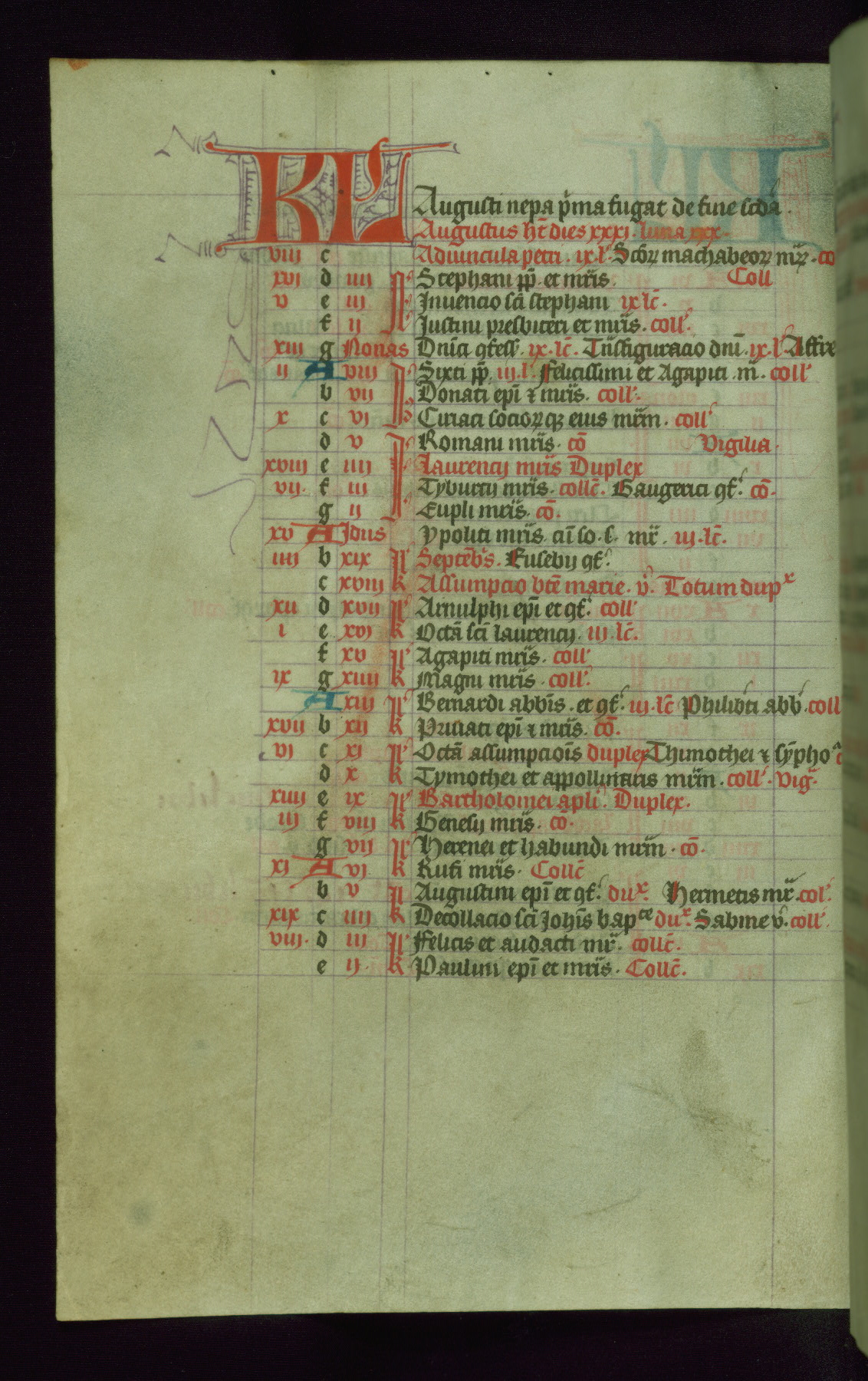 This small breviary, composed of more than 500 folios, is extraordinary for its length, considering it is the summer portion of a two-volume breviary for the use of Liège. The manuscript was completed for ecclesiastical use at the Cathedral of Notre-Dame and St.-Lambert in Liège ca. 1420. This attribution is suggested, for instance, by the petitions to the congregation of this cathedral (fols. 114v-117v), as well as the armorial shield of the family of Surlet de Chokier of Liège represented at the opening of the Psalms. The manuscript has modest, but interesting, decoration with historiated and decorated initials marking the liturgical texts, and occasional angels playing instruments in the margins. The most notable pictorial effect is found in the initials inhabited by transparent figures on rich blue ground. The technique is found, for instance, on fol. 156r with the gold monstrance held by translucent angels for the feast of the Corpus Christi.