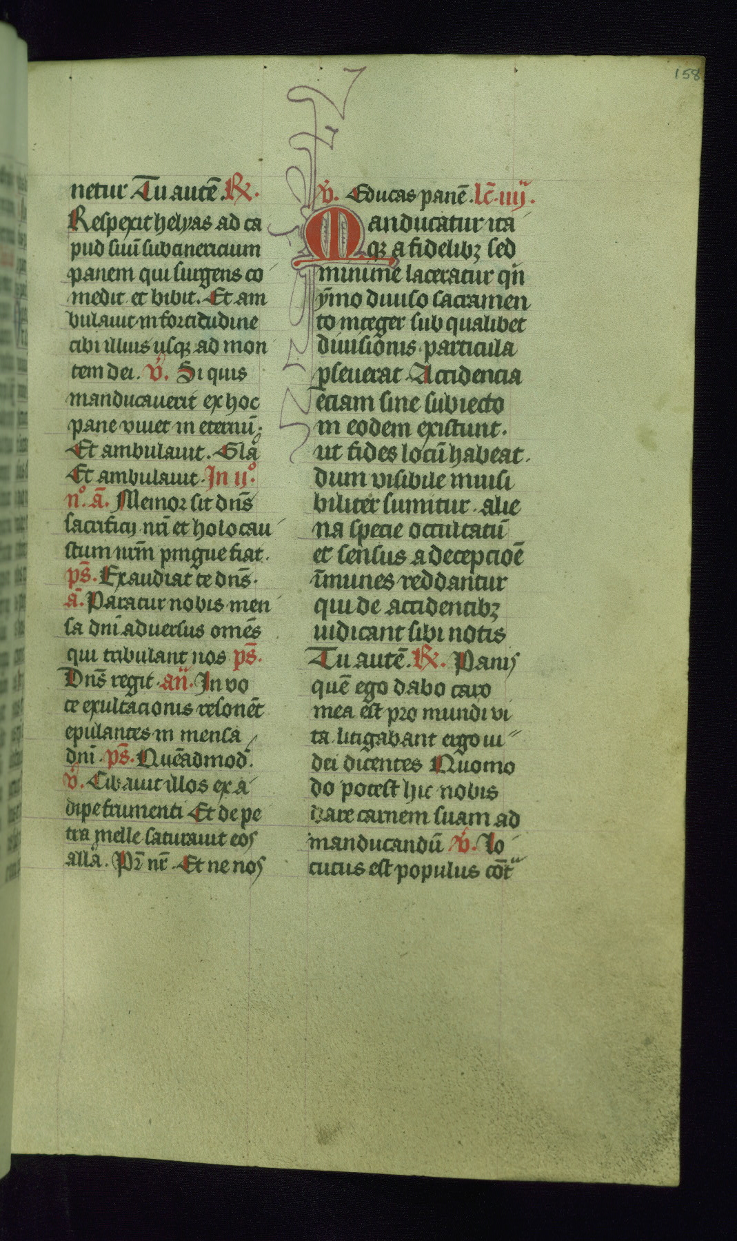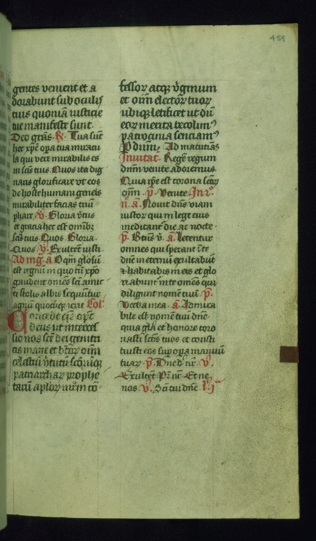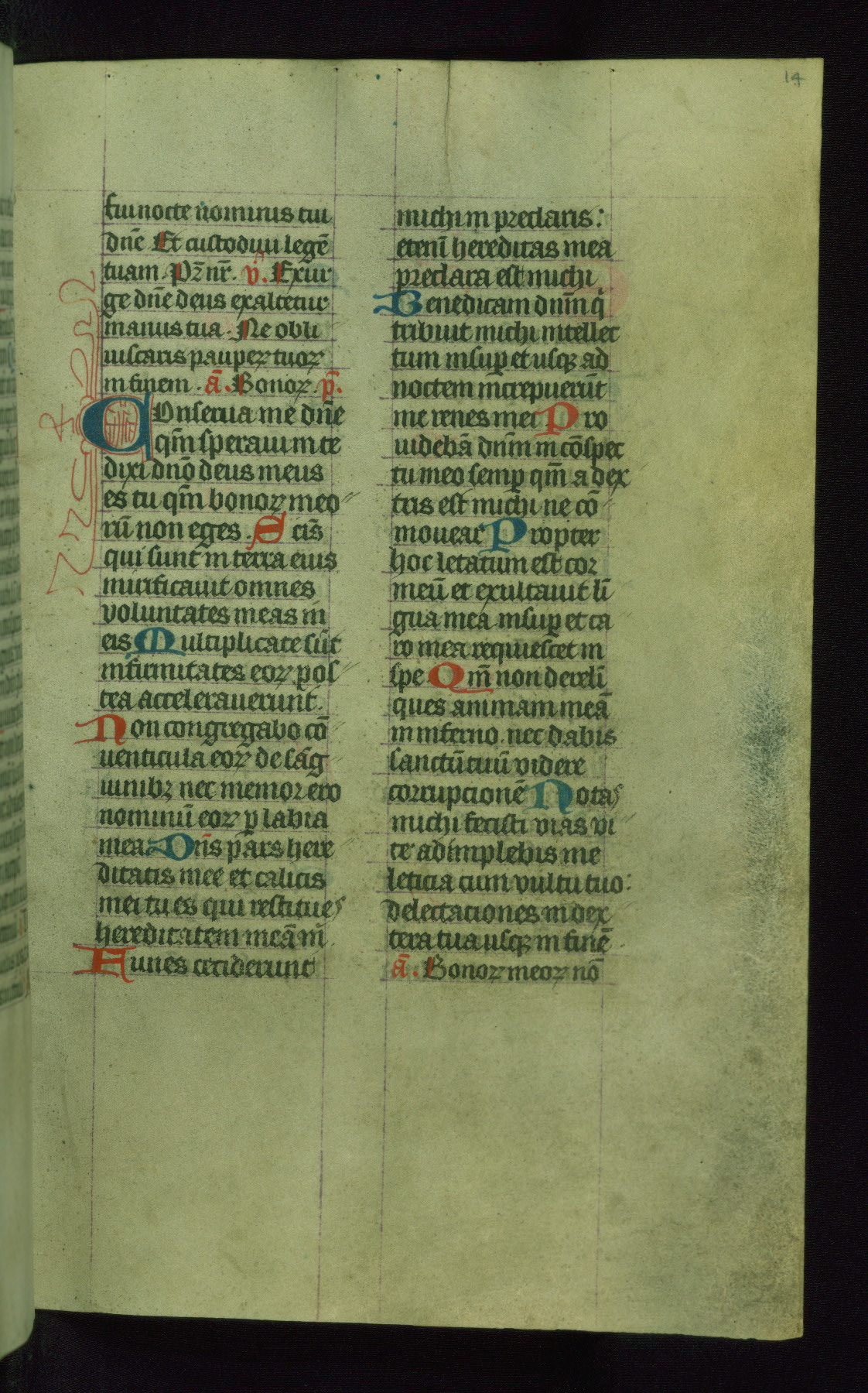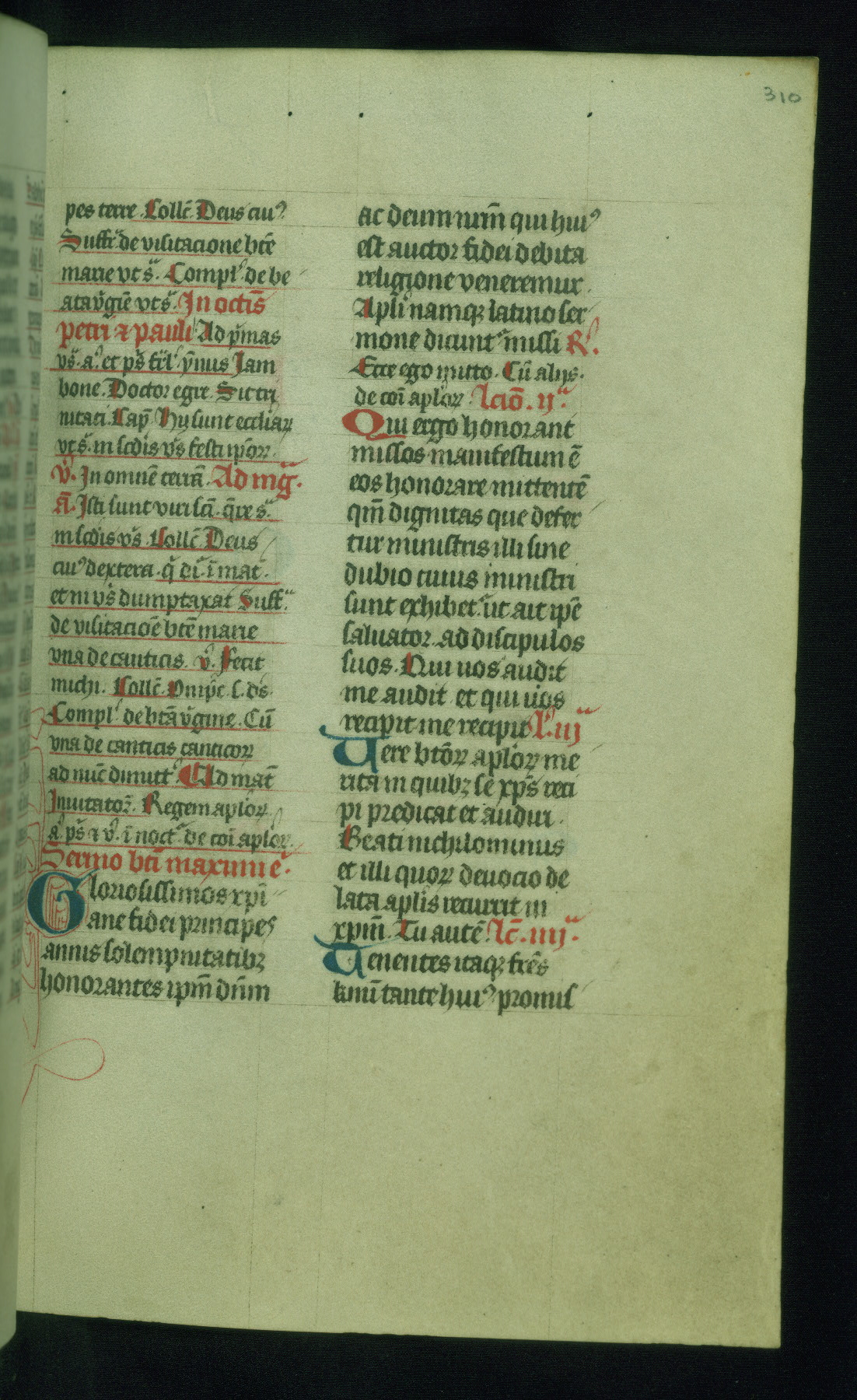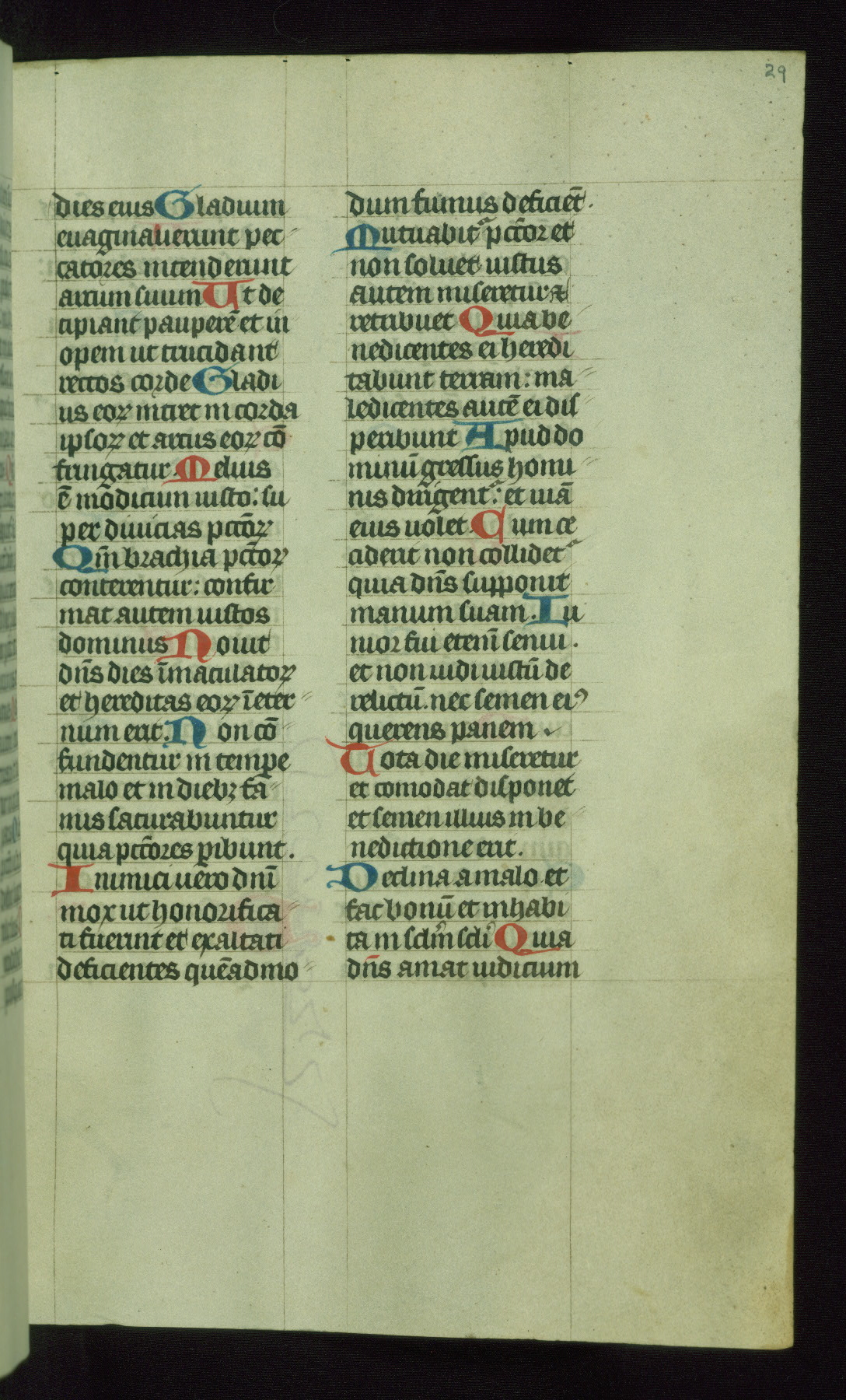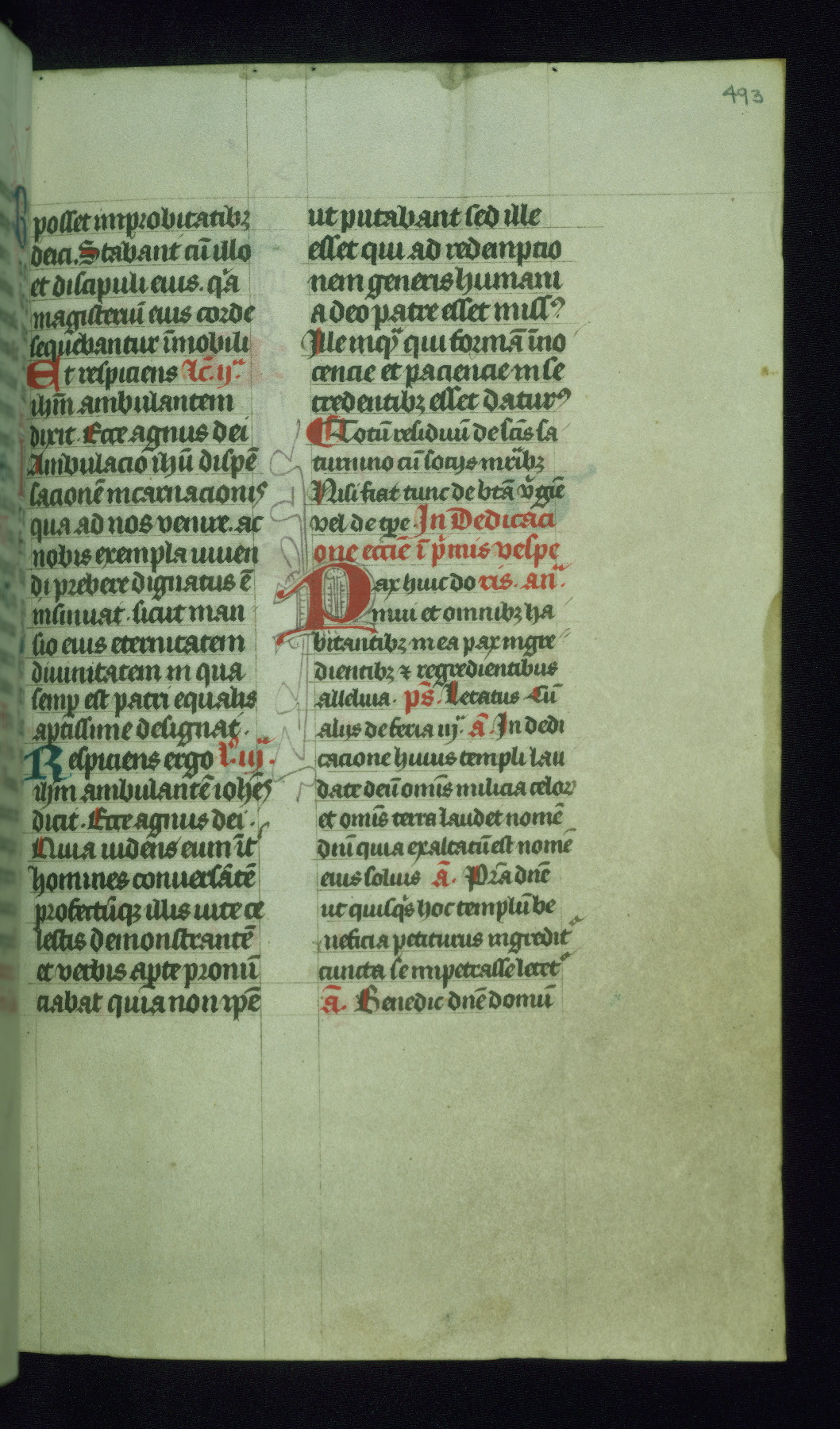 This small breviary, composed of more than 500 folios, is extraordinary for its length, considering it is the summer portion of a two-volume breviary for the use of Liège. The manuscript was completed for ecclesiastical use at the Cathedral of Notre-Dame and St.-Lambert in Liège ca. 1420. This attribution is suggested, for instance, by the petitions to the congregation of this cathedral (fols. 114v-117v), as well as the armorial shield of the family of Surlet de Chokier of Liège represented at the opening of the Psalms. The manuscript has modest, but interesting, decoration with historiated and decorated initials marking the liturgical texts, and occasional angels playing instruments in the margins. The most notable pictorial effect is found in the initials inhabited by transparent figures on rich blue ground. The technique is found, for instance, on fol. 156r with the gold monstrance held by translucent angels for the feast of the Corpus Christi.