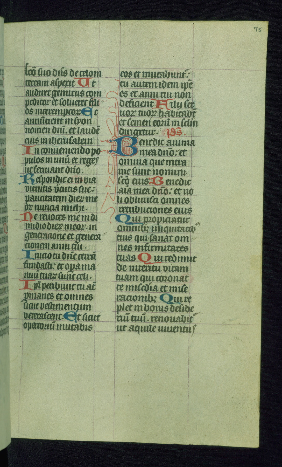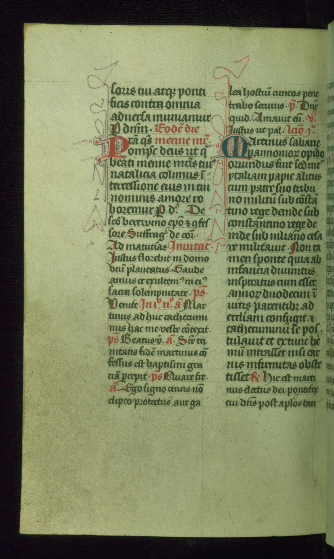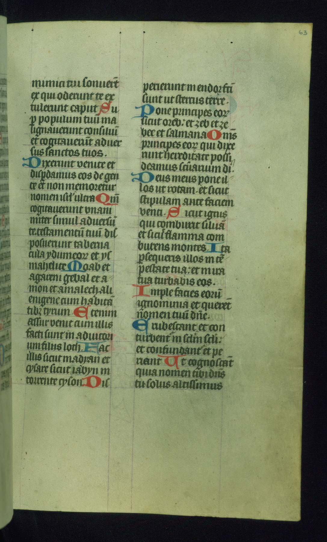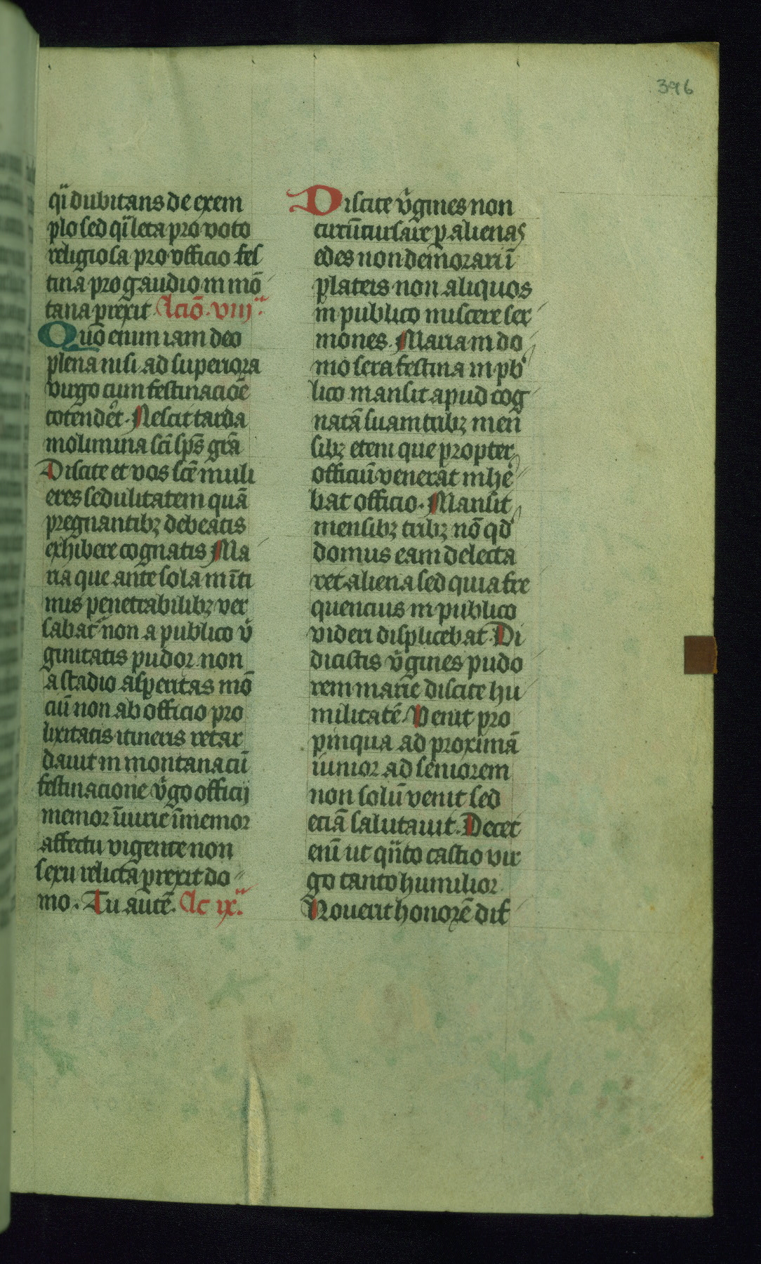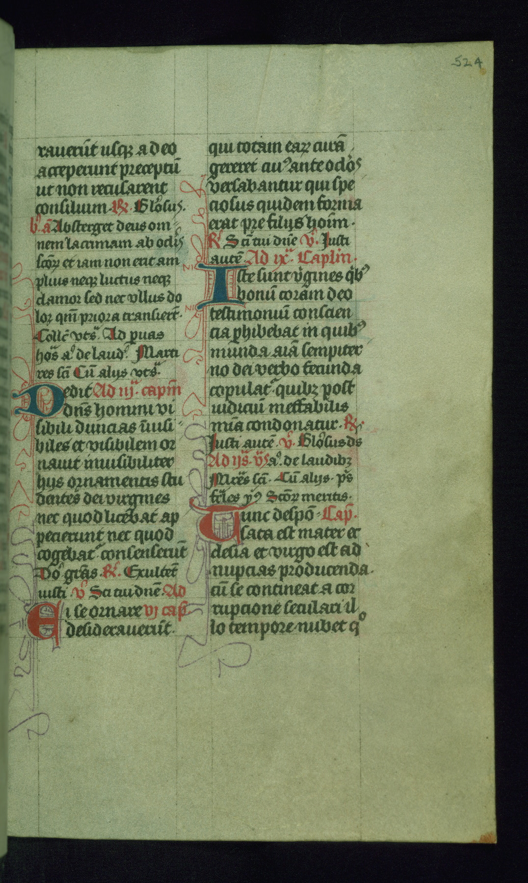 This small breviary, composed of more than 500 folios, is extraordinary for its length, considering it is the summer portion of a two-volume breviary for the use of Liège. The manuscript was completed for ecclesiastical use at the Cathedral of Notre-Dame and St.-Lambert in Liège ca. 1420. This attribution is suggested, for instance, by the petitions to the congregation of this cathedral (fols. 114v-117v), as well as the armorial shield of the family of Surlet de Chokier of Liège represented at the opening of the Psalms. The manuscript has modest, but interesting, decoration with historiated and decorated initials marking the liturgical texts, and occasional angels playing instruments in the margins. The most notable pictorial effect is found in the initials inhabited by transparent figures on rich blue ground. The technique is found, for instance, on fol. 156r with the gold monstrance held by translucent angels for the feast of the Corpus Christi.