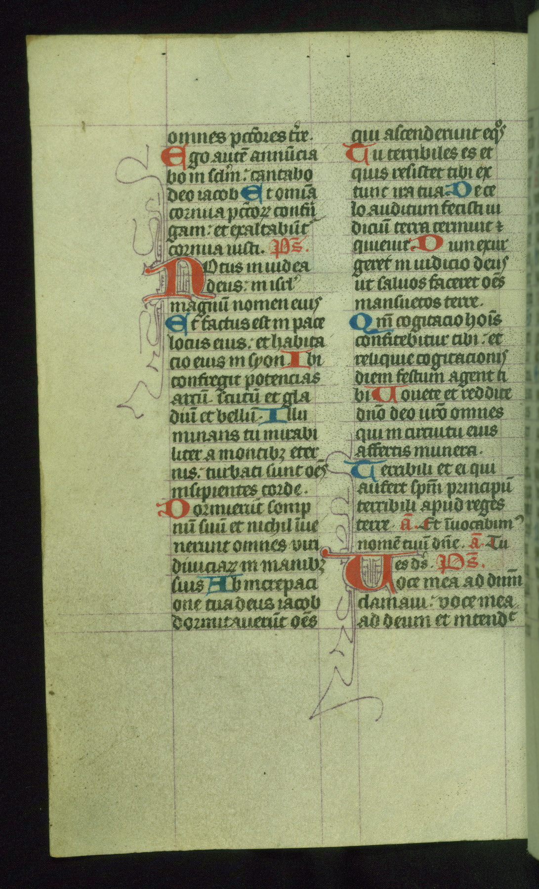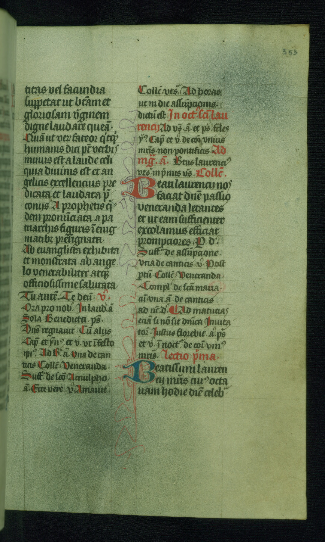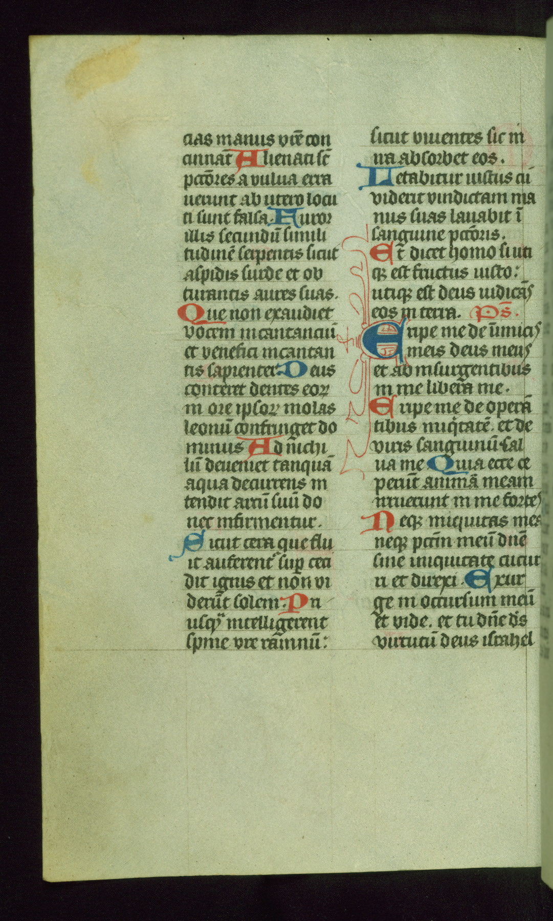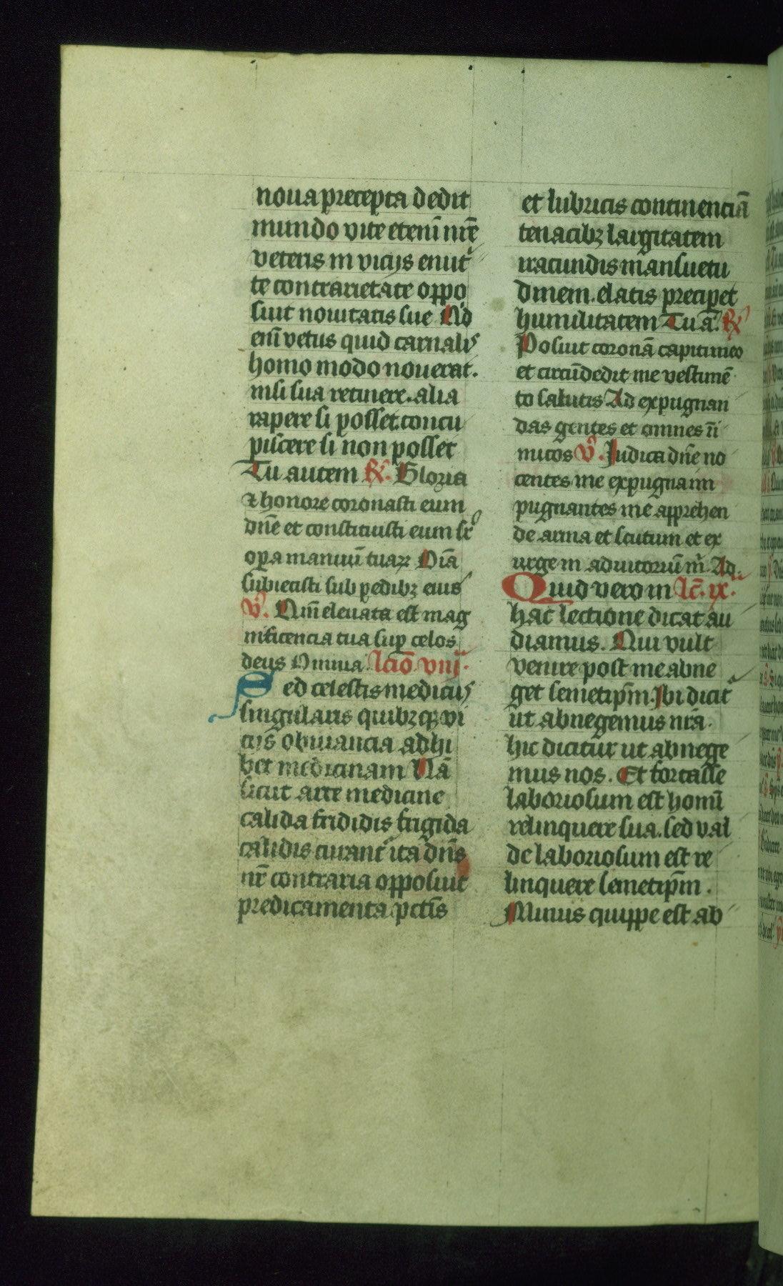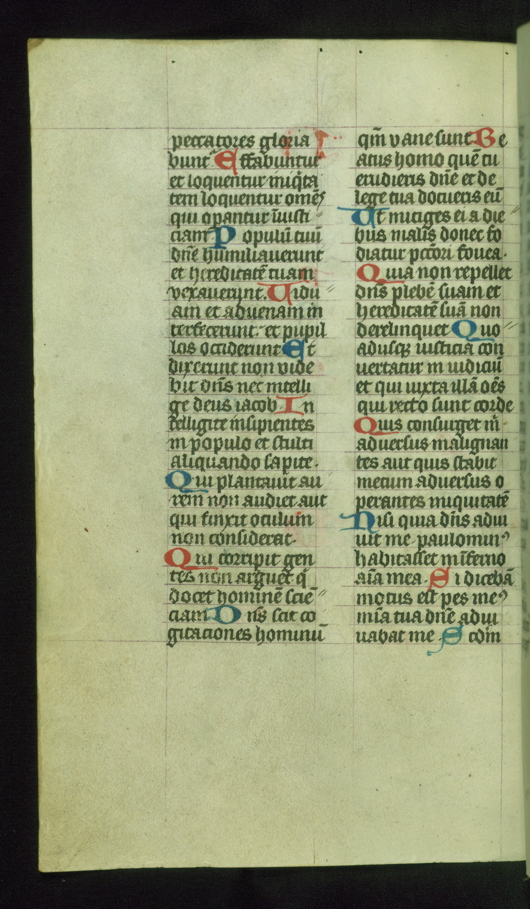 This small breviary, composed of more than 500 folios, is extraordinary for its length, considering it is the summer portion of a two-volume breviary for the use of Liège. The manuscript was completed for ecclesiastical use at the Cathedral of Notre-Dame and St.-Lambert in Liège ca. 1420. This attribution is suggested, for instance, by the petitions to the congregation of this cathedral (fols. 114v-117v), as well as the armorial shield of the family of Surlet de Chokier of Liège represented at the opening of the Psalms. The manuscript has modest, but interesting, decoration with historiated and decorated initials marking the liturgical texts, and occasional angels playing instruments in the margins. The most notable pictorial effect is found in the initials inhabited by transparent figures on rich blue ground. The technique is found, for instance, on fol. 156r with the gold monstrance held by translucent angels for the feast of the Corpus Christi.