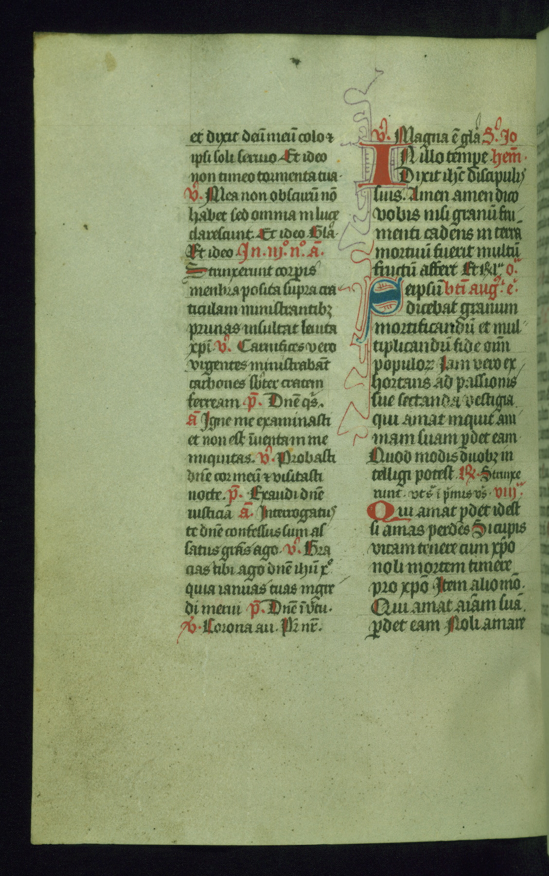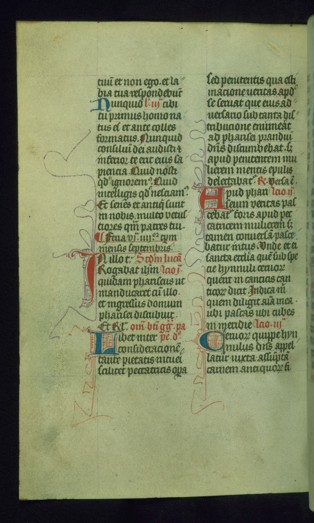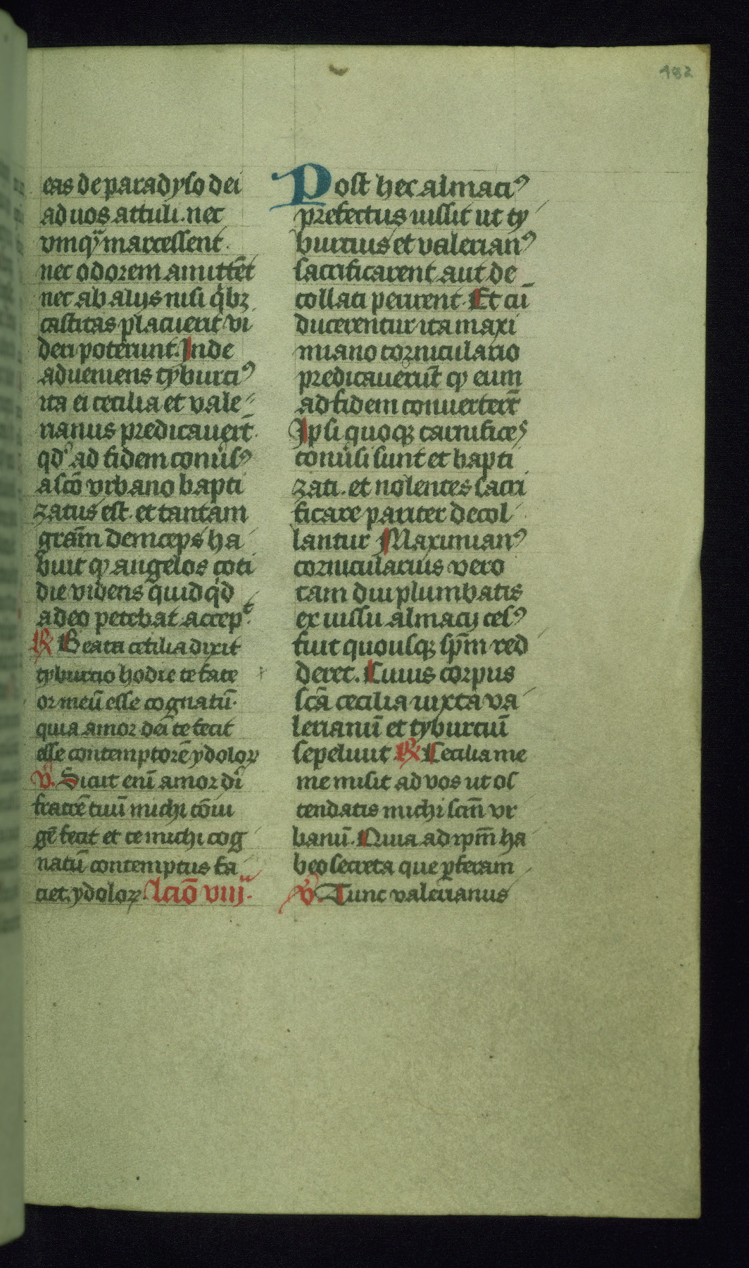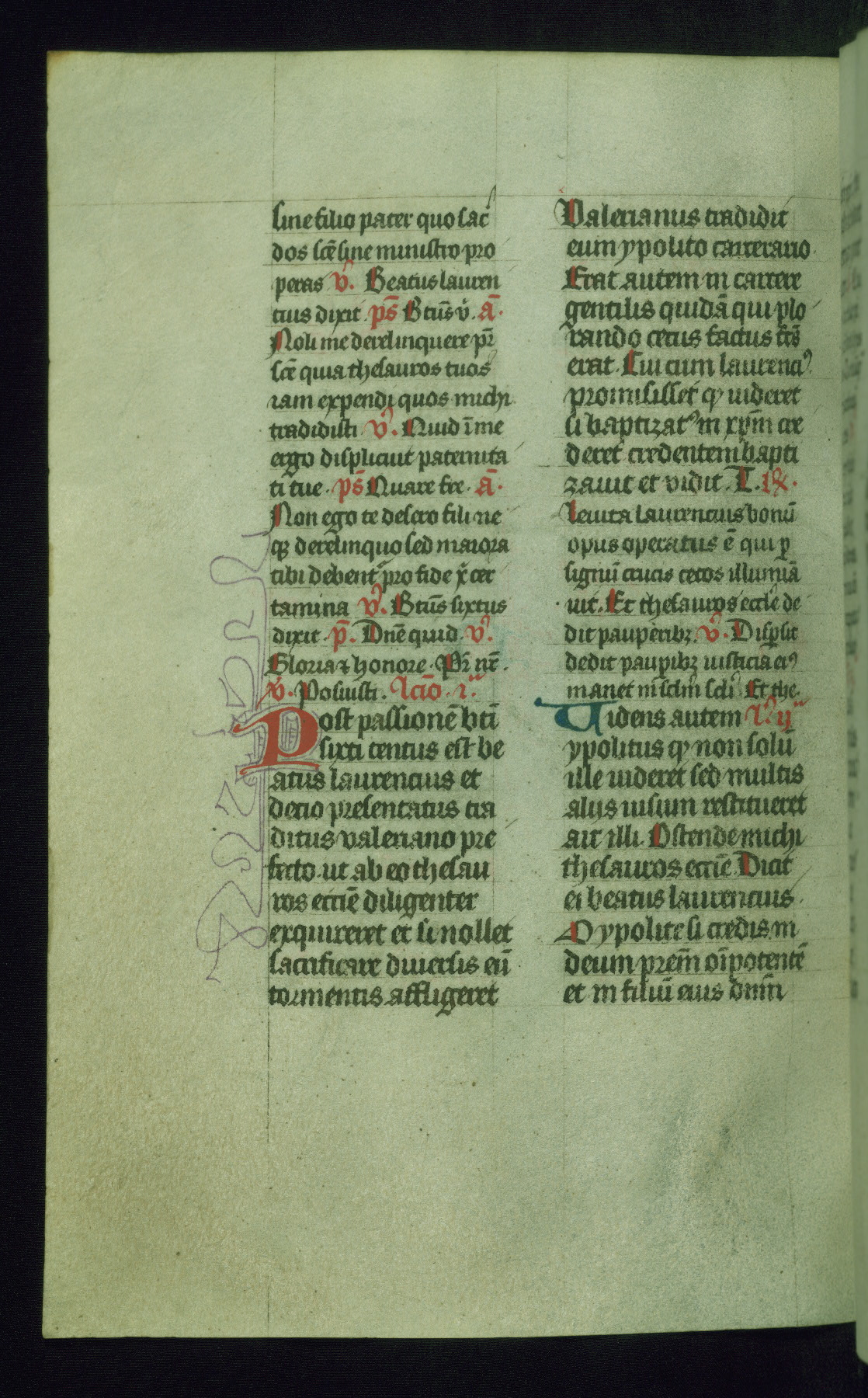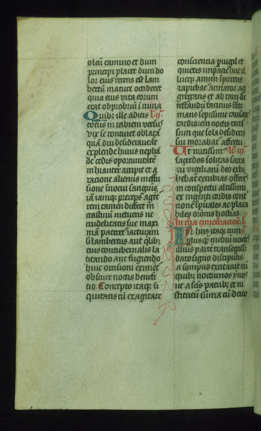 This small breviary, composed of more than 500 folios, is extraordinary for its length, considering it is the summer portion of a two-volume breviary for the use of Liège. The manuscript was completed for ecclesiastical use at the Cathedral of Notre-Dame and St.-Lambert in Liège ca. 1420. This attribution is suggested, for instance, by the petitions to the congregation of this cathedral (fols. 114v-117v), as well as the armorial shield of the family of Surlet de Chokier of Liège represented at the opening of the Psalms. The manuscript has modest, but interesting, decoration with historiated and decorated initials marking the liturgical texts, and occasional angels playing instruments in the margins. The most notable pictorial effect is found in the initials inhabited by transparent figures on rich blue ground. The technique is found, for instance, on fol. 156r with the gold monstrance held by translucent angels for the feast of the Corpus Christi.