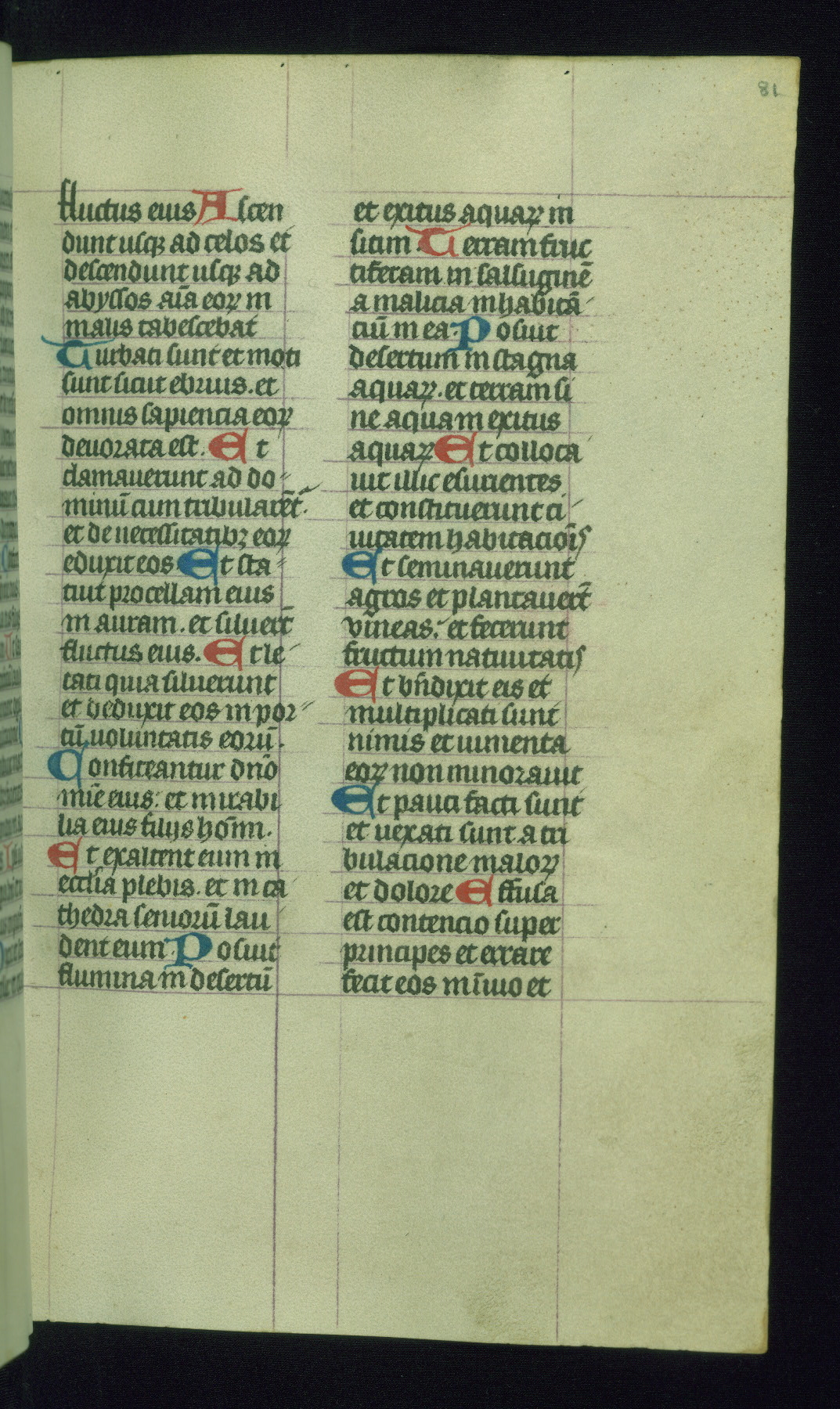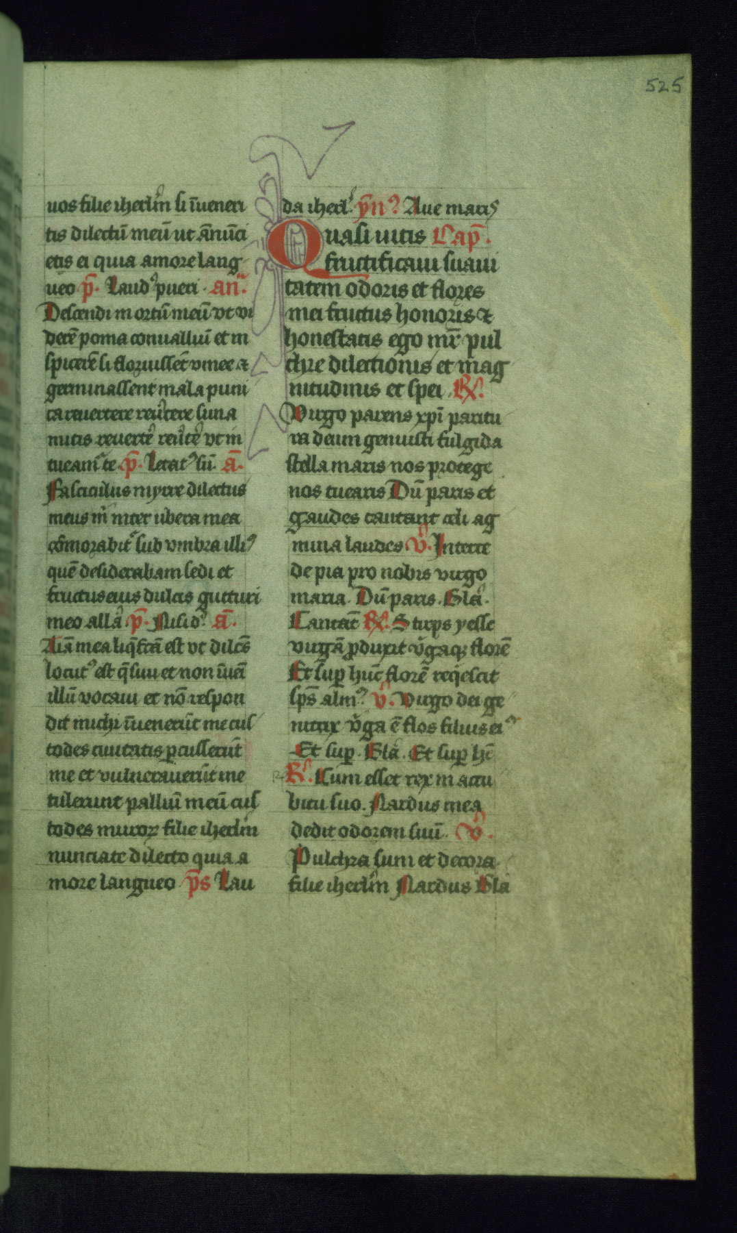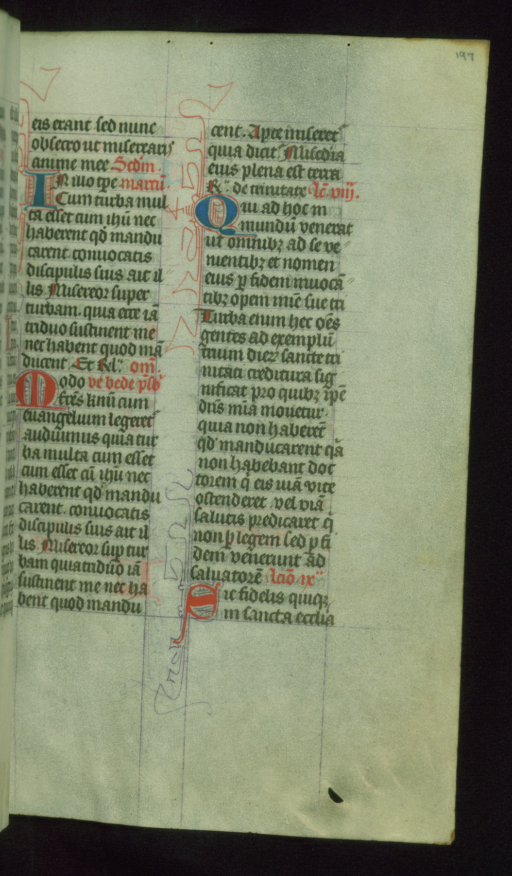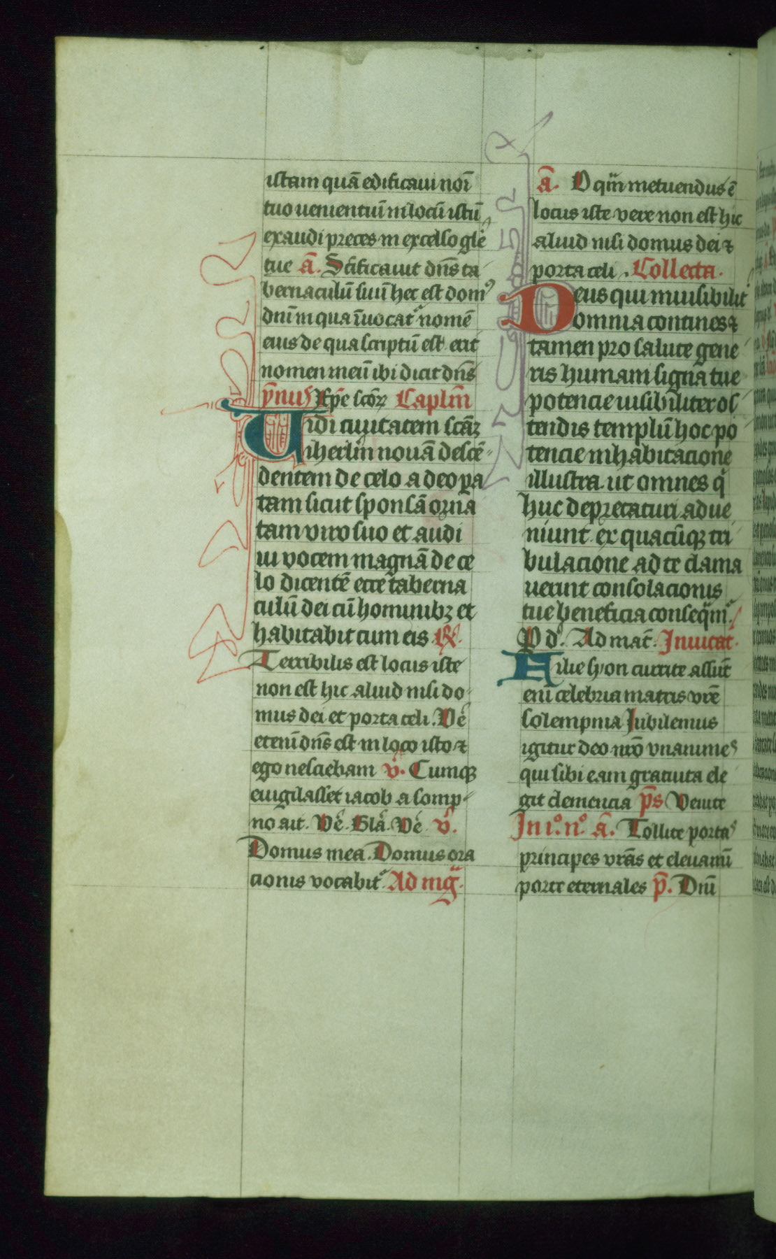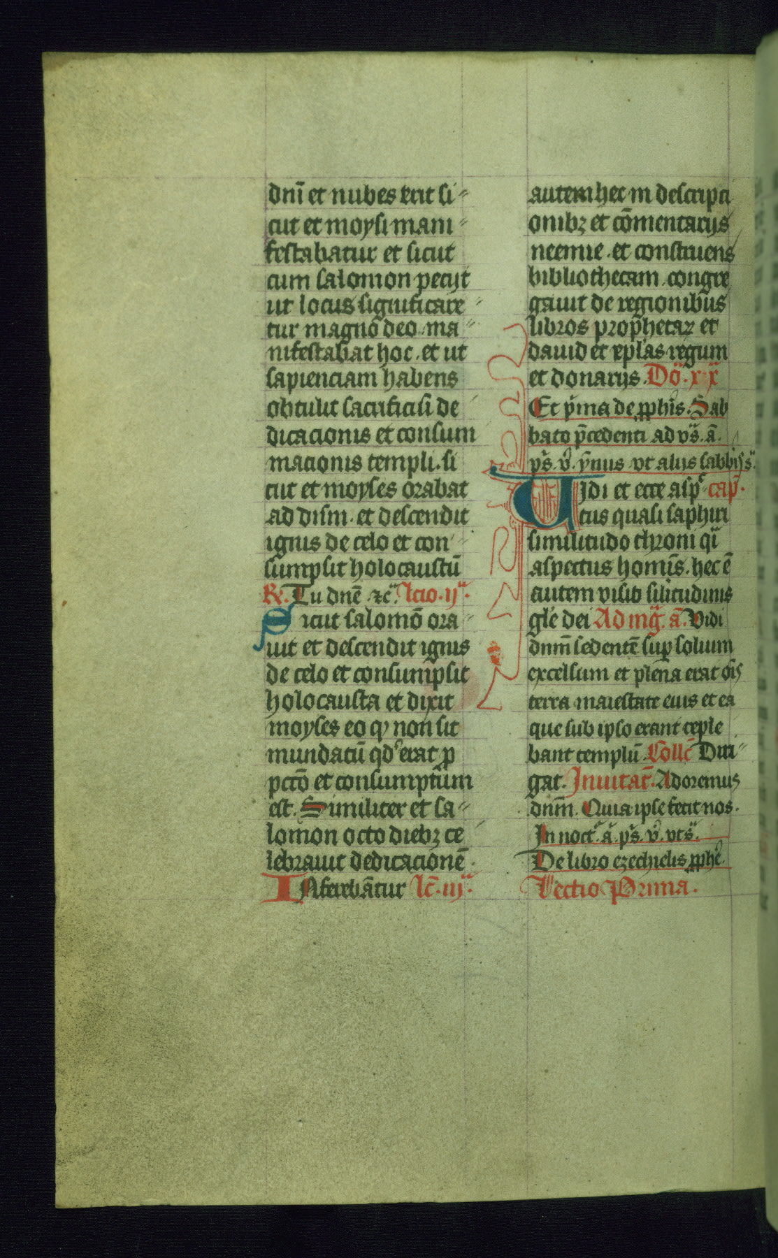 This small breviary, composed of more than 500 folios, is extraordinary for its length, considering it is the summer portion of a two-volume breviary for the use of Liège. The manuscript was completed for ecclesiastical use at the Cathedral of Notre-Dame and St.-Lambert in Liège ca. 1420. This attribution is suggested, for instance, by the petitions to the congregation of this cathedral (fols. 114v-117v), as well as the armorial shield of the family of Surlet de Chokier of Liège represented at the opening of the Psalms. The manuscript has modest, but interesting, decoration with historiated and decorated initials marking the liturgical texts, and occasional angels playing instruments in the margins. The most notable pictorial effect is found in the initials inhabited by transparent figures on rich blue ground. The technique is found, for instance, on fol. 156r with the gold monstrance held by translucent angels for the feast of the Corpus Christi.