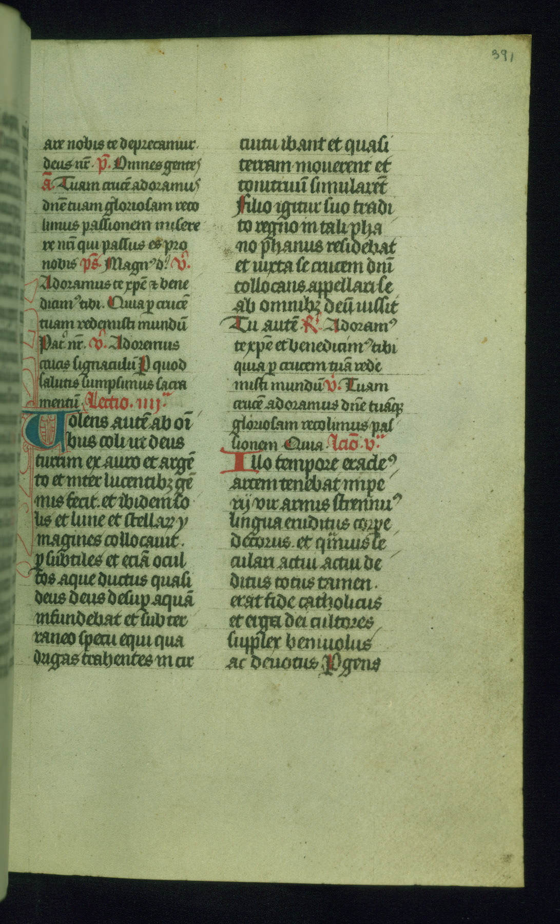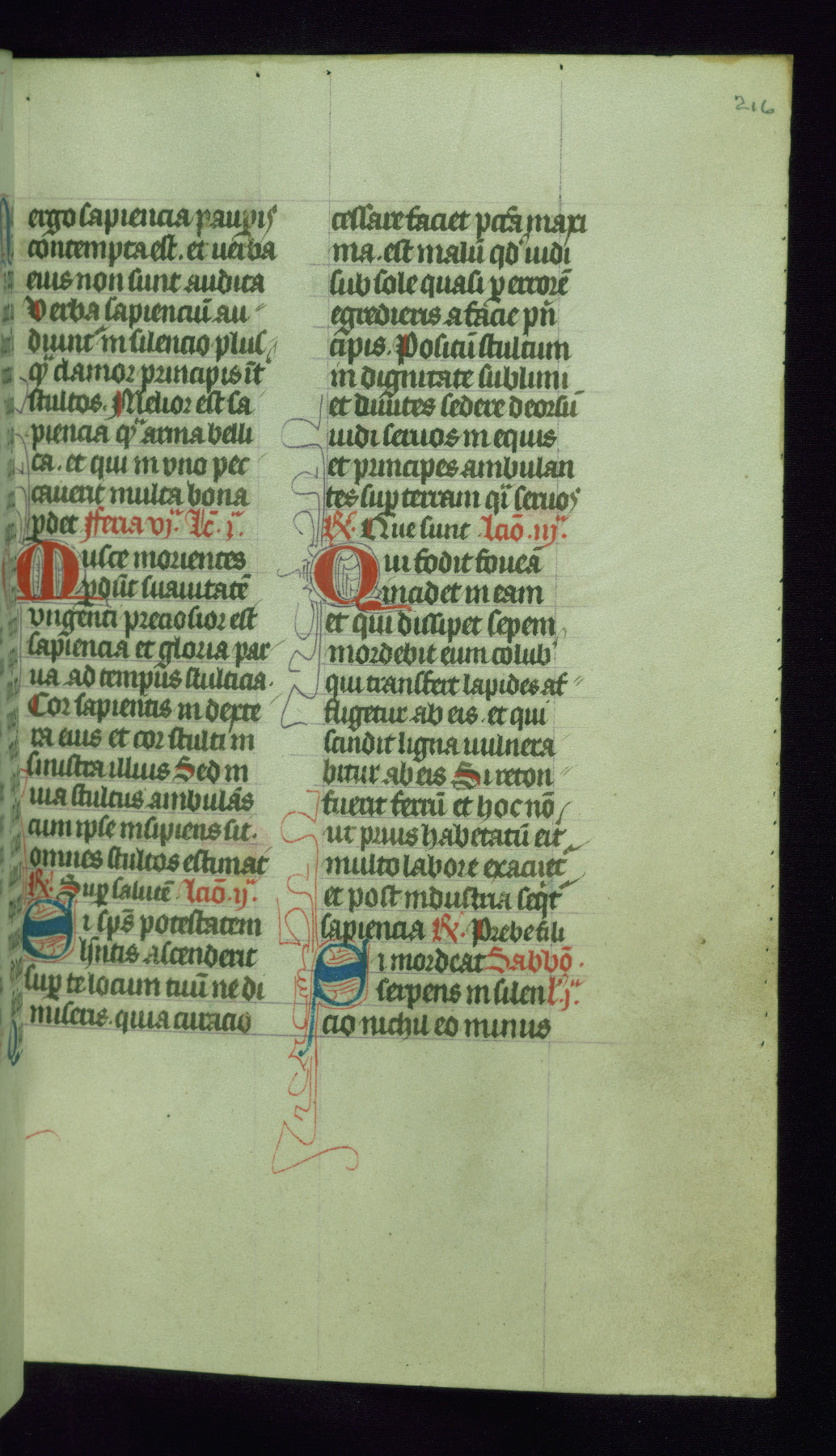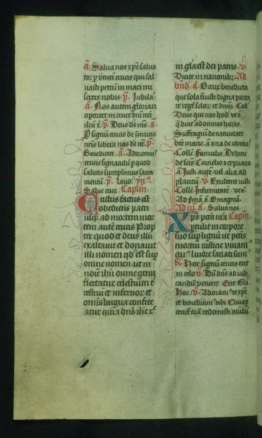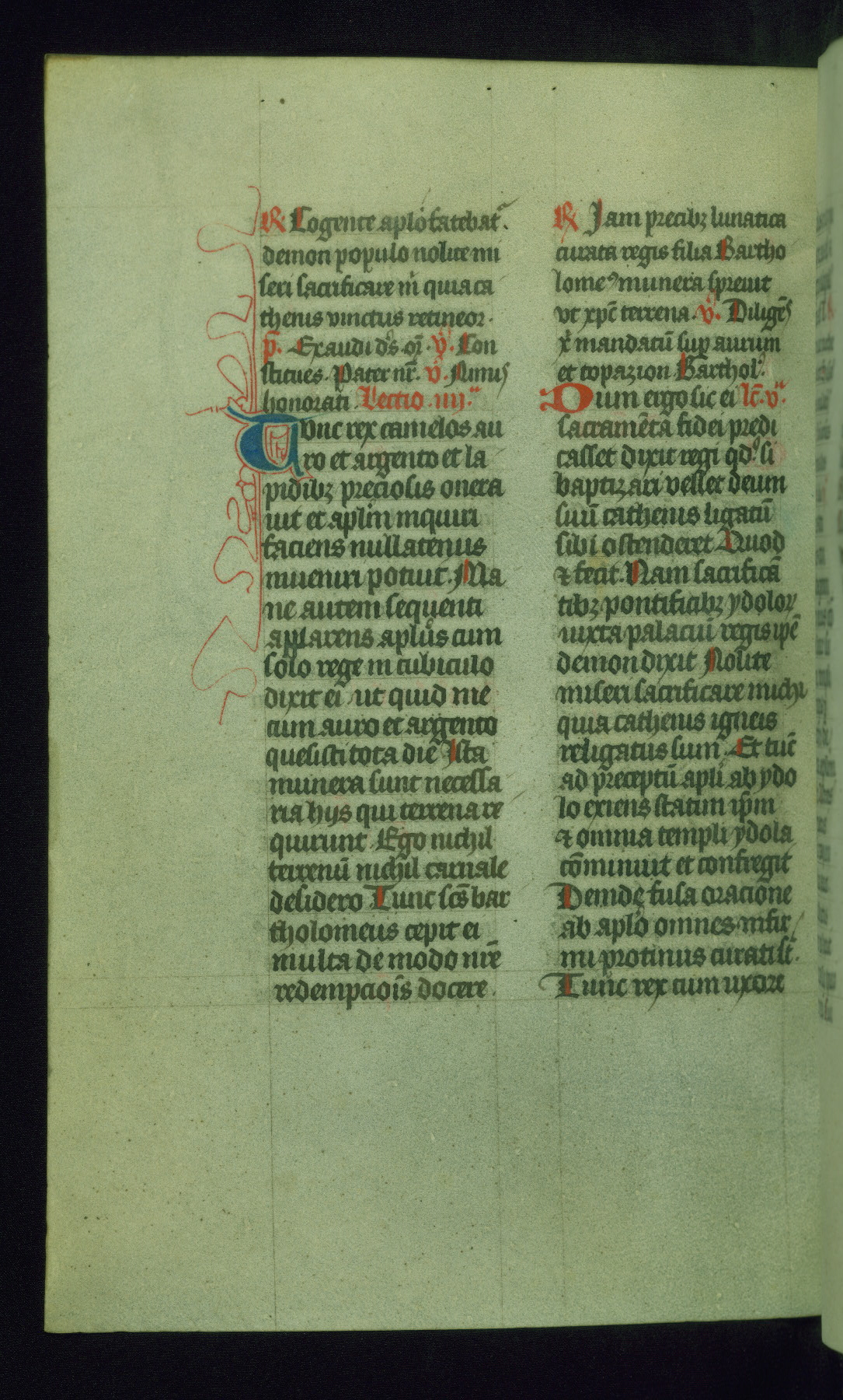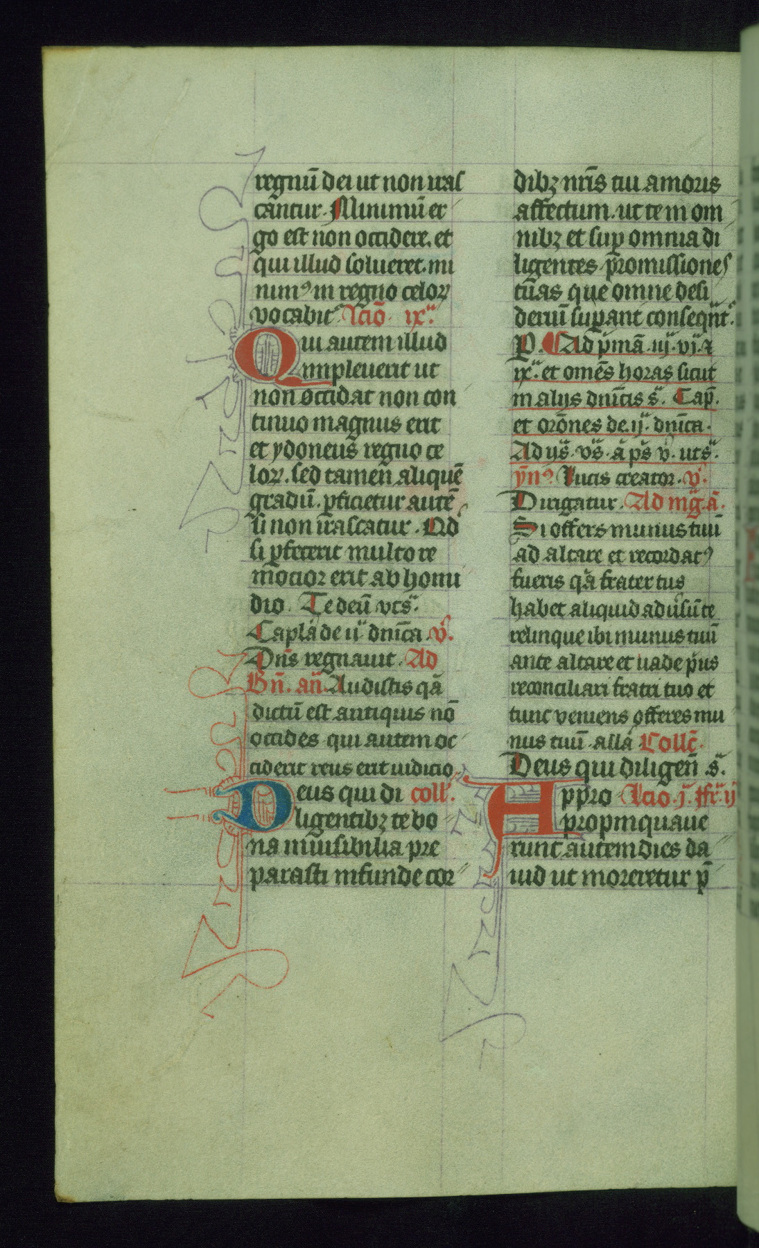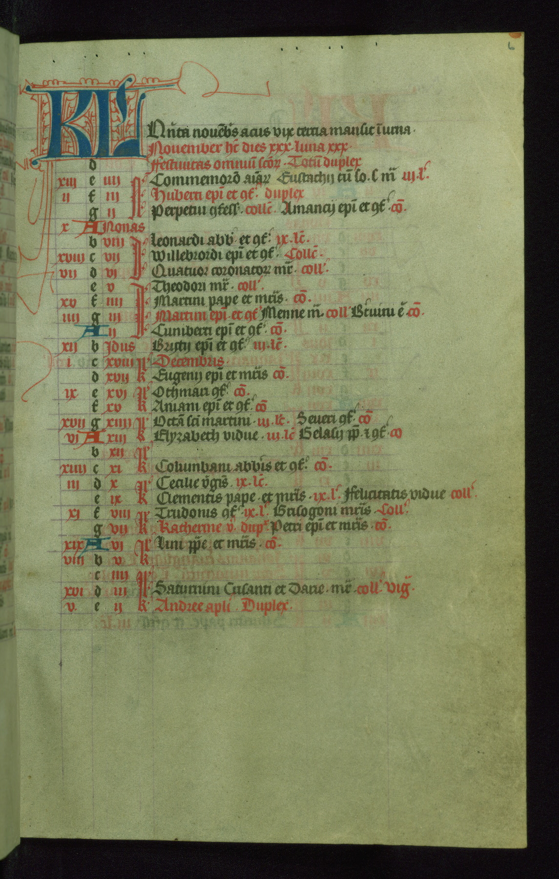 This small breviary, composed of more than 500 folios, is extraordinary for its length, considering it is the summer portion of a two-volume breviary for the use of Liège. The manuscript was completed for ecclesiastical use at the Cathedral of Notre-Dame and St.-Lambert in Liège ca. 1420. This attribution is suggested, for instance, by the petitions to the congregation of this cathedral (fols. 114v-117v), as well as the armorial shield of the family of Surlet de Chokier of Liège represented at the opening of the Psalms. The manuscript has modest, but interesting, decoration with historiated and decorated initials marking the liturgical texts, and occasional angels playing instruments in the margins. The most notable pictorial effect is found in the initials inhabited by transparent figures on rich blue ground. The technique is found, for instance, on fol. 156r with the gold monstrance held by translucent angels for the feast of the Corpus Christi.