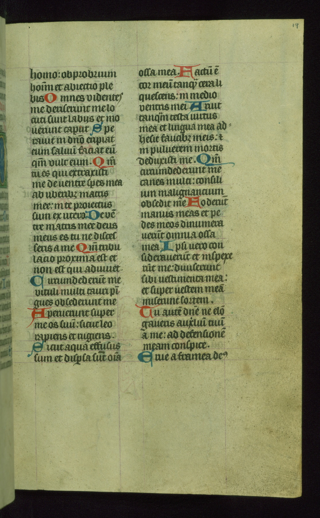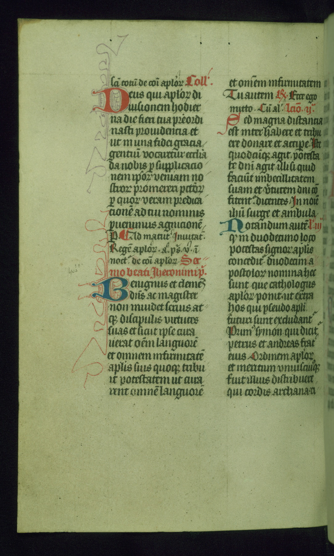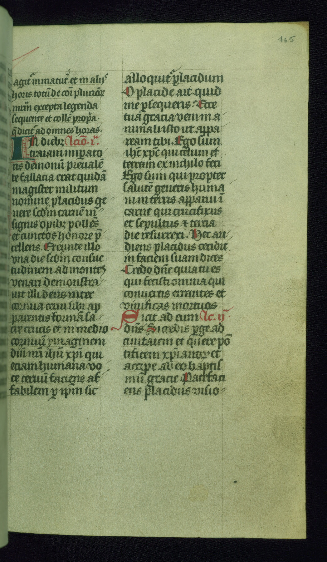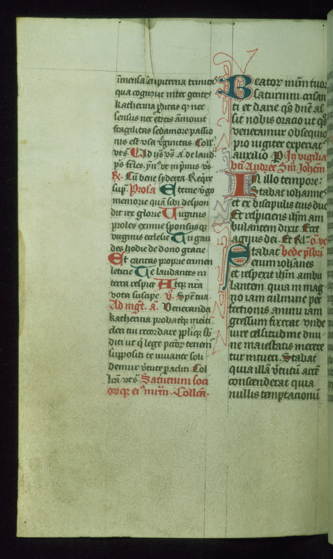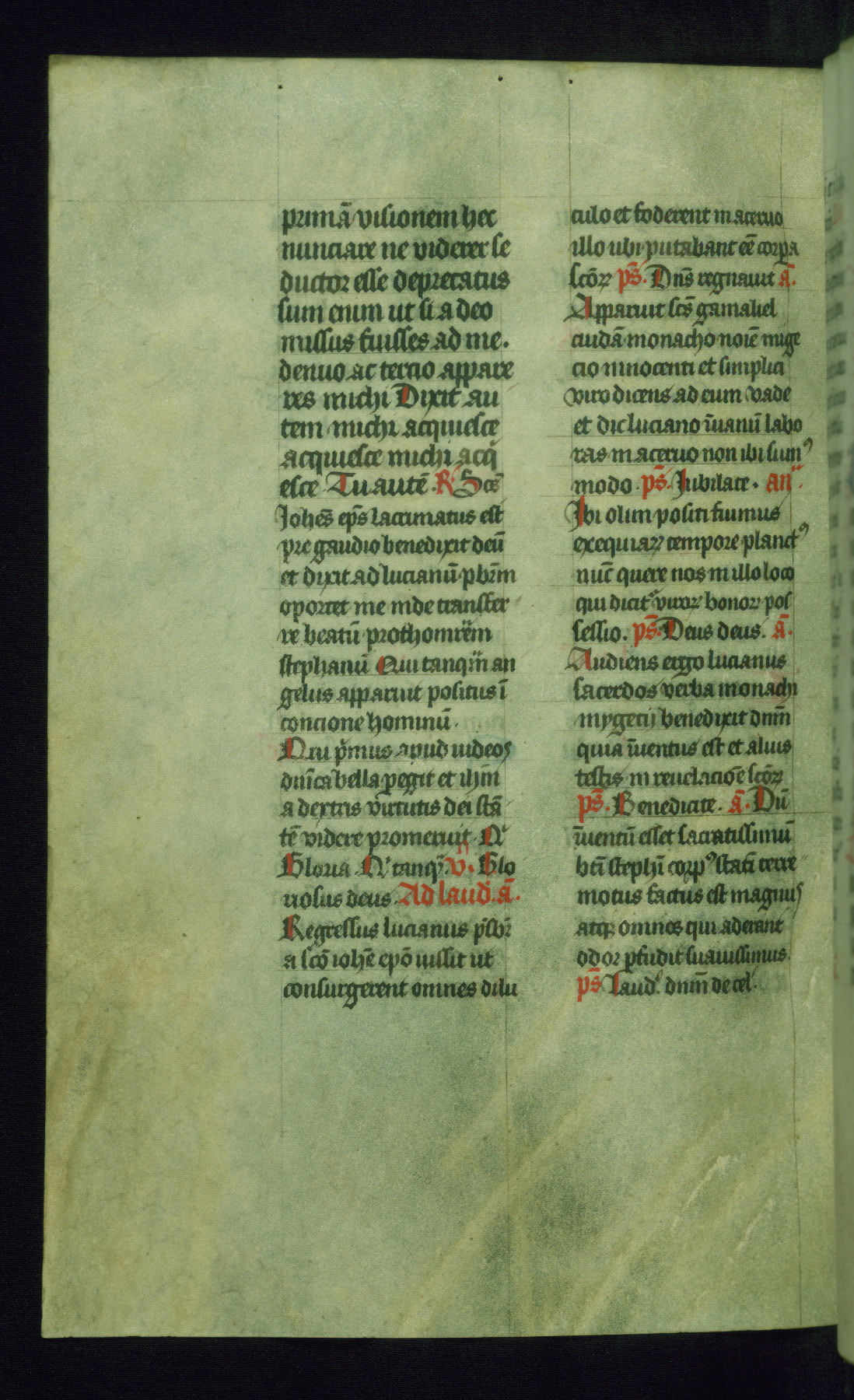 This small breviary, composed of more than 500 folios, is extraordinary for its length, considering it is the summer portion of a two-volume breviary for the use of Liège. The manuscript was completed for ecclesiastical use at the Cathedral of Notre-Dame and St.-Lambert in Liège ca. 1420. This attribution is suggested, for instance, by the petitions to the congregation of this cathedral (fols. 114v-117v), as well as the armorial shield of the family of Surlet de Chokier of Liège represented at the opening of the Psalms. The manuscript has modest, but interesting, decoration with historiated and decorated initials marking the liturgical texts, and occasional angels playing instruments in the margins. The most notable pictorial effect is found in the initials inhabited by transparent figures on rich blue ground. The technique is found, for instance, on fol. 156r with the gold monstrance held by translucent angels for the feast of the Corpus Christi.