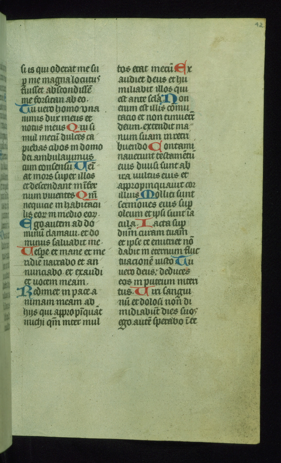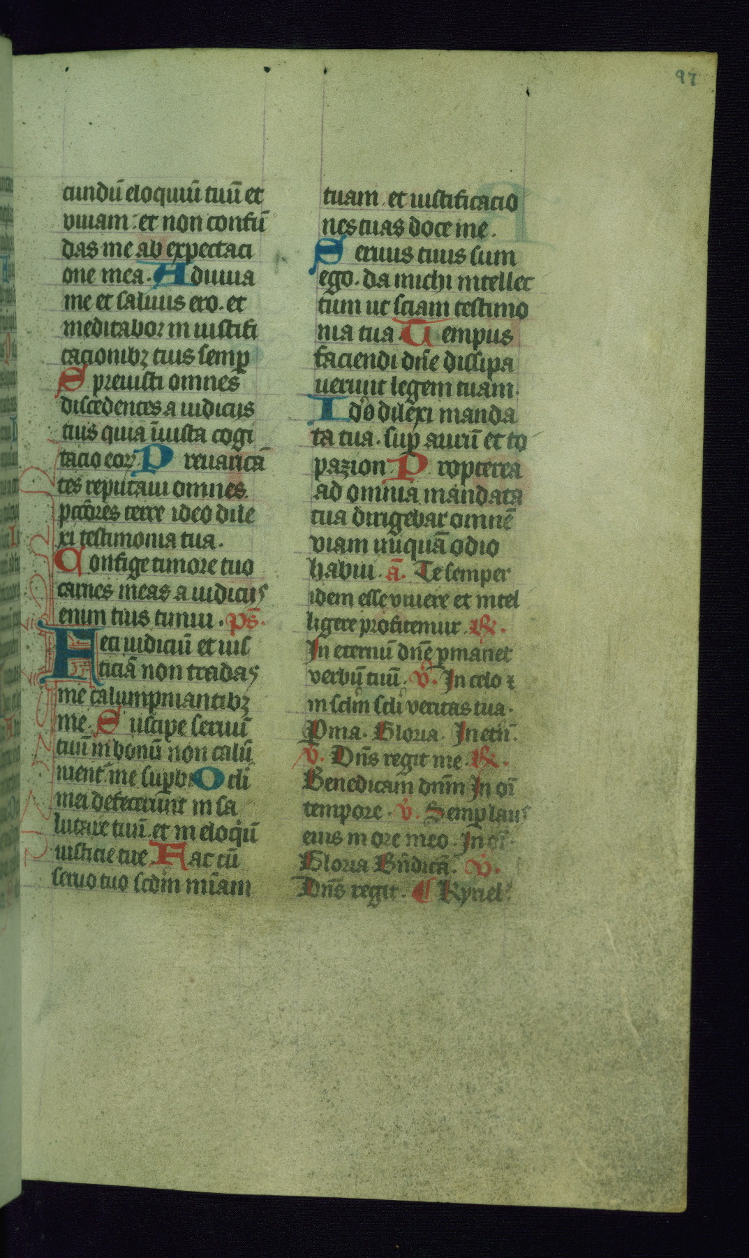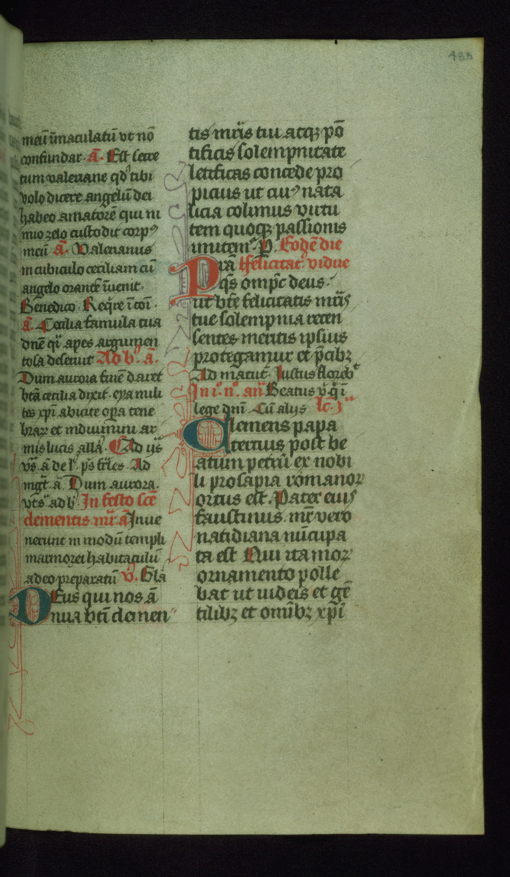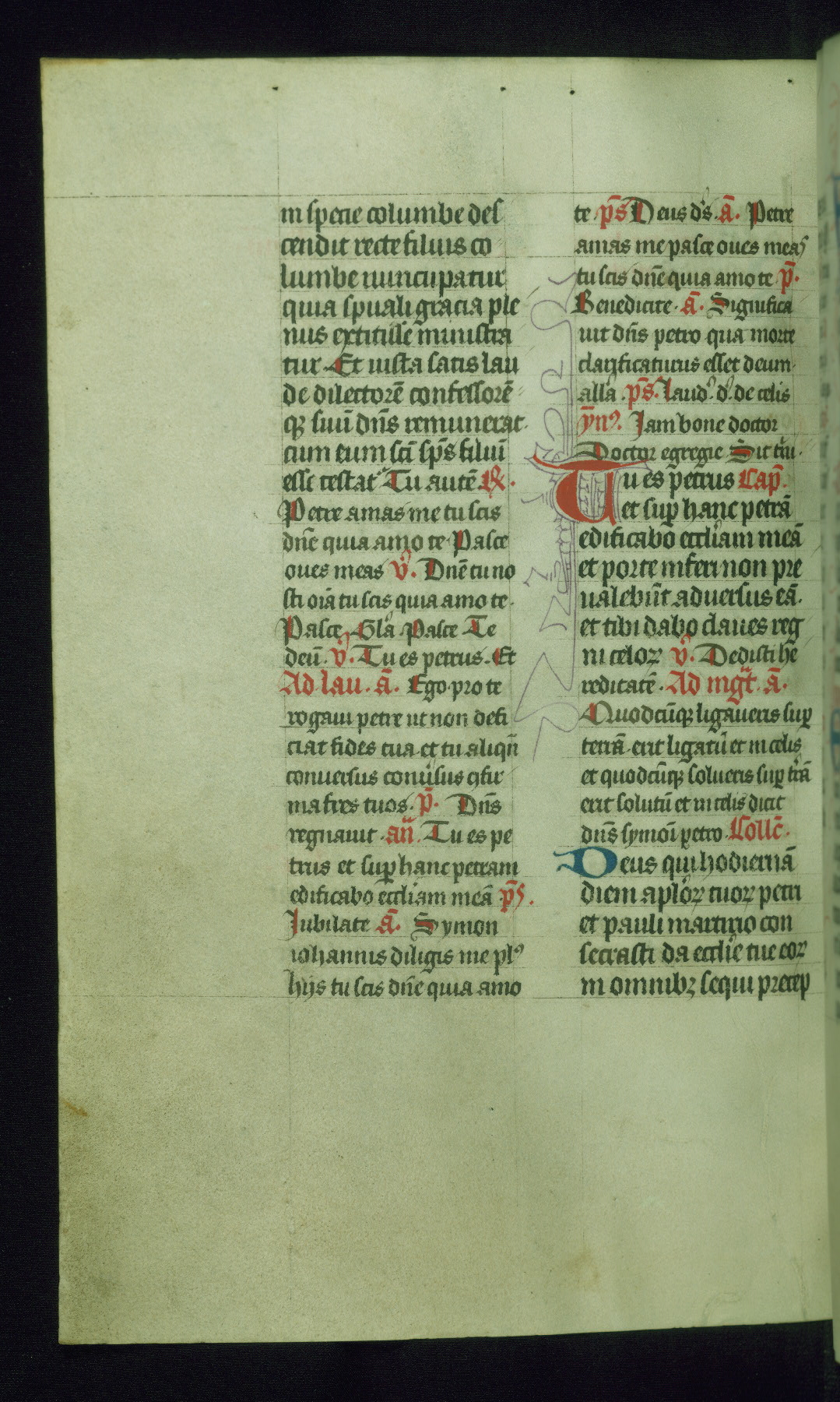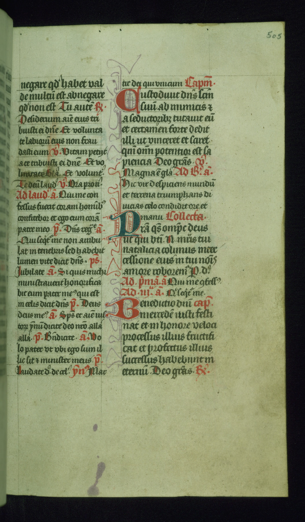This small breviary, composed of more than 500 folios, is extraordinary for its length, considering it is the summer portion of a two-volume breviary for the use of Liège. The manuscript was completed for ecclesiastical use at the Cathedral of Notre-Dame and St.-Lambert in Liège ca. 1420. This attribution is suggested, for instance, by the petitions to the congregation of this cathedral (fols. 114v-117v), as well as the armorial shield of the family of Surlet de Chokier of Liège represented at the opening of the Psalms. The manuscript has modest, but interesting, decoration with historiated and decorated initials marking the liturgical texts, and occasional angels playing instruments in the margins. The most notable pictorial effect is found in the initials inhabited by transparent figures on rich blue ground. The technique is found, for instance, on fol. 156r with the gold monstrance held by translucent angels for the feast of the Corpus Christi.