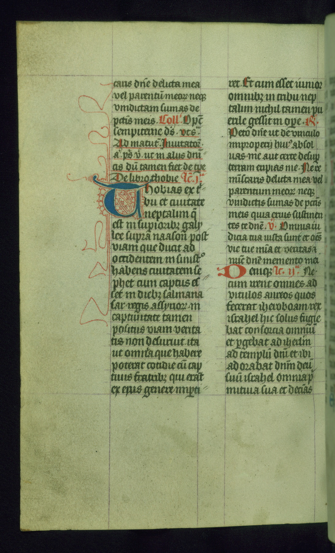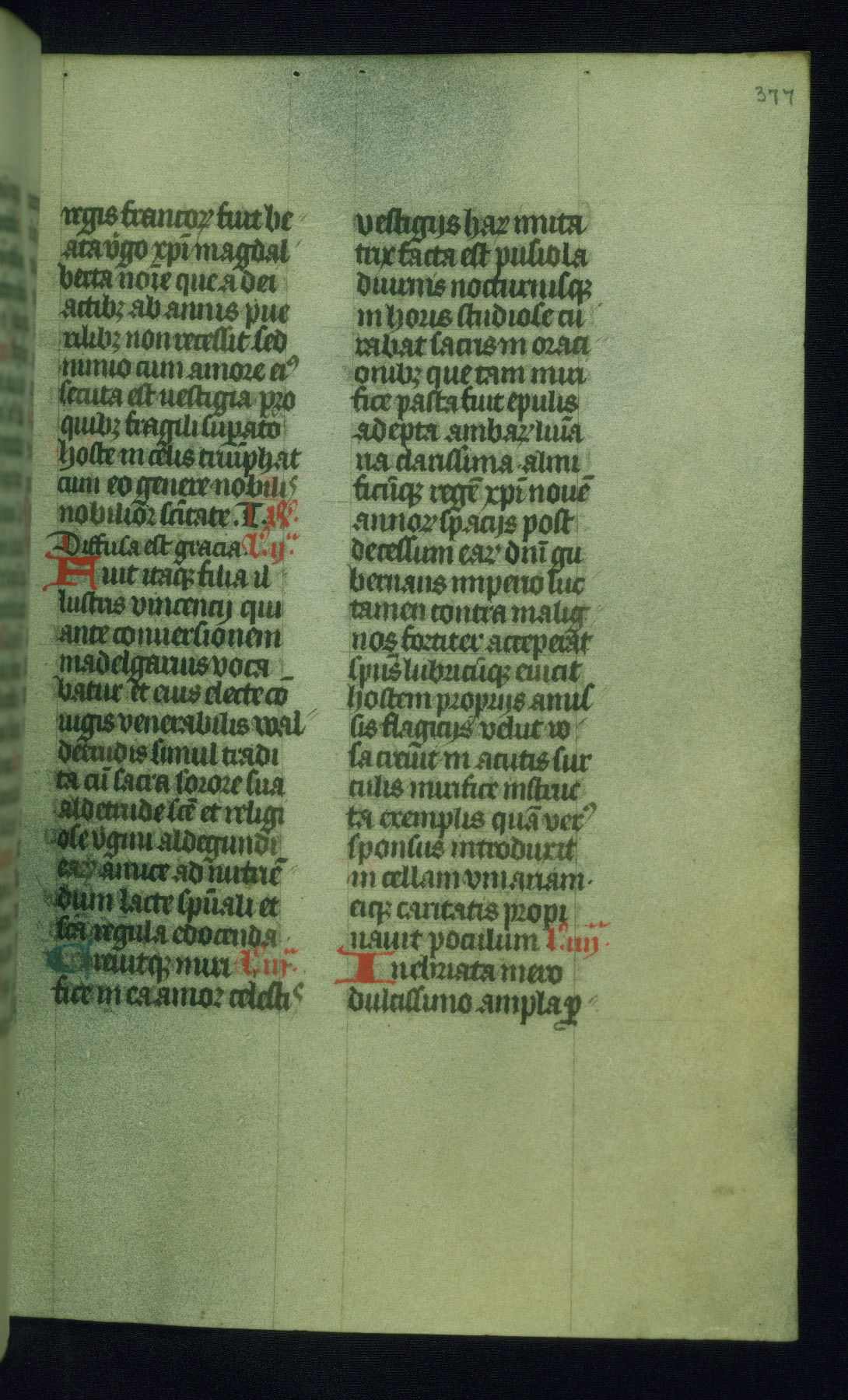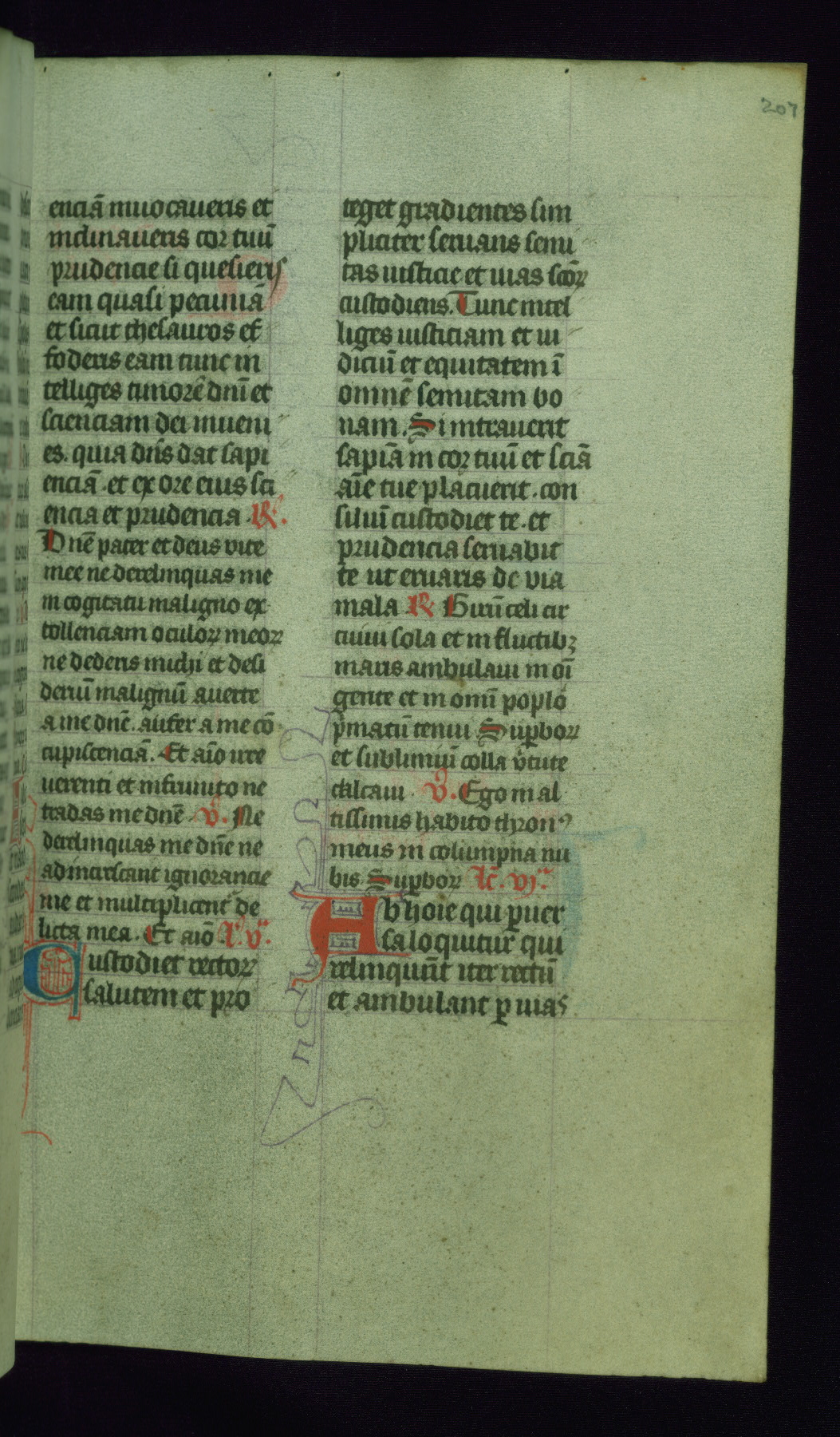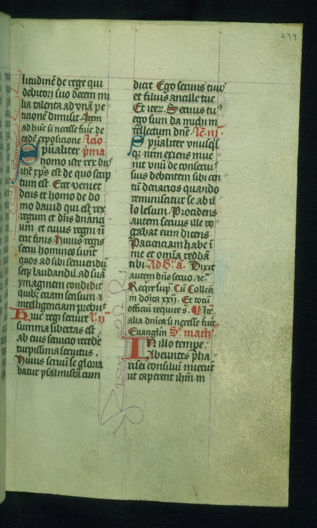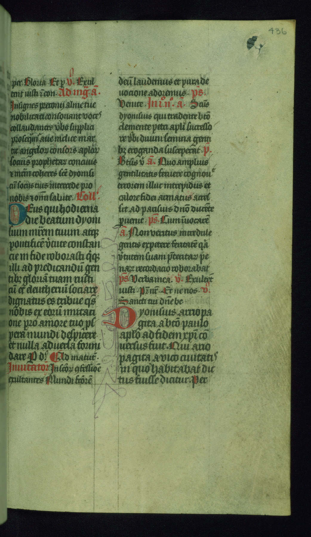 This small breviary, composed of more than 500 folios, is extraordinary for its length, considering it is the summer portion of a two-volume breviary for the use of Liège. The manuscript was completed for ecclesiastical use at the Cathedral of Notre-Dame and St.-Lambert in Liège ca. 1420. This attribution is suggested, for instance, by the petitions to the congregation of this cathedral (fols. 114v-117v), as well as the armorial shield of the family of Surlet de Chokier of Liège represented at the opening of the Psalms. The manuscript has modest, but interesting, decoration with historiated and decorated initials marking the liturgical texts, and occasional angels playing instruments in the margins. The most notable pictorial effect is found in the initials inhabited by transparent figures on rich blue ground. The technique is found, for instance, on fol. 156r with the gold monstrance held by translucent angels for the feast of the Corpus Christi.