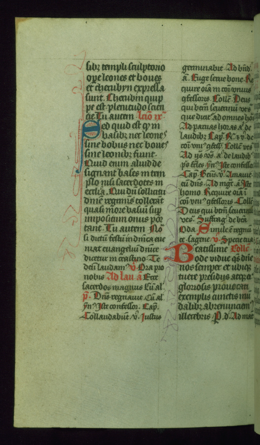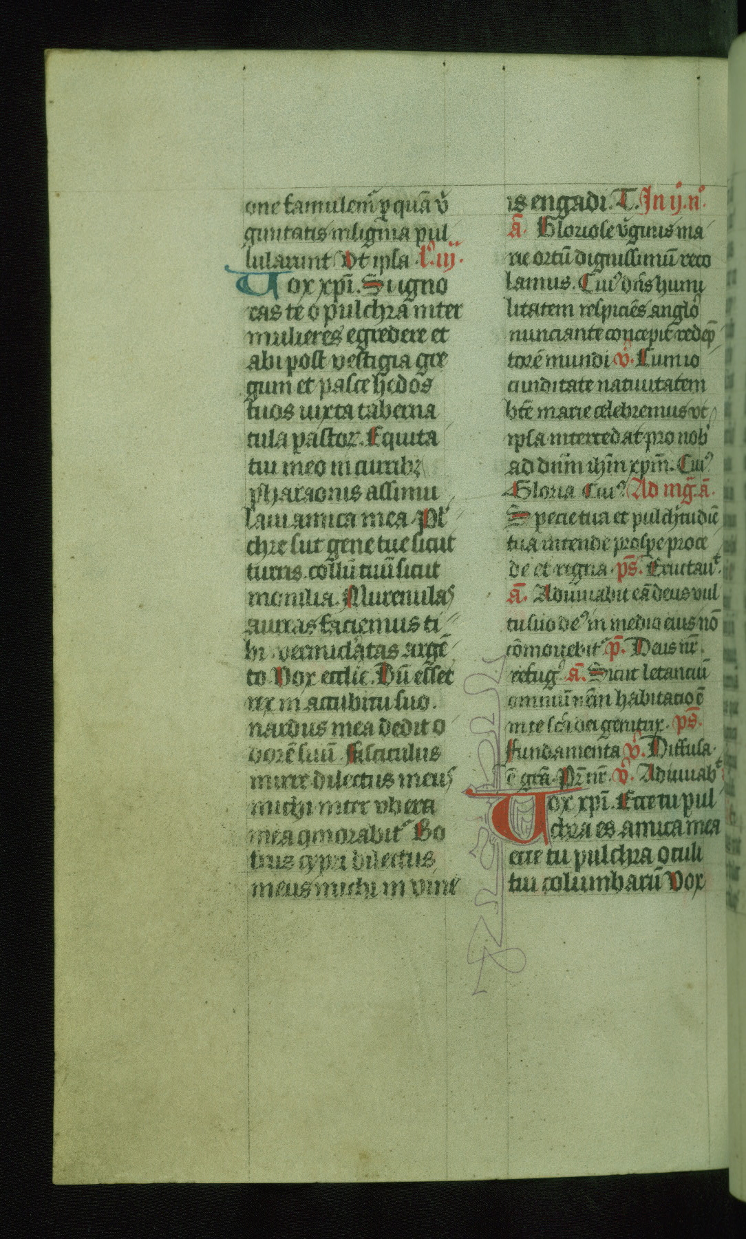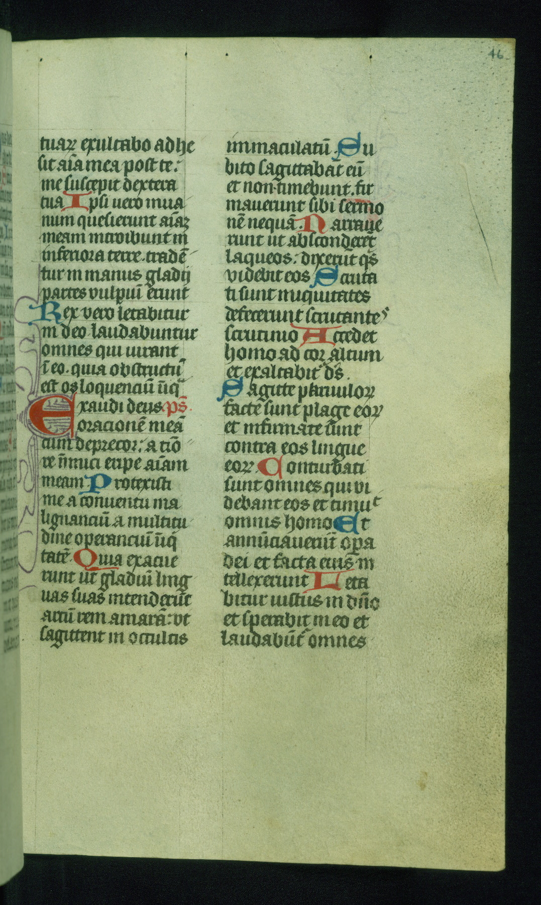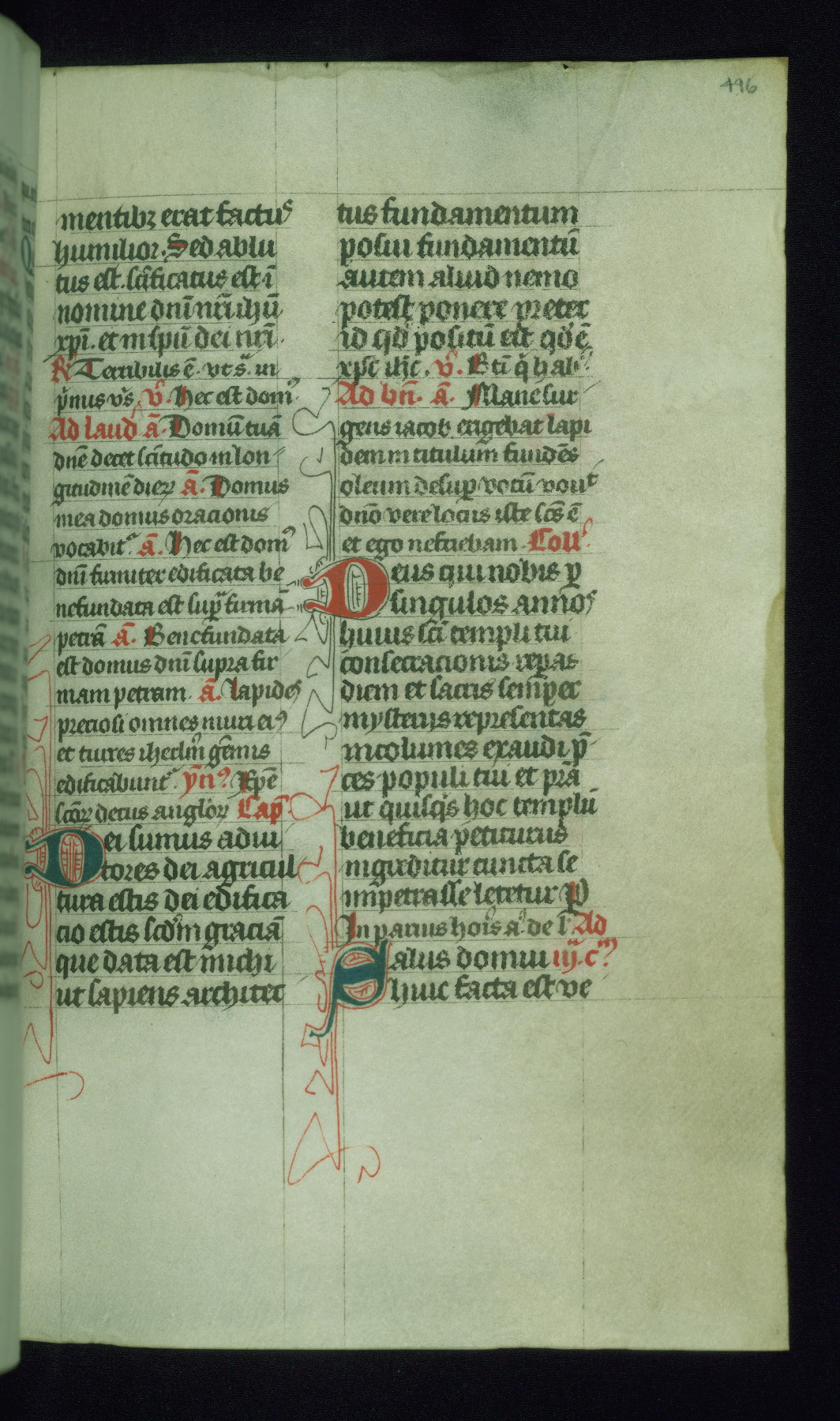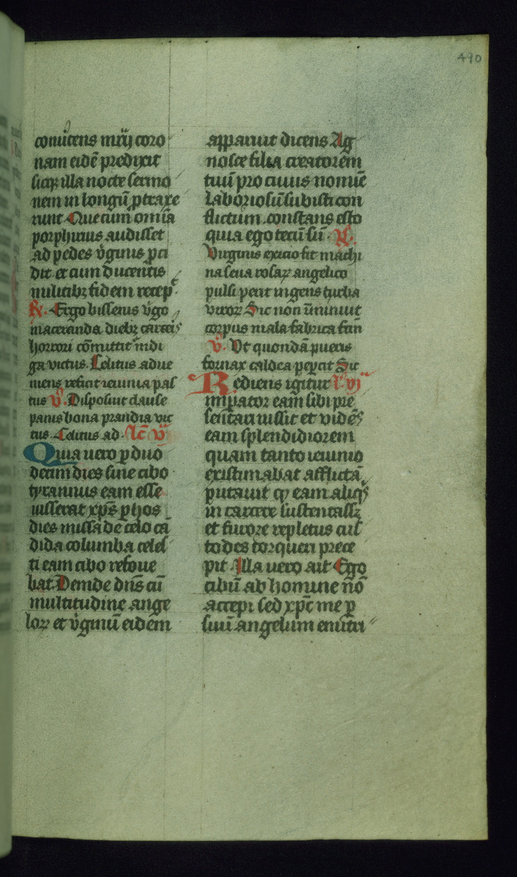 This small breviary, composed of more than 500 folios, is extraordinary for its length, considering it is the summer portion of a two-volume breviary for the use of Liège. The manuscript was completed for ecclesiastical use at the Cathedral of Notre-Dame and St.-Lambert in Liège ca. 1420. This attribution is suggested, for instance, by the petitions to the congregation of this cathedral (fols. 114v-117v), as well as the armorial shield of the family of Surlet de Chokier of Liège represented at the opening of the Psalms. The manuscript has modest, but interesting, decoration with historiated and decorated initials marking the liturgical texts, and occasional angels playing instruments in the margins. The most notable pictorial effect is found in the initials inhabited by transparent figures on rich blue ground. The technique is found, for instance, on fol. 156r with the gold monstrance held by translucent angels for the feast of the Corpus Christi.