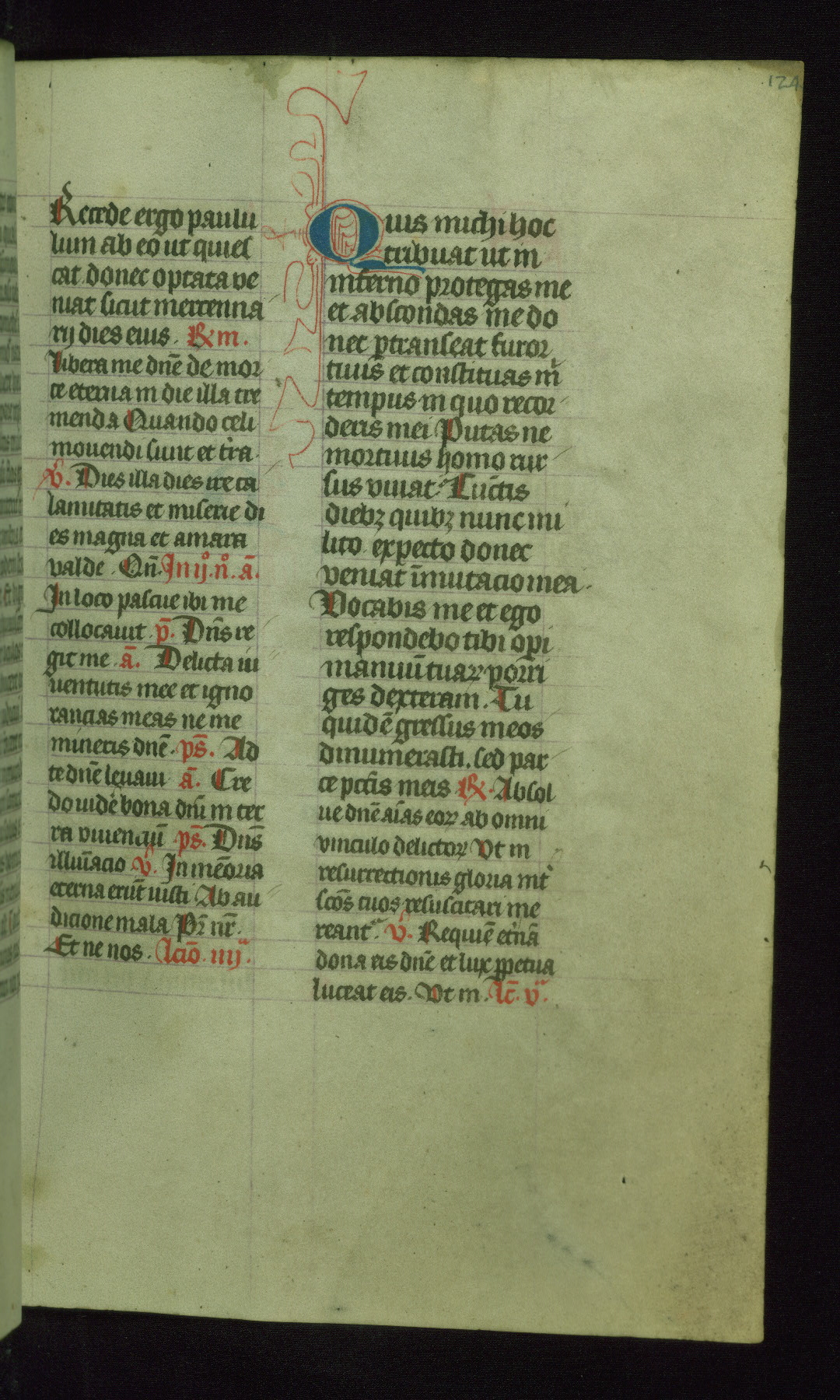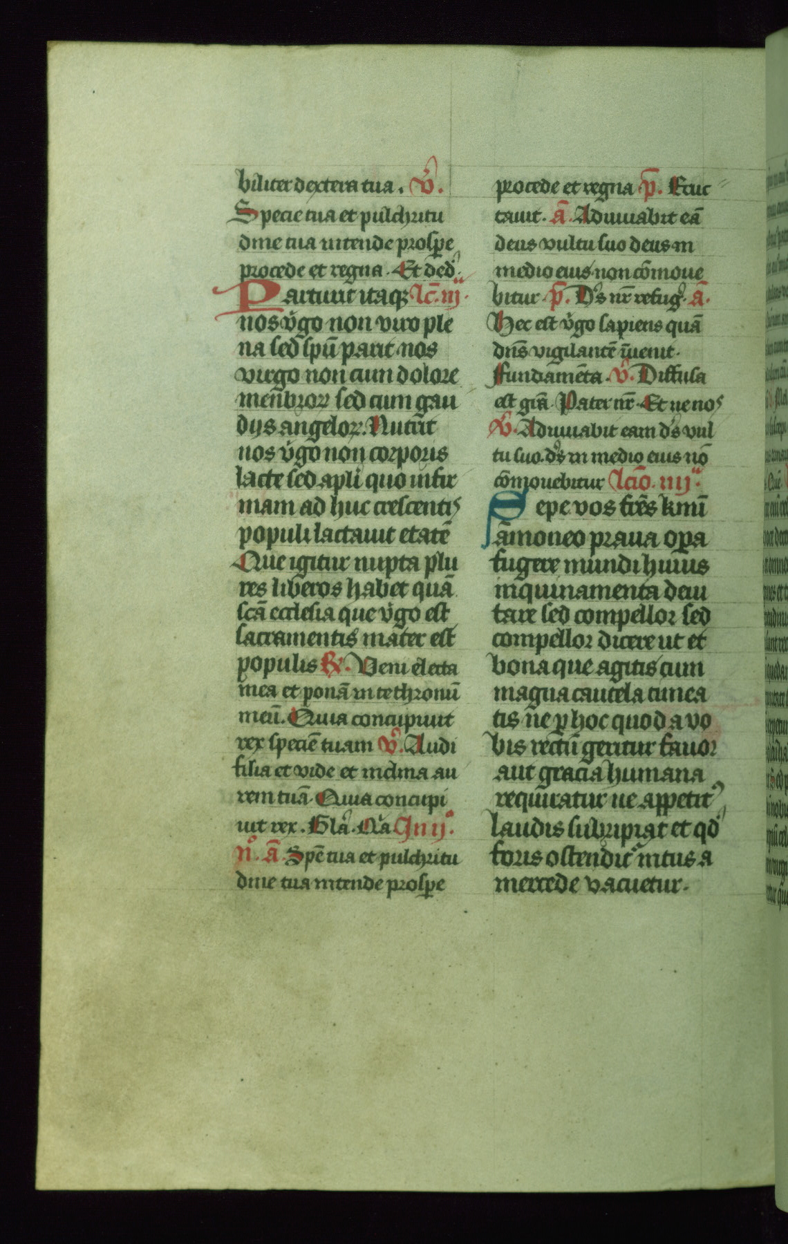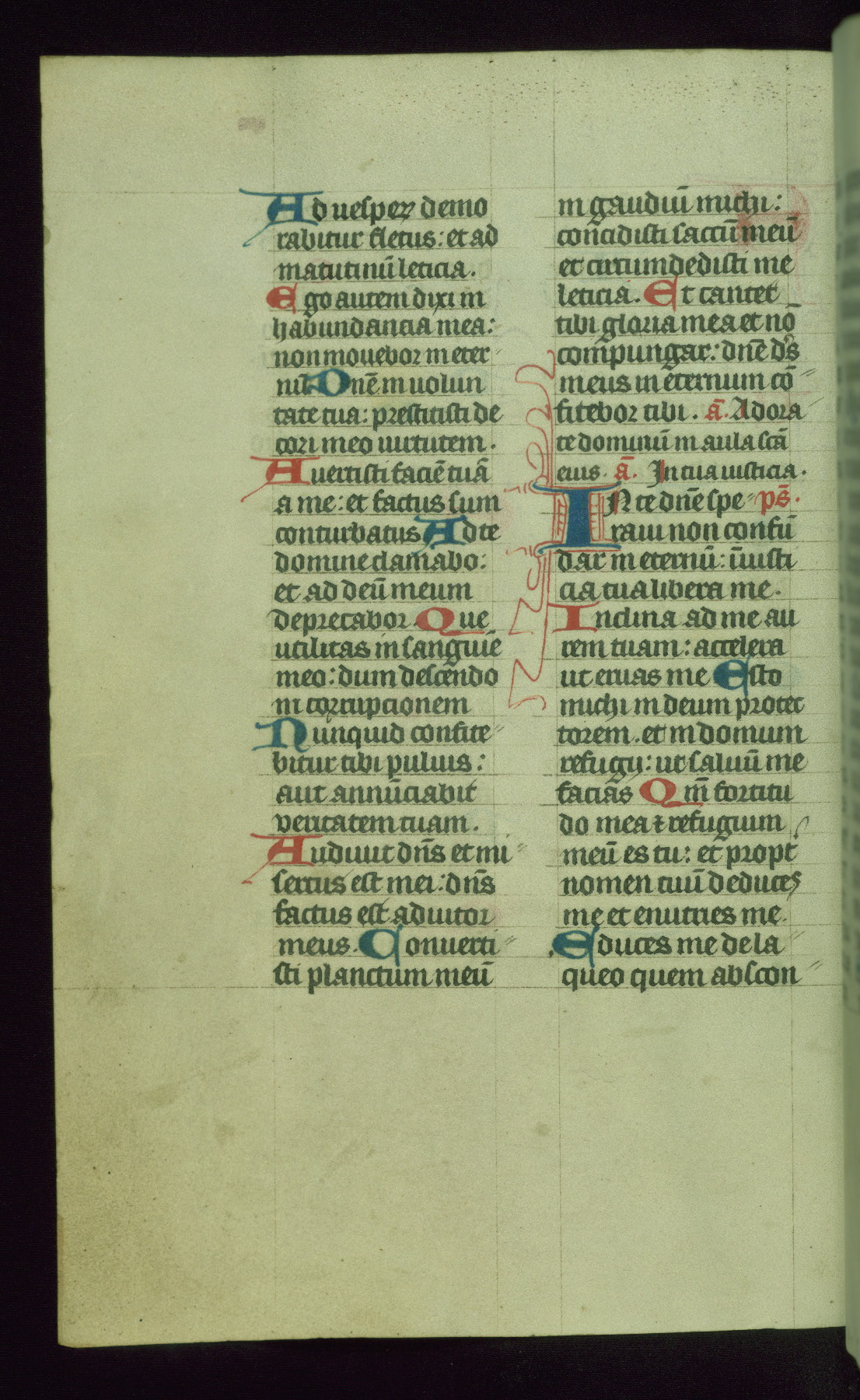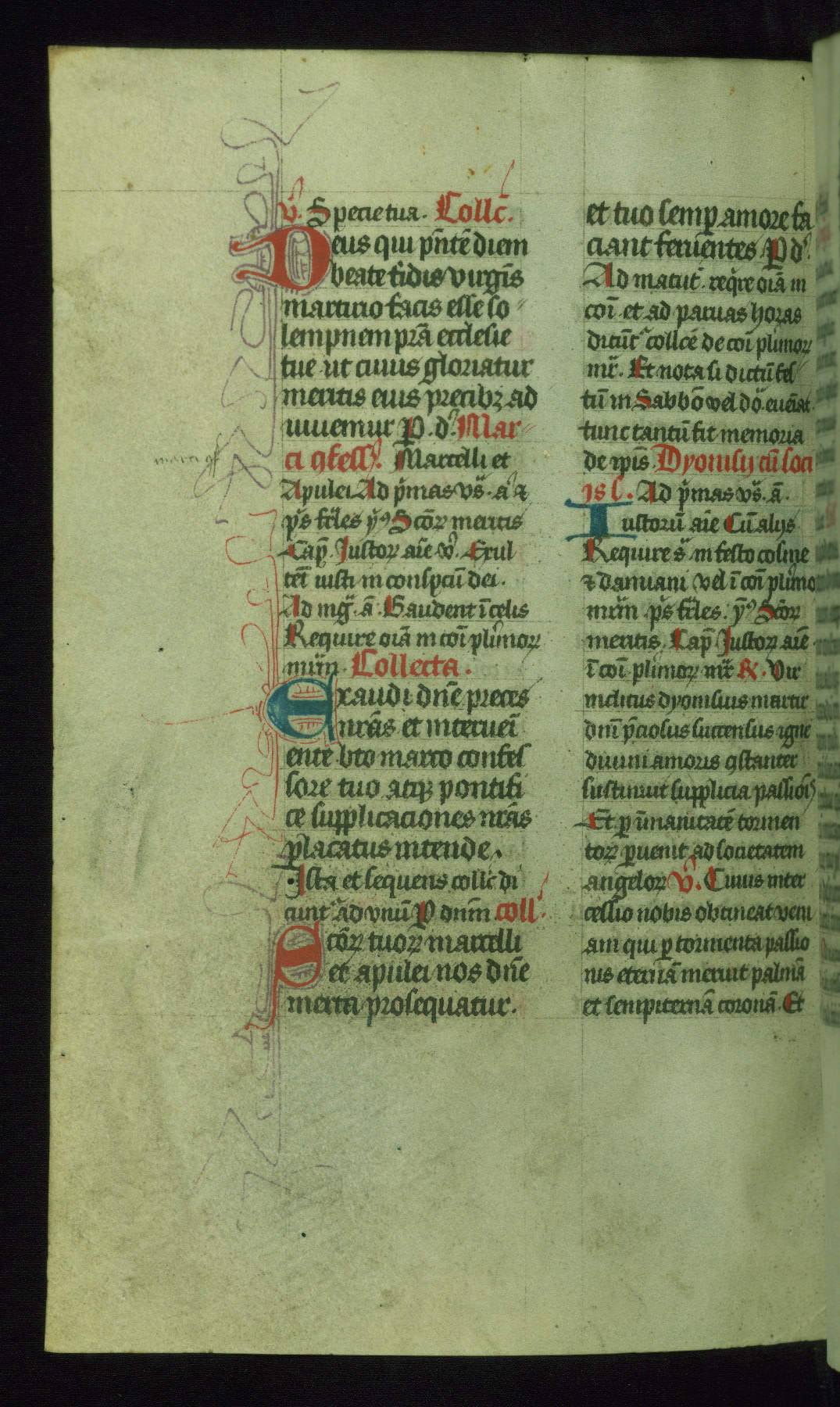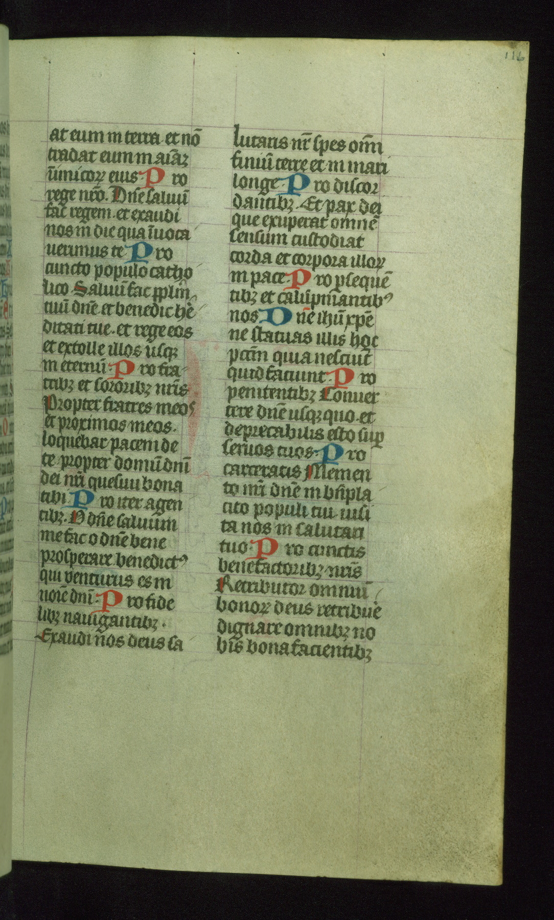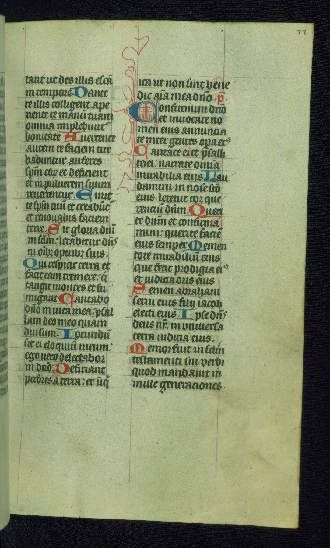 This small breviary, composed of more than 500 folios, is extraordinary for its length, considering it is the summer portion of a two-volume breviary for the use of Liège. The manuscript was completed for ecclesiastical use at the Cathedral of Notre-Dame and St.-Lambert in Liège ca. 1420. This attribution is suggested, for instance, by the petitions to the congregation of this cathedral (fols. 114v-117v), as well as the armorial shield of the family of Surlet de Chokier of Liège represented at the opening of the Psalms. The manuscript has modest, but interesting, decoration with historiated and decorated initials marking the liturgical texts, and occasional angels playing instruments in the margins. The most notable pictorial effect is found in the initials inhabited by transparent figures on rich blue ground. The technique is found, for instance, on fol. 156r with the gold monstrance held by translucent angels for the feast of the Corpus Christi.