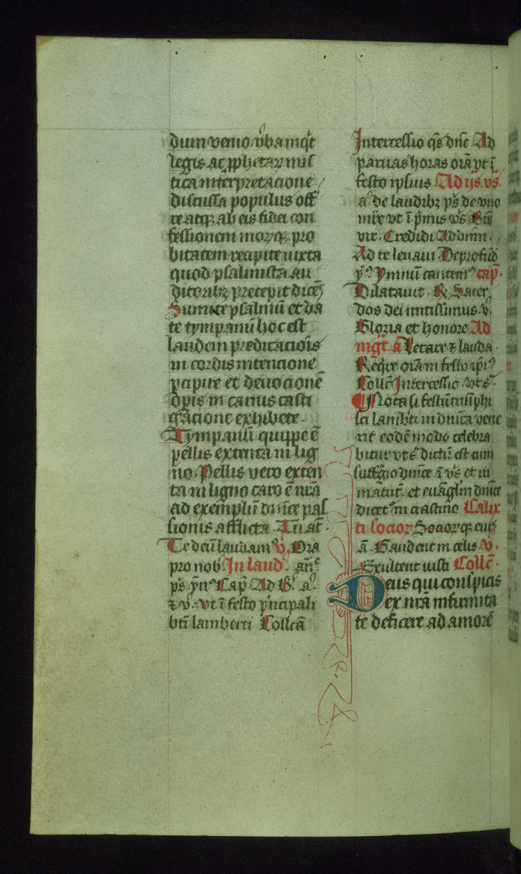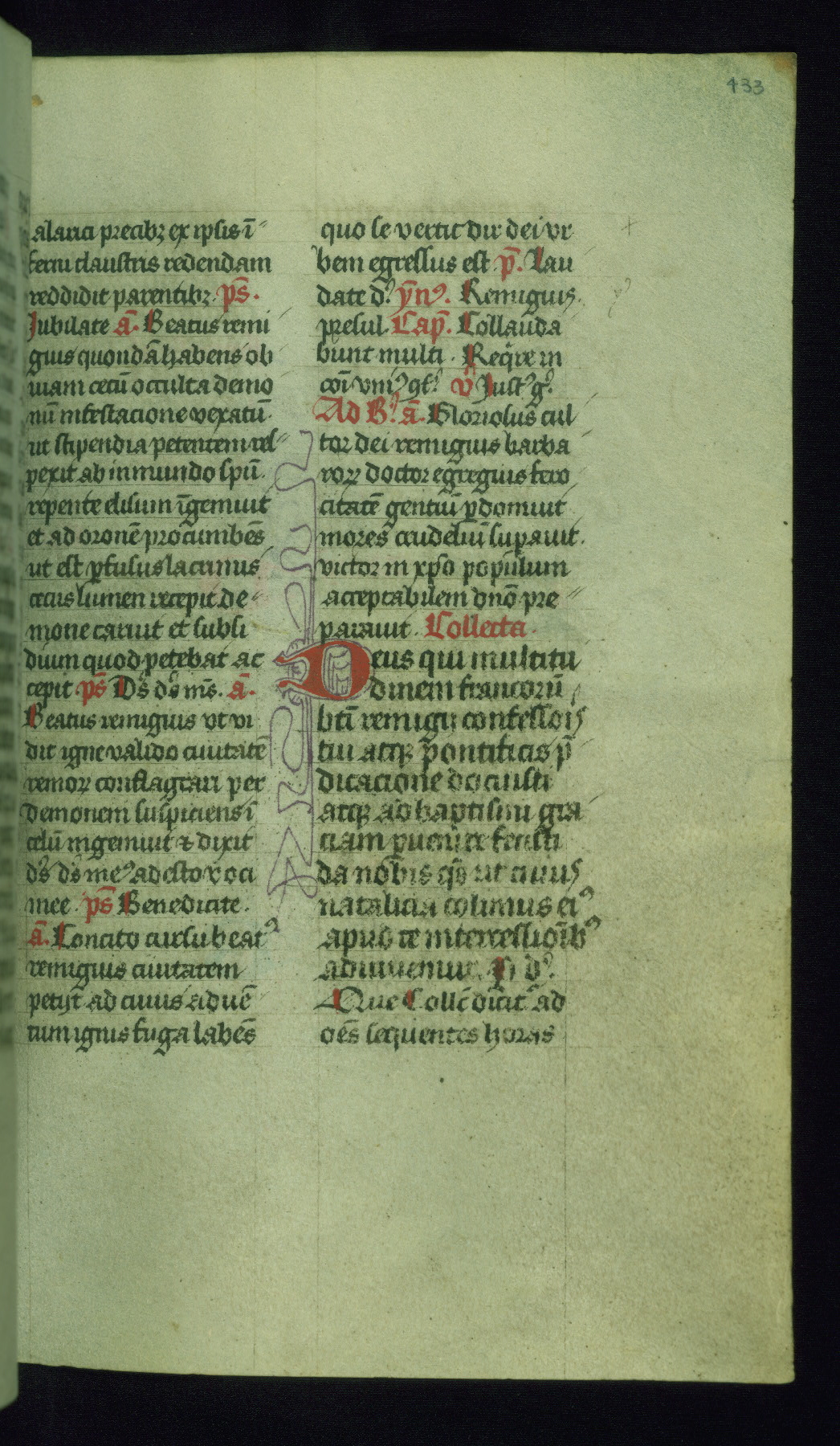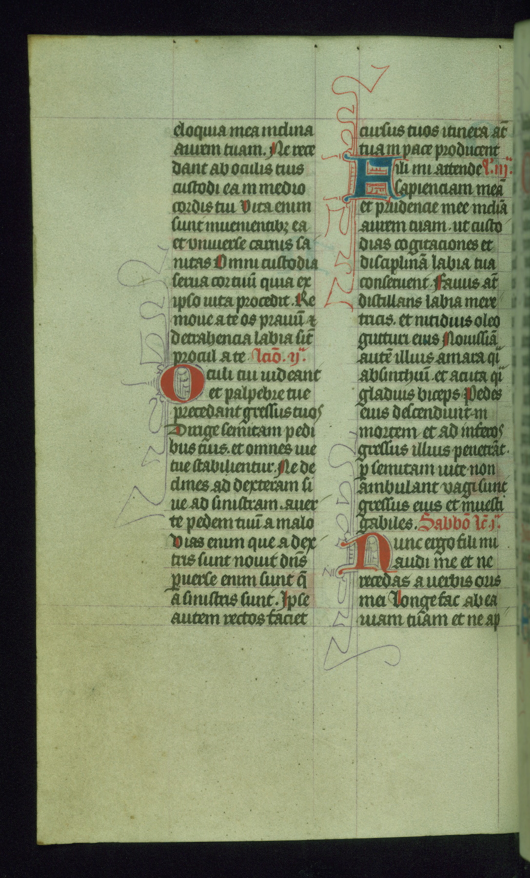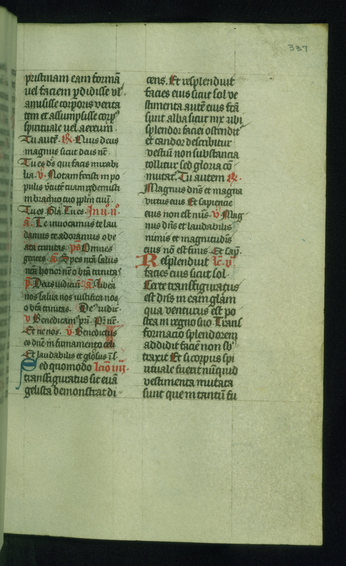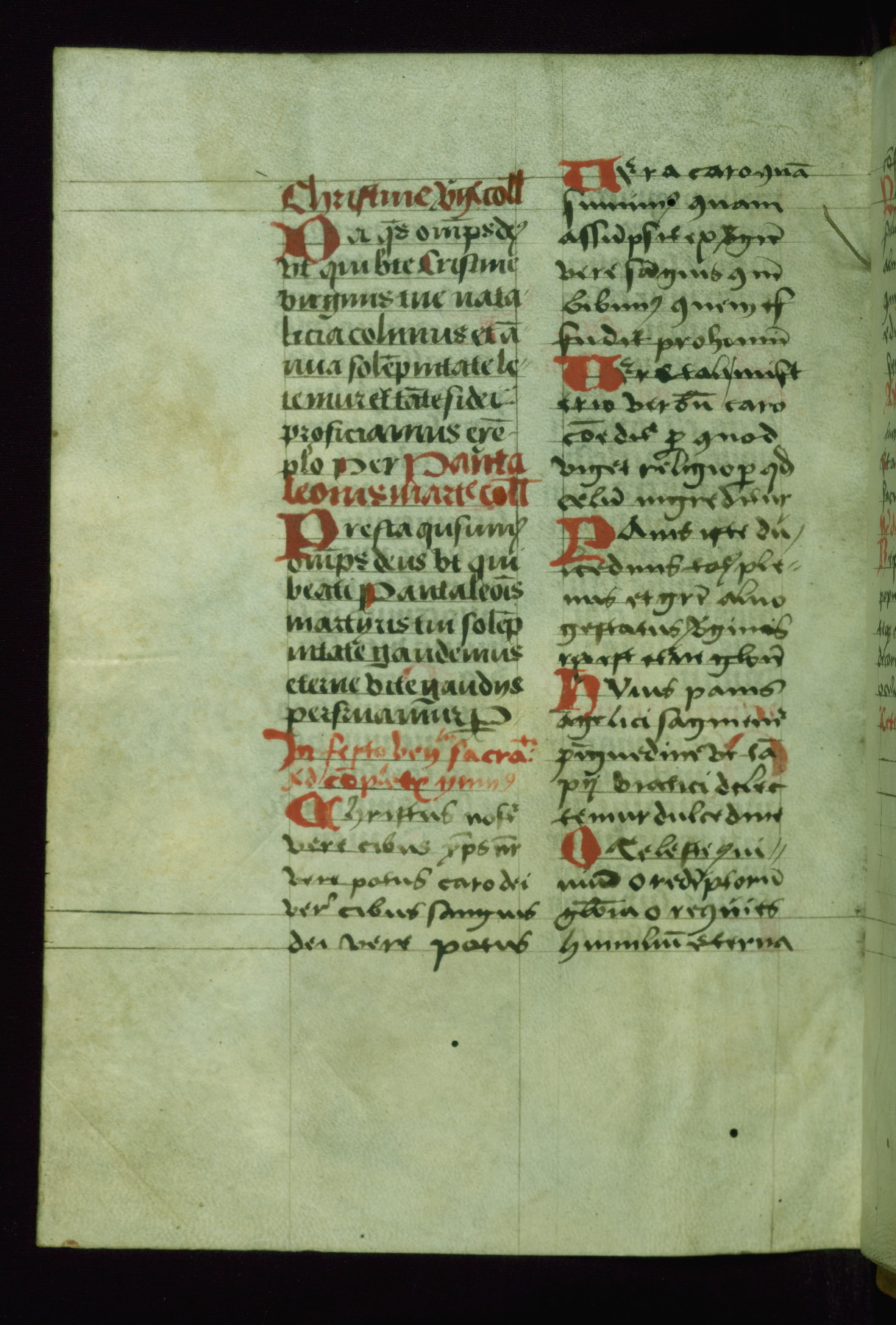 This small breviary, composed of more than 500 folios, is extraordinary for its length, considering it is the summer portion of a two-volume breviary for the use of Liège. The manuscript was completed for ecclesiastical use at the Cathedral of Notre-Dame and St.-Lambert in Liège ca. 1420. This attribution is suggested, for instance, by the petitions to the congregation of this cathedral (fols. 114v-117v), as well as the armorial shield of the family of Surlet de Chokier of Liège represented at the opening of the Psalms. The manuscript has modest, but interesting, decoration with historiated and decorated initials marking the liturgical texts, and occasional angels playing instruments in the margins. The most notable pictorial effect is found in the initials inhabited by transparent figures on rich blue ground. The technique is found, for instance, on fol. 156r with the gold monstrance held by translucent angels for the feast of the Corpus Christi.