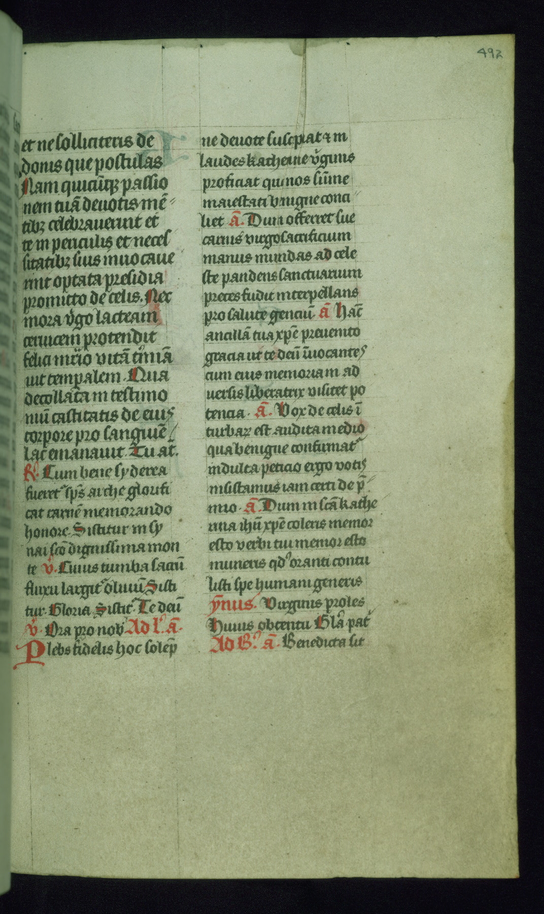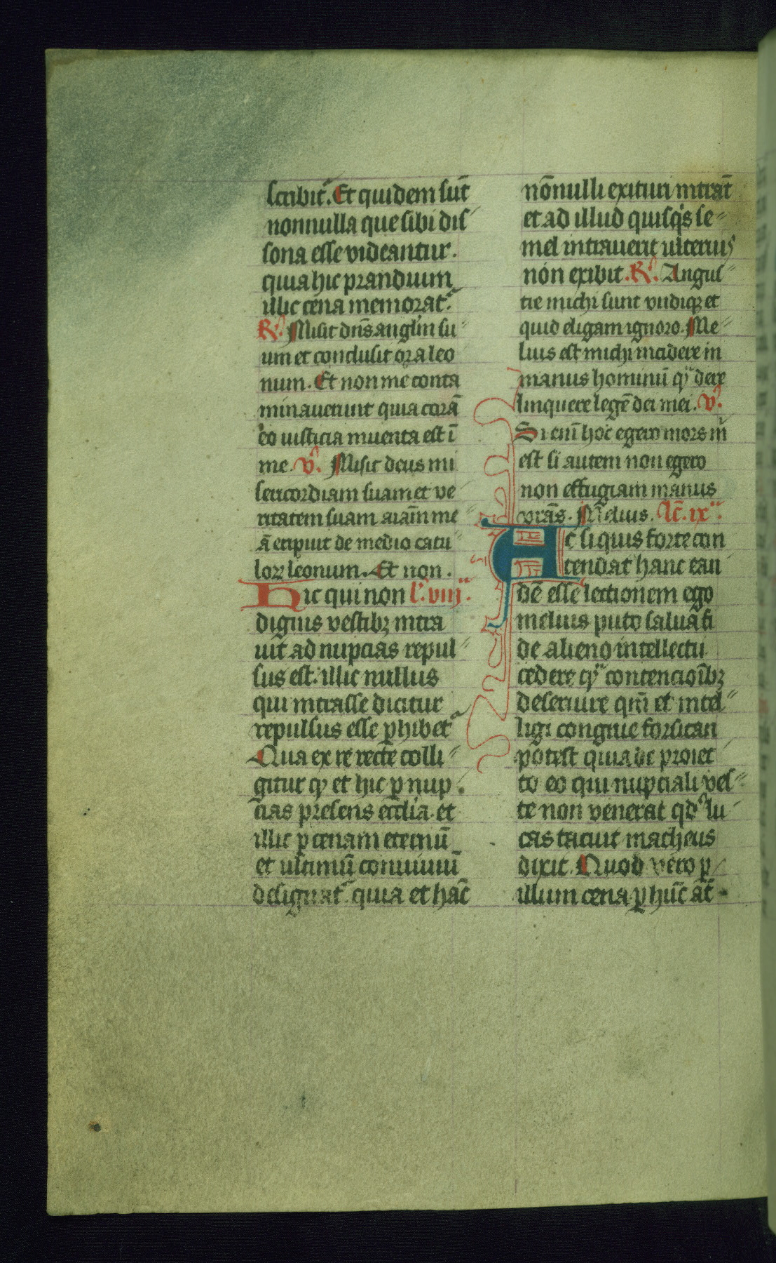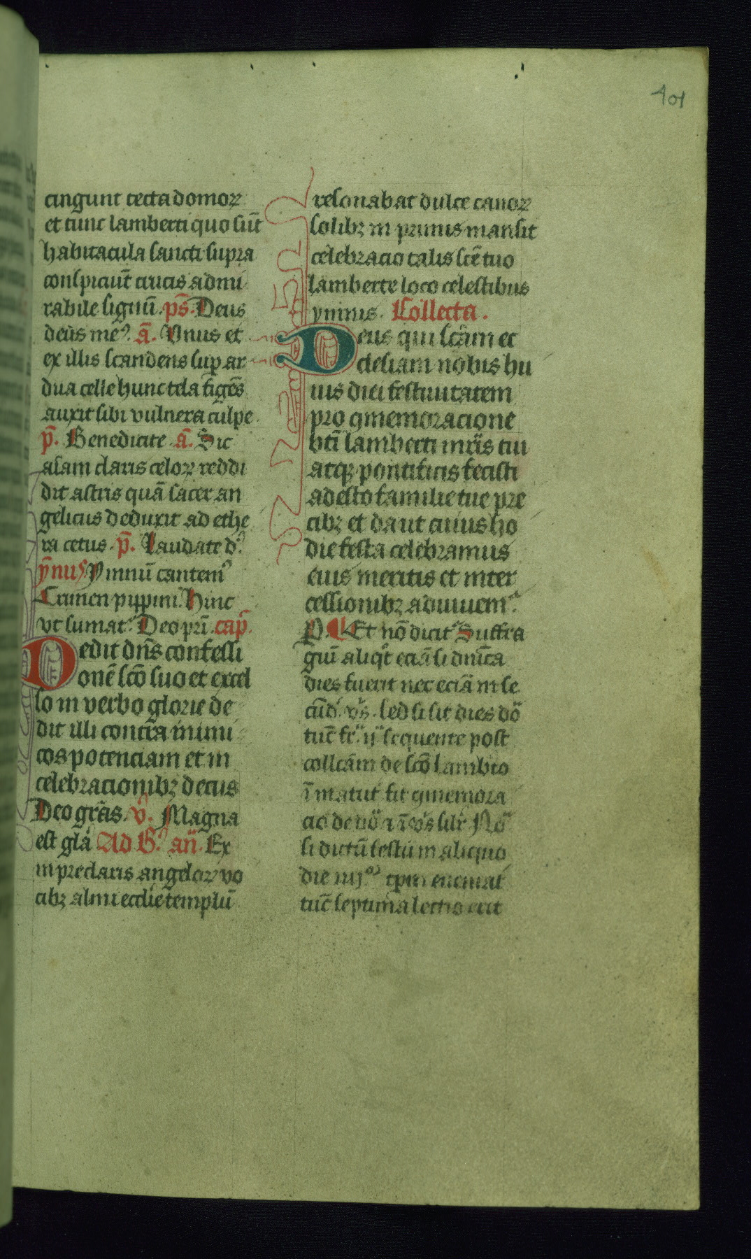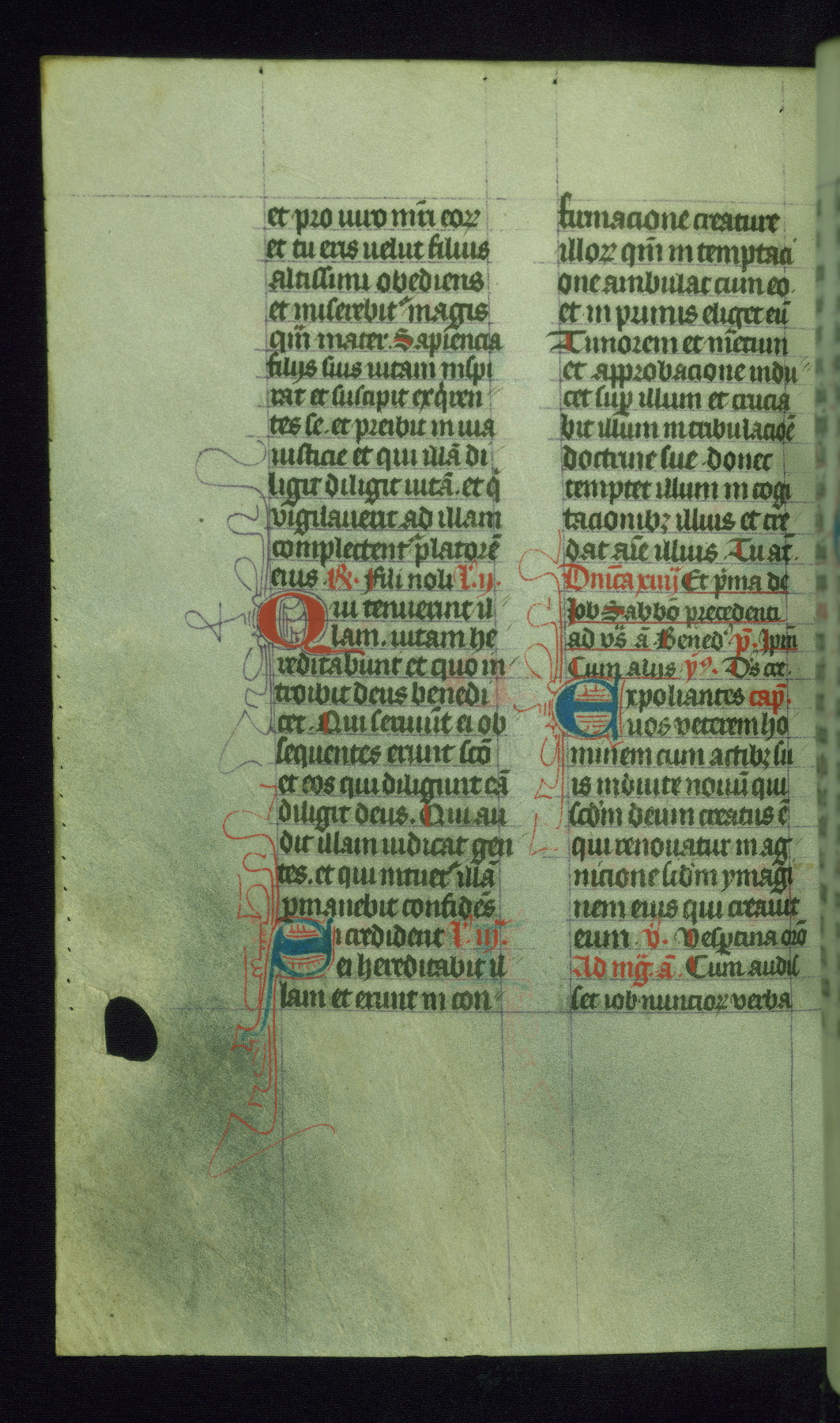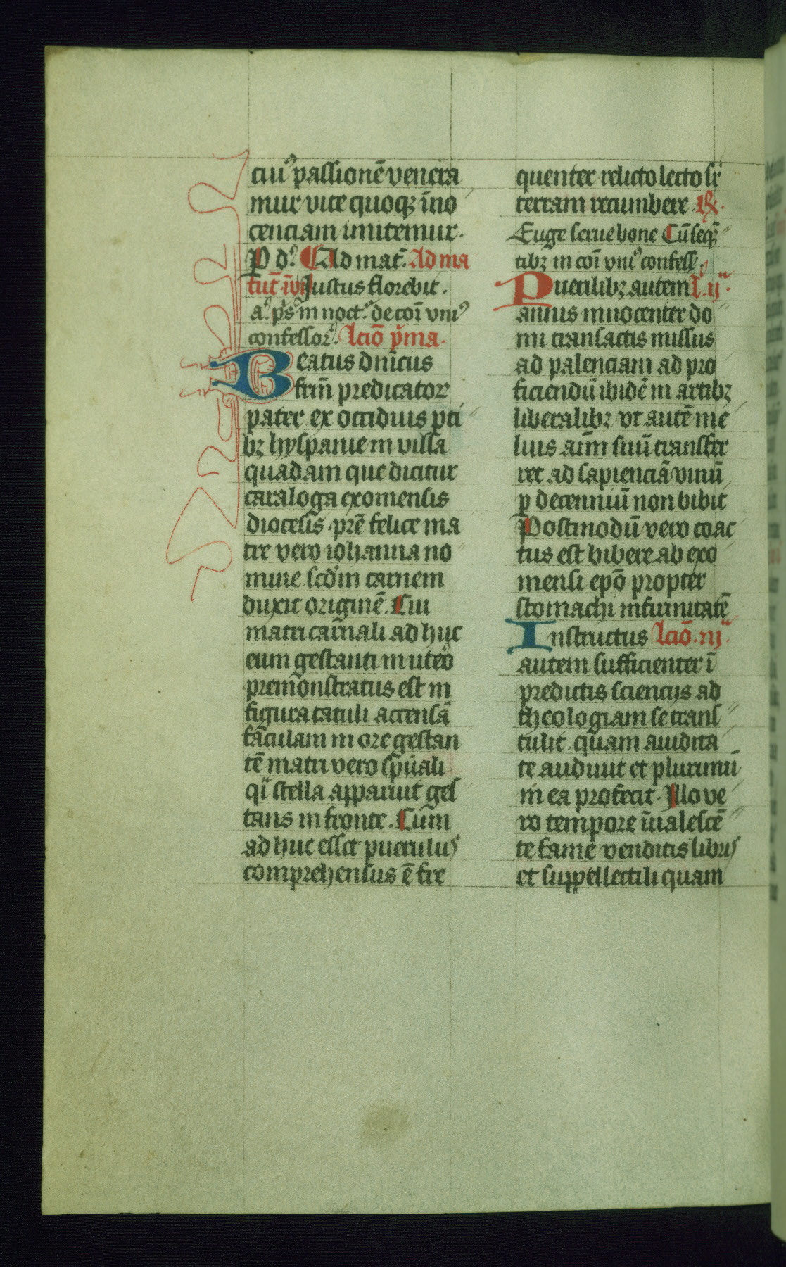 This small breviary, composed of more than 500 folios, is extraordinary for its length, considering it is the summer portion of a two-volume breviary for the use of Liège. The manuscript was completed for ecclesiastical use at the Cathedral of Notre-Dame and St.-Lambert in Liège ca. 1420. This attribution is suggested, for instance, by the petitions to the congregation of this cathedral (fols. 114v-117v), as well as the armorial shield of the family of Surlet de Chokier of Liège represented at the opening of the Psalms. The manuscript has modest, but interesting, decoration with historiated and decorated initials marking the liturgical texts, and occasional angels playing instruments in the margins. The most notable pictorial effect is found in the initials inhabited by transparent figures on rich blue ground. The technique is found, for instance, on fol. 156r with the gold monstrance held by translucent angels for the feast of the Corpus Christi.