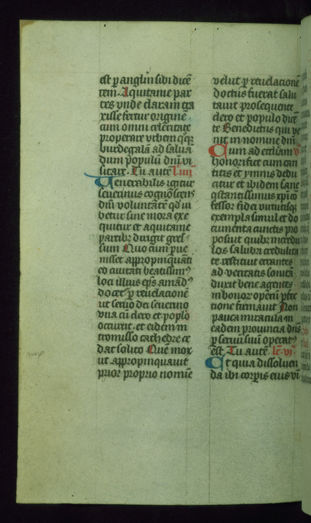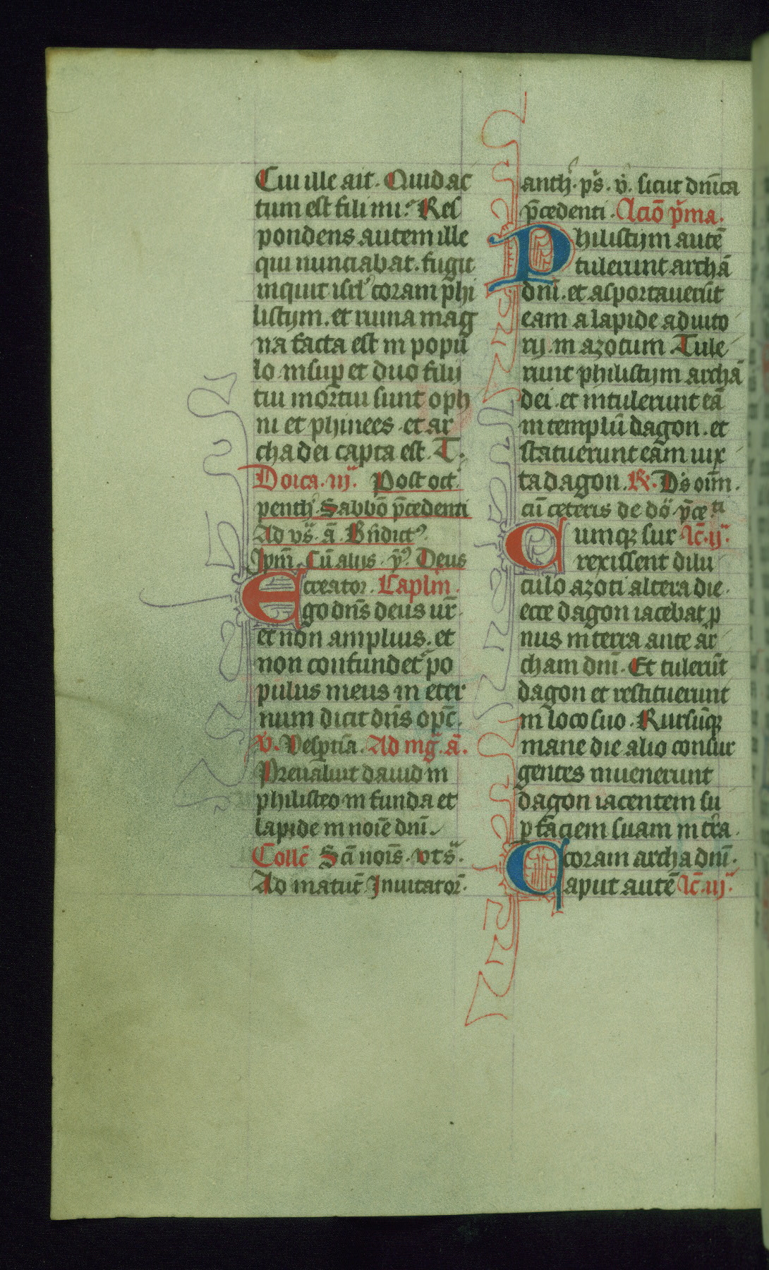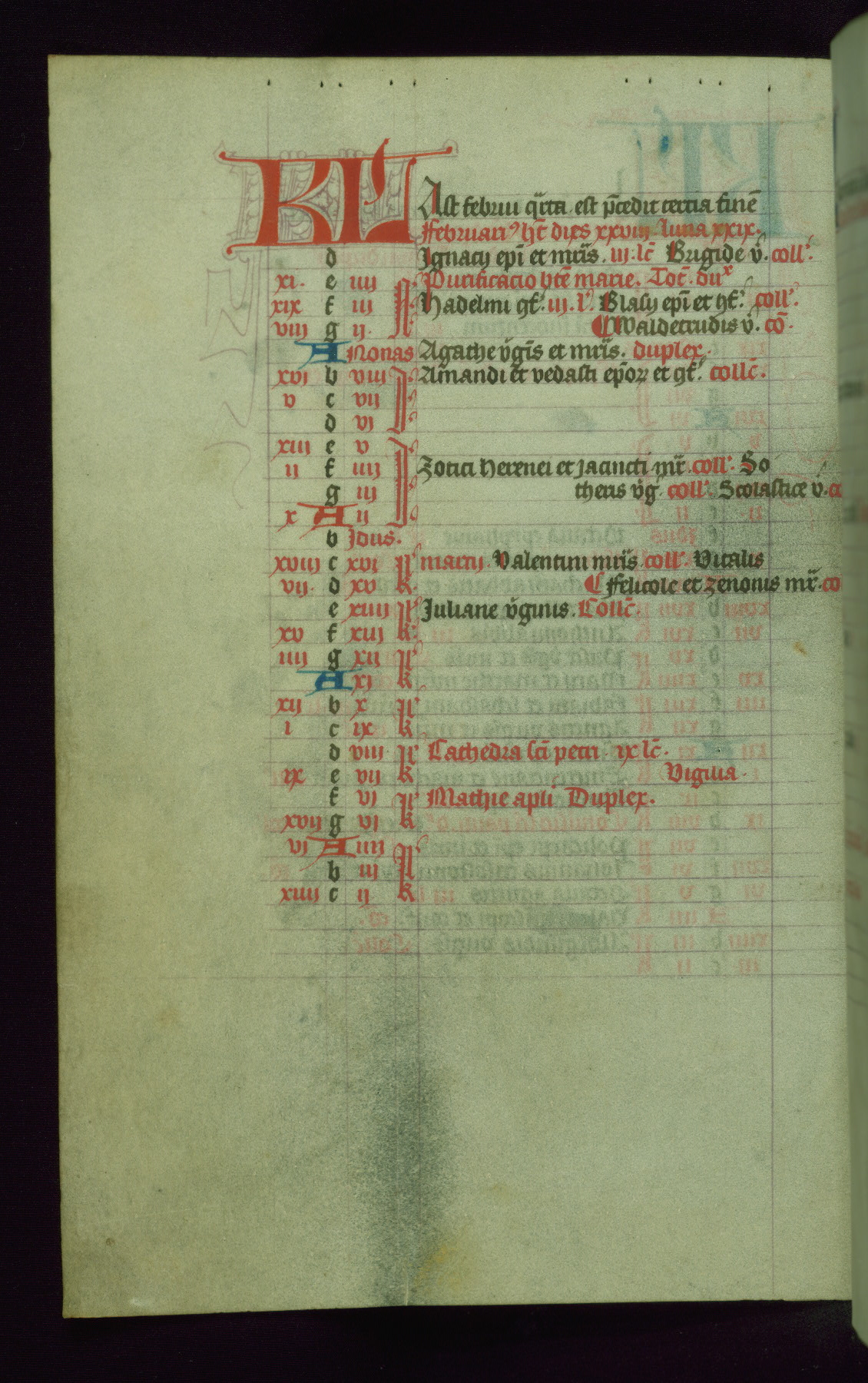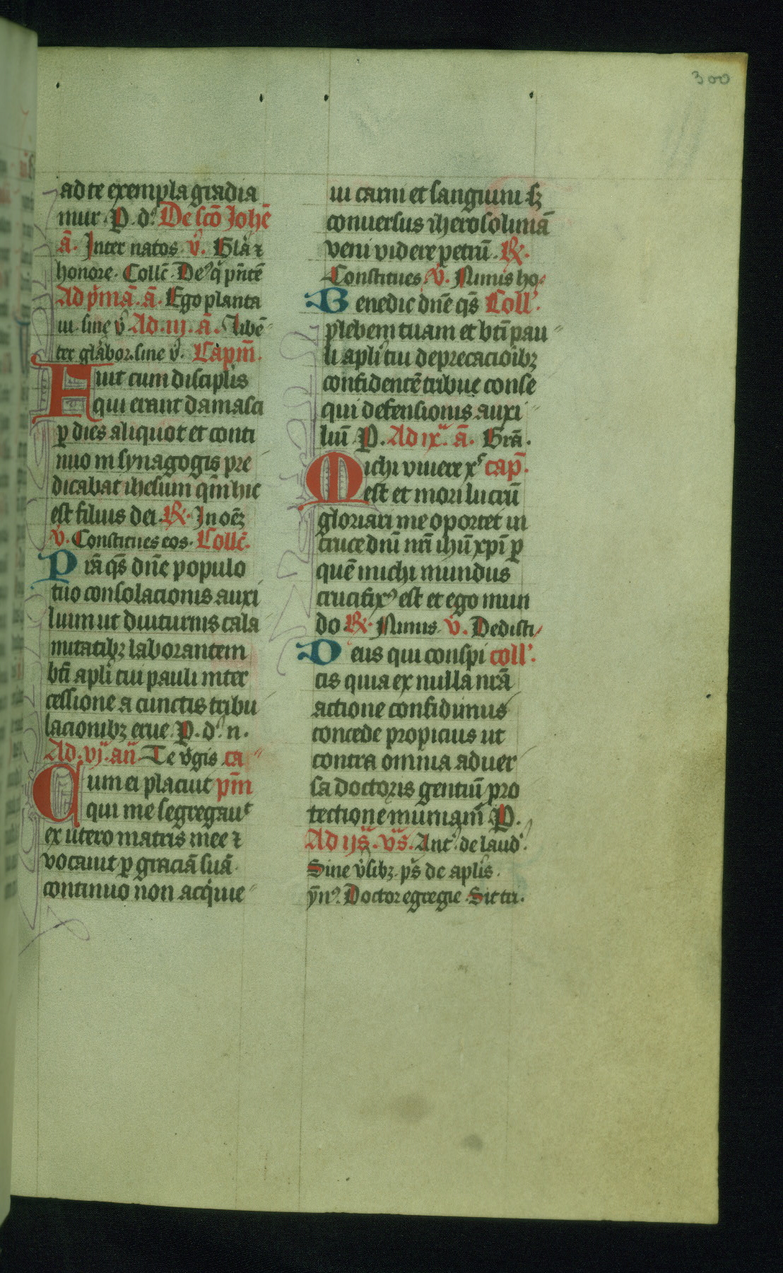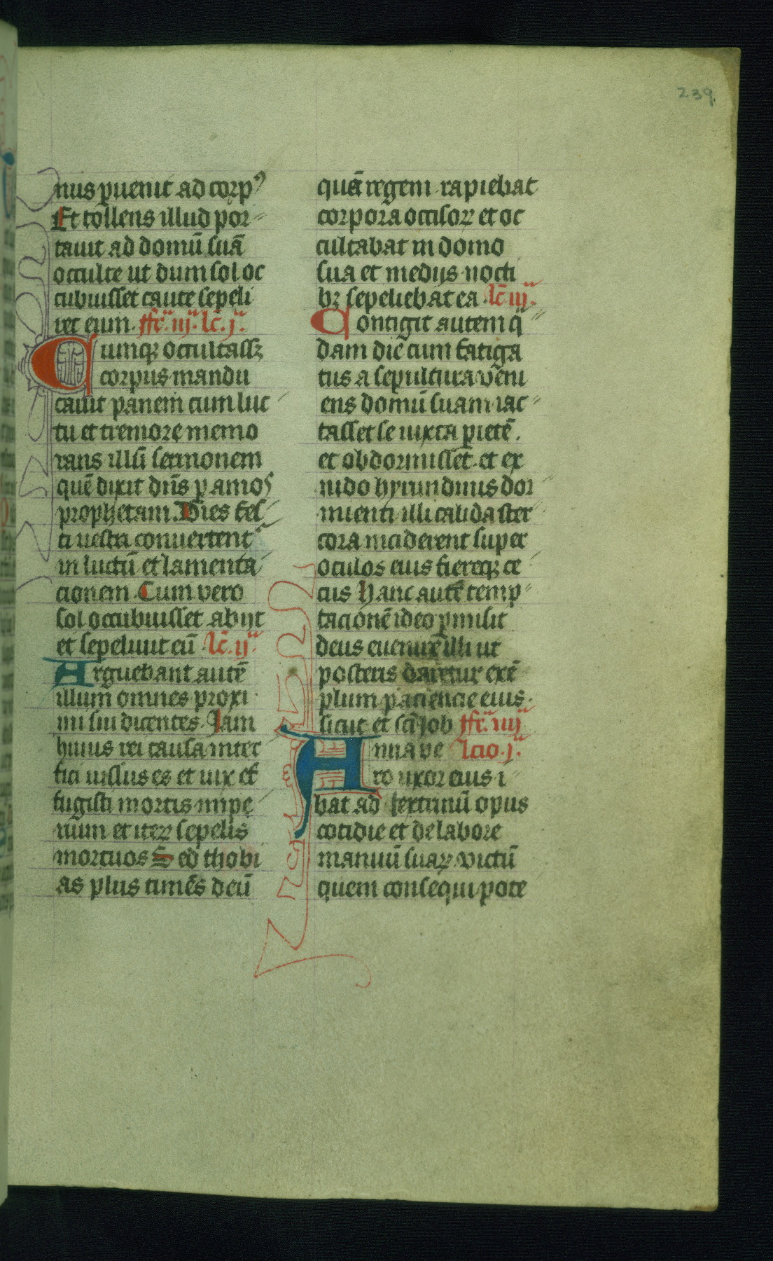 This small breviary, composed of more than 500 folios, is extraordinary for its length, considering it is the summer portion of a two-volume breviary for the use of Liège. The manuscript was completed for ecclesiastical use at the Cathedral of Notre-Dame and St.-Lambert in Liège ca. 1420. This attribution is suggested, for instance, by the petitions to the congregation of this cathedral (fols. 114v-117v), as well as the armorial shield of the family of Surlet de Chokier of Liège represented at the opening of the Psalms. The manuscript has modest, but interesting, decoration with historiated and decorated initials marking the liturgical texts, and occasional angels playing instruments in the margins. The most notable pictorial effect is found in the initials inhabited by transparent figures on rich blue ground. The technique is found, for instance, on fol. 156r with the gold monstrance held by translucent angels for the feast of the Corpus Christi.