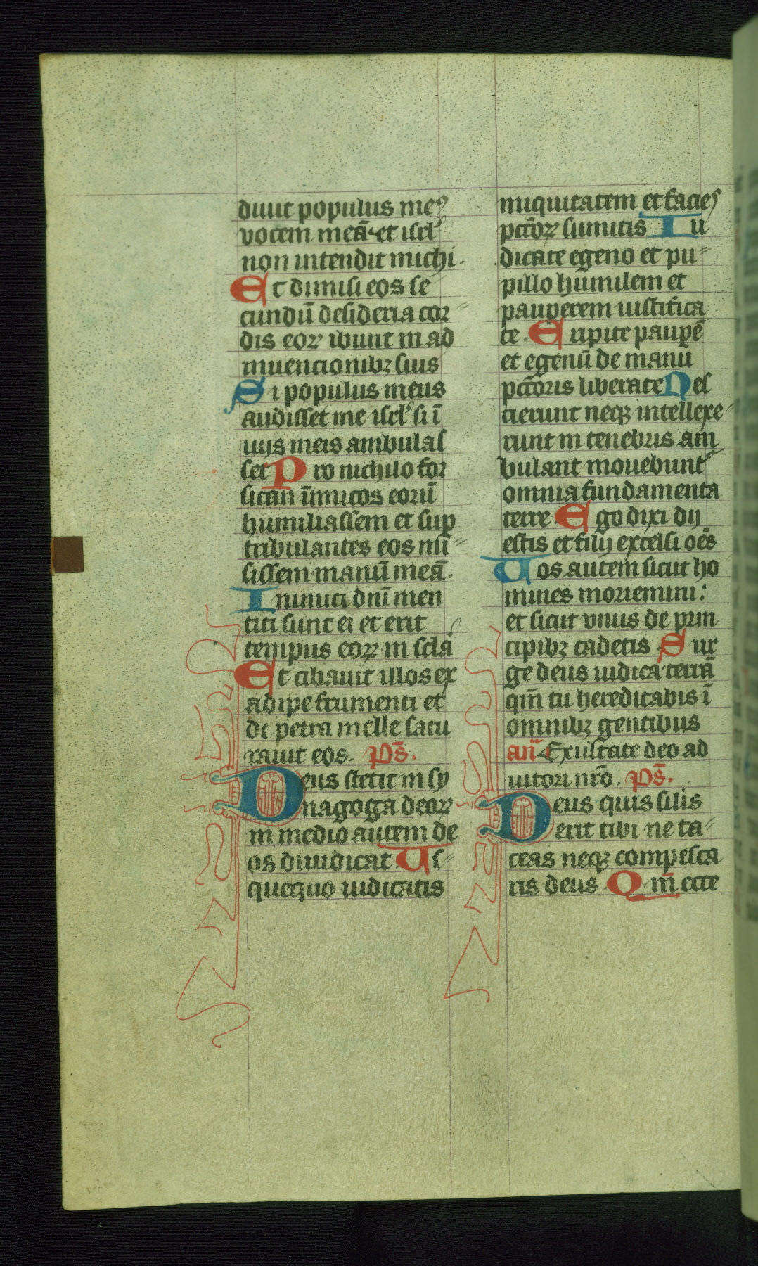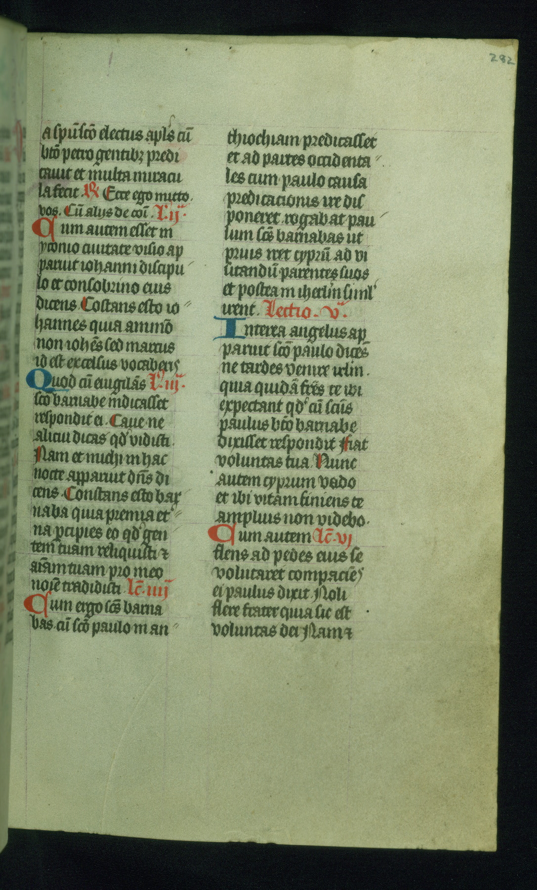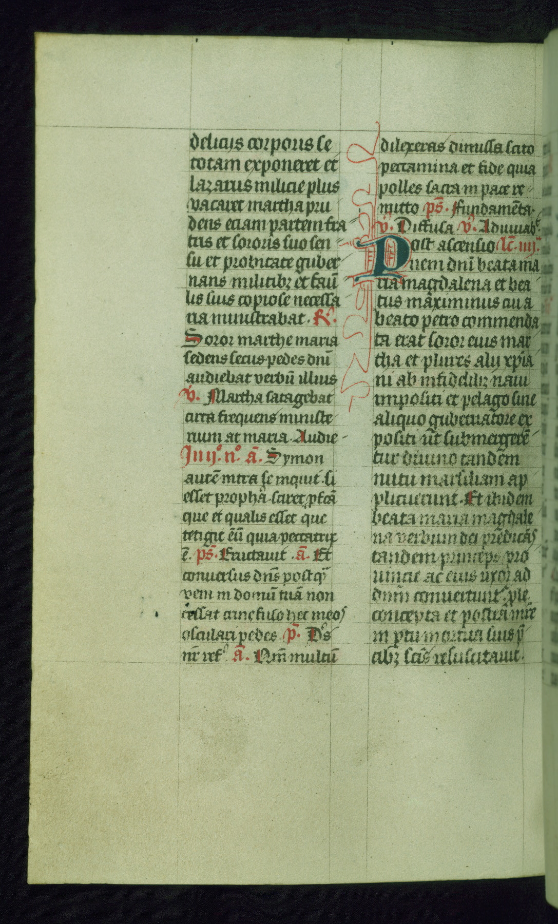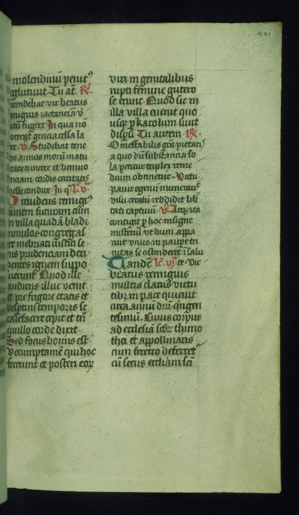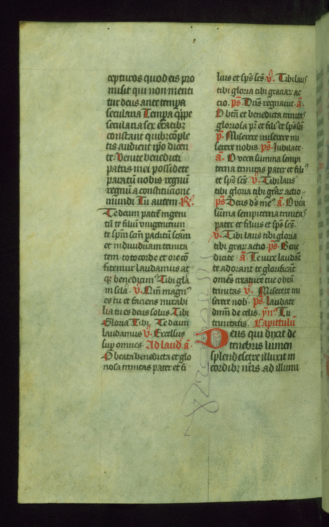 This small breviary, composed of more than 500 folios, is extraordinary for its length, considering it is the summer portion of a two-volume breviary for the use of Liège. The manuscript was completed for ecclesiastical use at the Cathedral of Notre-Dame and St.-Lambert in Liège ca. 1420. This attribution is suggested, for instance, by the petitions to the congregation of this cathedral (fols. 114v-117v), as well as the armorial shield of the family of Surlet de Chokier of Liège represented at the opening of the Psalms. The manuscript has modest, but interesting, decoration with historiated and decorated initials marking the liturgical texts, and occasional angels playing instruments in the margins. The most notable pictorial effect is found in the initials inhabited by transparent figures on rich blue ground. The technique is found, for instance, on fol. 156r with the gold monstrance held by translucent angels for the feast of the Corpus Christi.