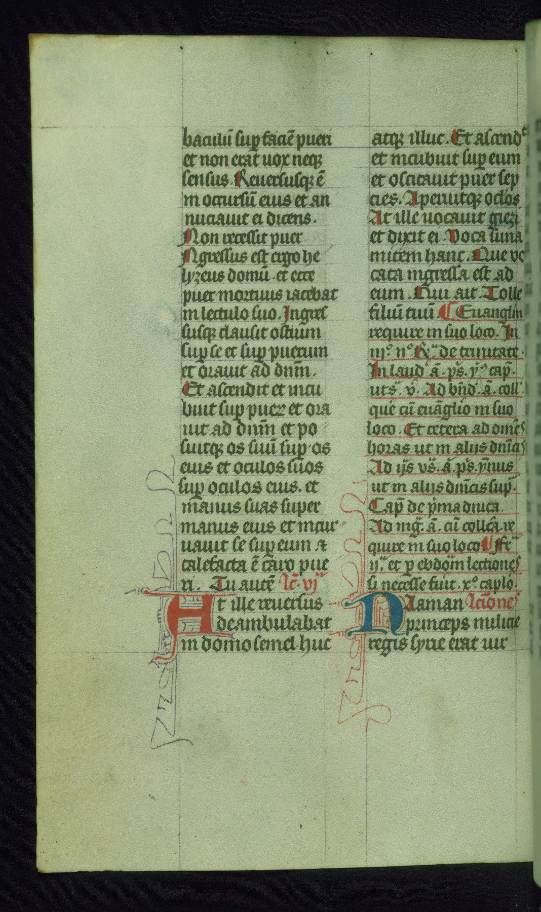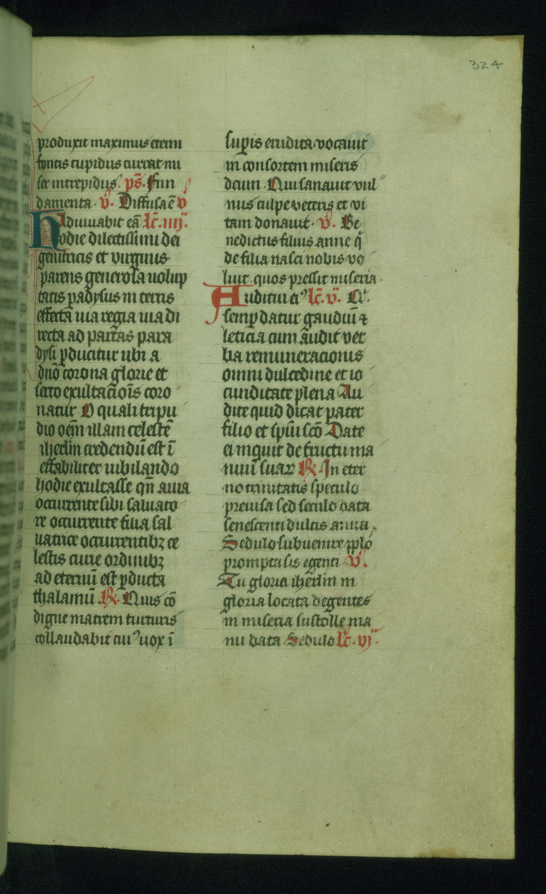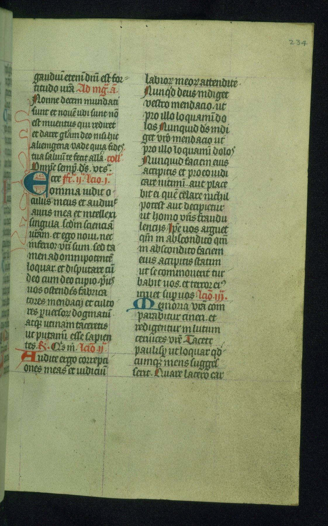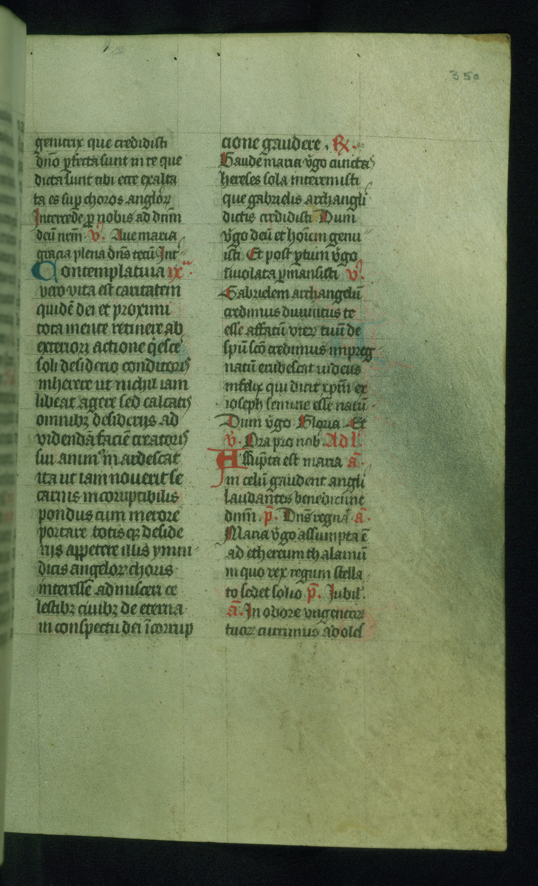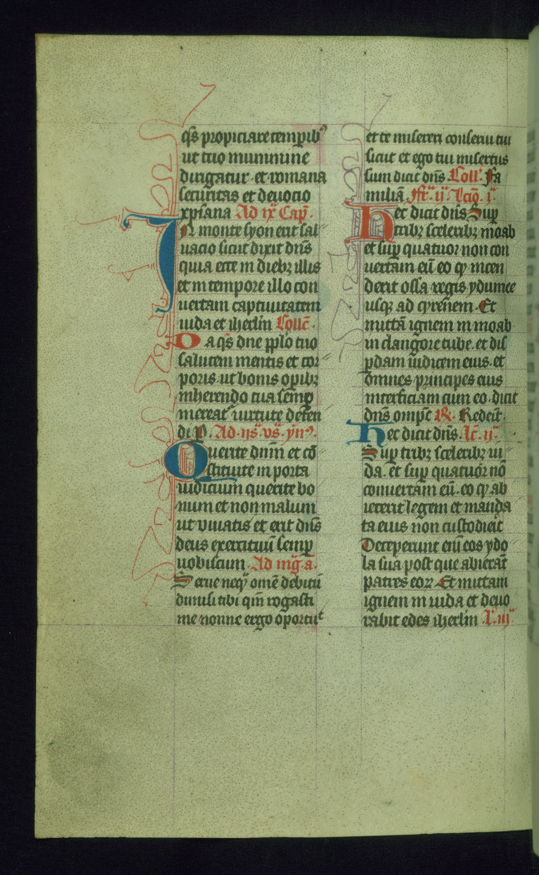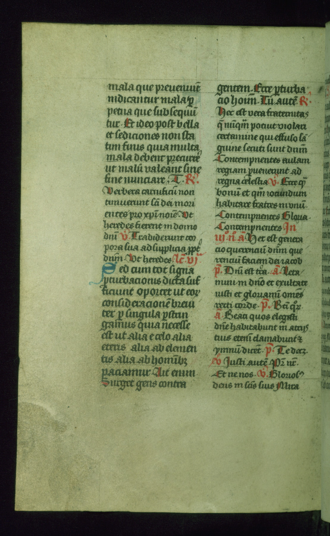 This small breviary, composed of more than 500 folios, is extraordinary for its length, considering it is the summer portion of a two-volume breviary for the use of Liège. The manuscript was completed for ecclesiastical use at the Cathedral of Notre-Dame and St.-Lambert in Liège ca. 1420. This attribution is suggested, for instance, by the petitions to the congregation of this cathedral (fols. 114v-117v), as well as the armorial shield of the family of Surlet de Chokier of Liège represented at the opening of the Psalms. The manuscript has modest, but interesting, decoration with historiated and decorated initials marking the liturgical texts, and occasional angels playing instruments in the margins. The most notable pictorial effect is found in the initials inhabited by transparent figures on rich blue ground. The technique is found, for instance, on fol. 156r with the gold monstrance held by translucent angels for the feast of the Corpus Christi.