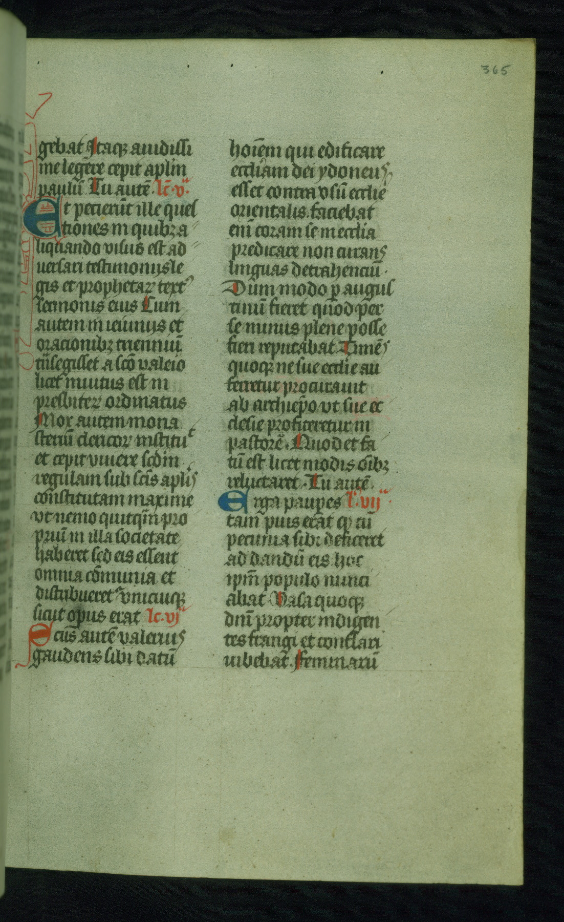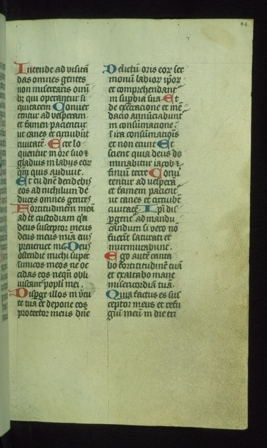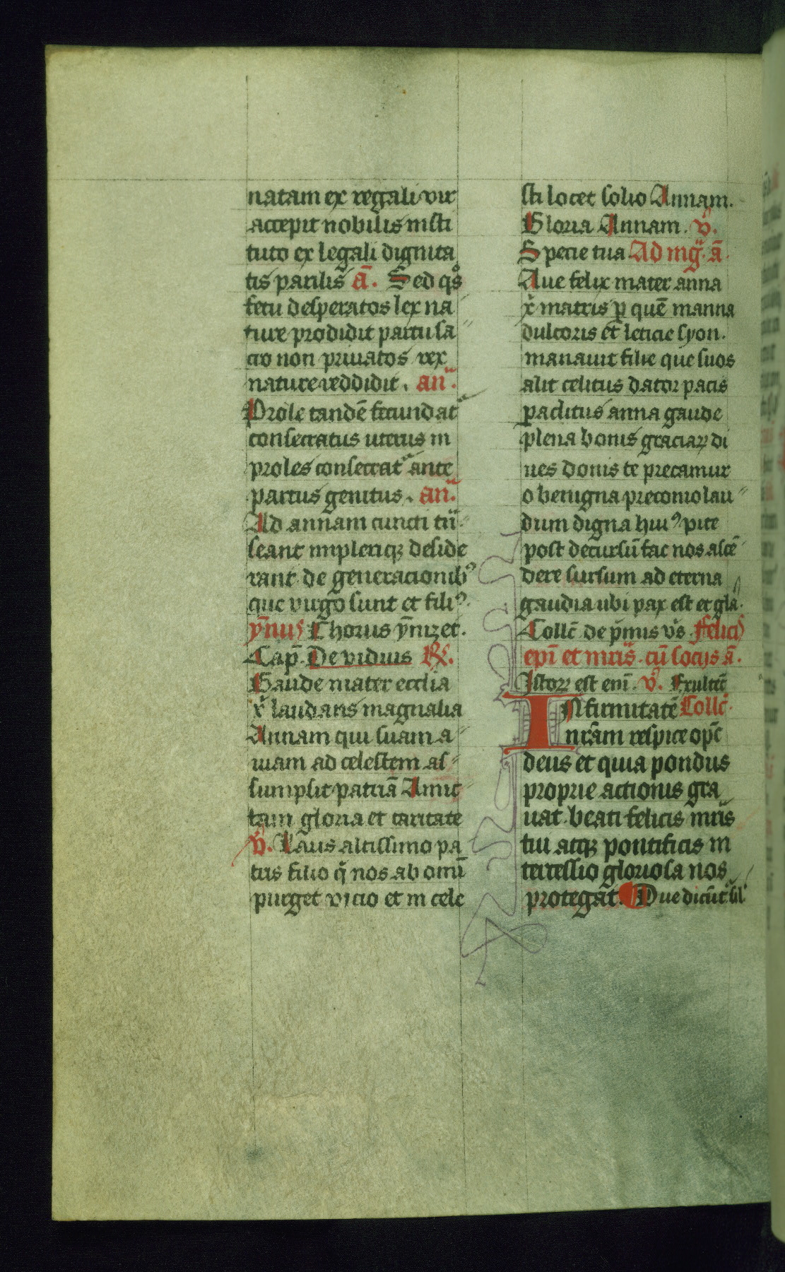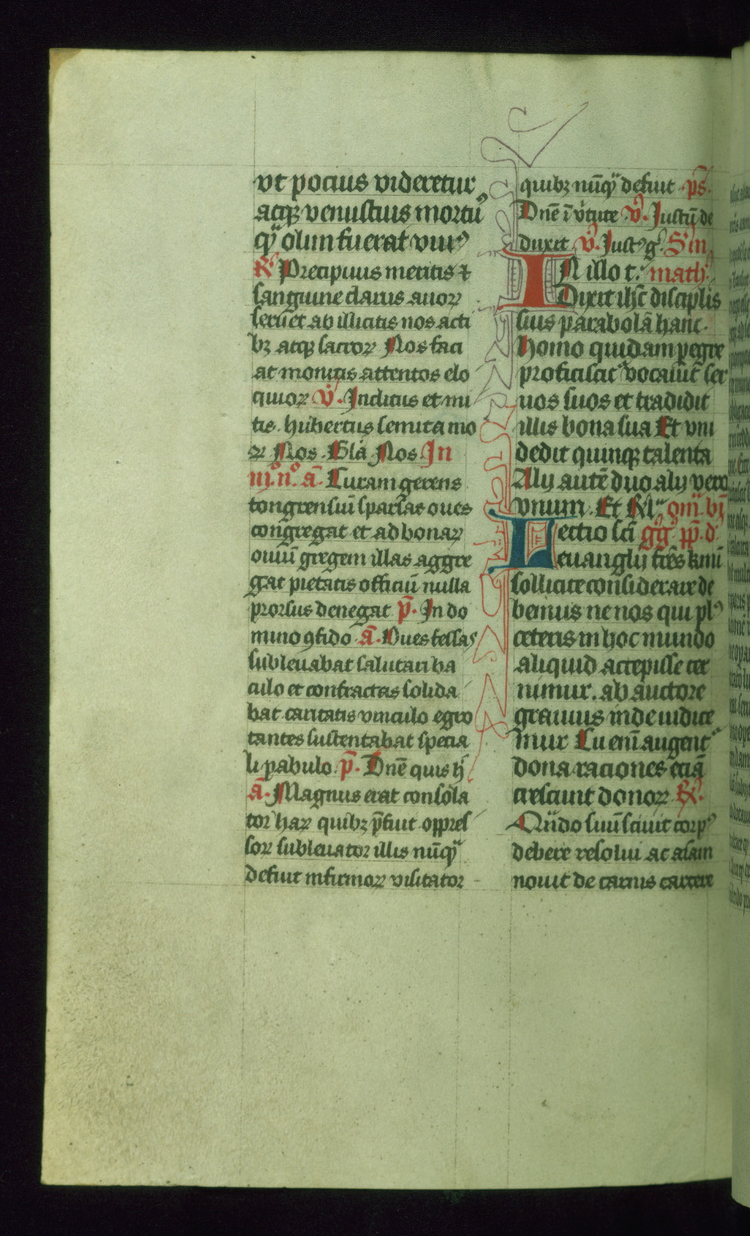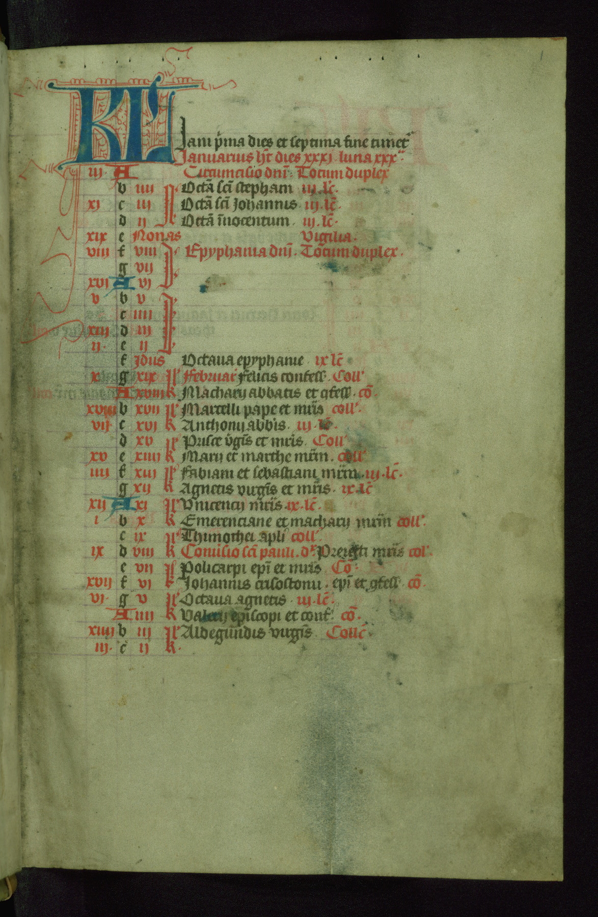 This small breviary, composed of more than 500 folios, is extraordinary for its length, considering it is the summer portion of a two-volume breviary for the use of Liège. The manuscript was completed for ecclesiastical use at the Cathedral of Notre-Dame and St.-Lambert in Liège ca. 1420. This attribution is suggested, for instance, by the petitions to the congregation of this cathedral (fols. 114v-117v), as well as the armorial shield of the family of Surlet de Chokier of Liège represented at the opening of the Psalms. The manuscript has modest, but interesting, decoration with historiated and decorated initials marking the liturgical texts, and occasional angels playing instruments in the margins. The most notable pictorial effect is found in the initials inhabited by transparent figures on rich blue ground. The technique is found, for instance, on fol. 156r with the gold monstrance held by translucent angels for the feast of the Corpus Christi.