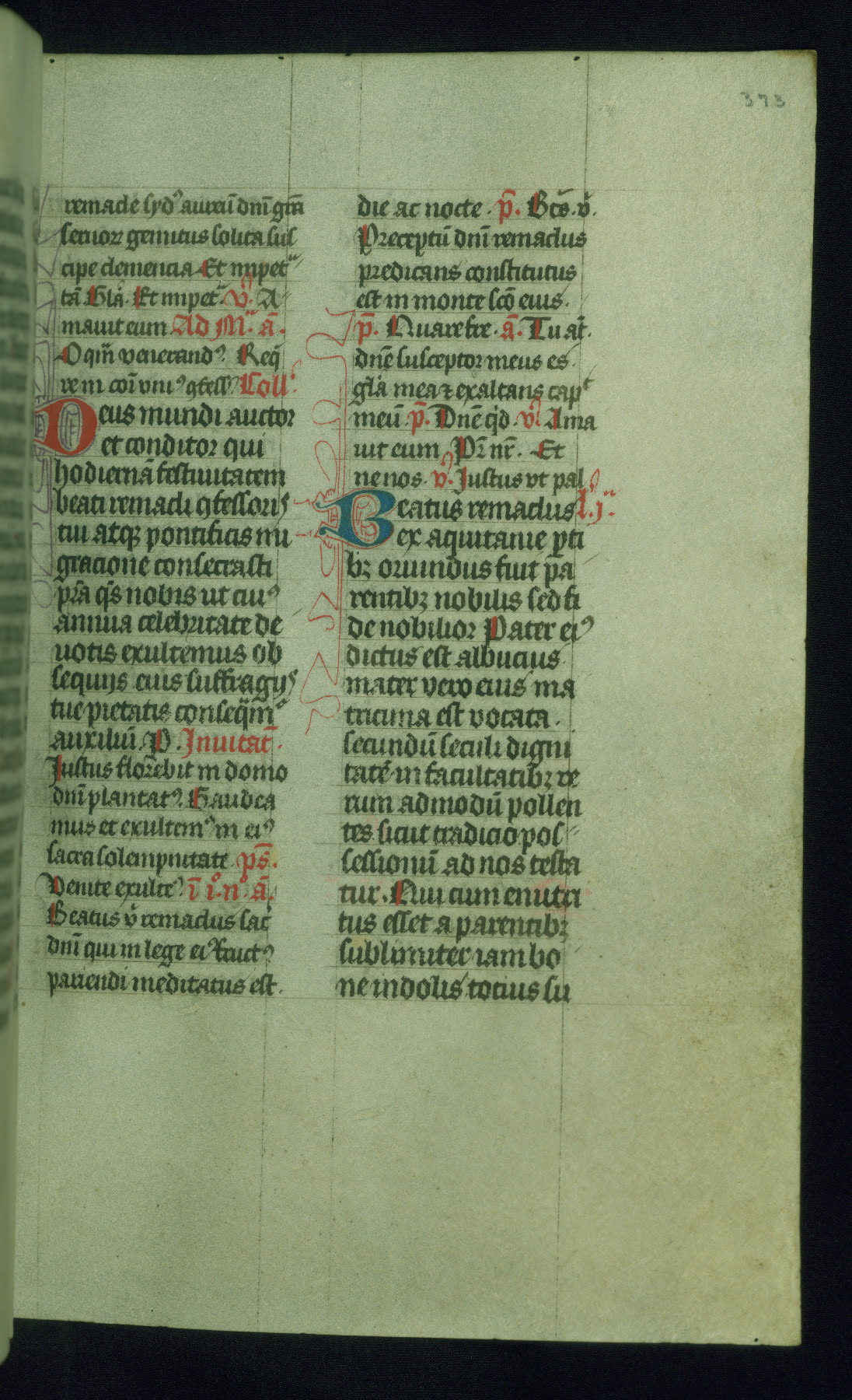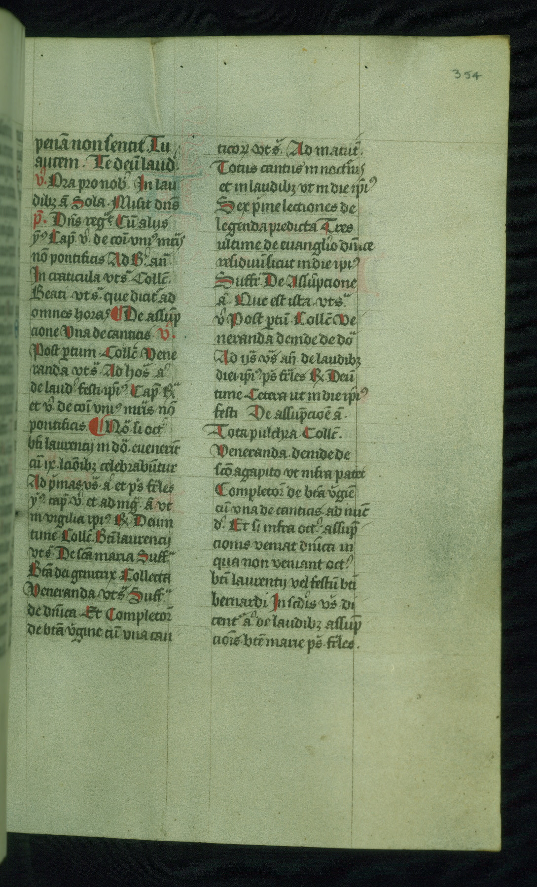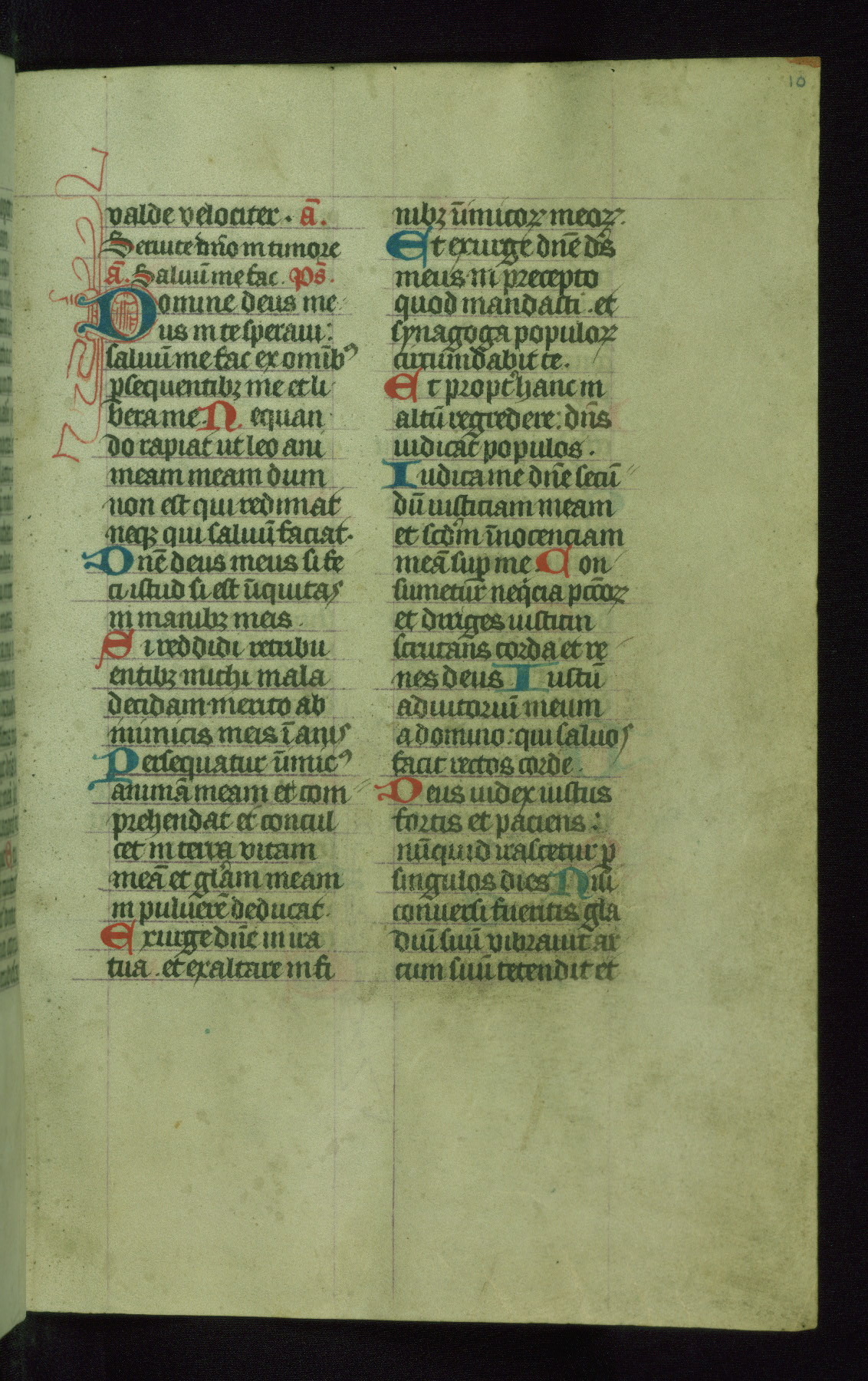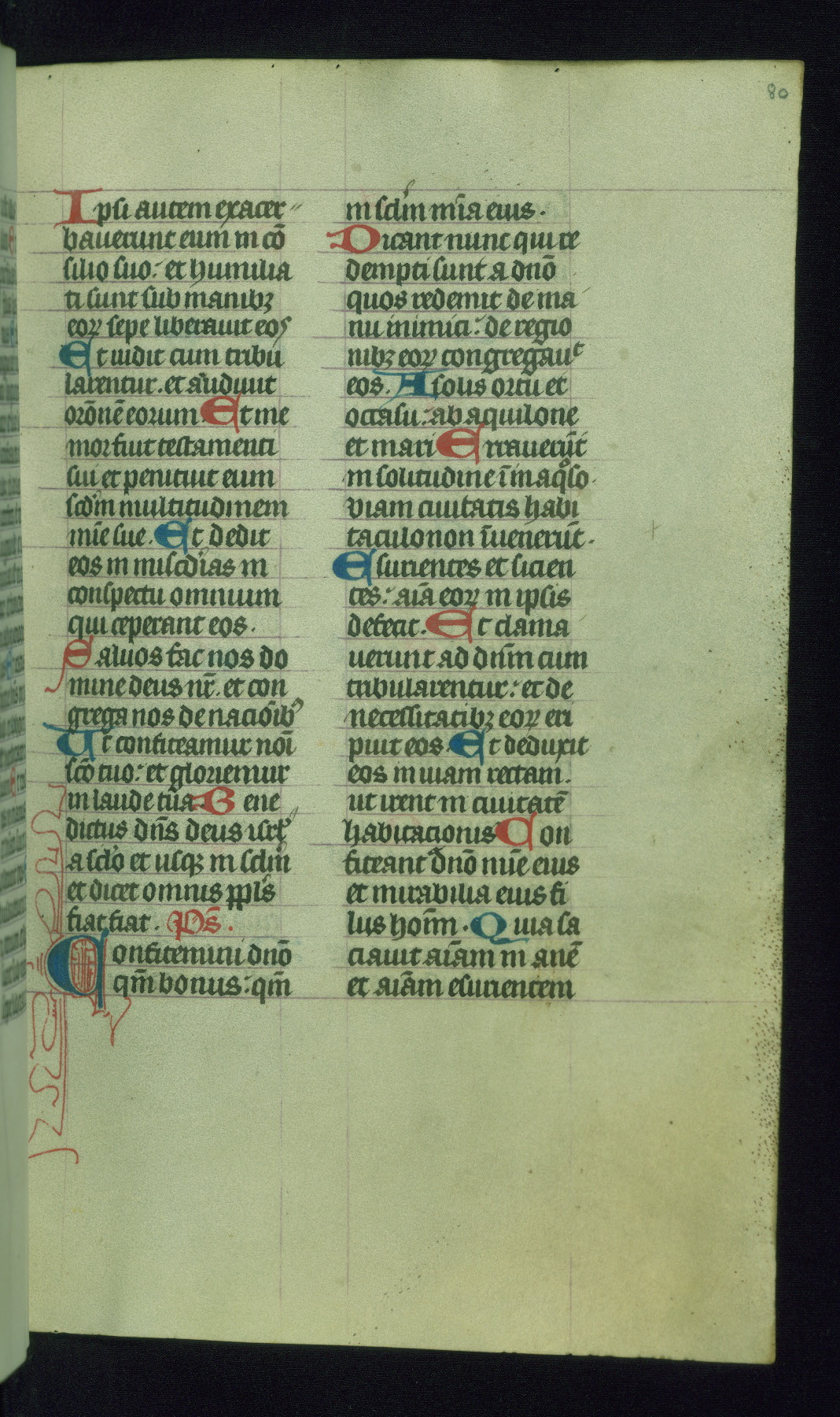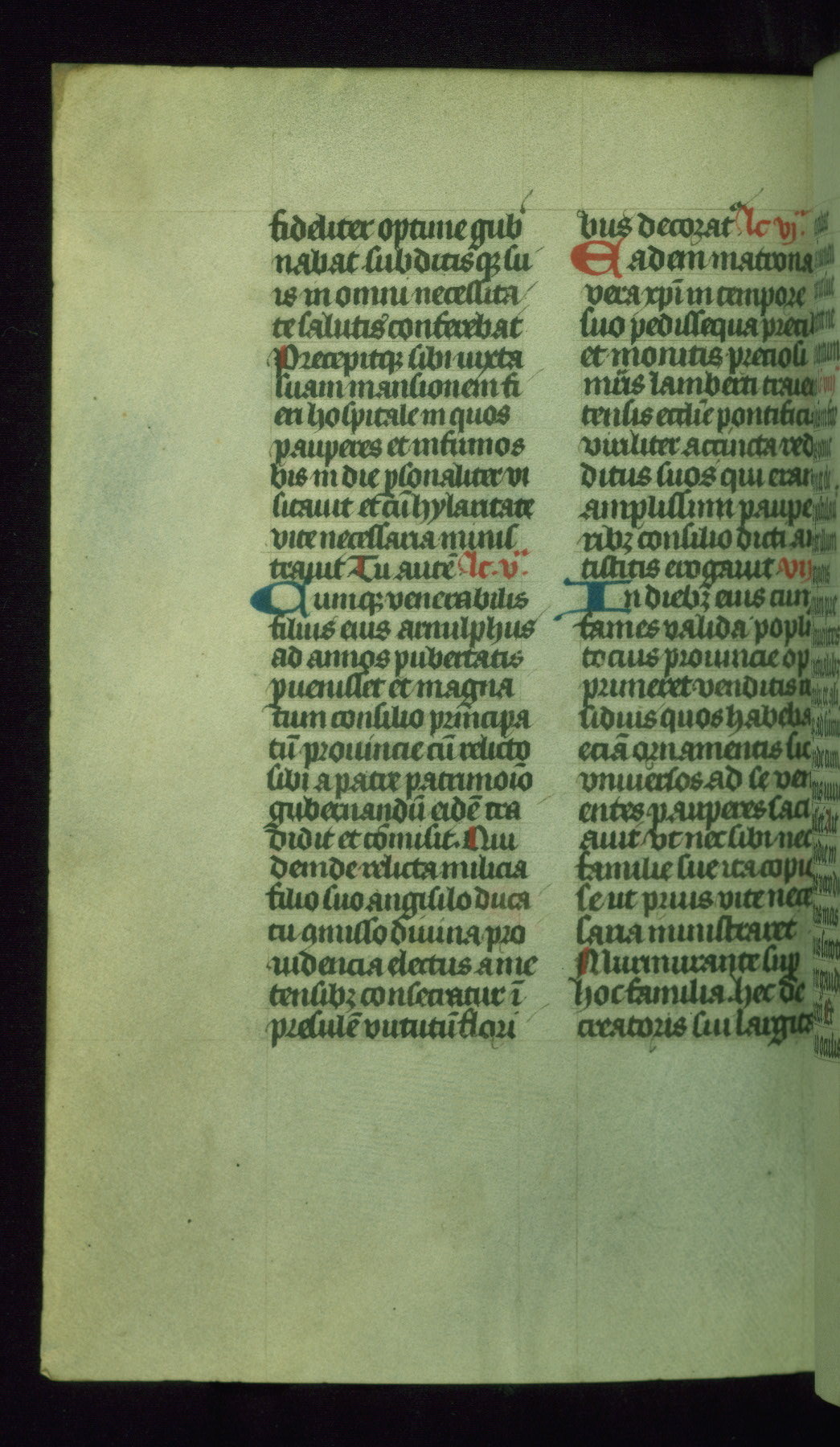This small breviary, composed of more than 500 folios, is extraordinary for its length, considering it is the summer portion of a two-volume breviary for the use of Liège. The manuscript was completed for ecclesiastical use at the Cathedral of Notre-Dame and St.-Lambert in Liège ca. 1420. This attribution is suggested, for instance, by the petitions to the congregation of this cathedral (fols. 114v-117v), as well as the armorial shield of the family of Surlet de Chokier of Liège represented at the opening of the Psalms. The manuscript has modest, but interesting, decoration with historiated and decorated initials marking the liturgical texts, and occasional angels playing instruments in the margins. The most notable pictorial effect is found in the initials inhabited by transparent figures on rich blue ground. The technique is found, for instance, on fol. 156r with the gold monstrance held by translucent angels for the feast of the Corpus Christi.