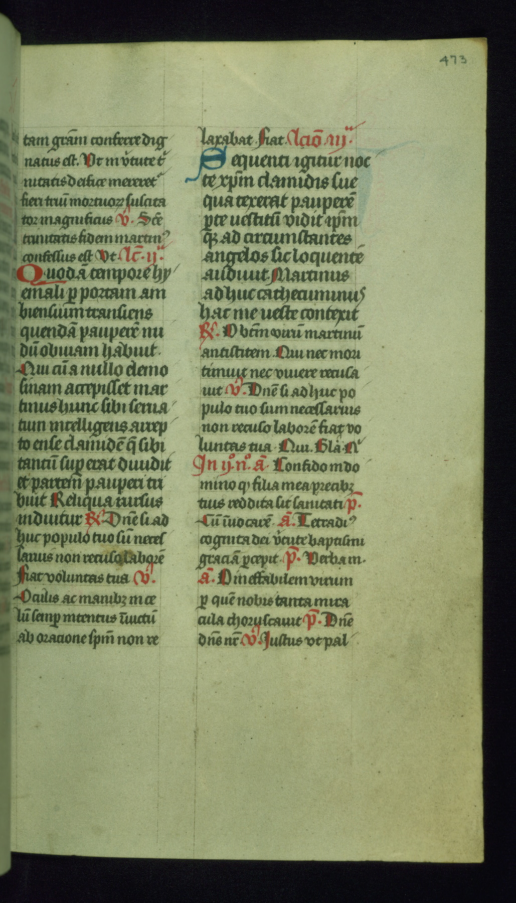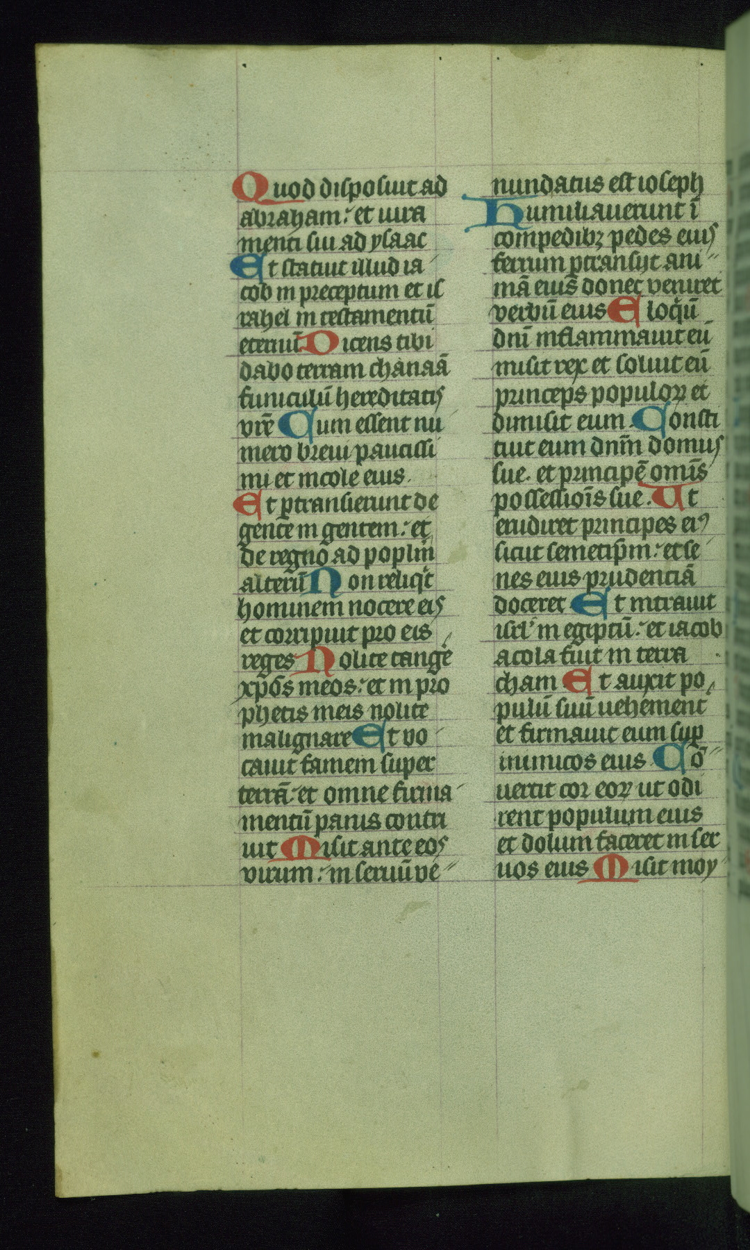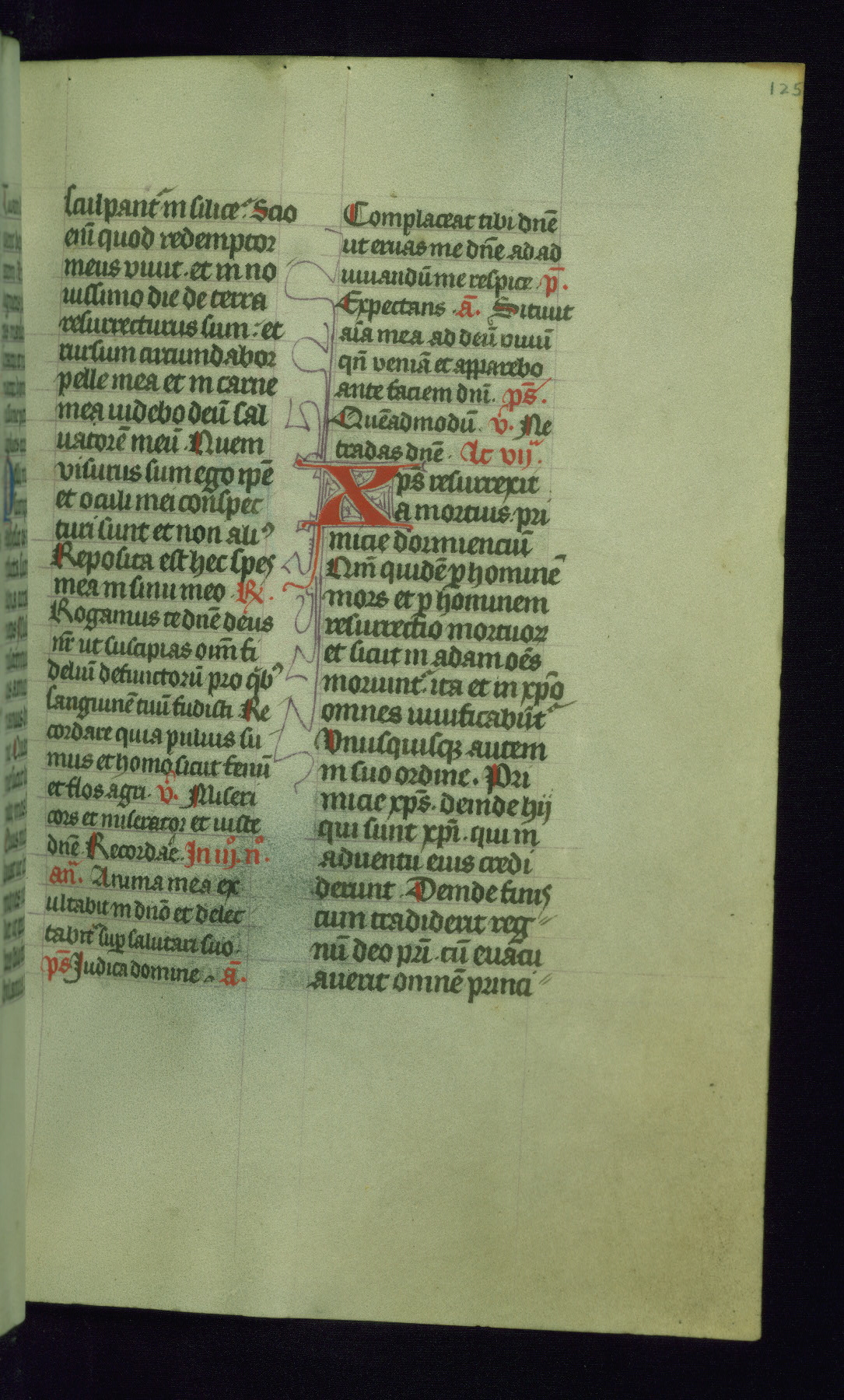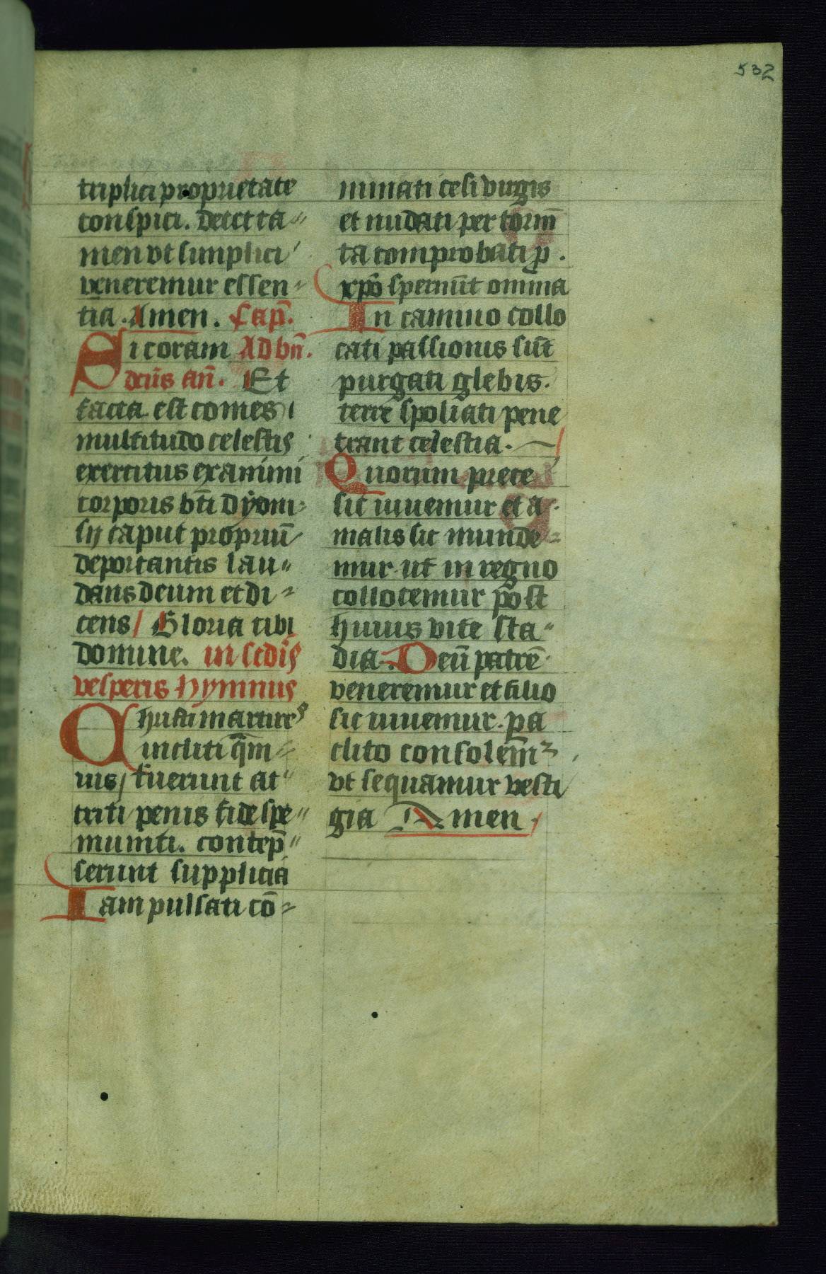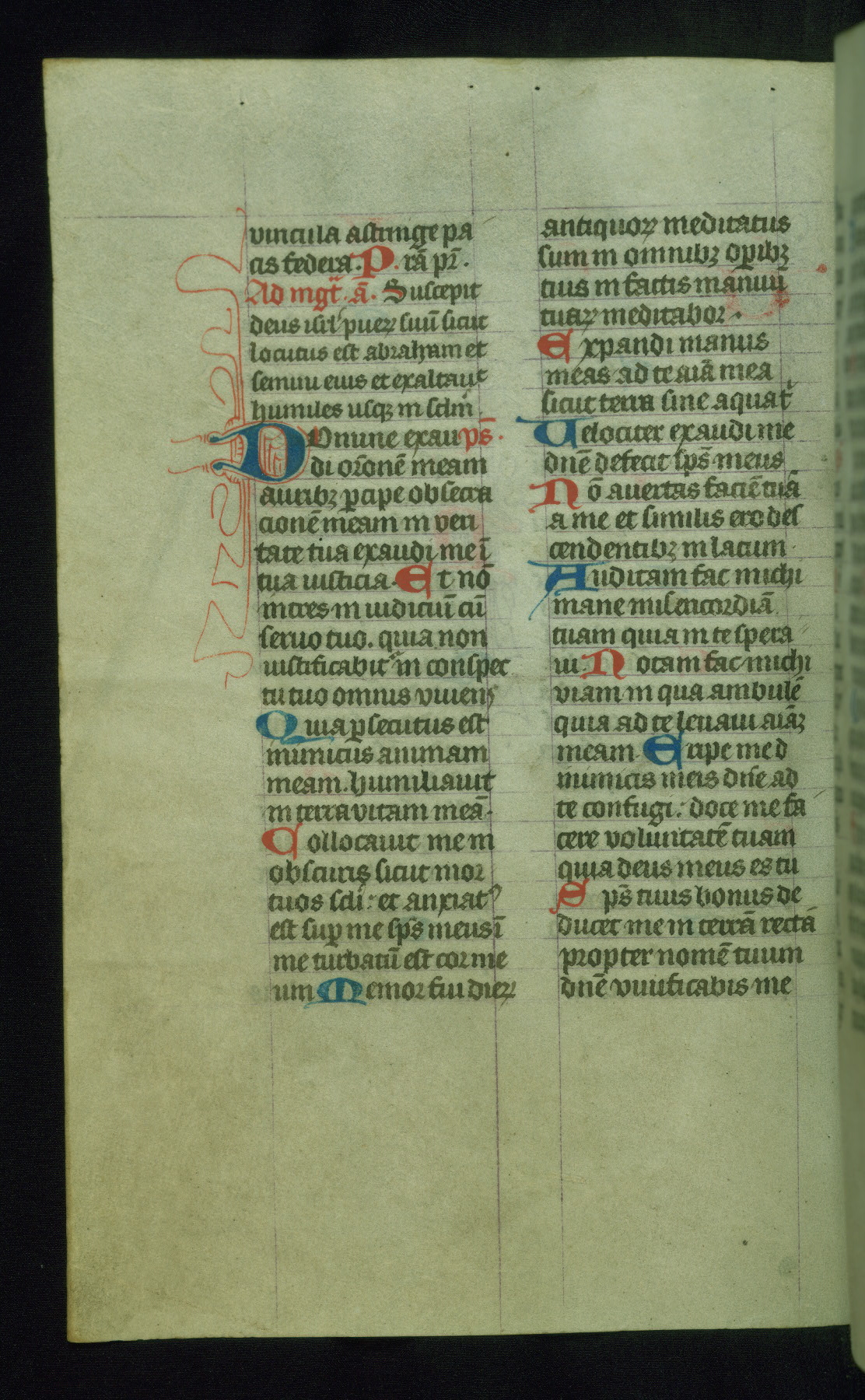 This small breviary, composed of more than 500 folios, is extraordinary for its length, considering it is the summer portion of a two-volume breviary for the use of Liège. The manuscript was completed for ecclesiastical use at the Cathedral of Notre-Dame and St.-Lambert in Liège ca. 1420. This attribution is suggested, for instance, by the petitions to the congregation of this cathedral (fols. 114v-117v), as well as the armorial shield of the family of Surlet de Chokier of Liège represented at the opening of the Psalms. The manuscript has modest, but interesting, decoration with historiated and decorated initials marking the liturgical texts, and occasional angels playing instruments in the margins. The most notable pictorial effect is found in the initials inhabited by transparent figures on rich blue ground. The technique is found, for instance, on fol. 156r with the gold monstrance held by translucent angels for the feast of the Corpus Christi.